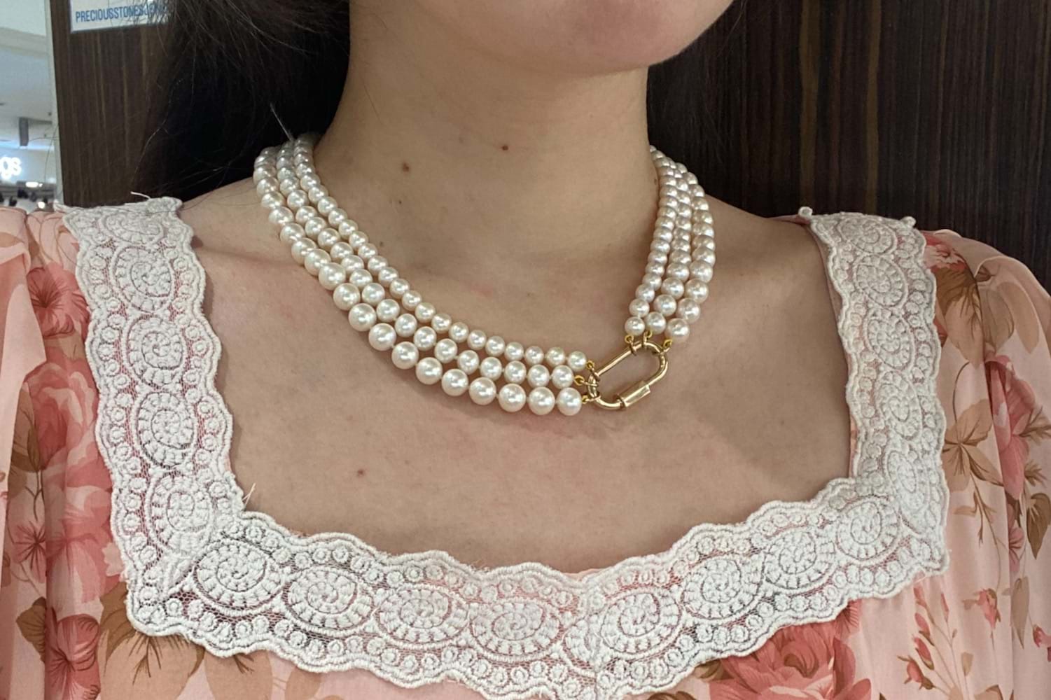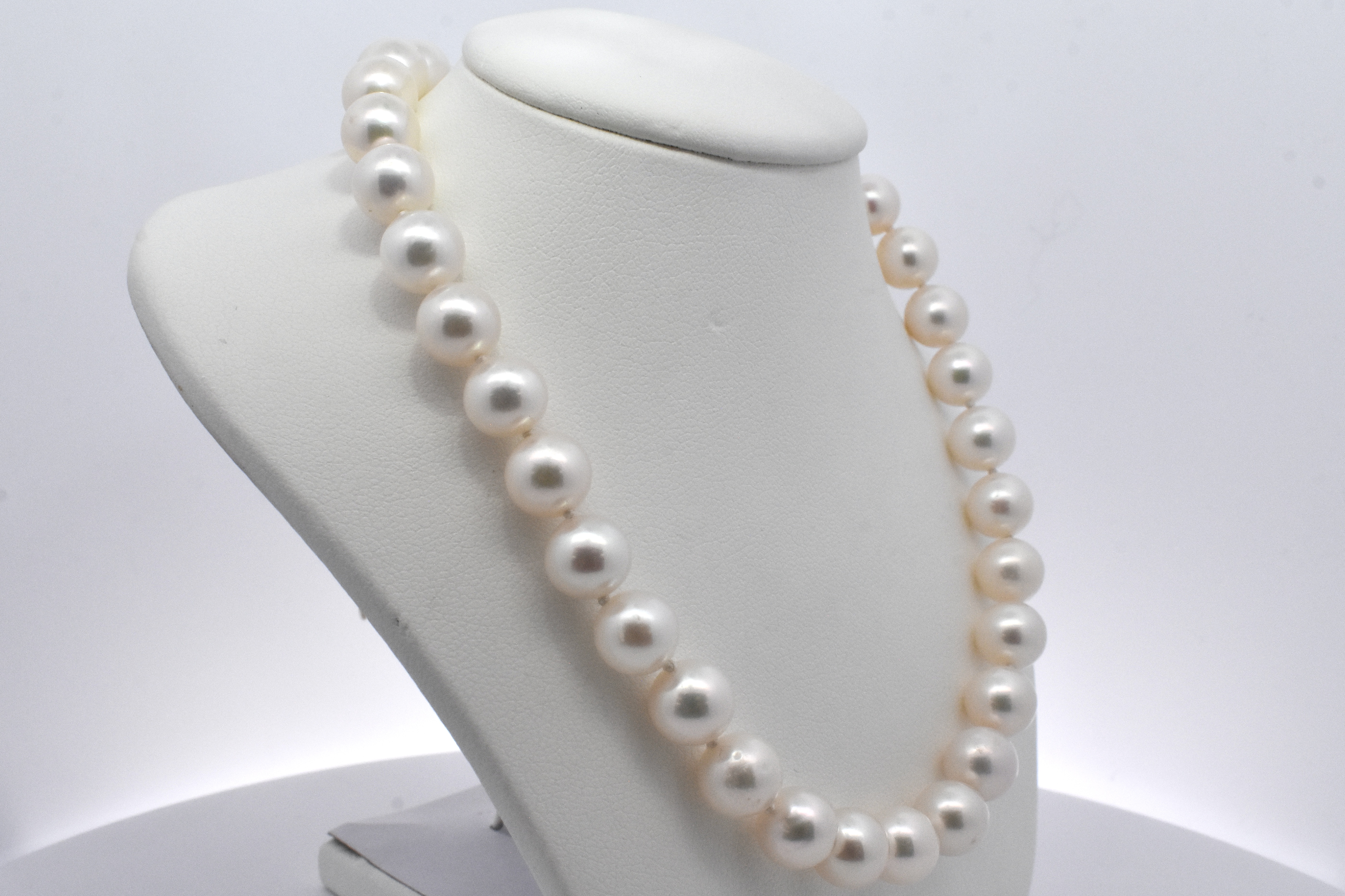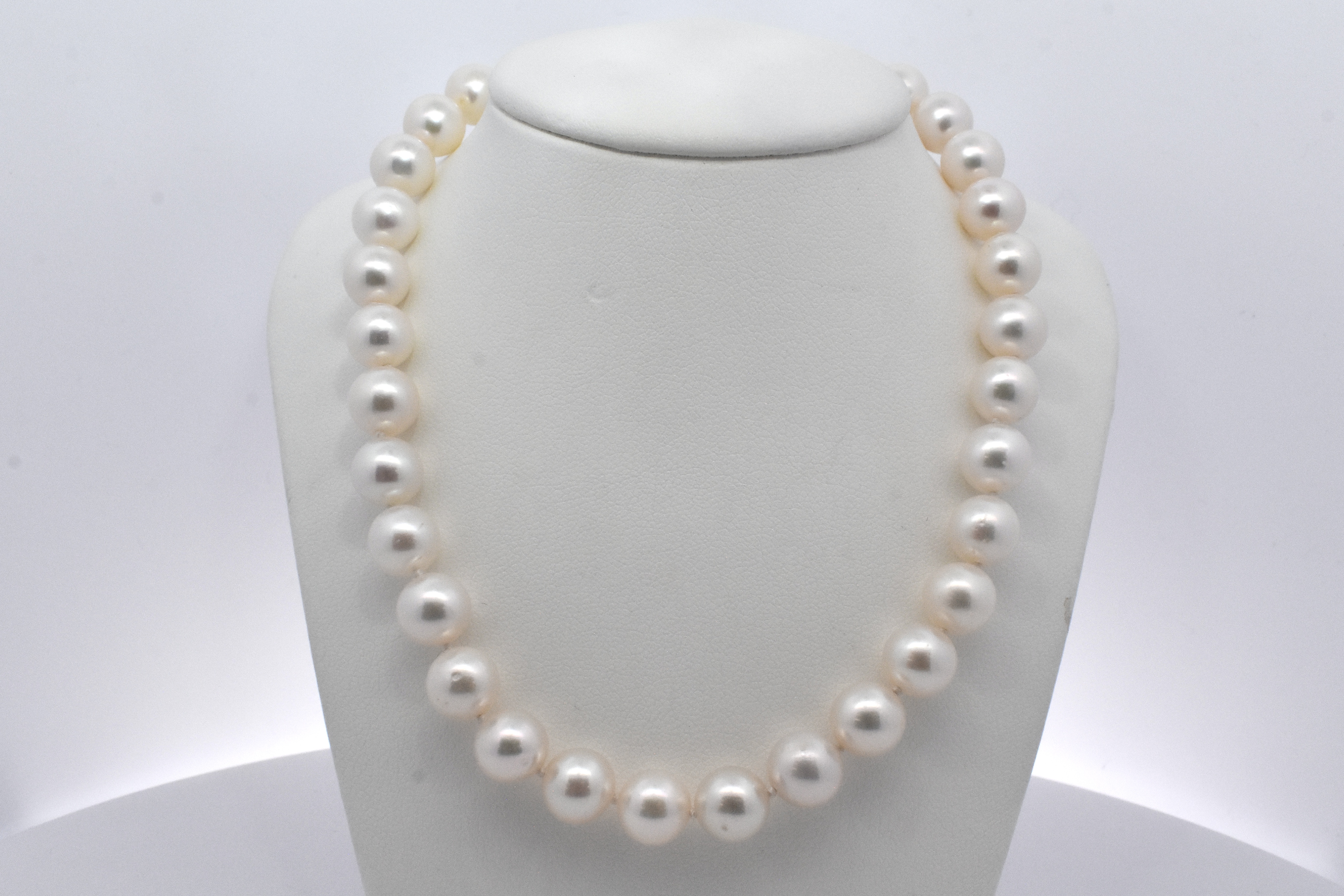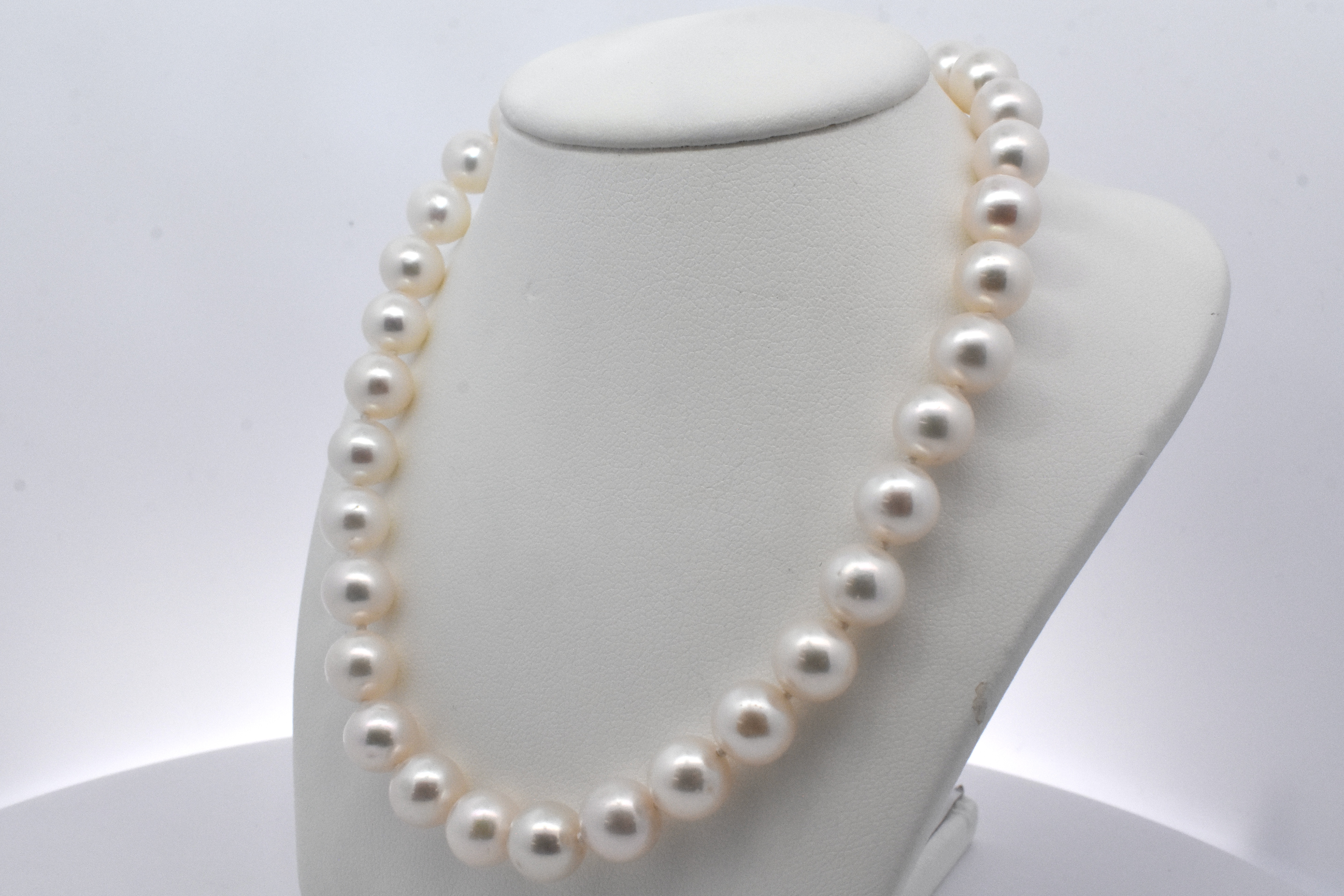 A classic but contemporary concept, this strand of 8-8.5mm white freshwater pearls have been strung with two 9ct yellow gold jump ring ends, especially designed to be worn with a matching yellow gold or contrasting carabiner. Strand is 45.5cm long