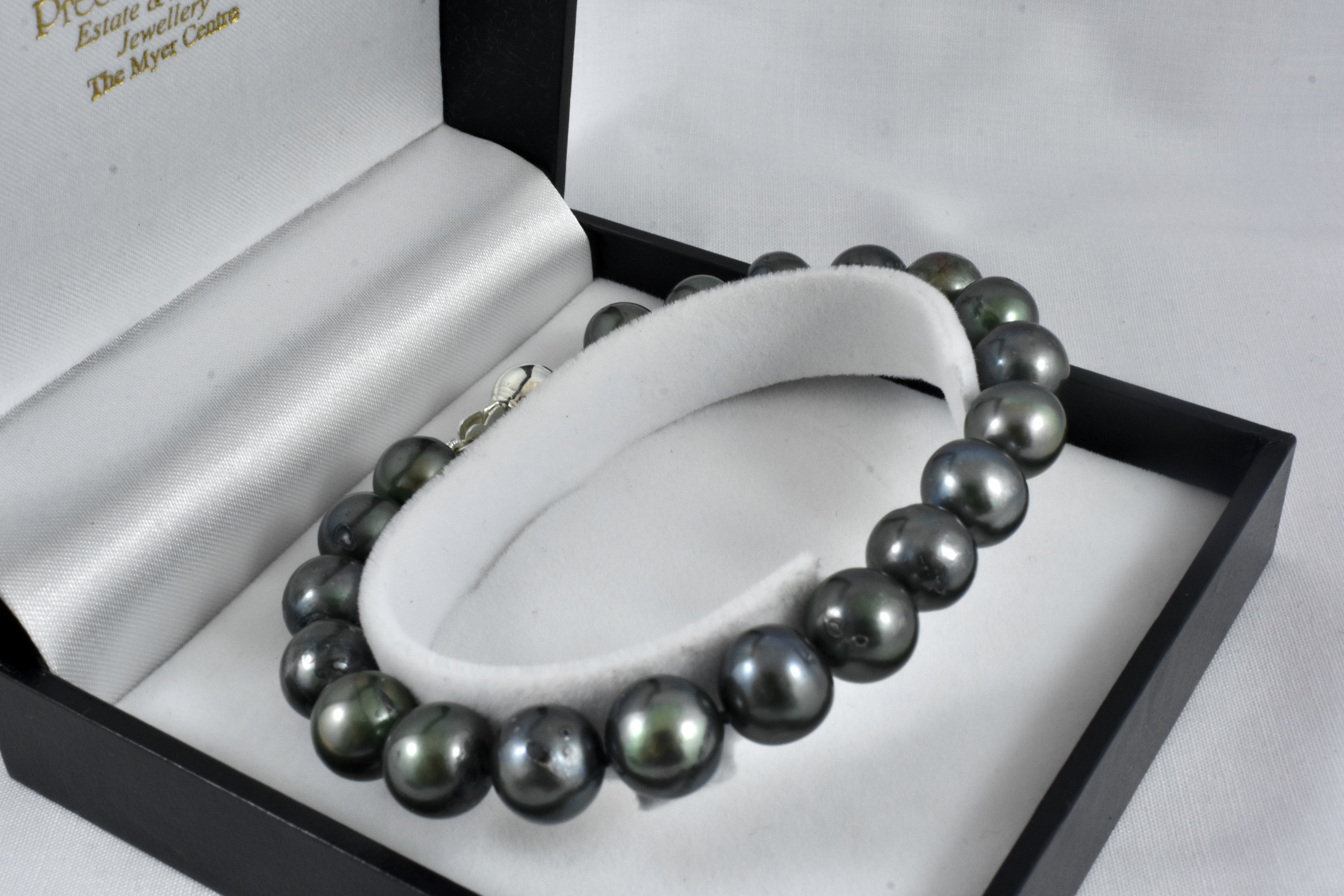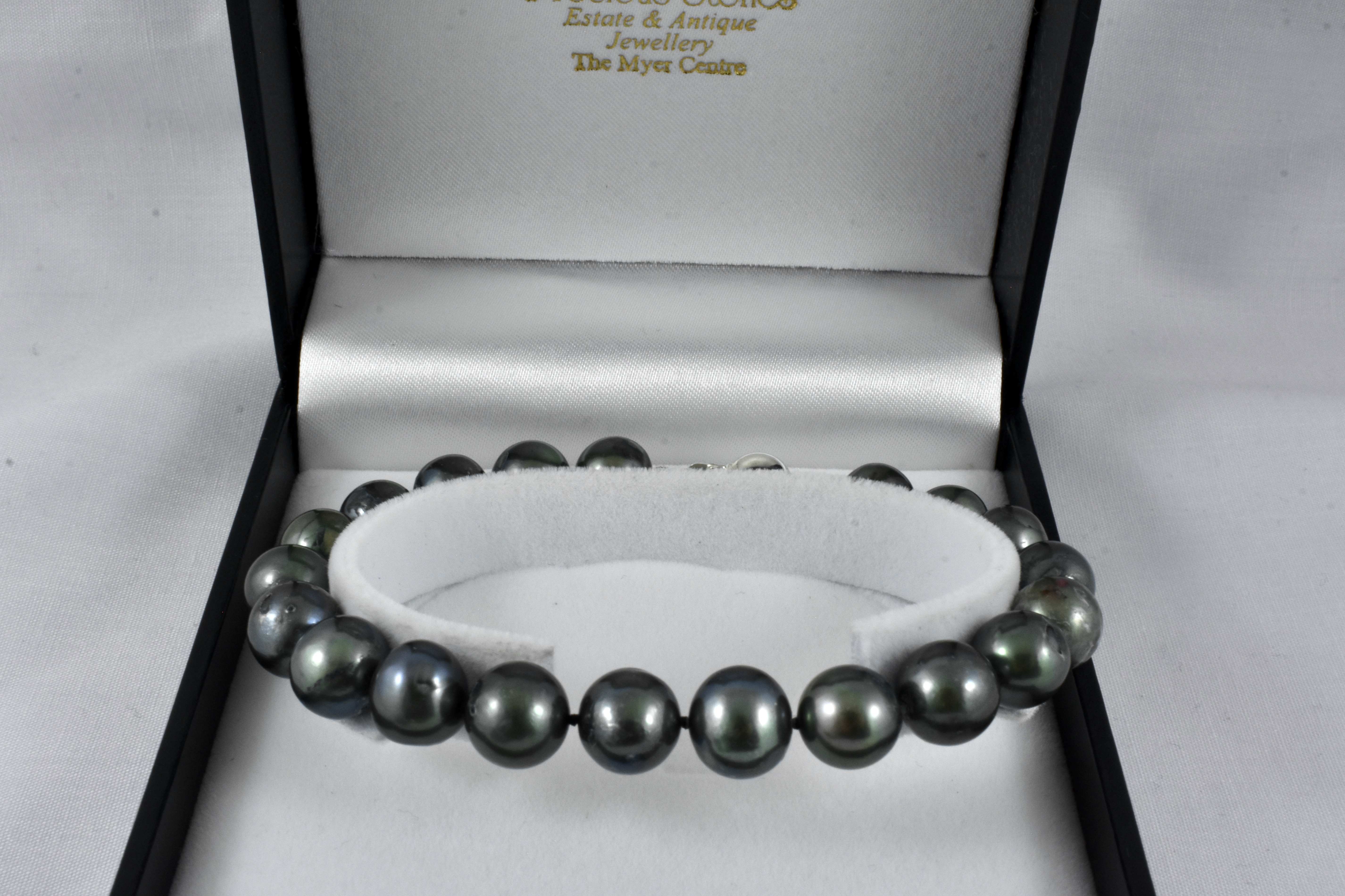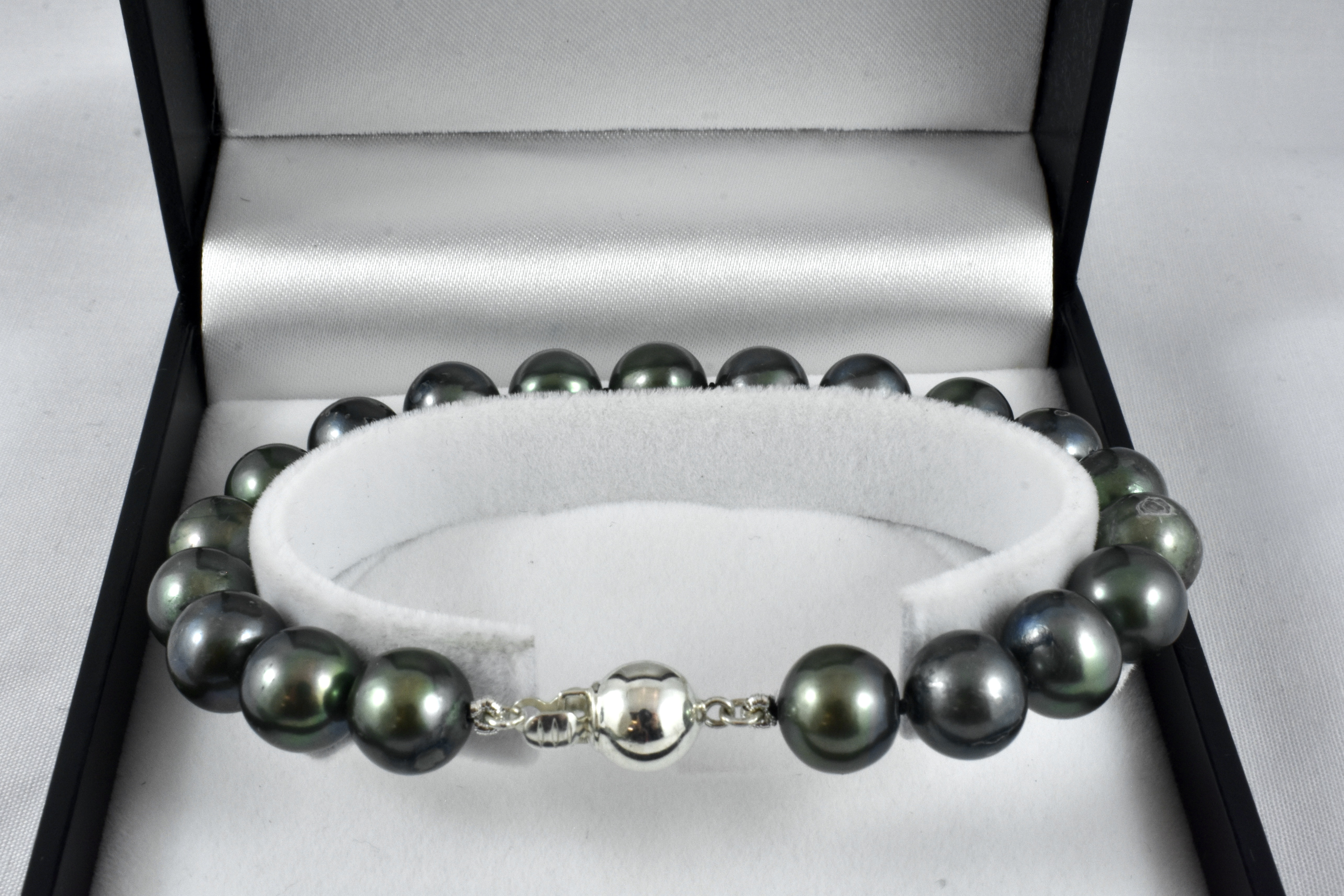 This sweet bracelet of dyed black freshwater pearls are round in shape with good lustre and pretty peacock tones, individually hand knotted on silk, 9-10mm in size with a length of 20cm, with polished sterling silver ball clasp