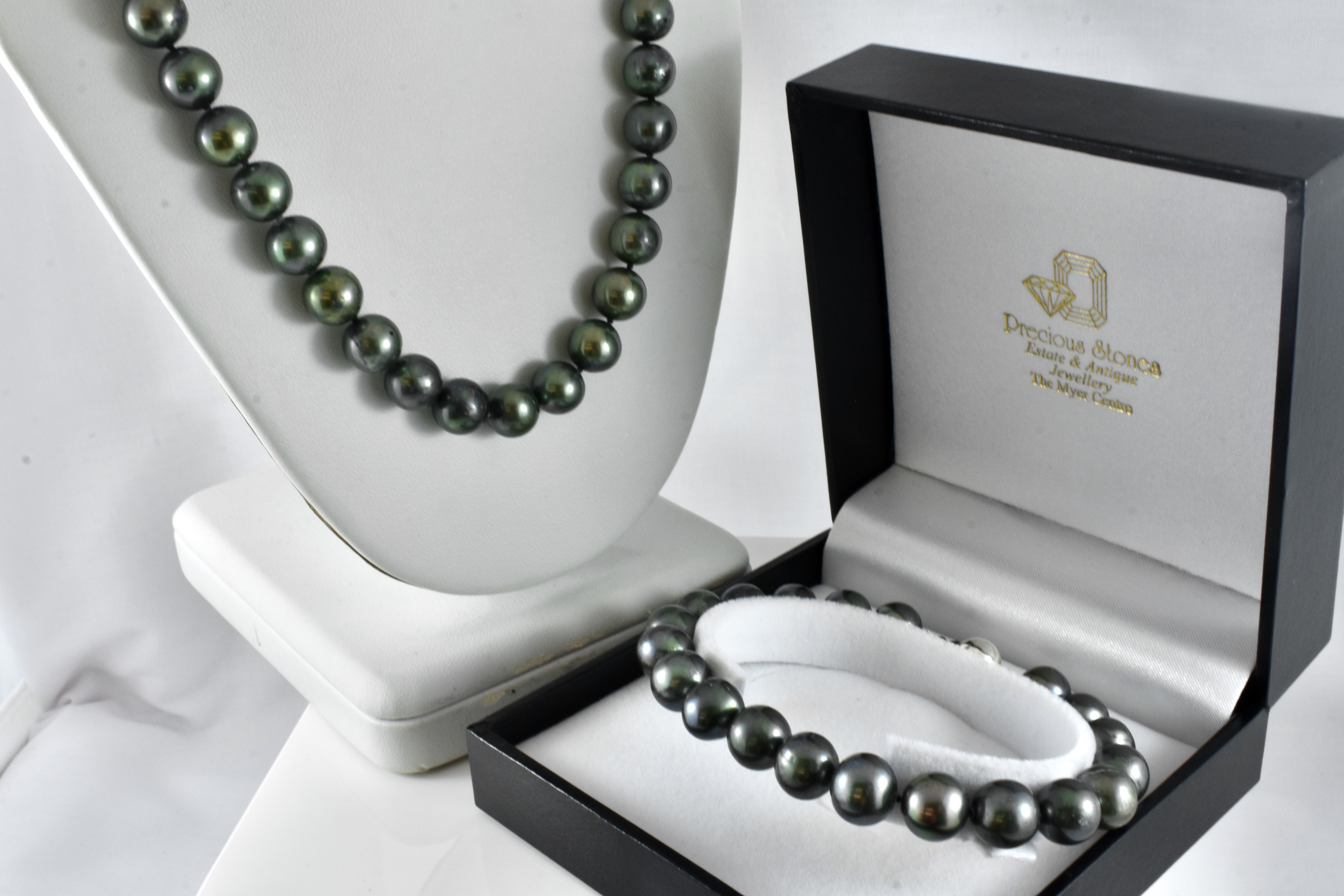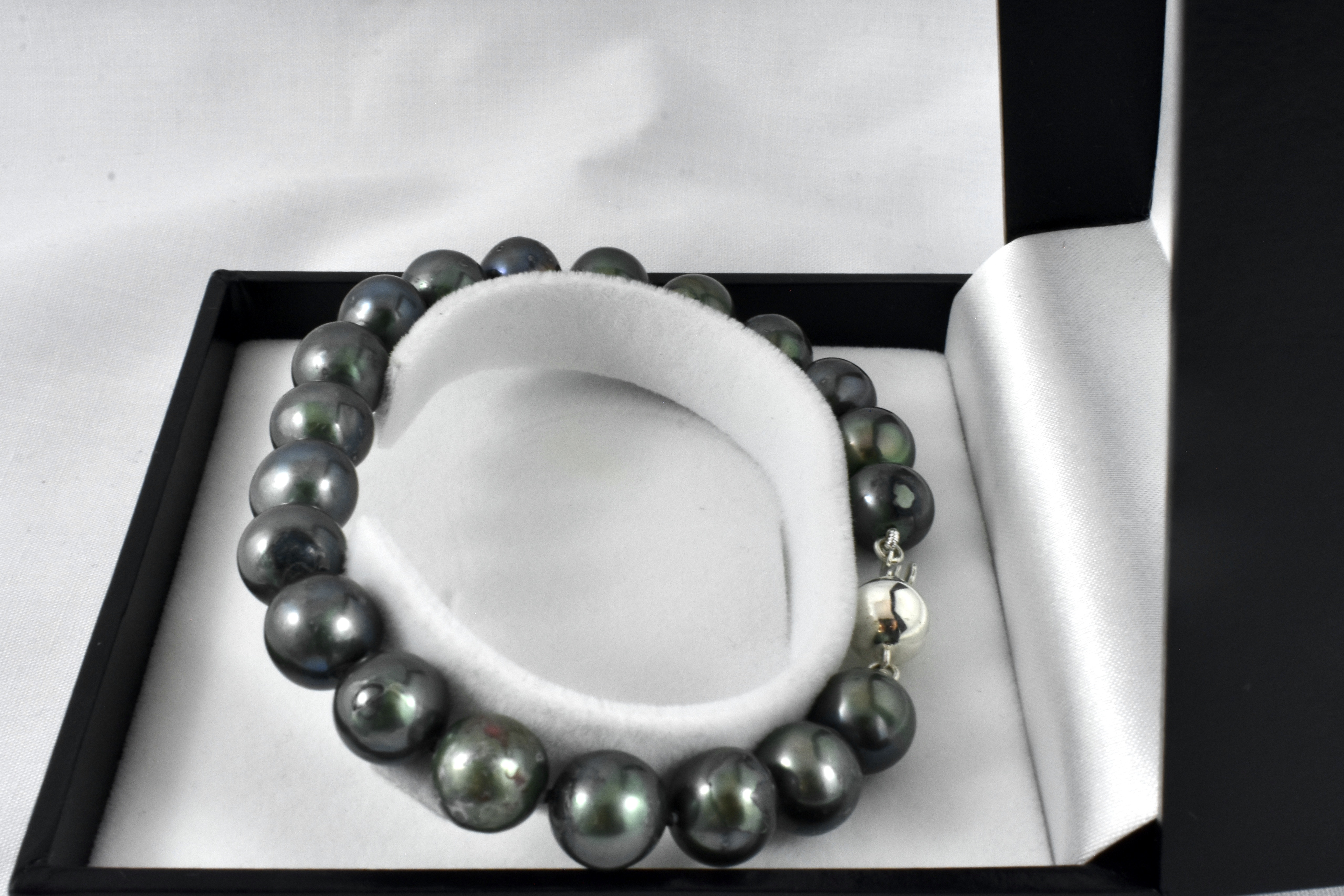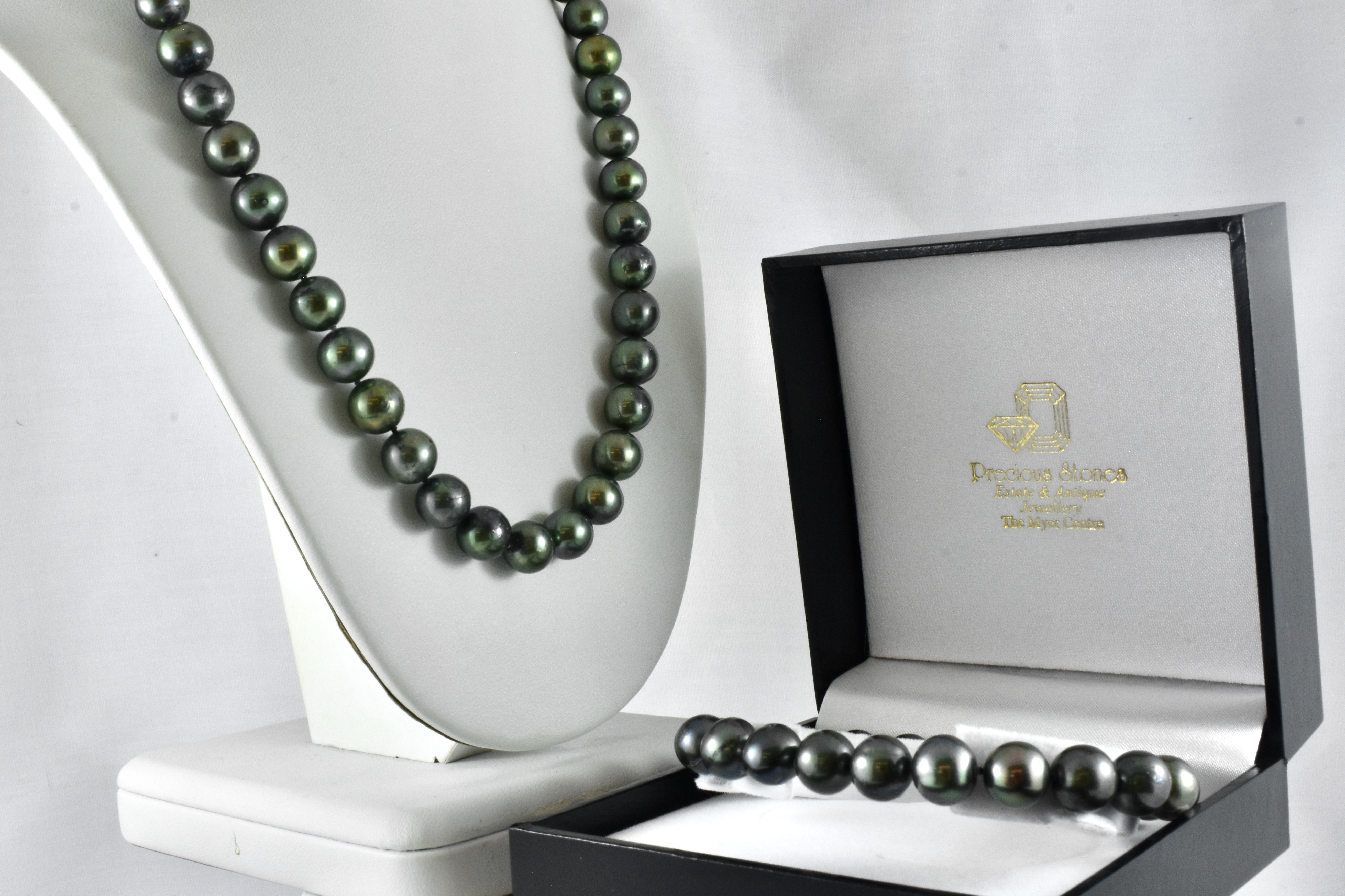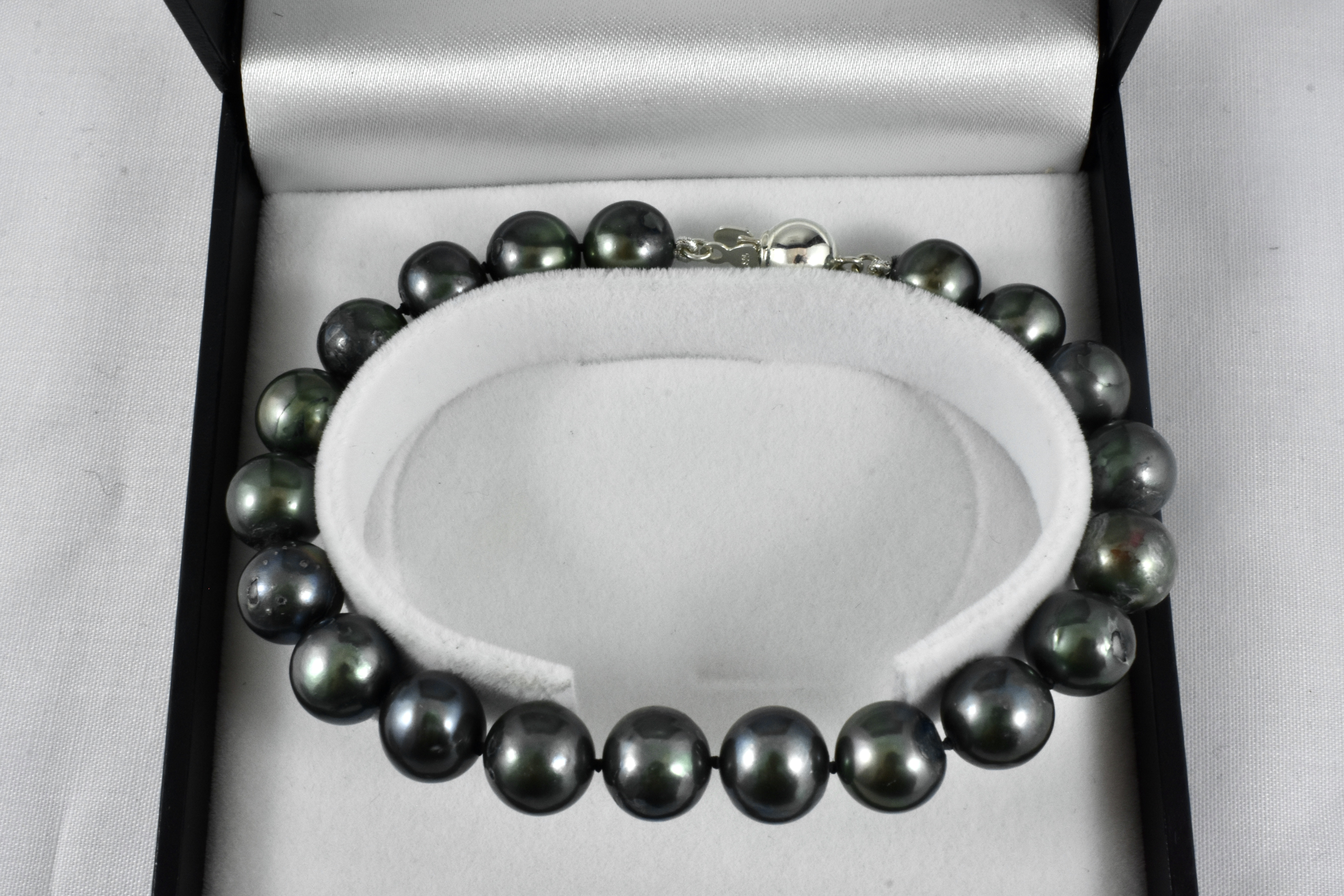 This sweet bracelet of dyed black freshwater pearls are round in shape with good lustre and pretty peacock tones, individually hand knotted on silk, 9-10mm in size with a length of 20cm, with polished sterling silver ball clasp