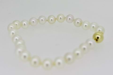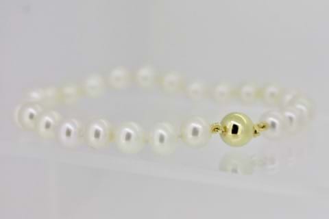 Hand strung on silk these lustrous freshwater pearls measure 7-7.5mm and have been paired with a 9ct yellow gold pearl clasp. Finish length: 20cm