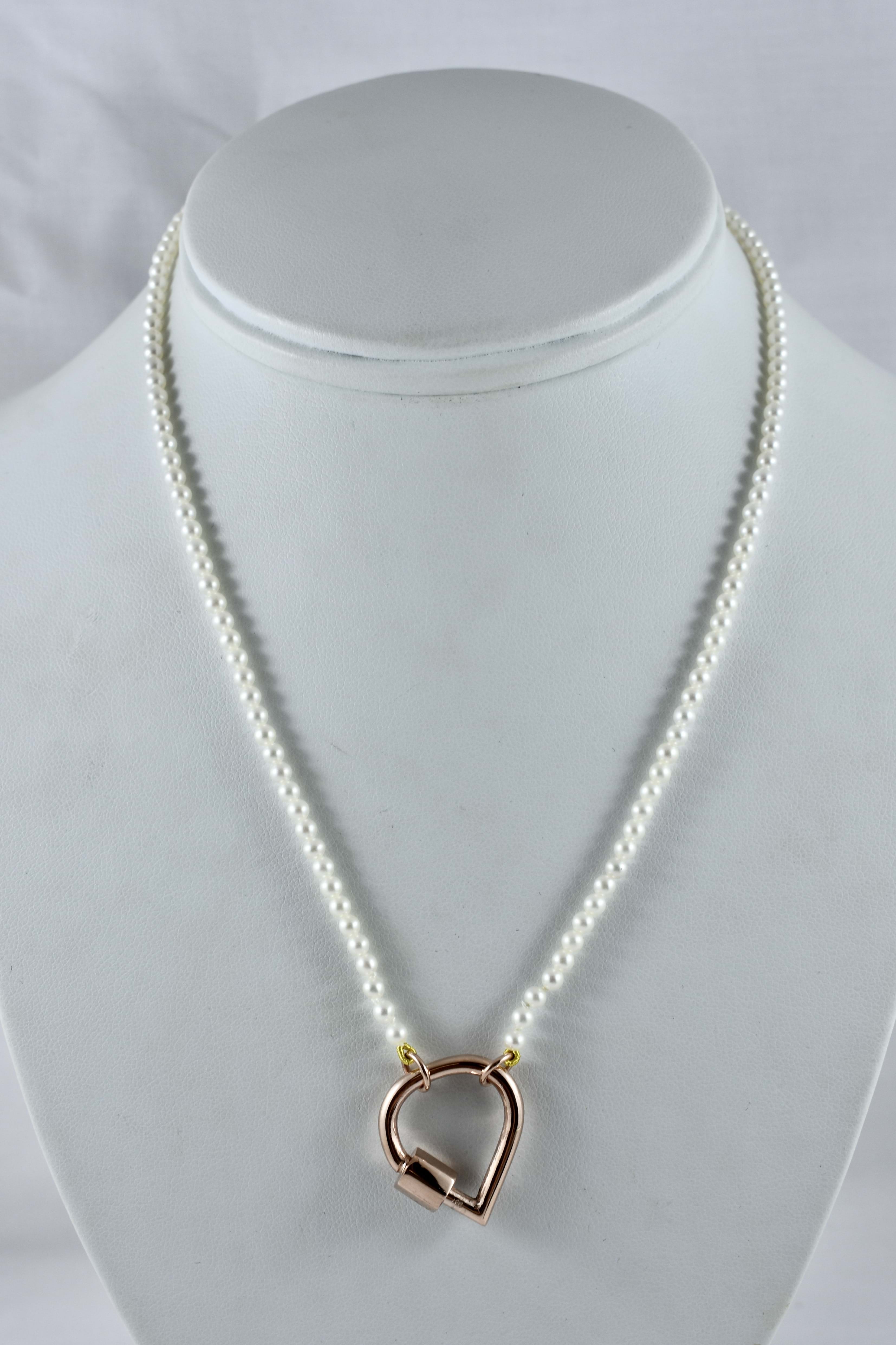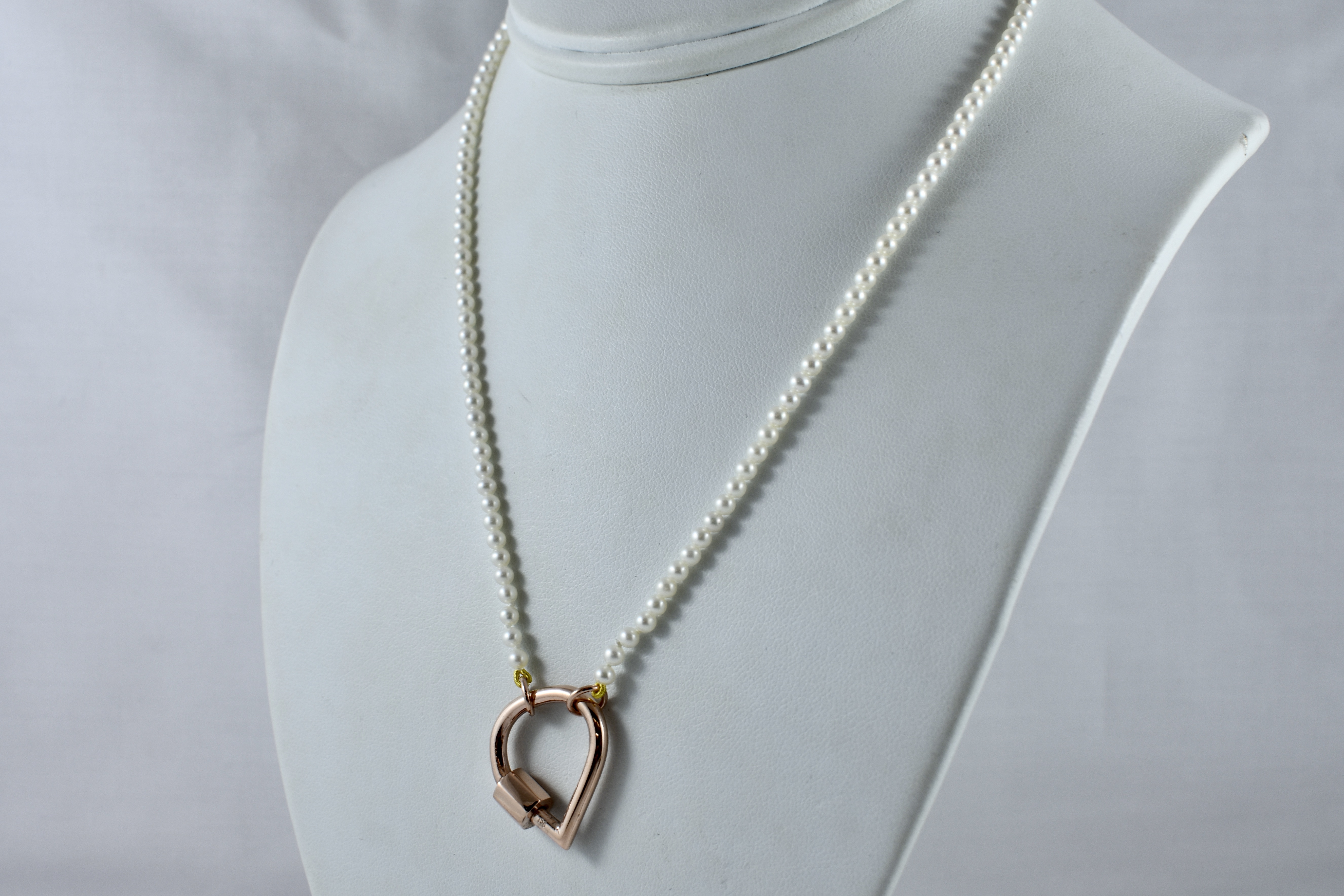 A classic and timeless strand of white Freshwater pearls with good lustre, measuring 3-3.5mm semi-round. The pearls have been hand strung on silk with two 9ct rose gold jump ring ends. Strand length 41cm. These ends allow for a wide range of styling versatility, including various brooches, enhancers or carabiners (as pictured). Carabiner available for separate purchase (20359096).