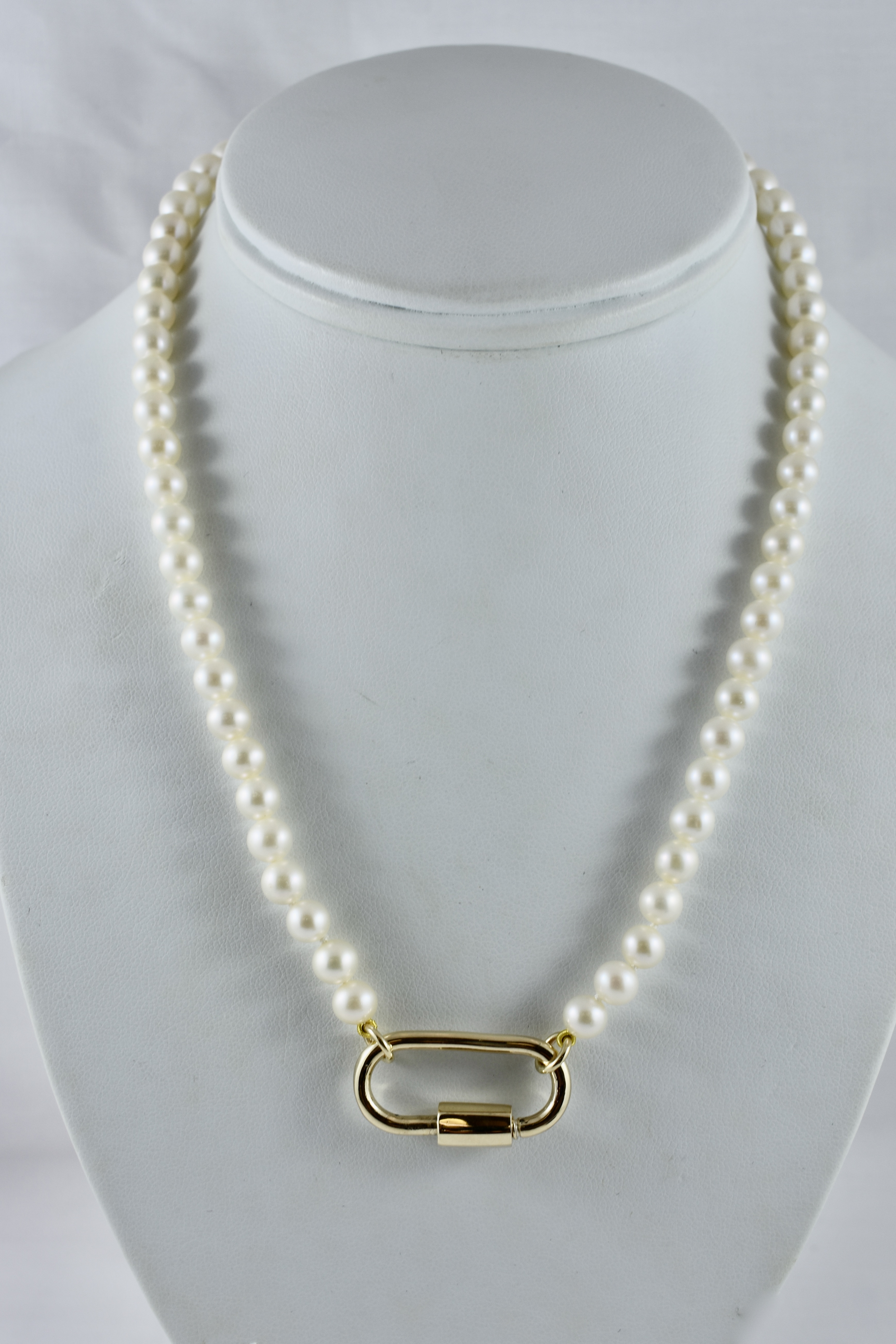 A classic and timeless strand of white Freshwater pearls with good lustre, measuring 6-6.5mm semi-round. The pearls have been hand strung on silk with two 9ct yellow gold jump ring ends. Strand length 42cm. These ends allow for a wide range of styling versatility, including various brooches, enhancers or carabiners (as pictured). Carabiner available for separate purchase (20359102).