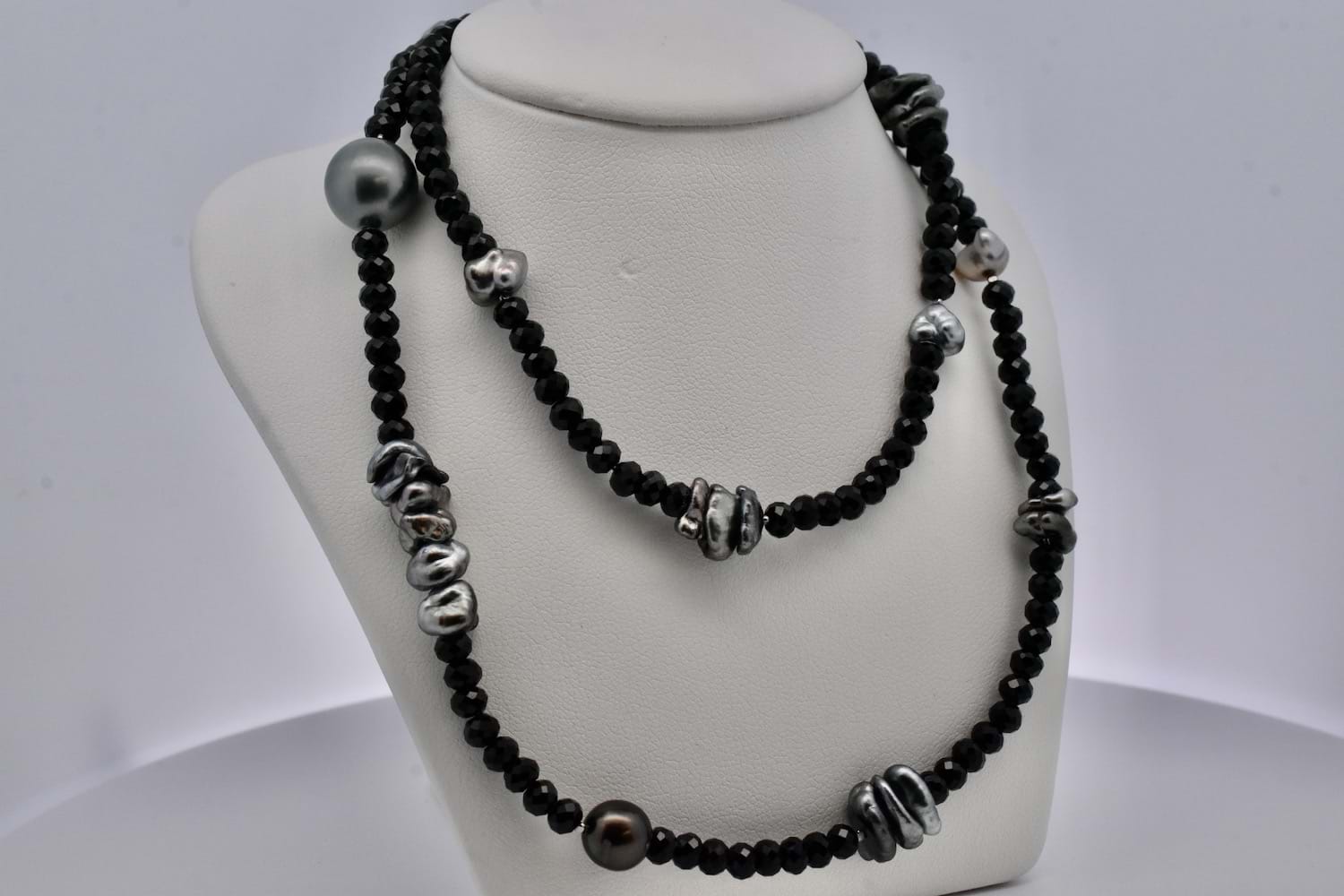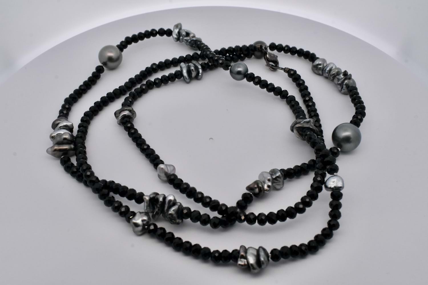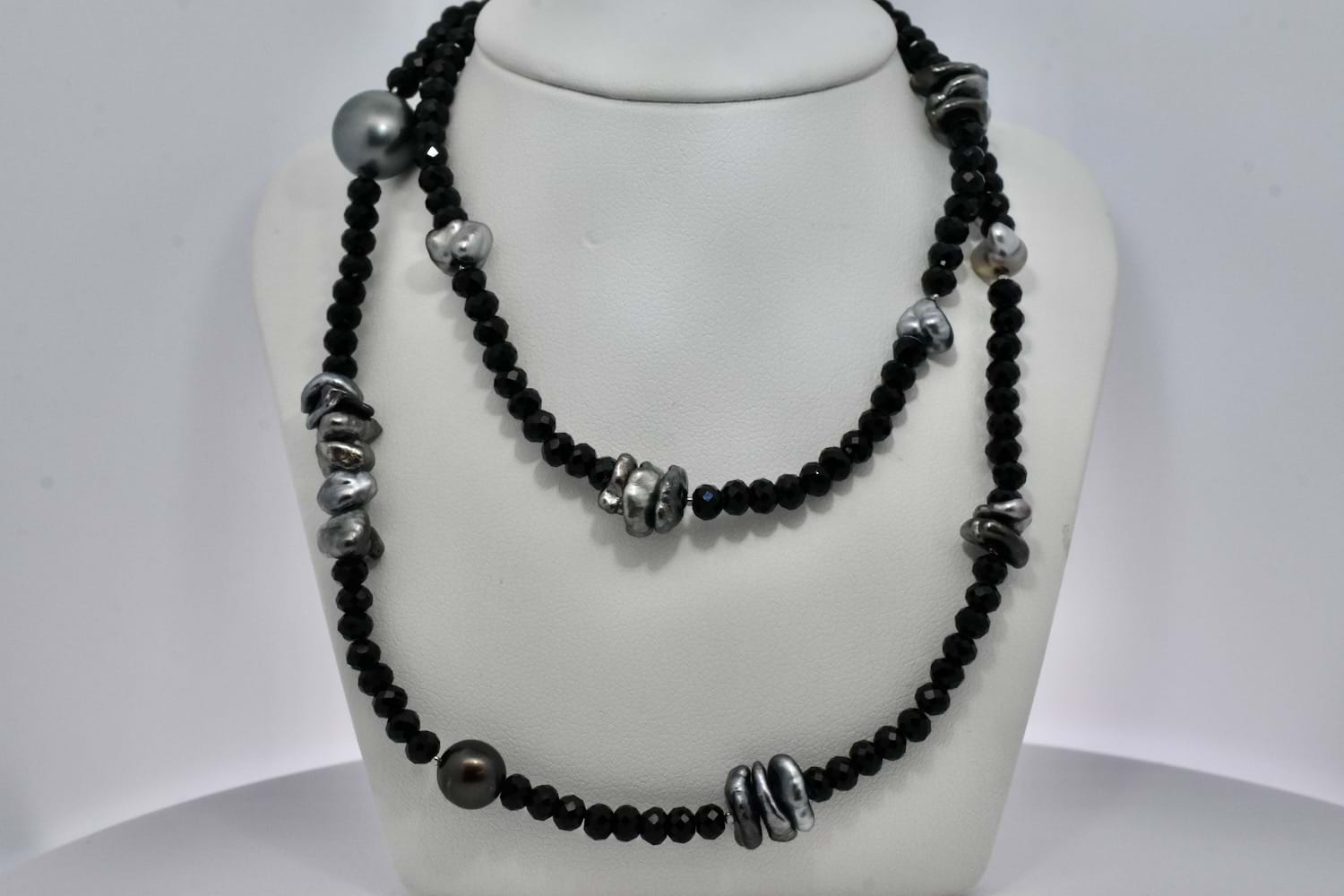 A unique and striking piece featuring round, faceted sparkly black spinel beads which have subtle graduation, with elements of round and freeform grey Tahitian keshi pearls , 90cm long and finished with a black rhodium plated sterling silver clasp. The round keshi pearls range from 4-11mm round
