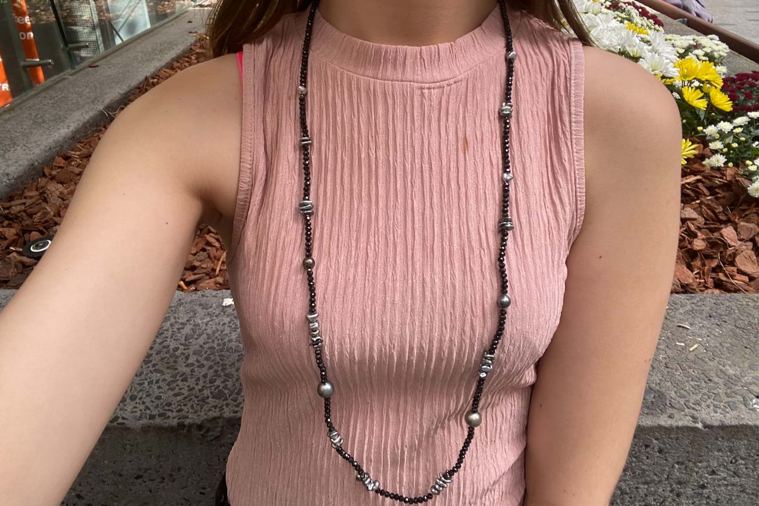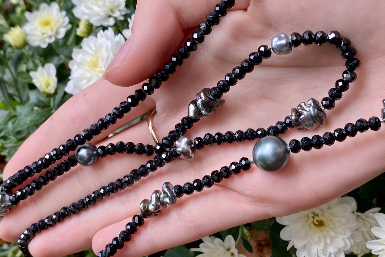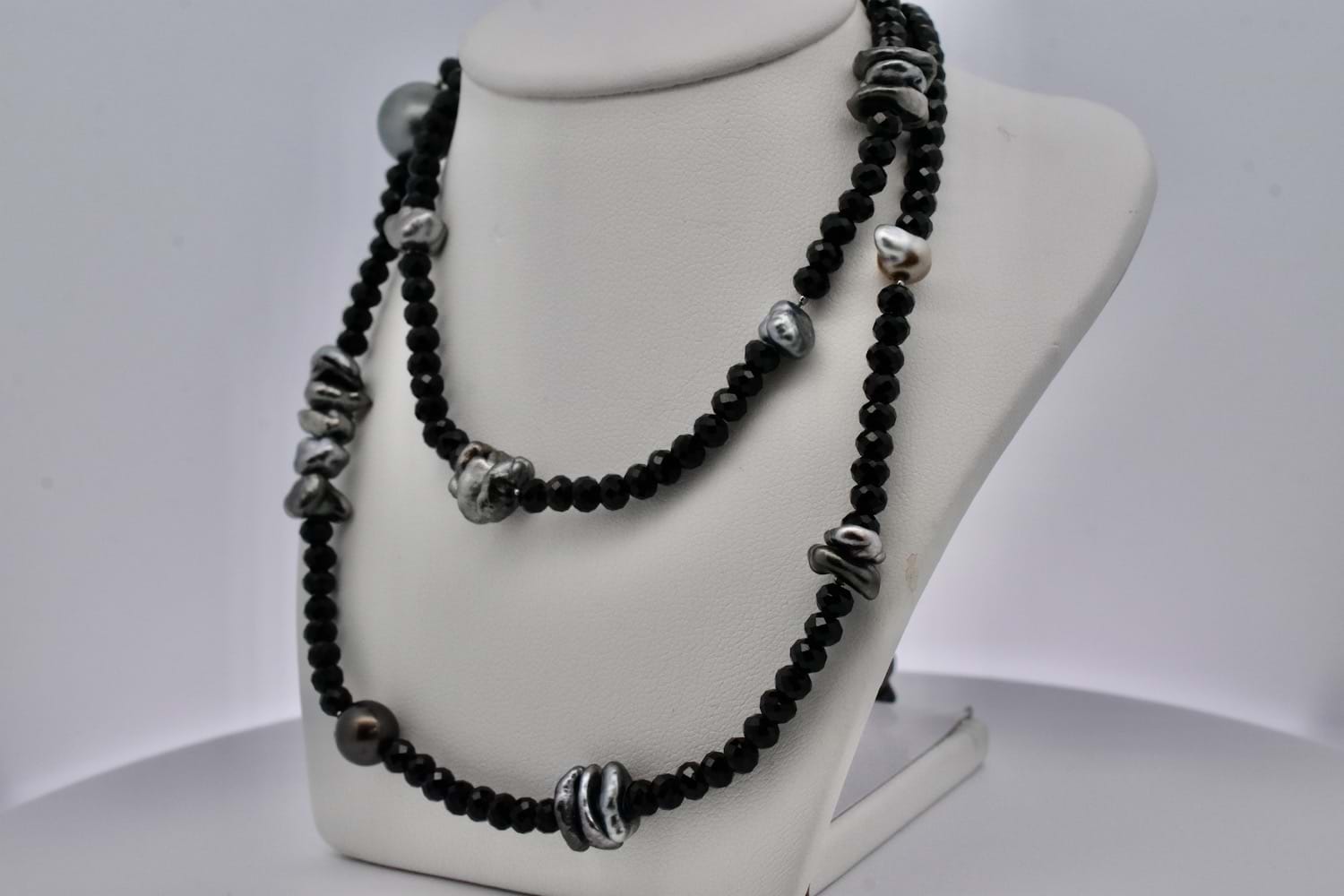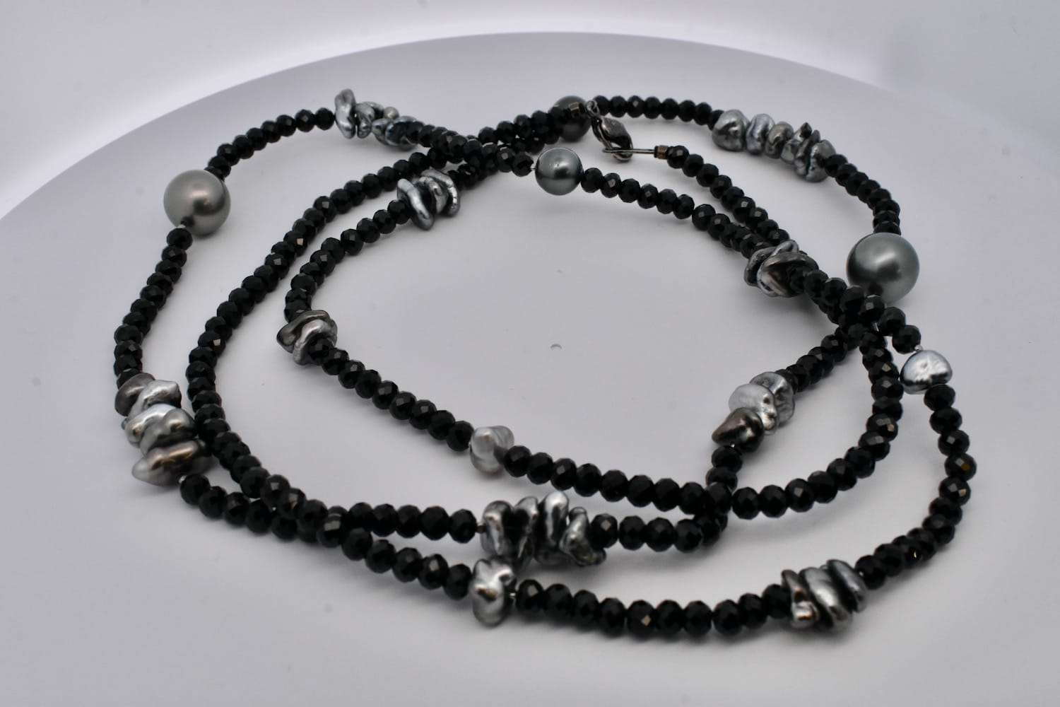 A unique and striking piece featuring round, faceted sparkly black spinel beads which have subtle graduation, with elements of round and freeform grey Tahitian keshi pearls , 90cm long and finished with a black rhodium plated sterling silver clasp. The round keshi pearls range from 4-11mm round
