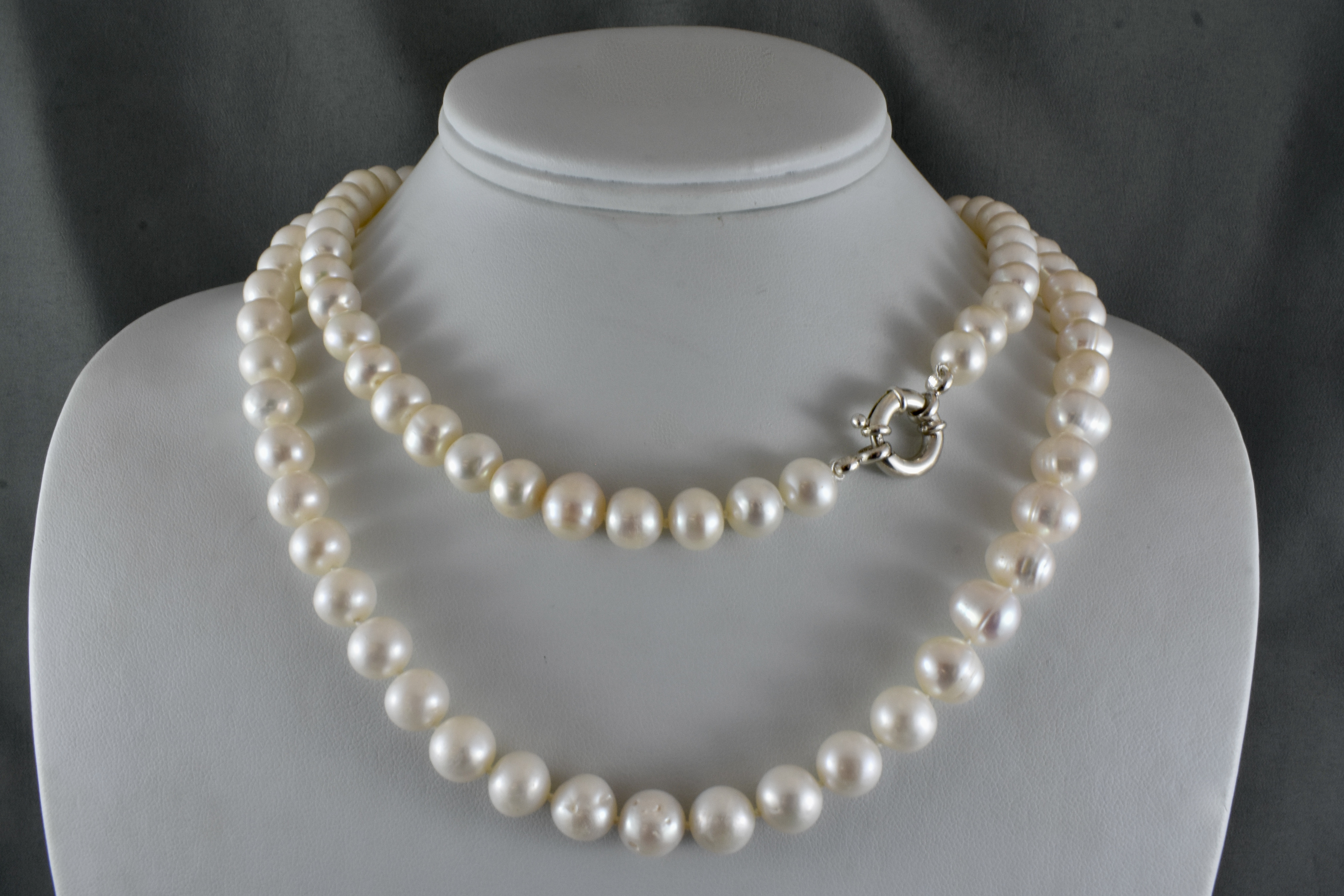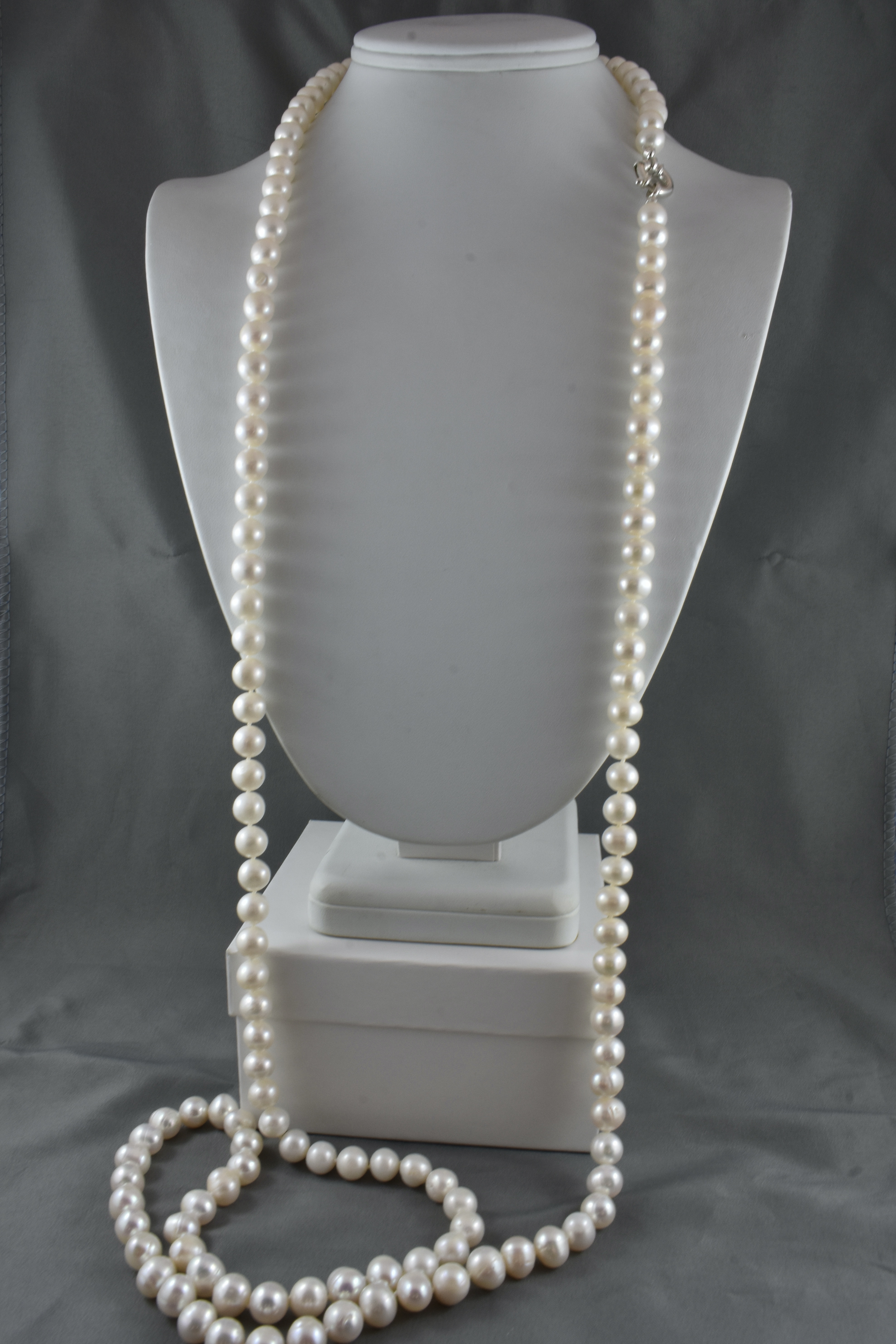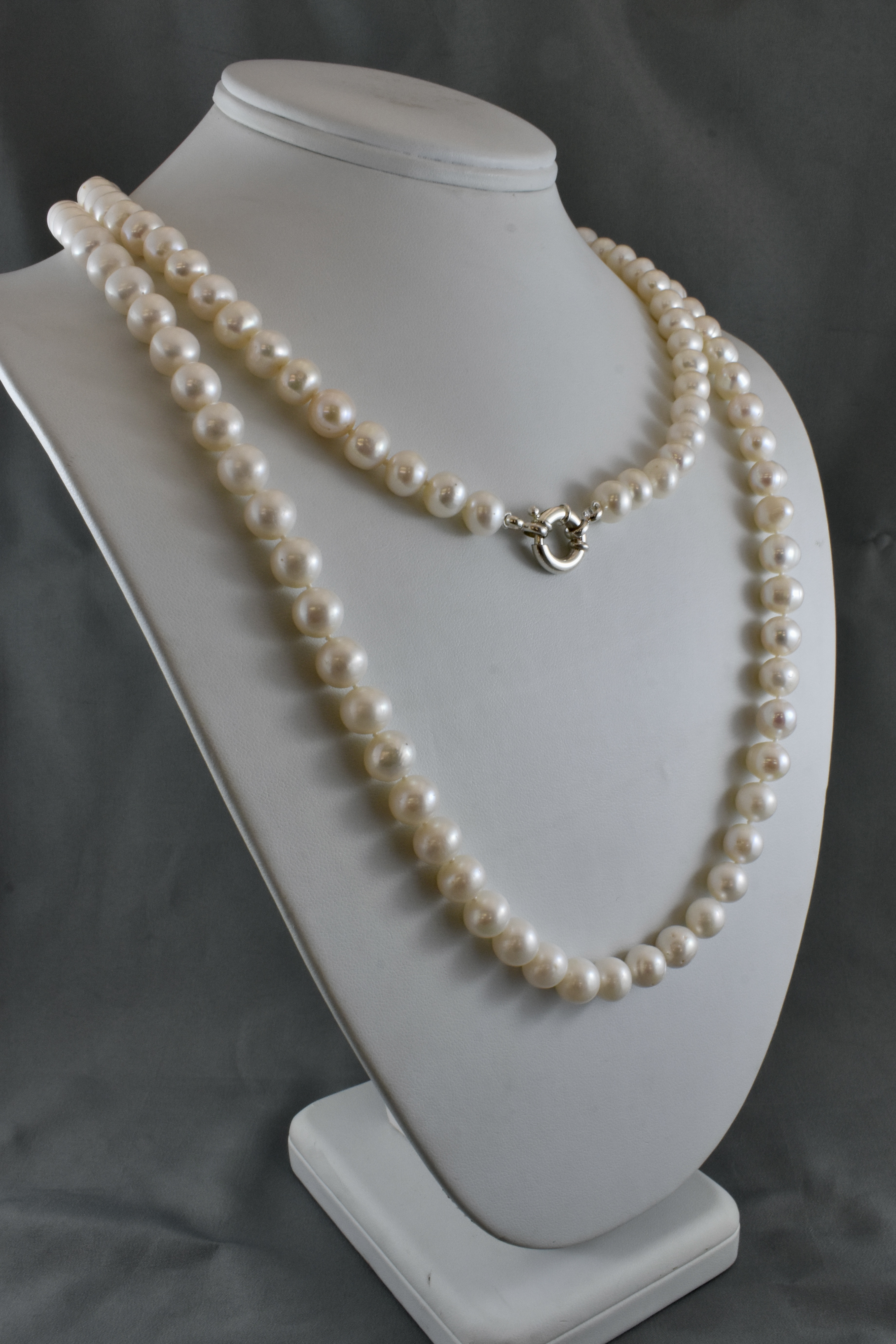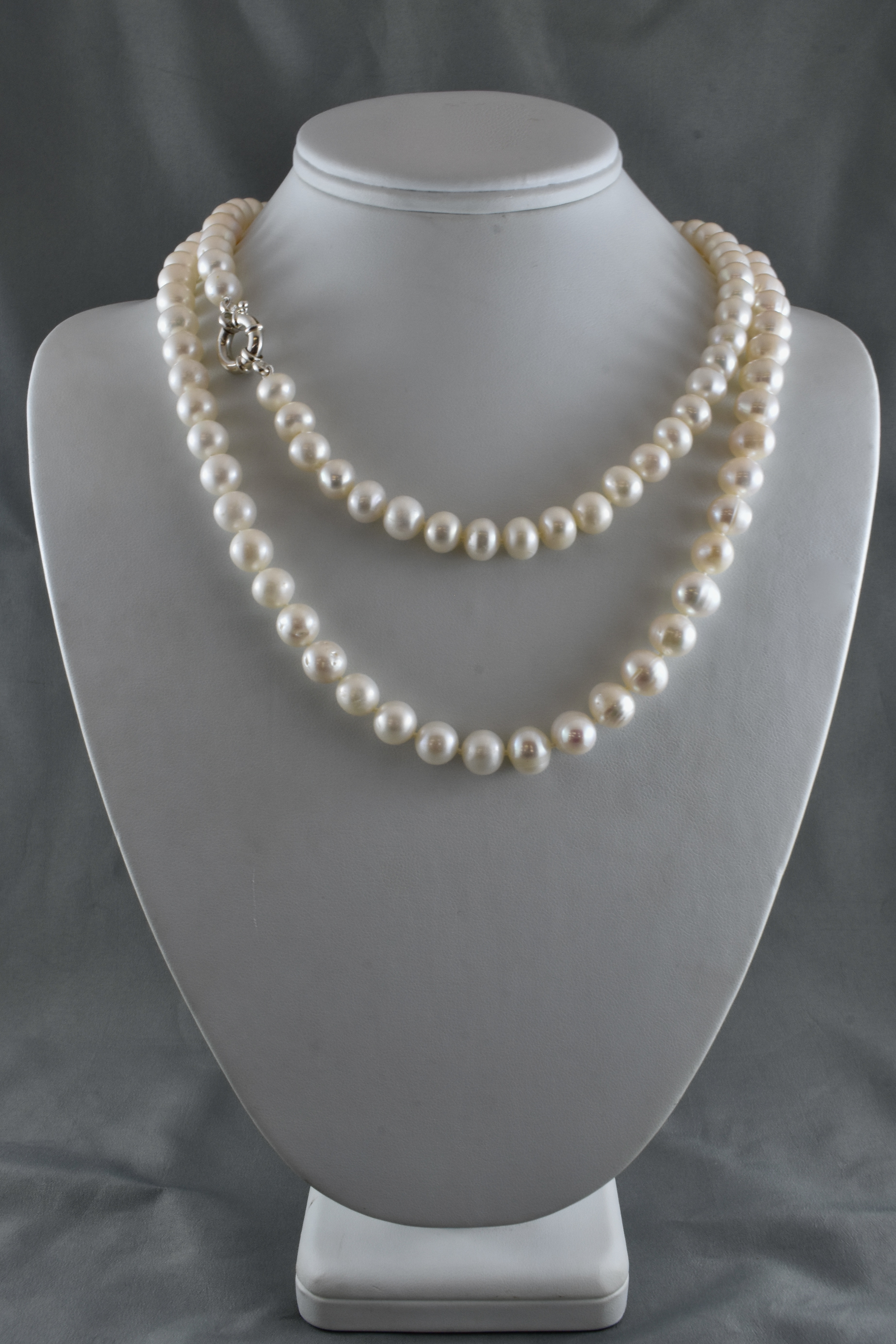 A fabulous and versatile strand of freshwater pearls individually hand knotted on silk measuring 122cm, the pearls are 8.5-9.5mm near round, with a good lustre and white/cream hue and a sterling silver boltring clasp