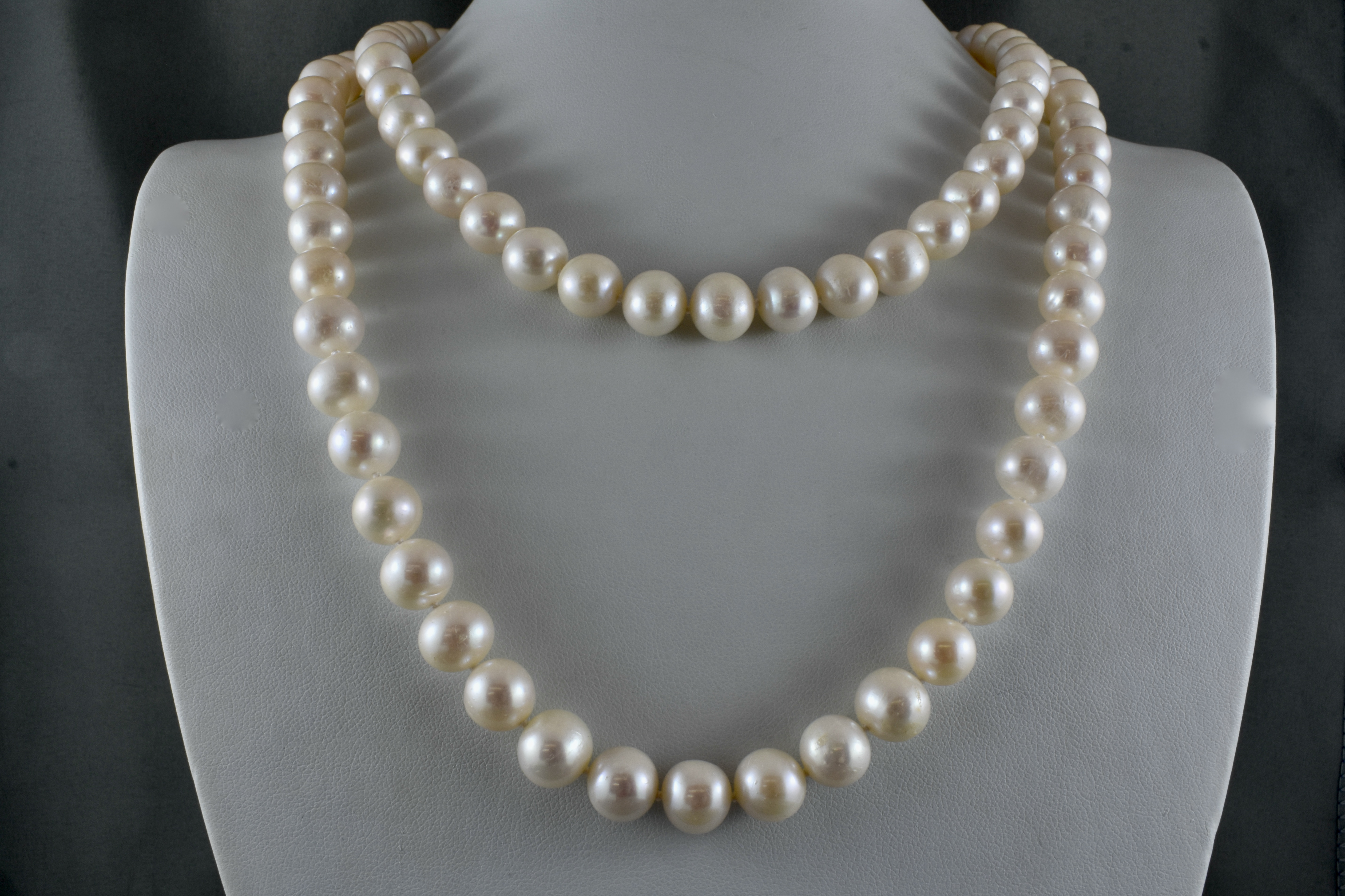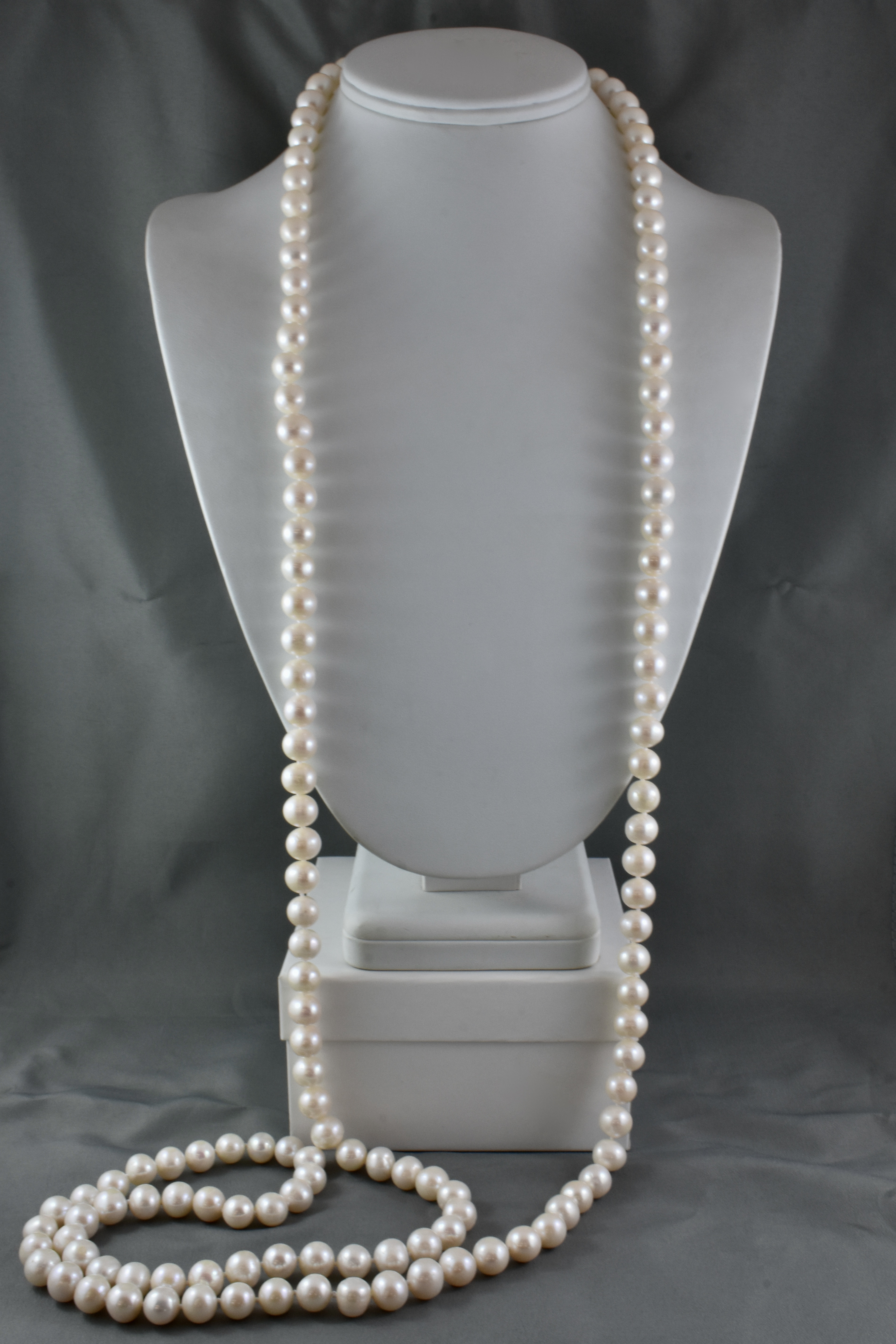 A fabulous strand of freshwater pearls individually hand knotted on silk measuring 142cm, the pearls are 9-10mm near round, with a good lustre and cream hue