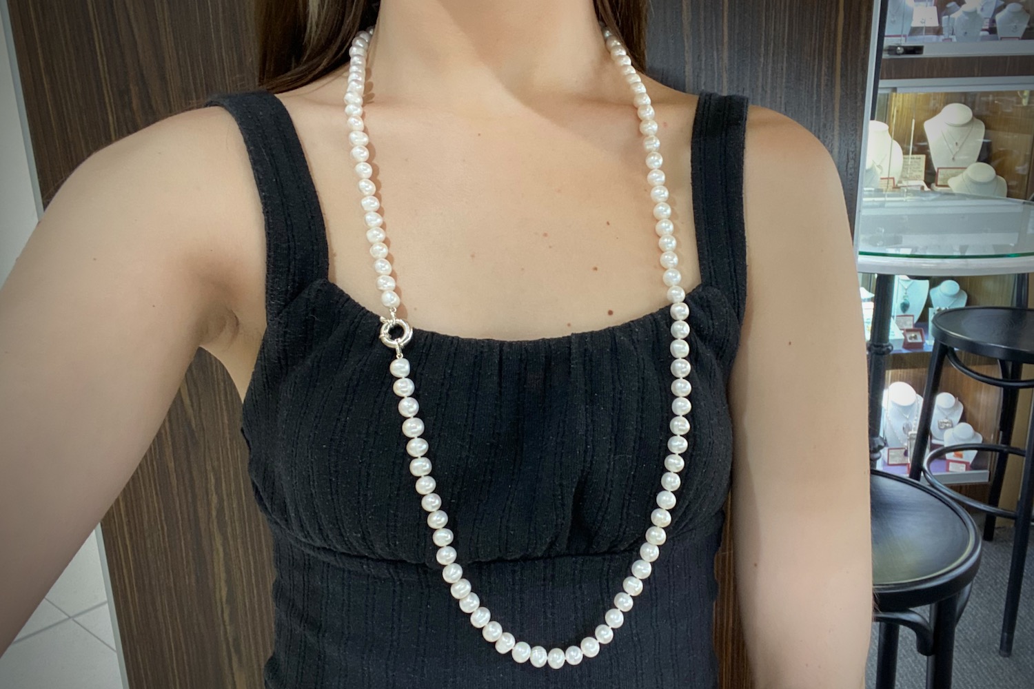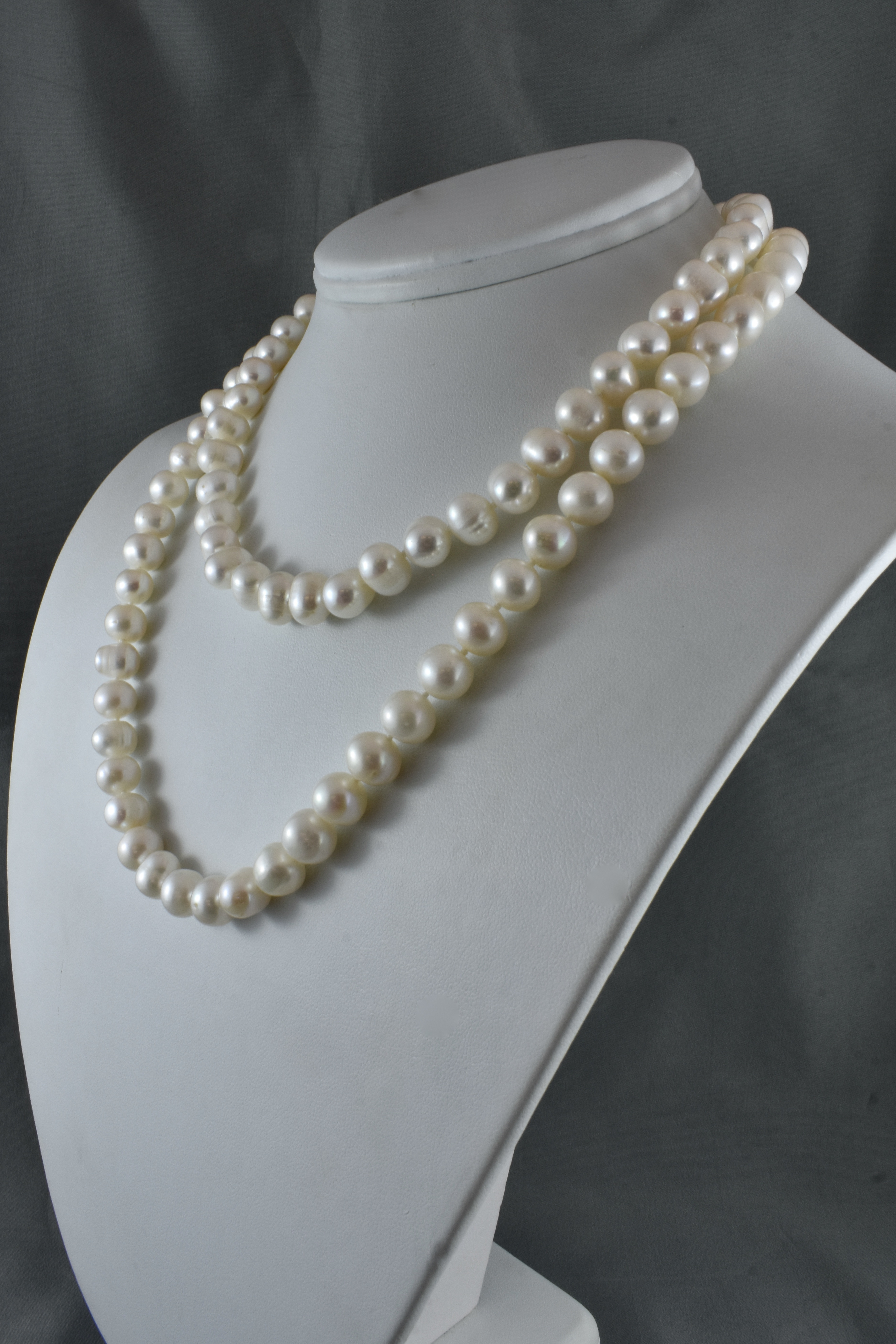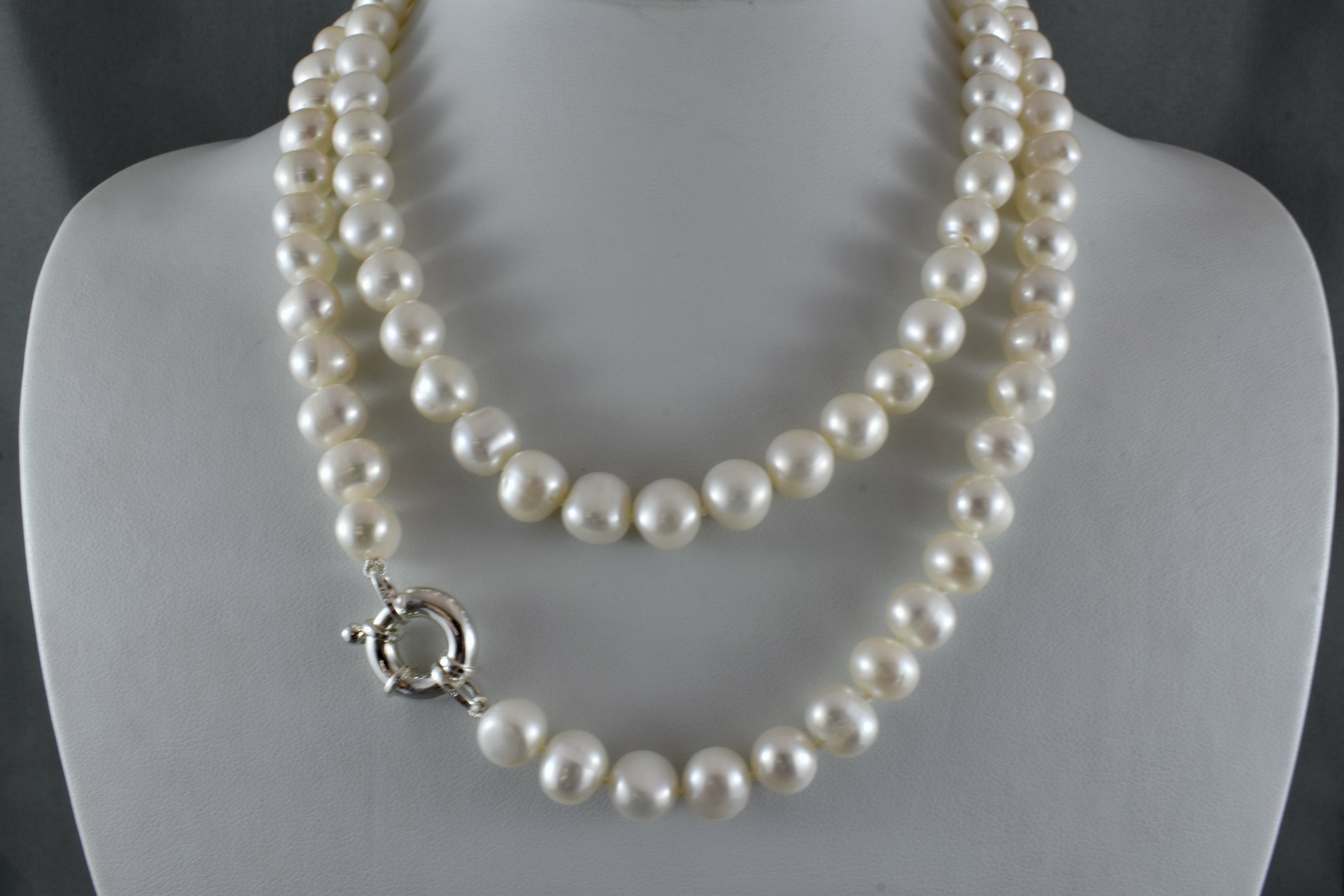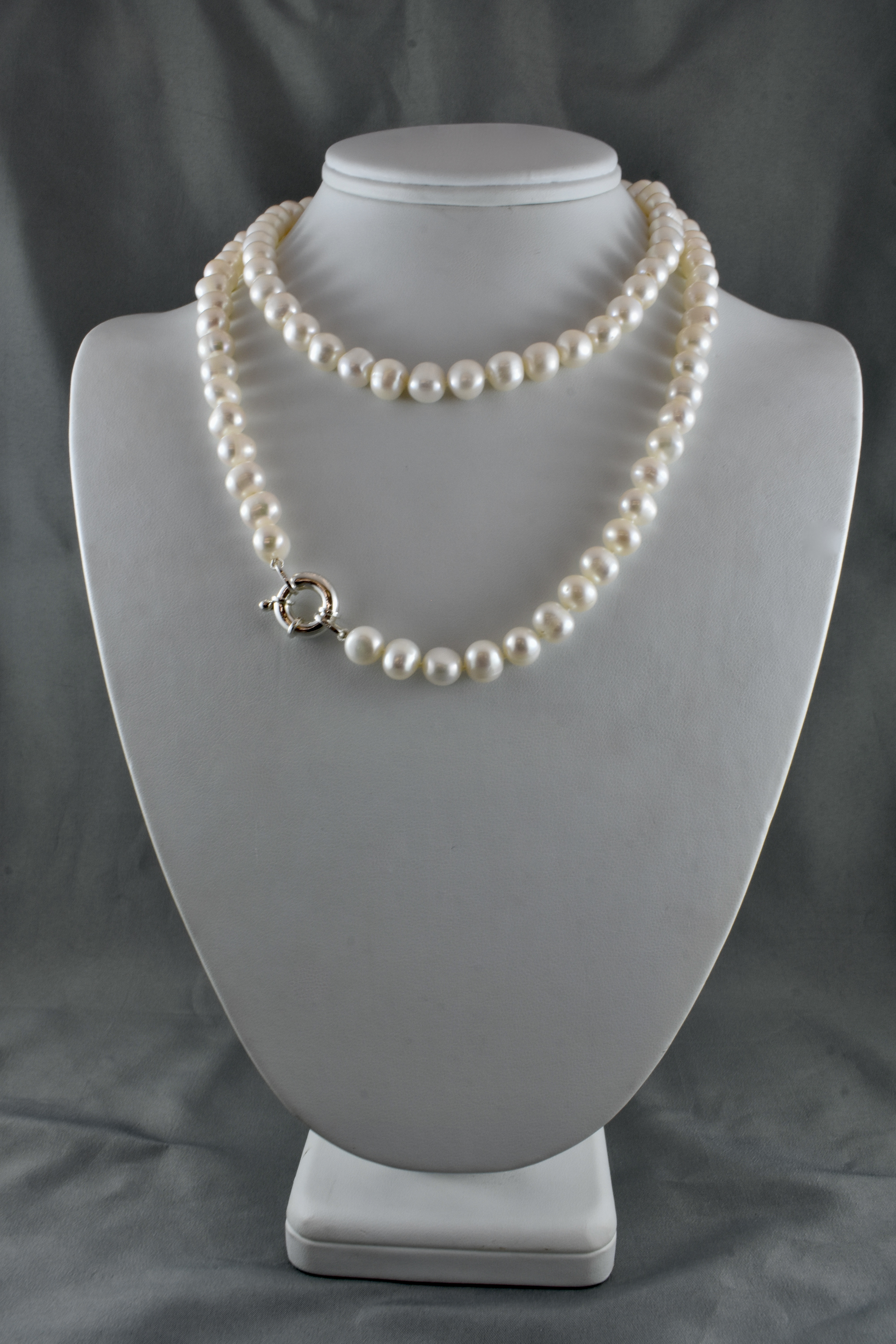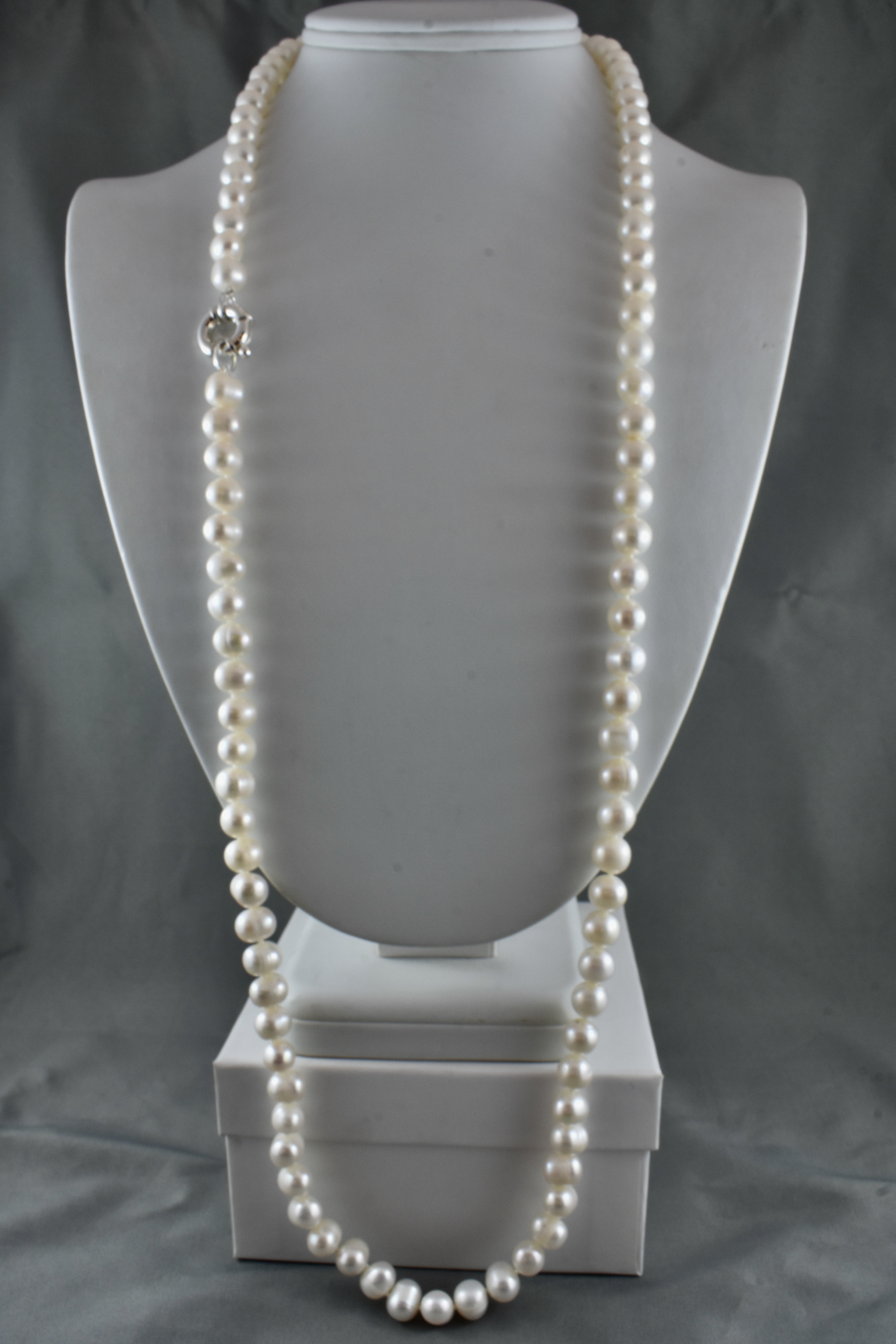 A stunning strand of freshwater pearls individually hand knotted on silk measuring 81cm, the pearls are 8-8.5mm near round, with a good lustre and white hue and a sterling silver boltring clasp