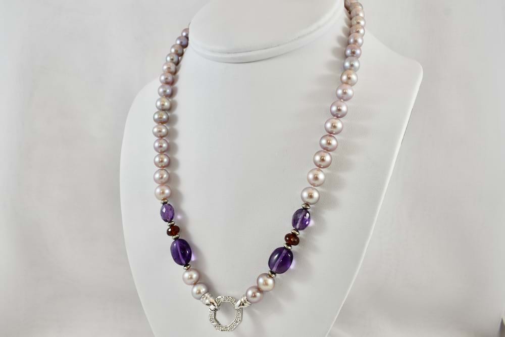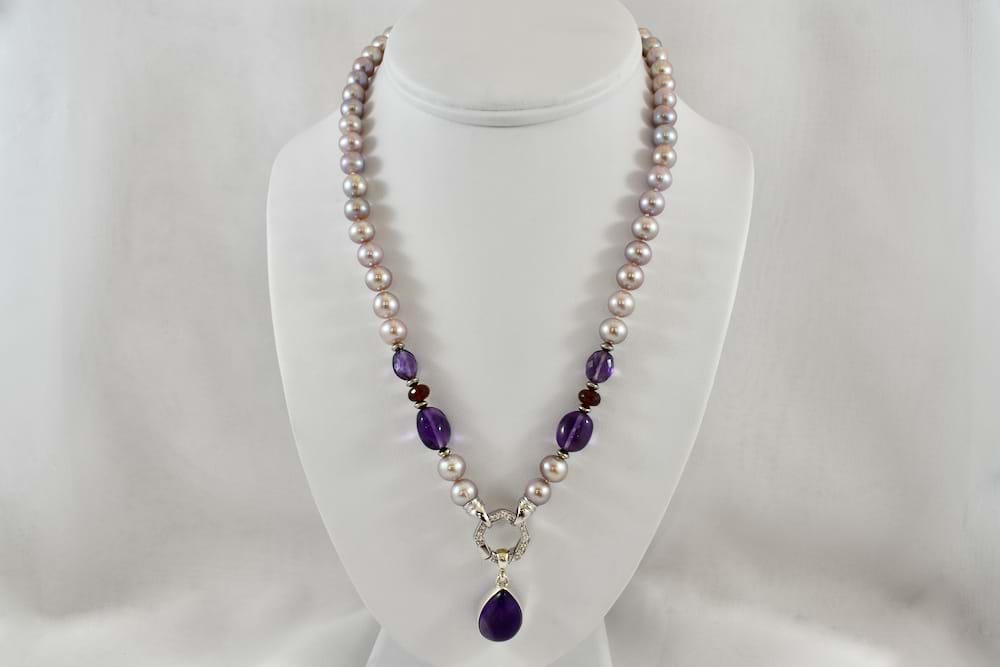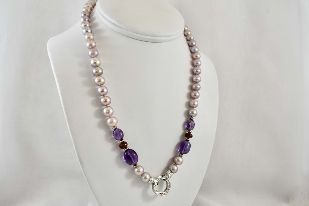This stunning strand features beautiful dusky freshwater pearls with large amethyst and round garnet in between. This strand has two clips and a sterling silver hexagonal clasp, lovely on its own or with the option to add enhancers or pendants