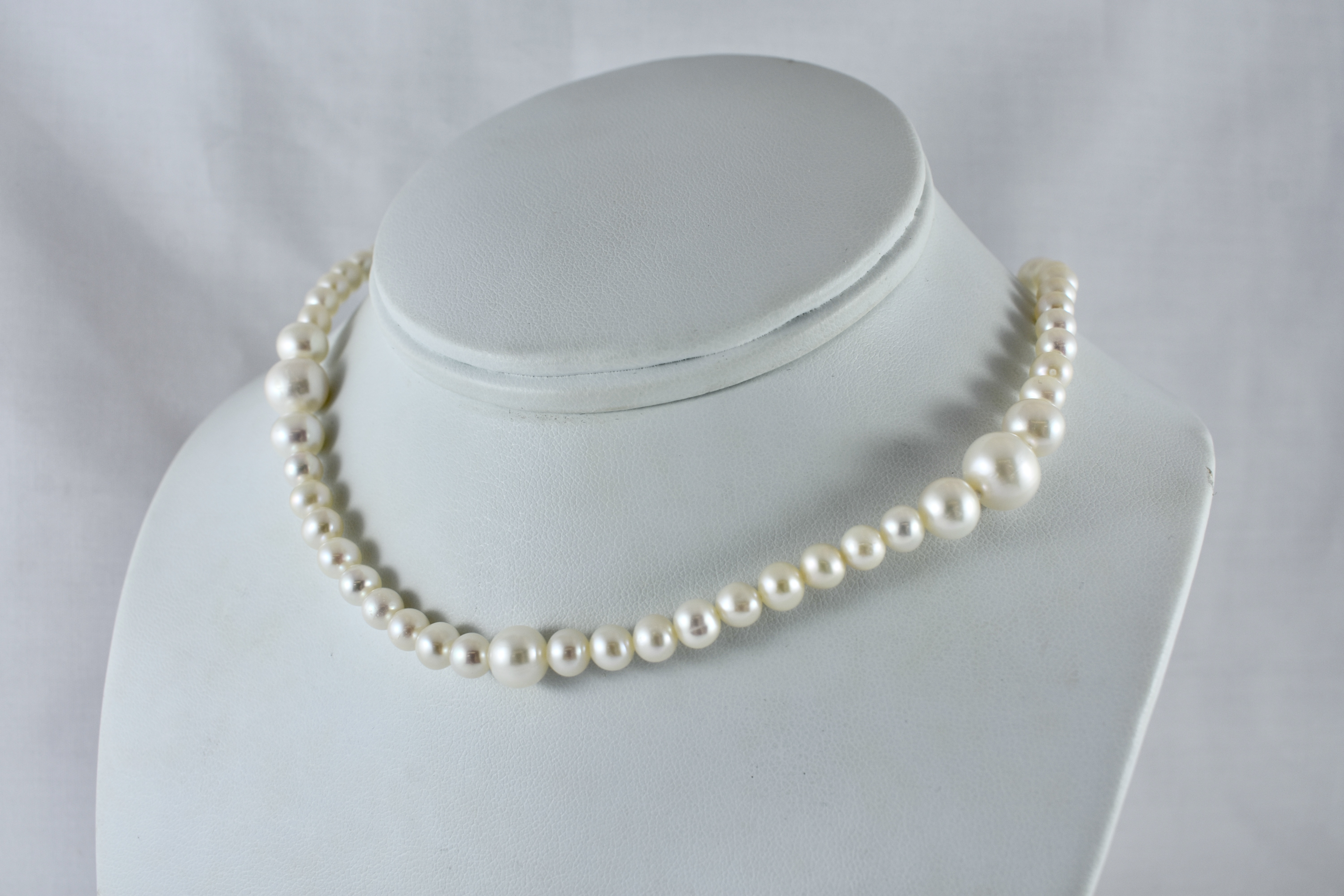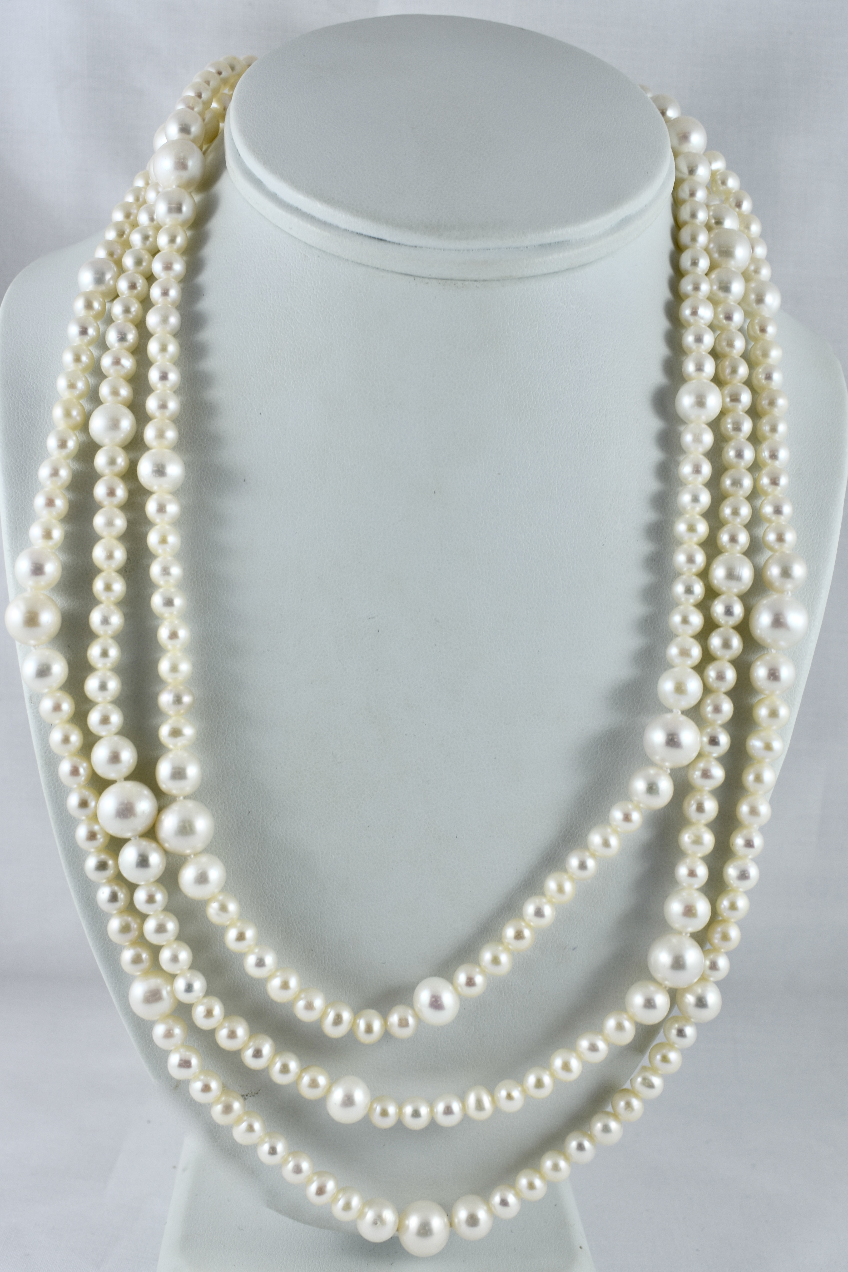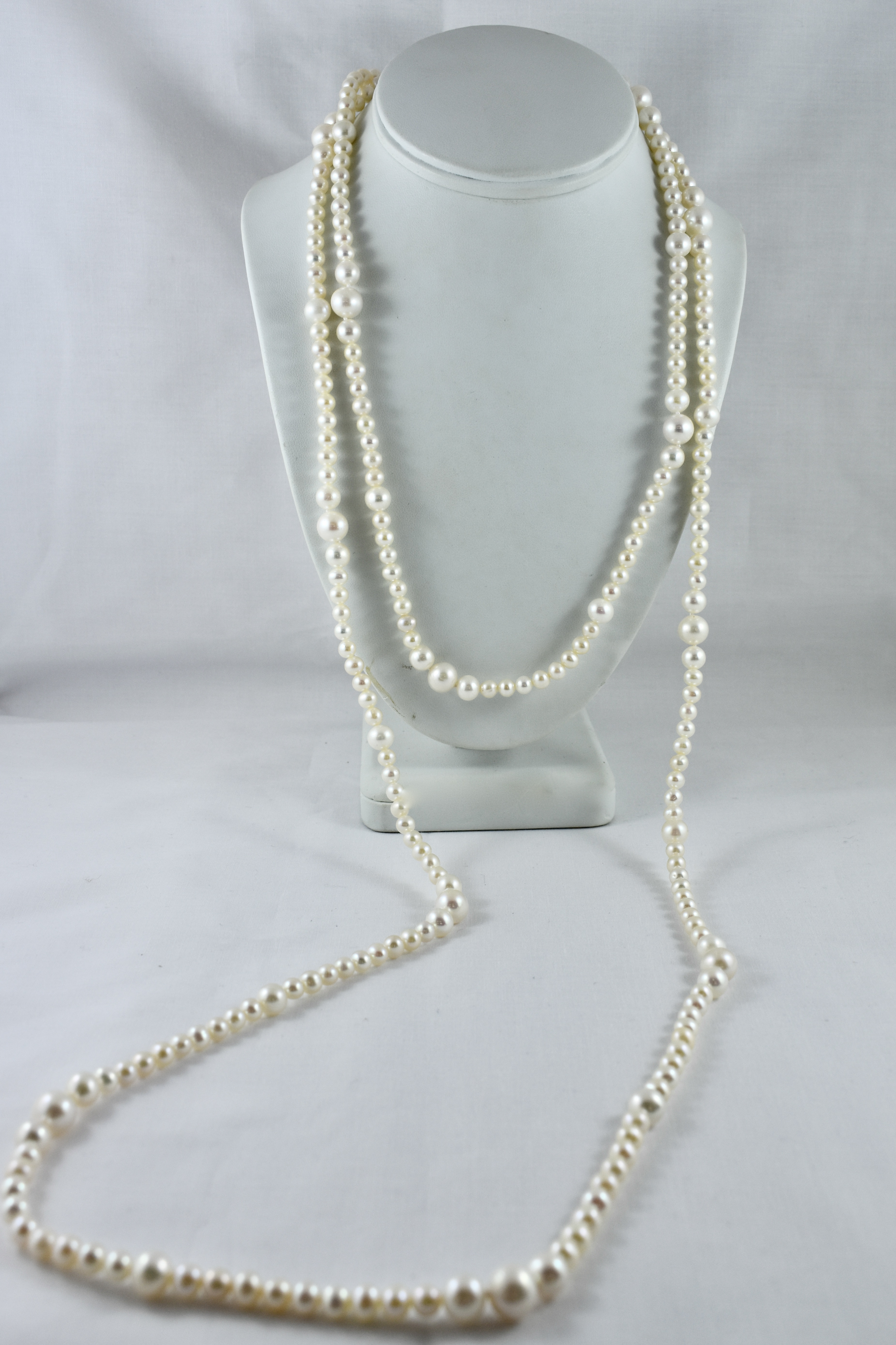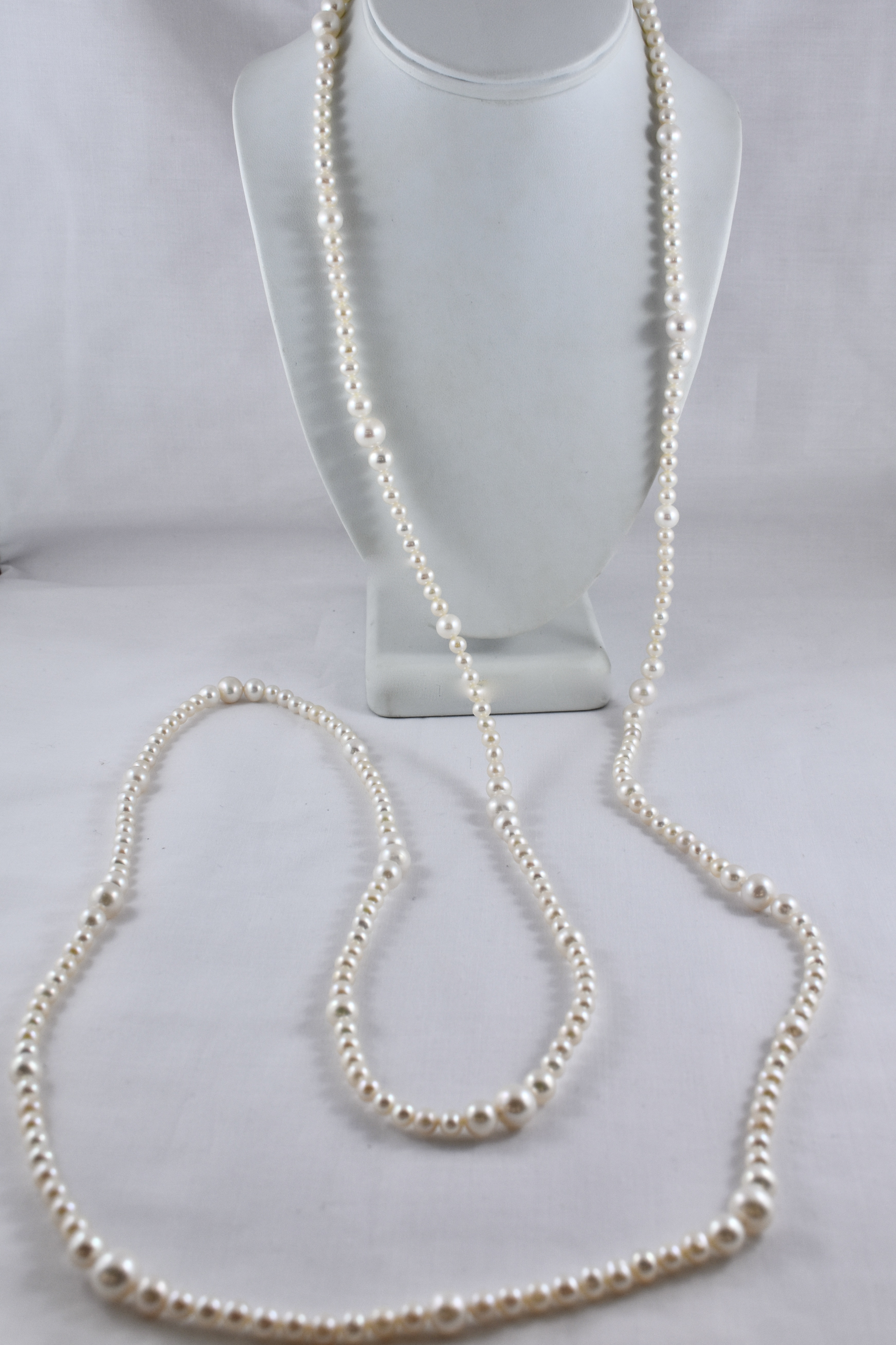 Beautiful white freshwater pearl strand, featuring multiple graduating semi round white 5-8mm pearls. This lovely strand measures 162cm long.