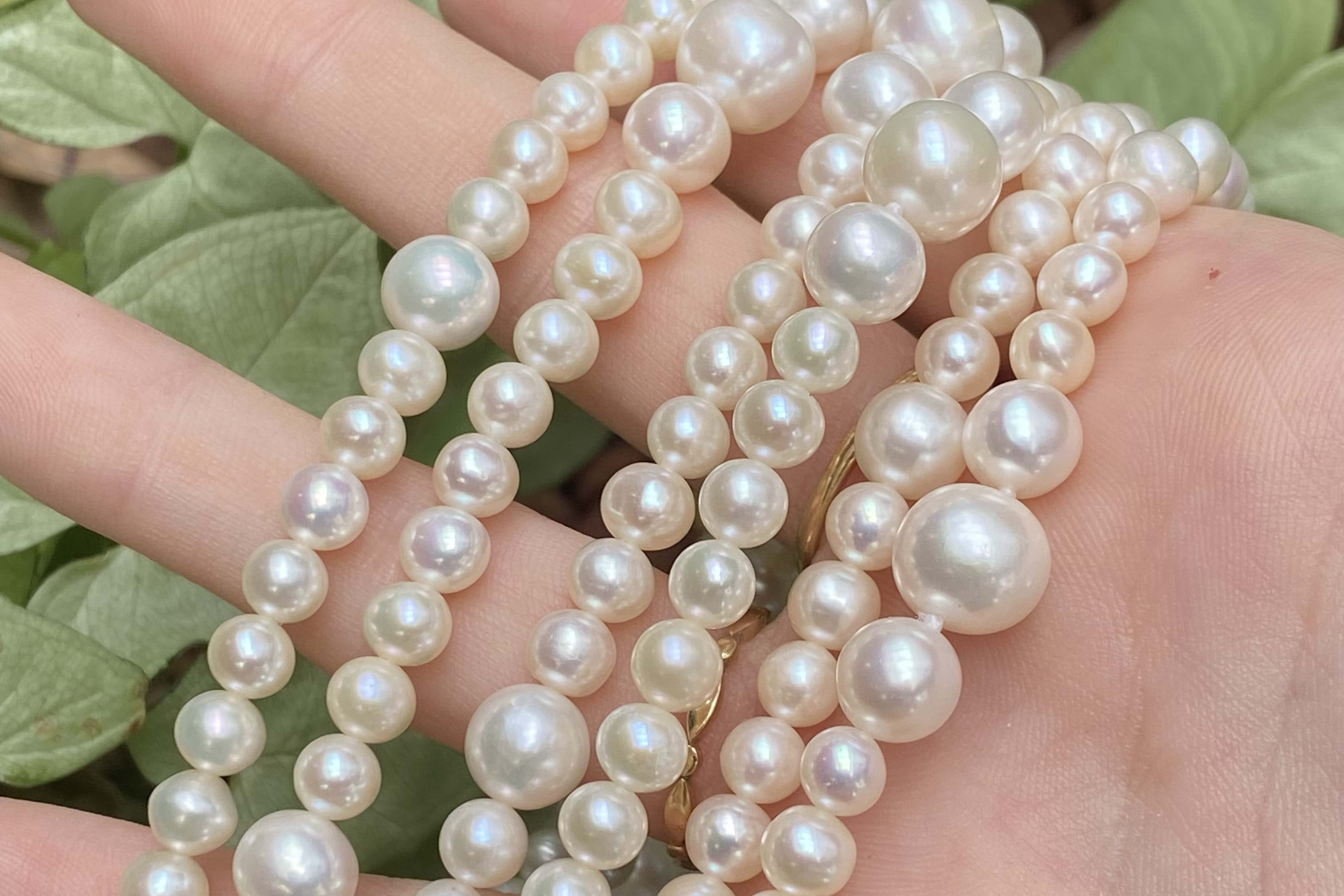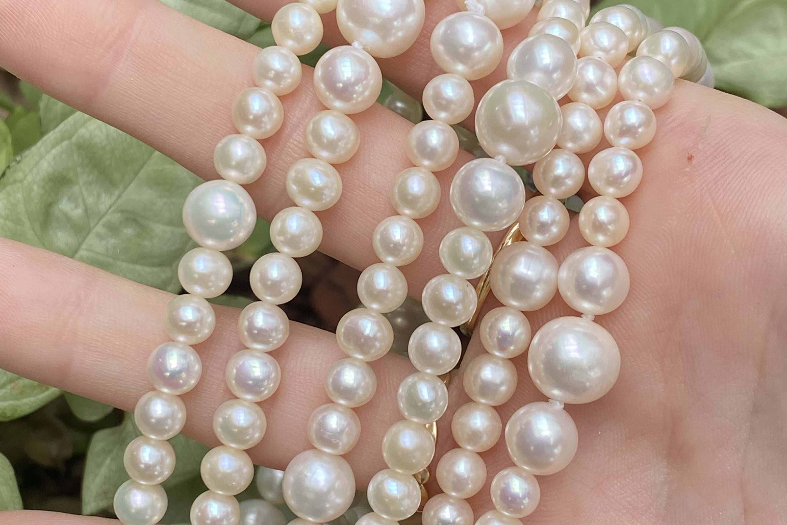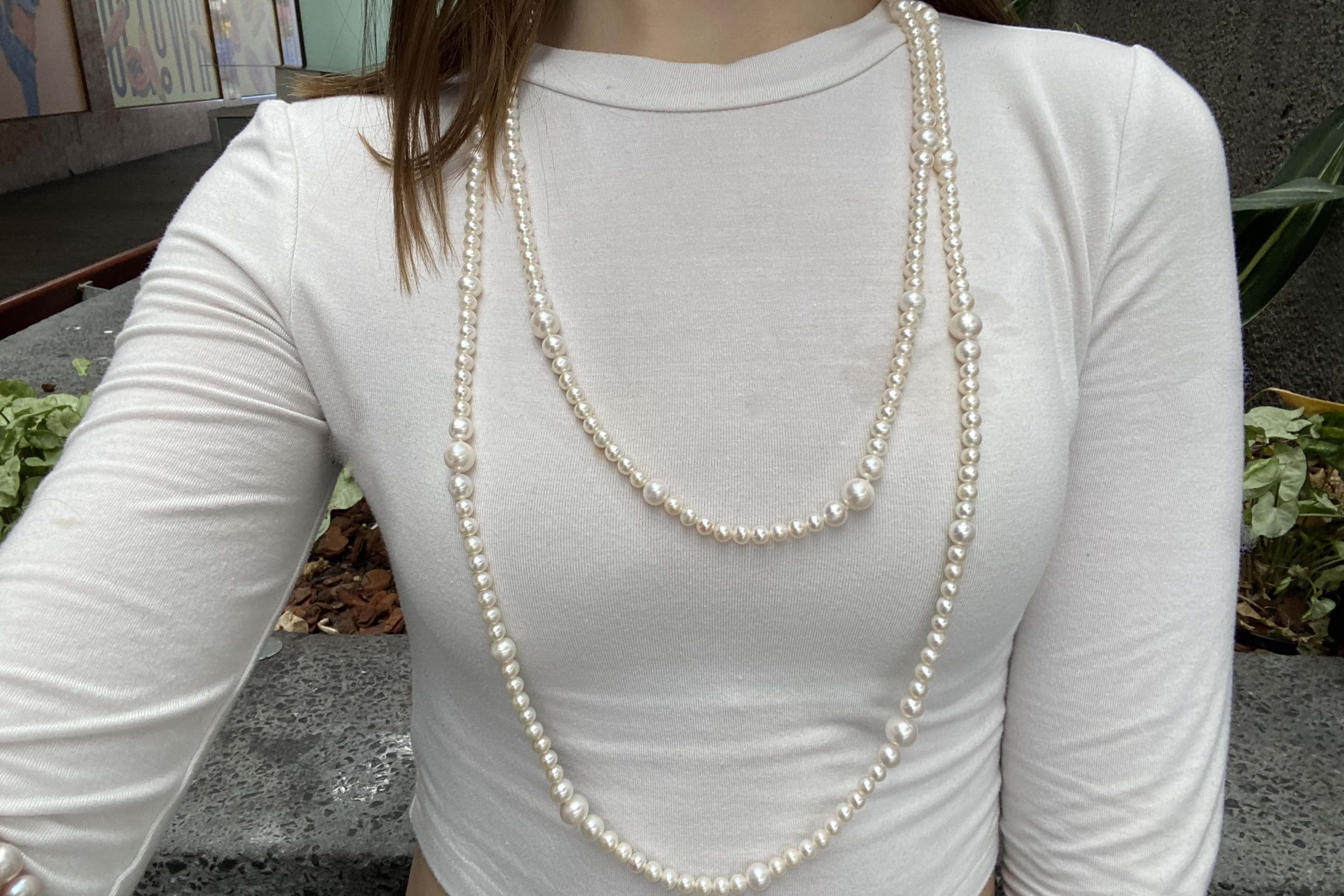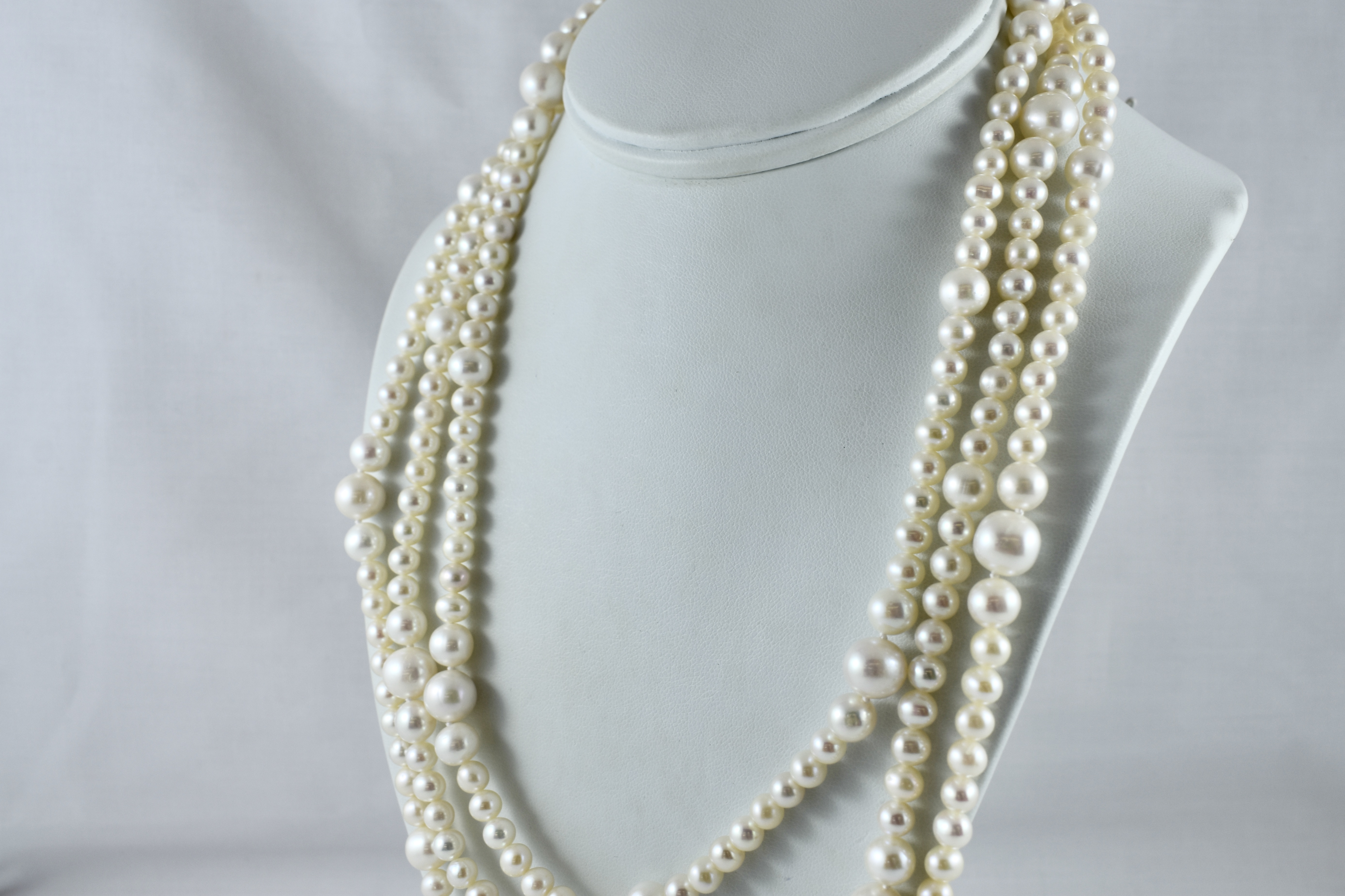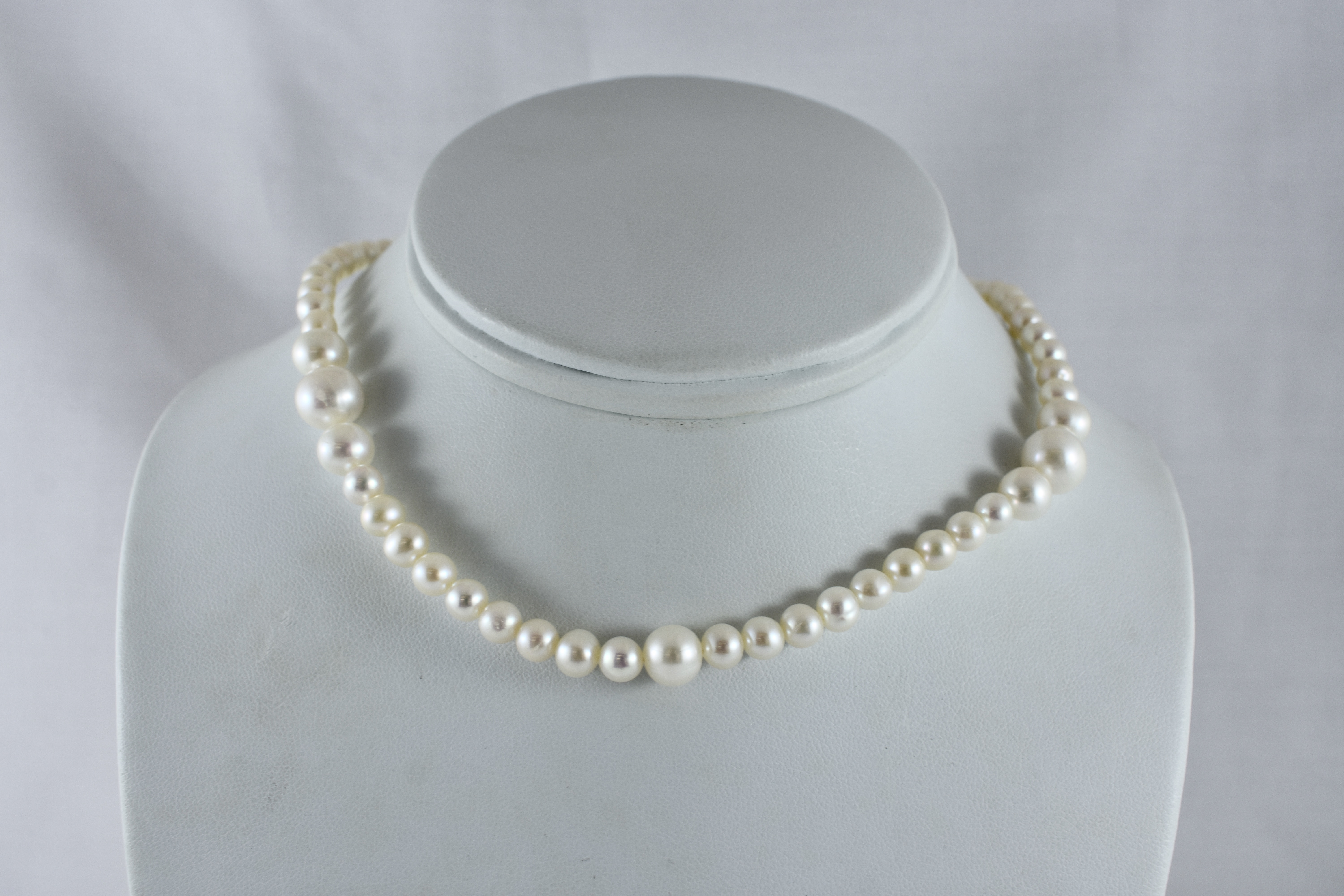 Beautiful white freshwater pearl strand, featuring multiple graduating semi round white 5-8mm pearls. This lovely strand measures 162cm long.