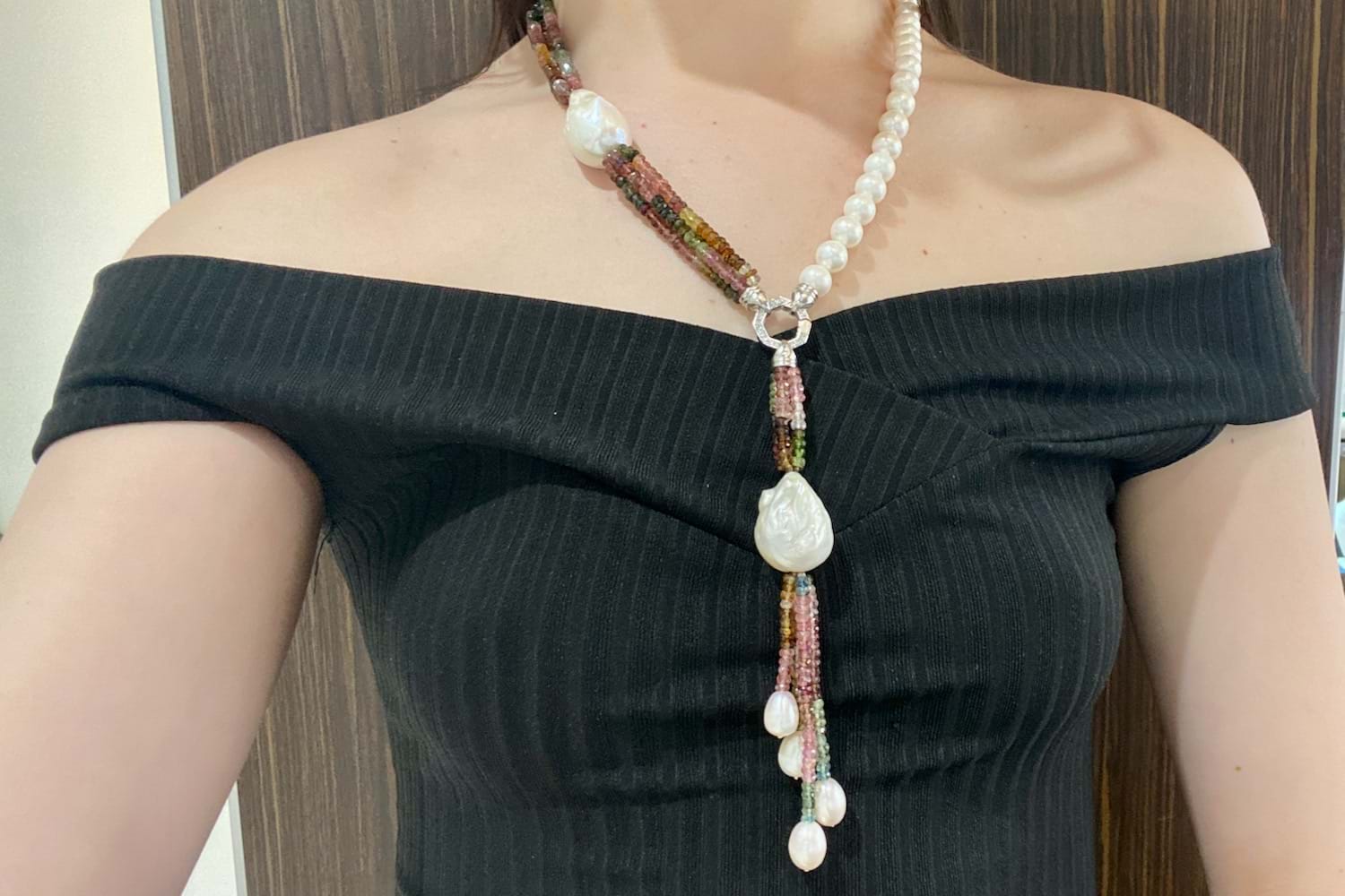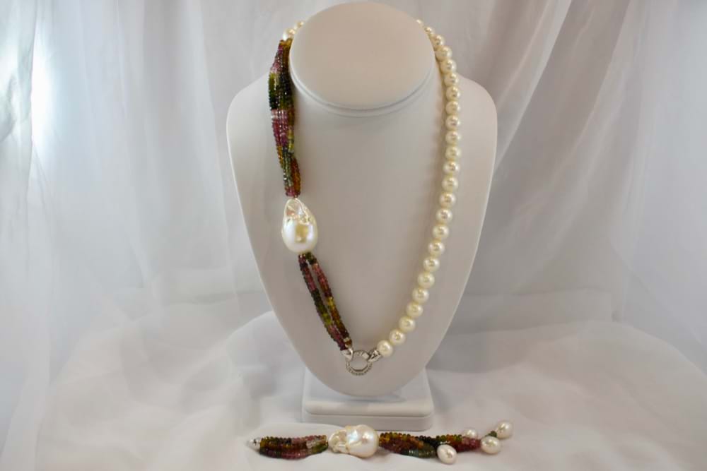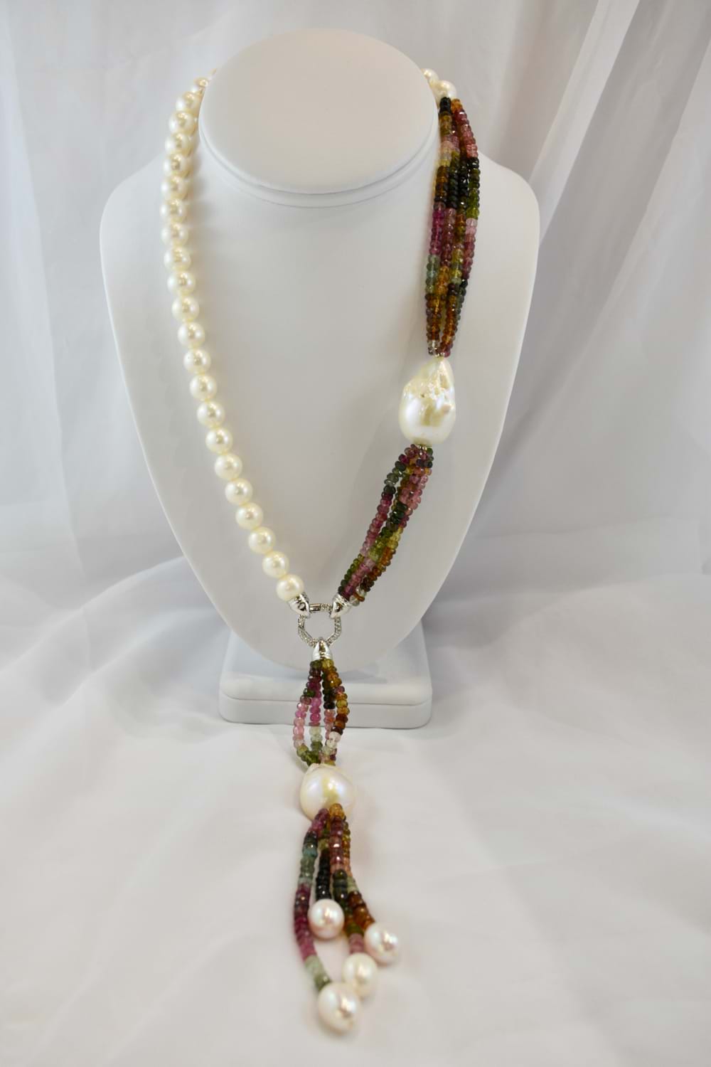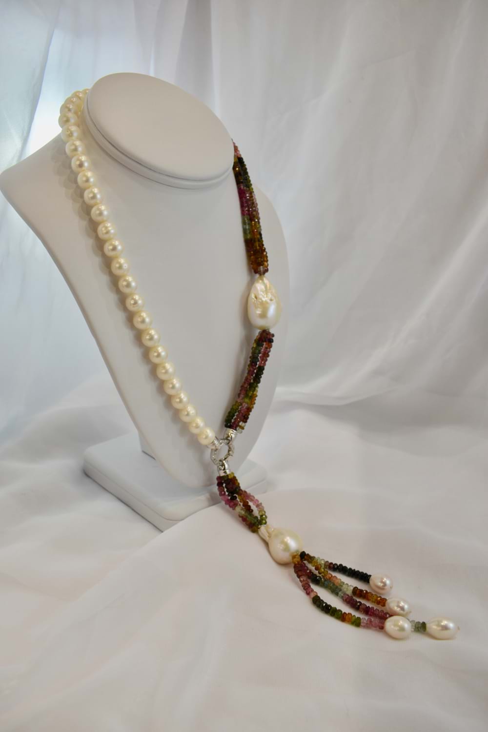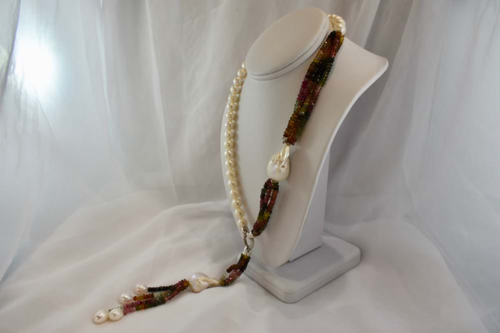 Multi coloured tourmaline & fresh water pearl strand with sterling silver CZ hex clasp and removable tassel. The strand of fresh water pearls are 9-9.5mm with an additional 20mm baroque fresh water pearl strung within the tourmaline beads and another 20mm fresh water baroque pearl in the removable tassel. There are four strands of 4-4.5mm button shaped mid pink, light to dark green and light to dark brownish green tourmaline beads in the necklace as well as the removable tassel. The removable tassel has an additional 4 fresh water pearls. Independent valuation supplied