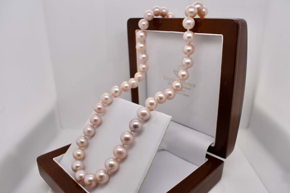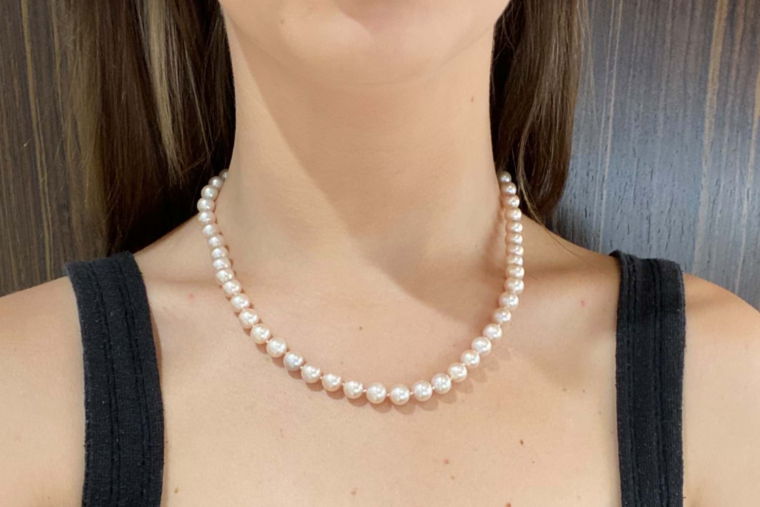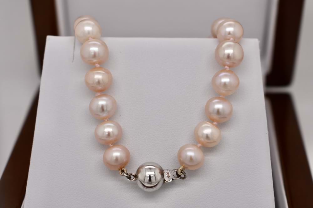 This pretty strand of dyed pink freshwater pearls measuring 7.5-8mm has a sterling silver 8mm ball clasp and is individually knotted