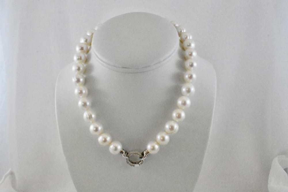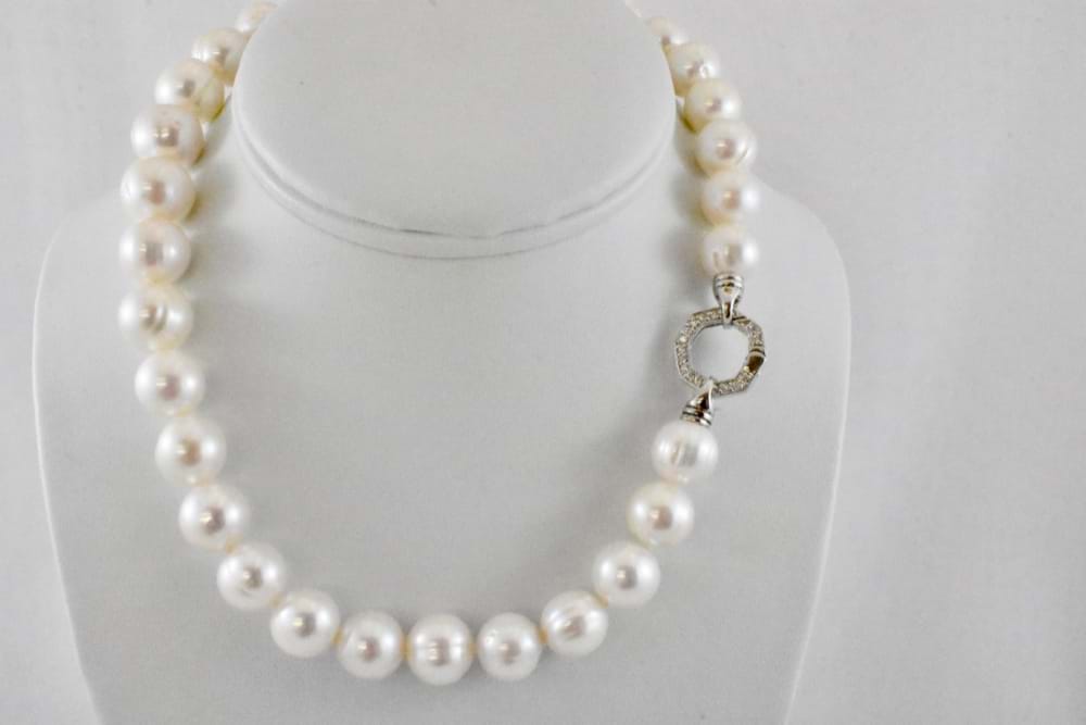 A stunning strand of freshwater pearls graduating in size from 10.5-13mm with a sterling silver and cubic zirconia hexagonal clasp. This strand is beautiful as a stand alone piece or with a pendant suspended from its' feature clasp