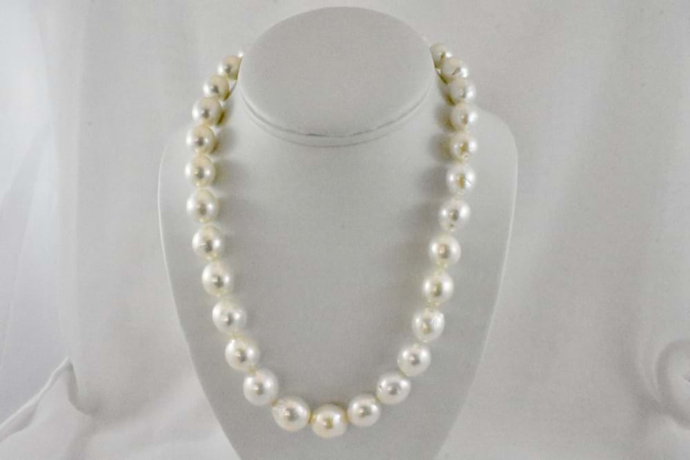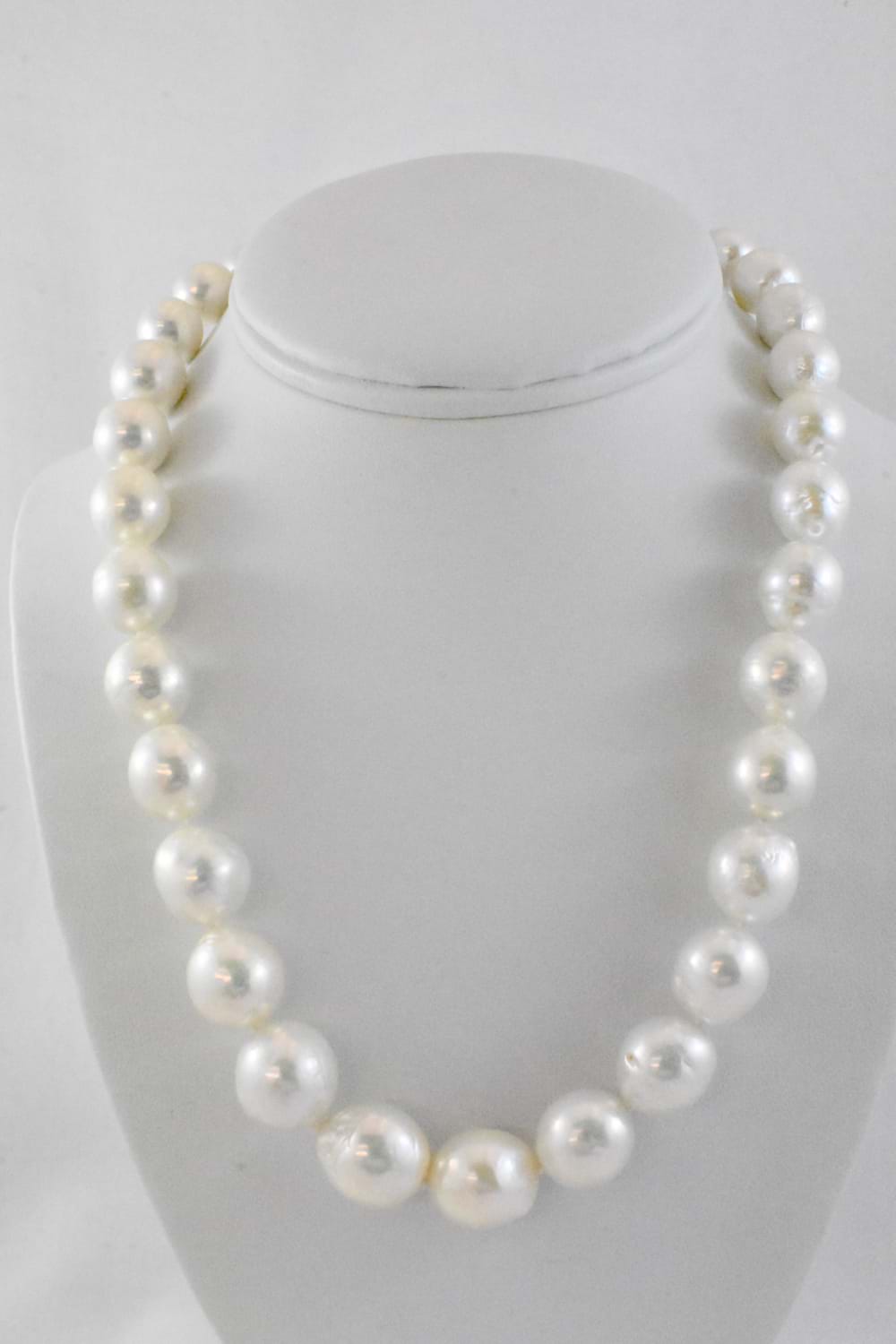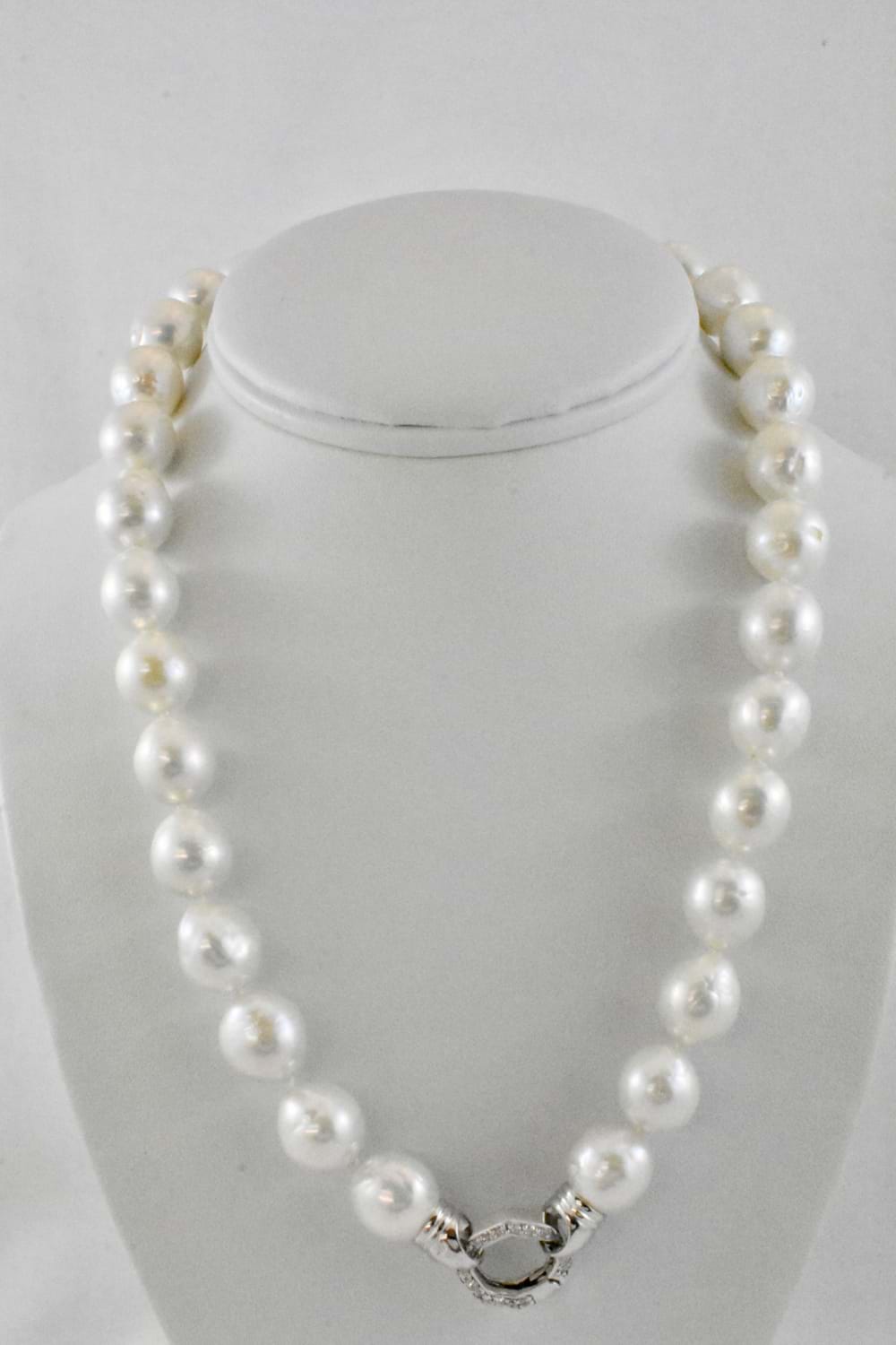 Stunning strand of large and difficult to source silver/white freshwater pearls. With a feature sterling silver and cubic zirconia hexagonal clasp adding the option of suspending a pendant, this strand can be transformed from classic to modern. Pearls graduate from 11-16mm