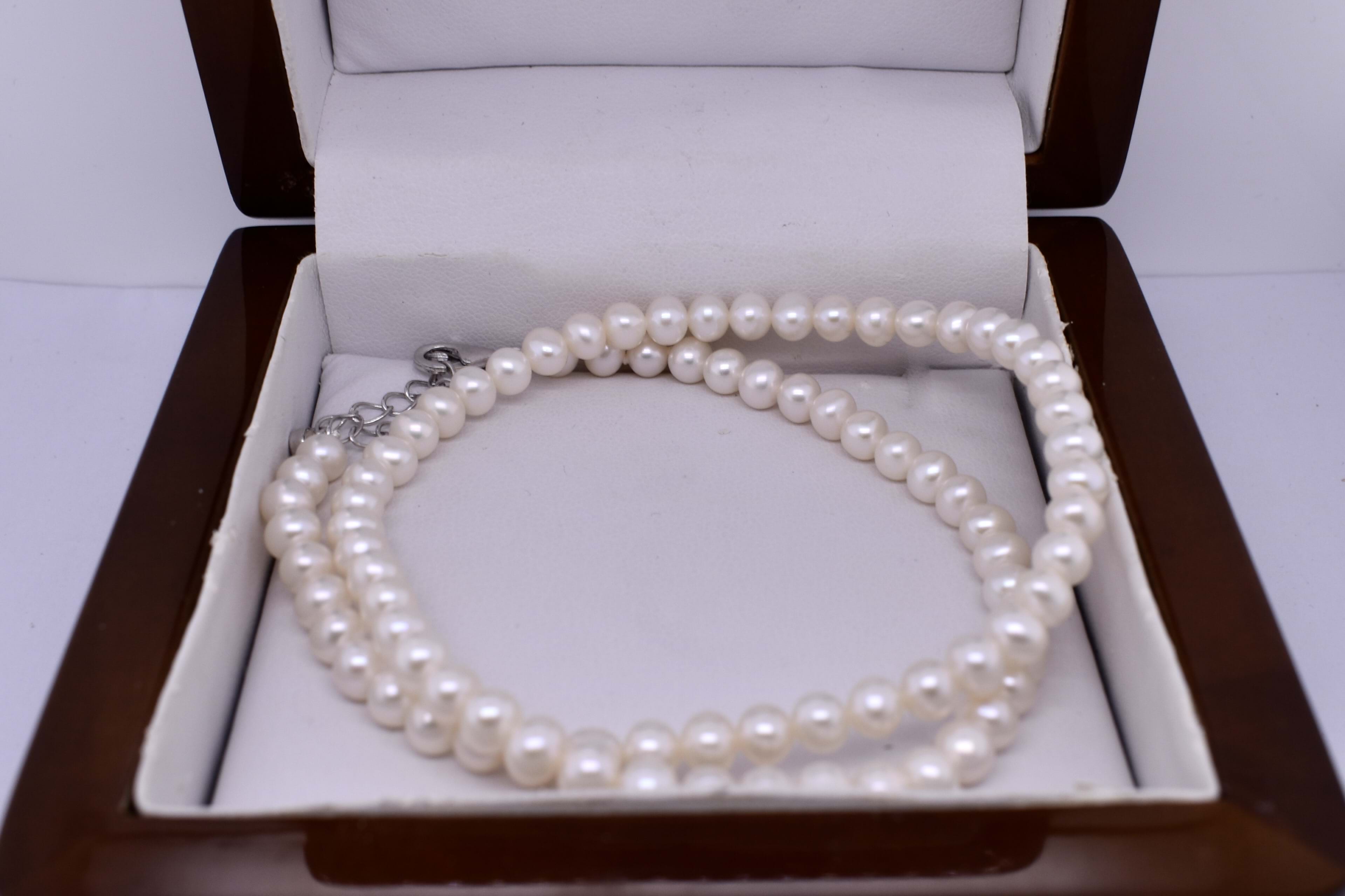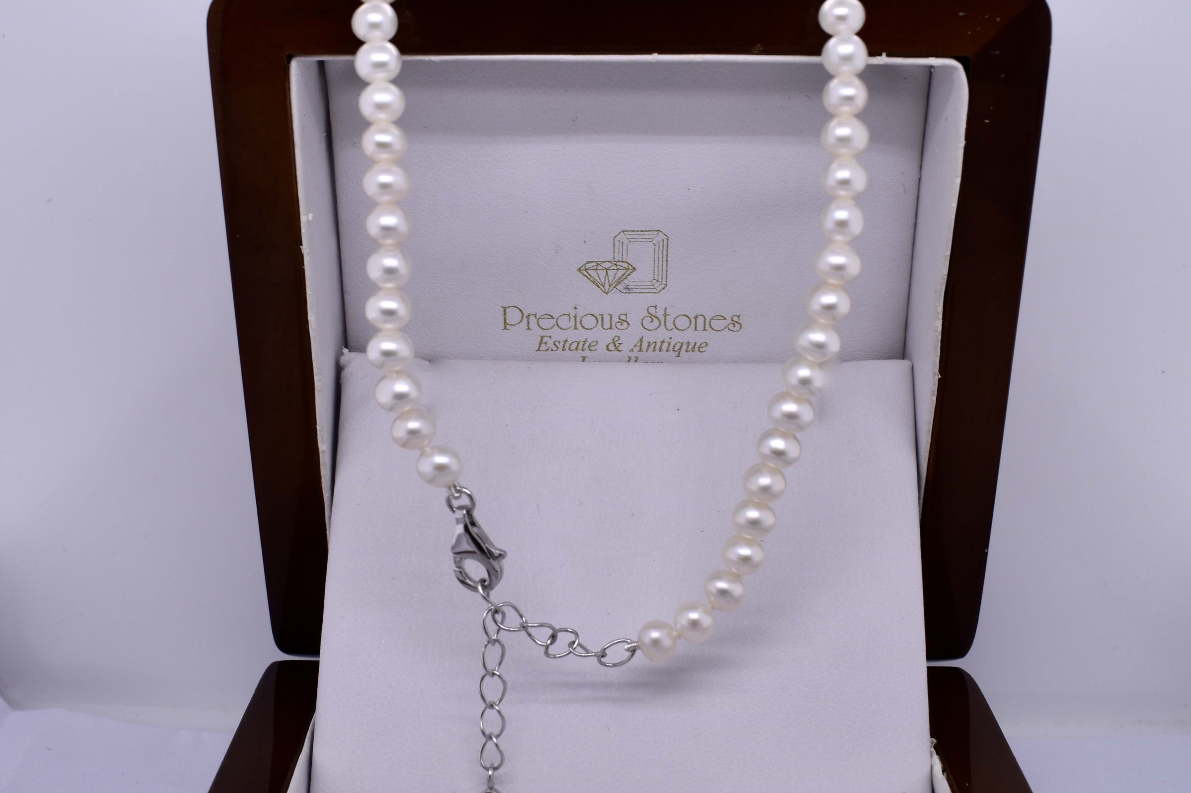 This simple and classic strand of freshwater 5.0-5.5mm near round white pearls has been hand strung on silk with a sterling silver parrot clasp. Strand measures 42cm with an additional 5cm of chain for adjustability.