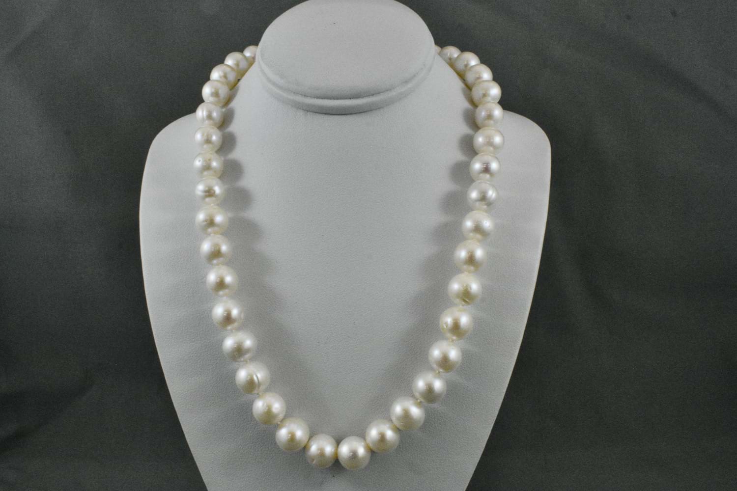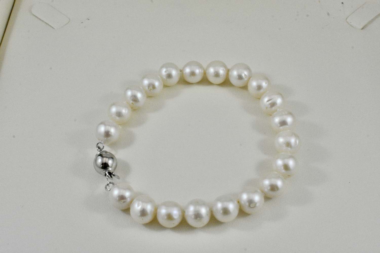 A beautiful hand strung strand of freshwater pearls measuring 45cm with a sterling silver ball clasp, with a matching 19cm bracelet. The freshwater pearls measure 8-9mm