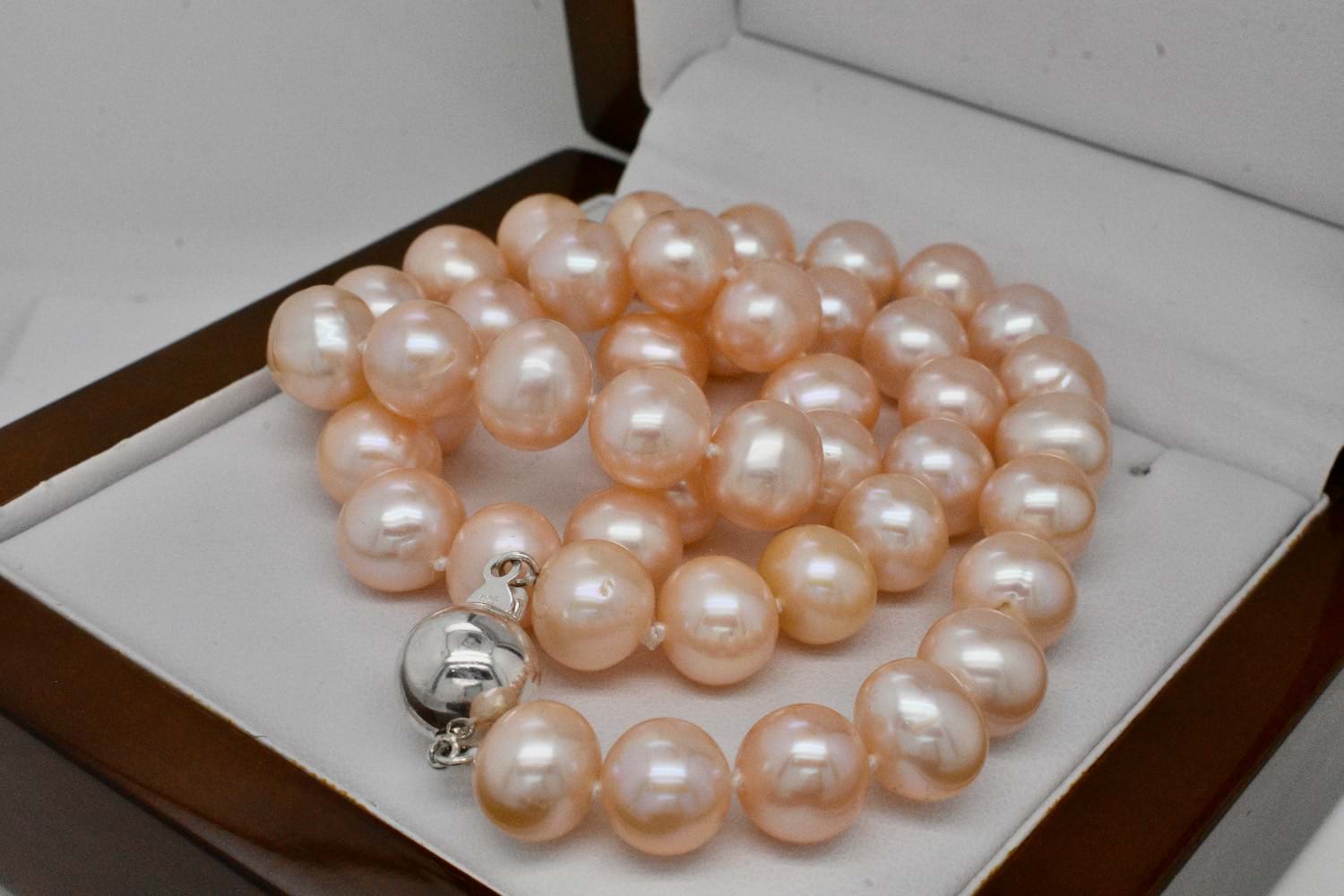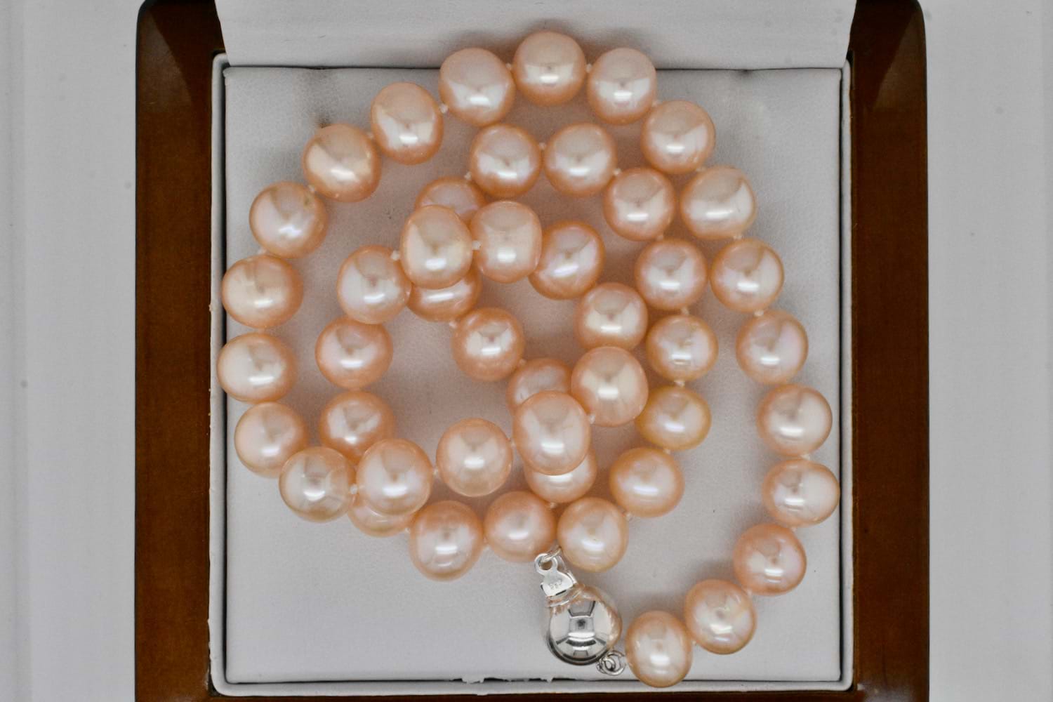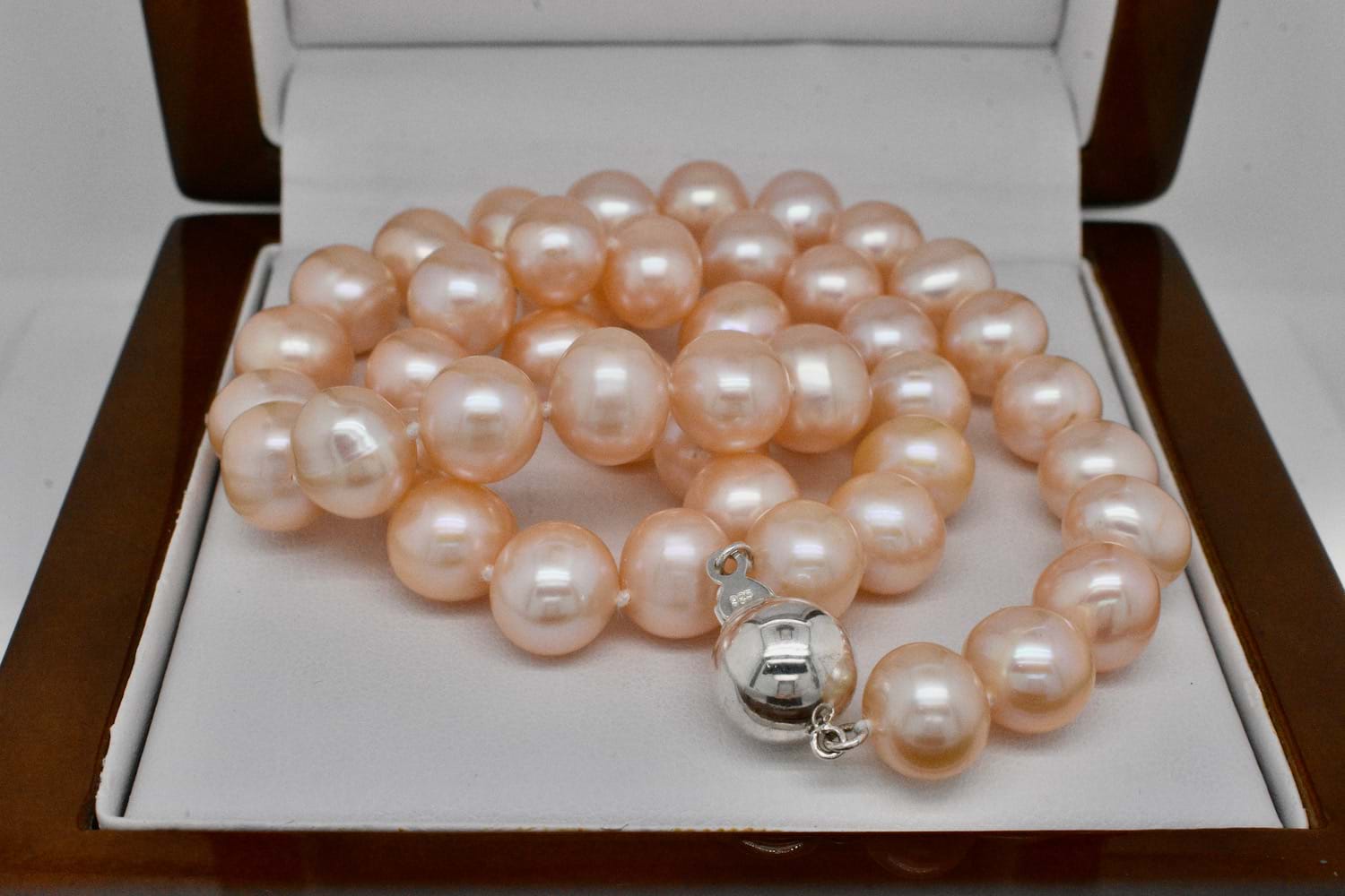 This gorgeous strand of dyed pink freshwater pearls measure 9-10mm round with a soft peachy pink tone and good lustre, with a polished round sterling silver ball clasp. Strand measures 45cm long. Pictured with matching bracelet 20318529 available for separate purchase which would make an excellent gift set