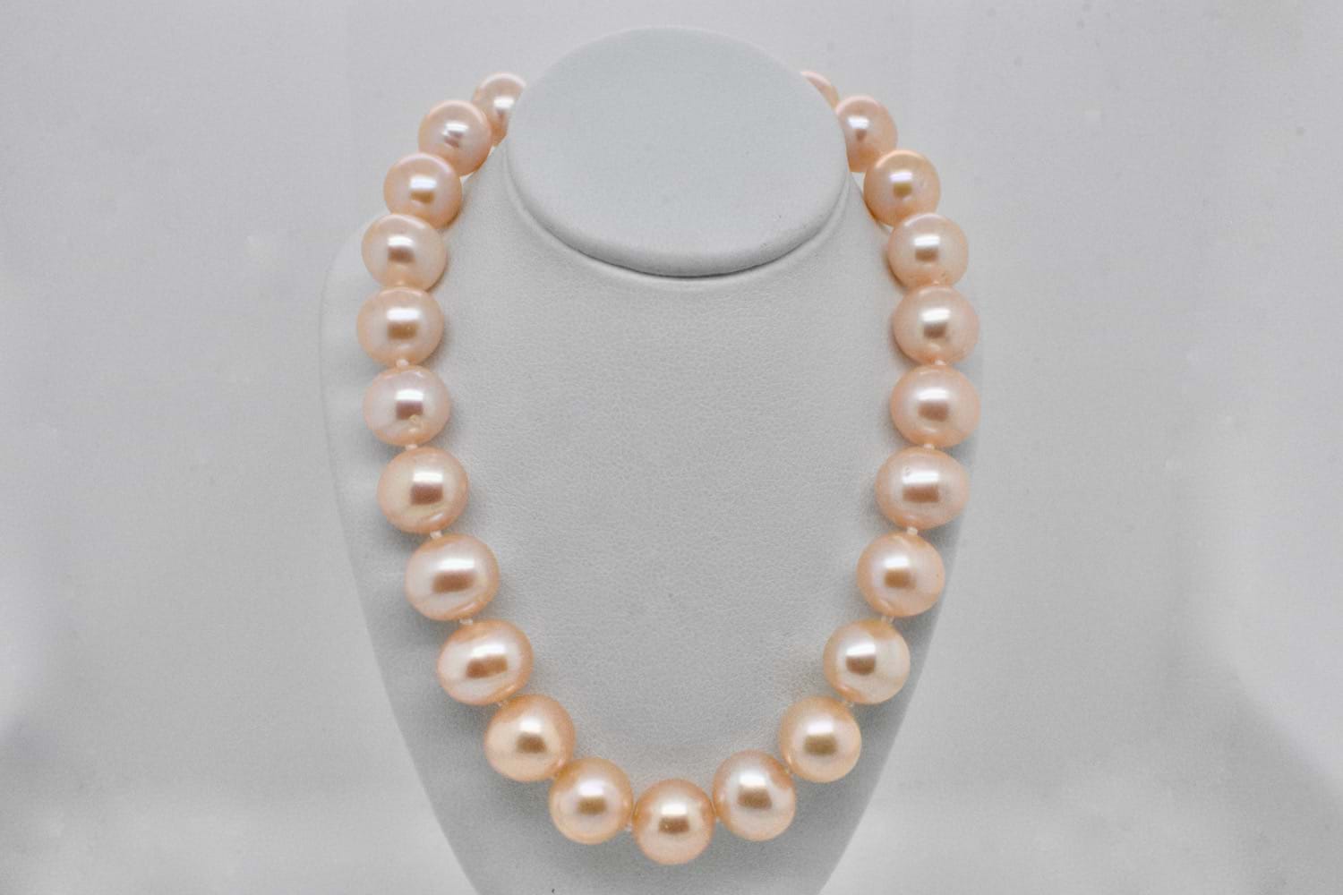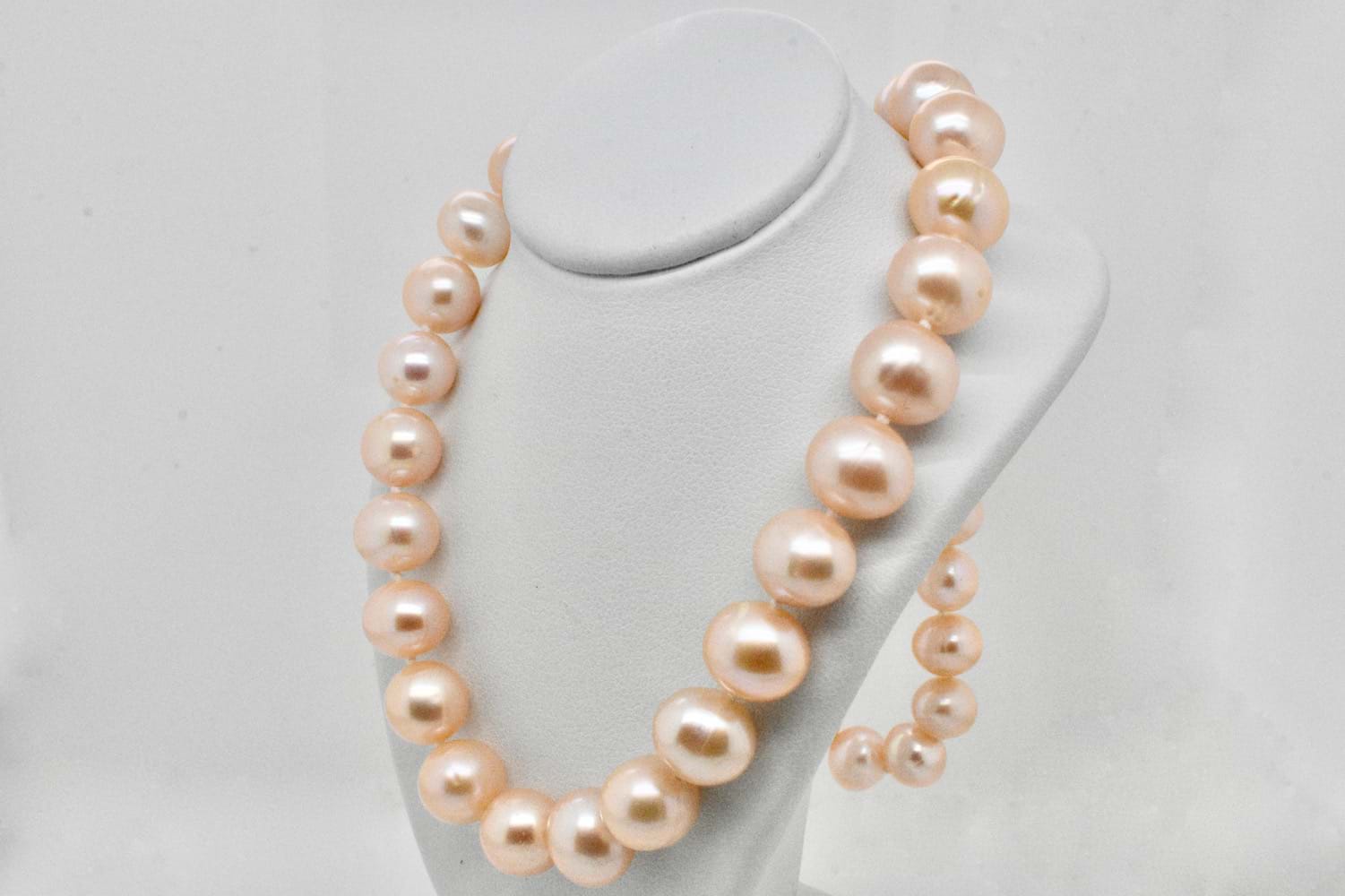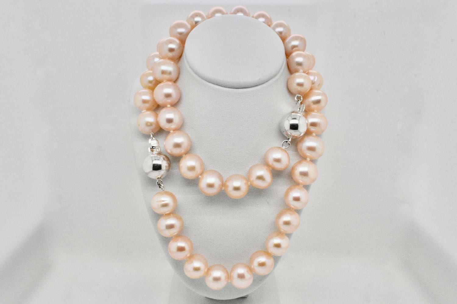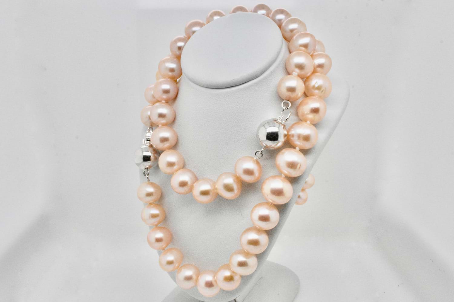 This gorgeous strand of dyed pink freshwater pearls measure 9-10mm round with a soft peachy pink tone and good lustre, with a polished round sterling silver ball clasp. Strand measures 45cm long. Pictured with matching bracelet 20318529 available for separate purchase which would make an excellent gift set