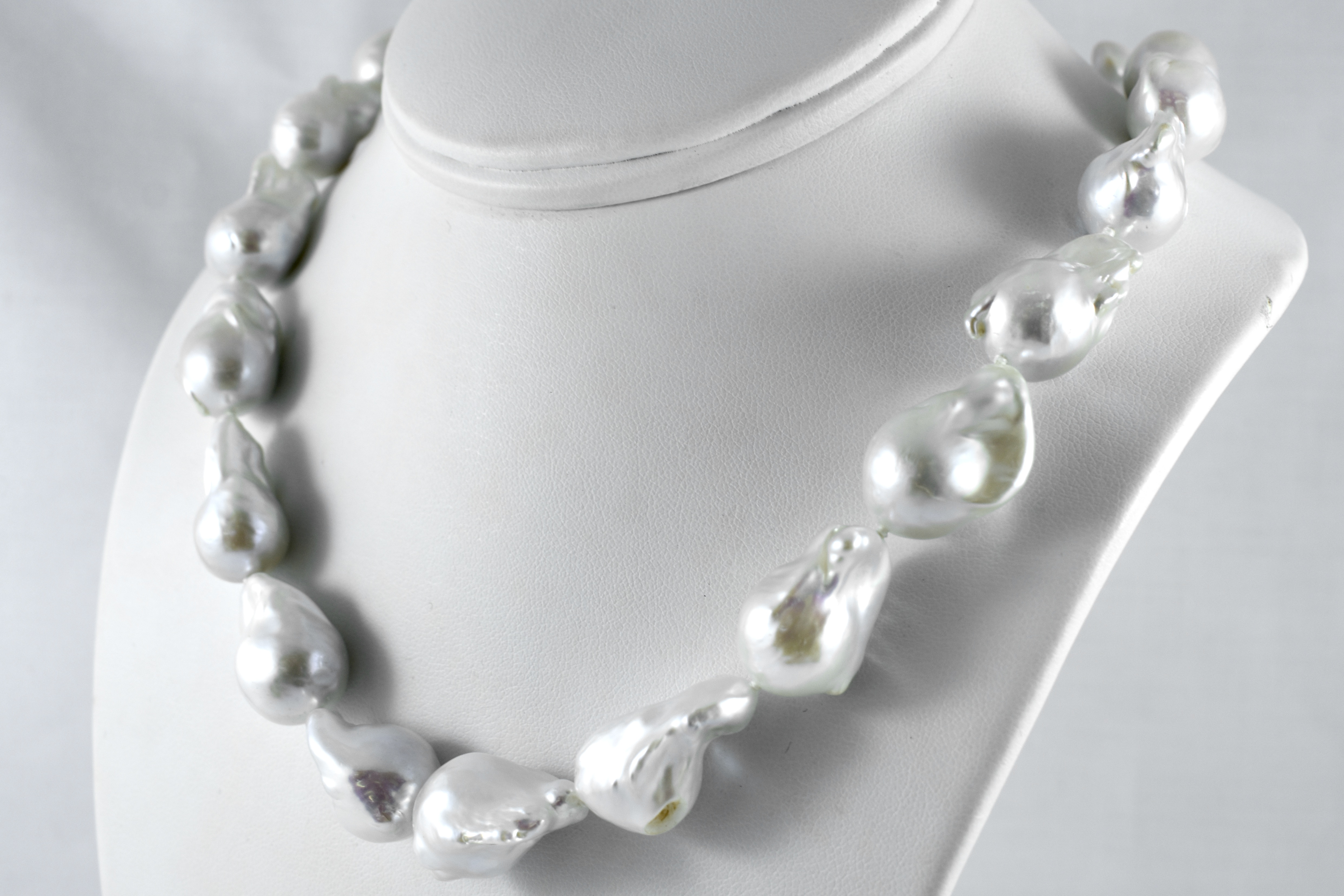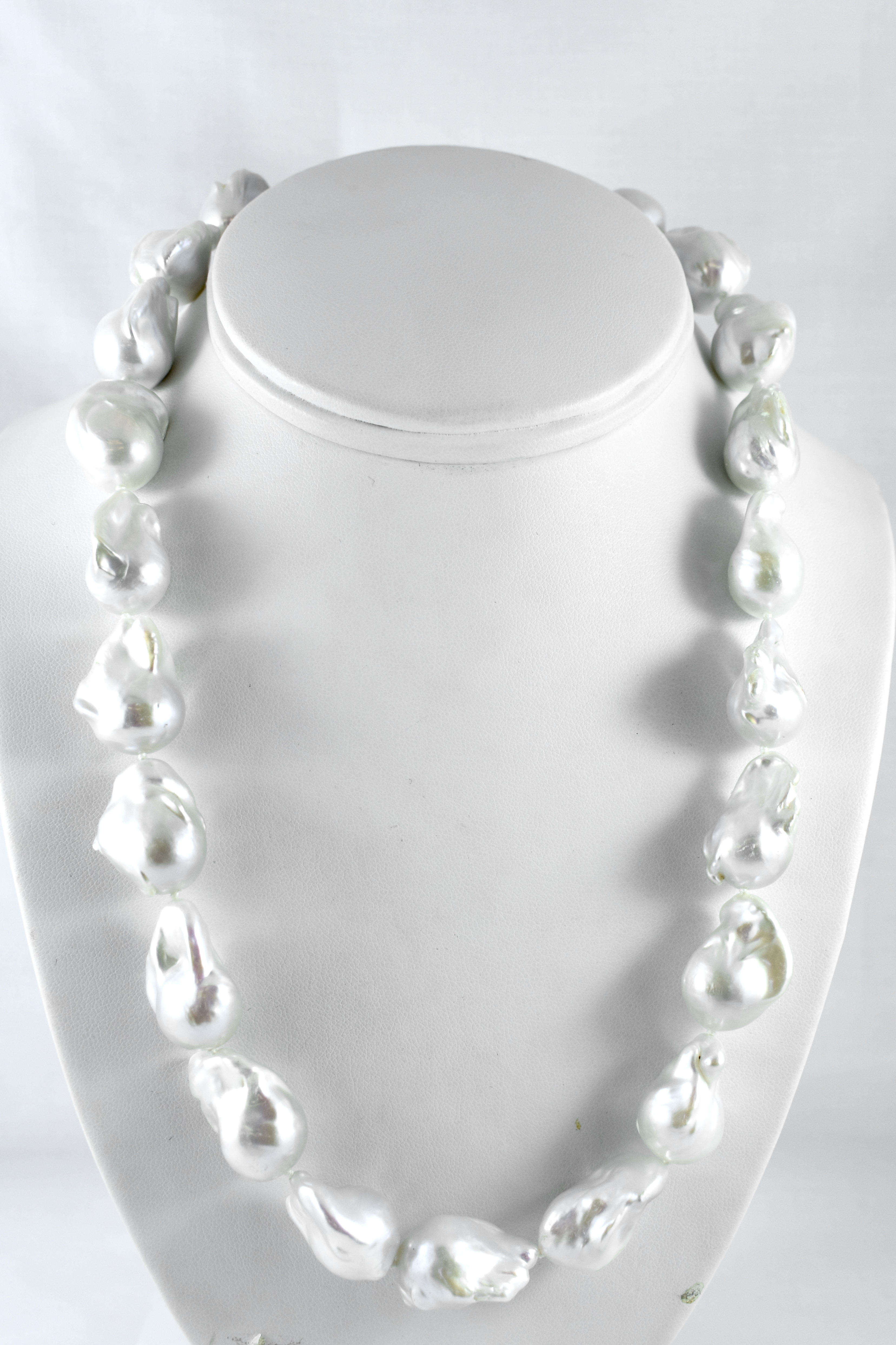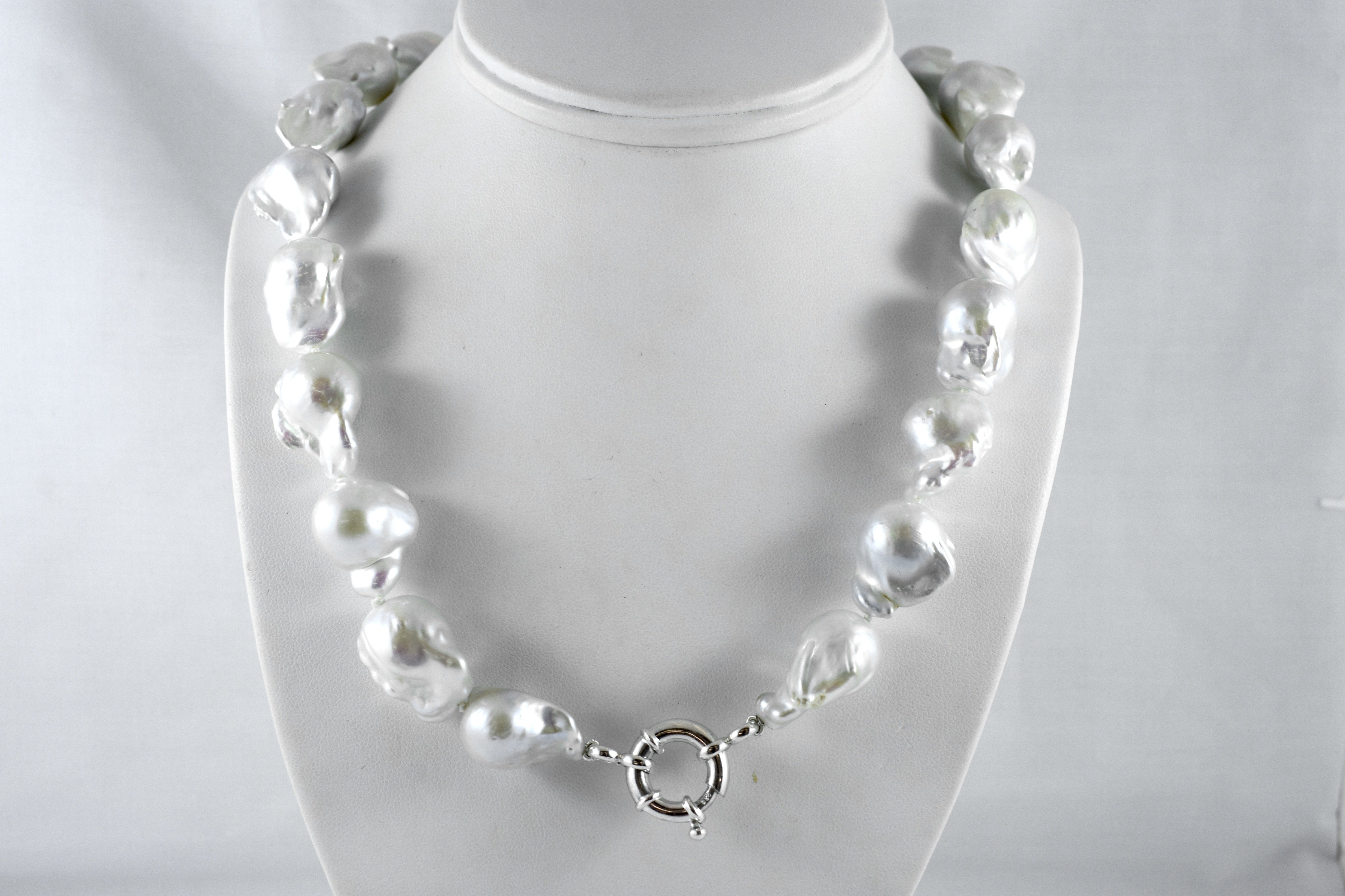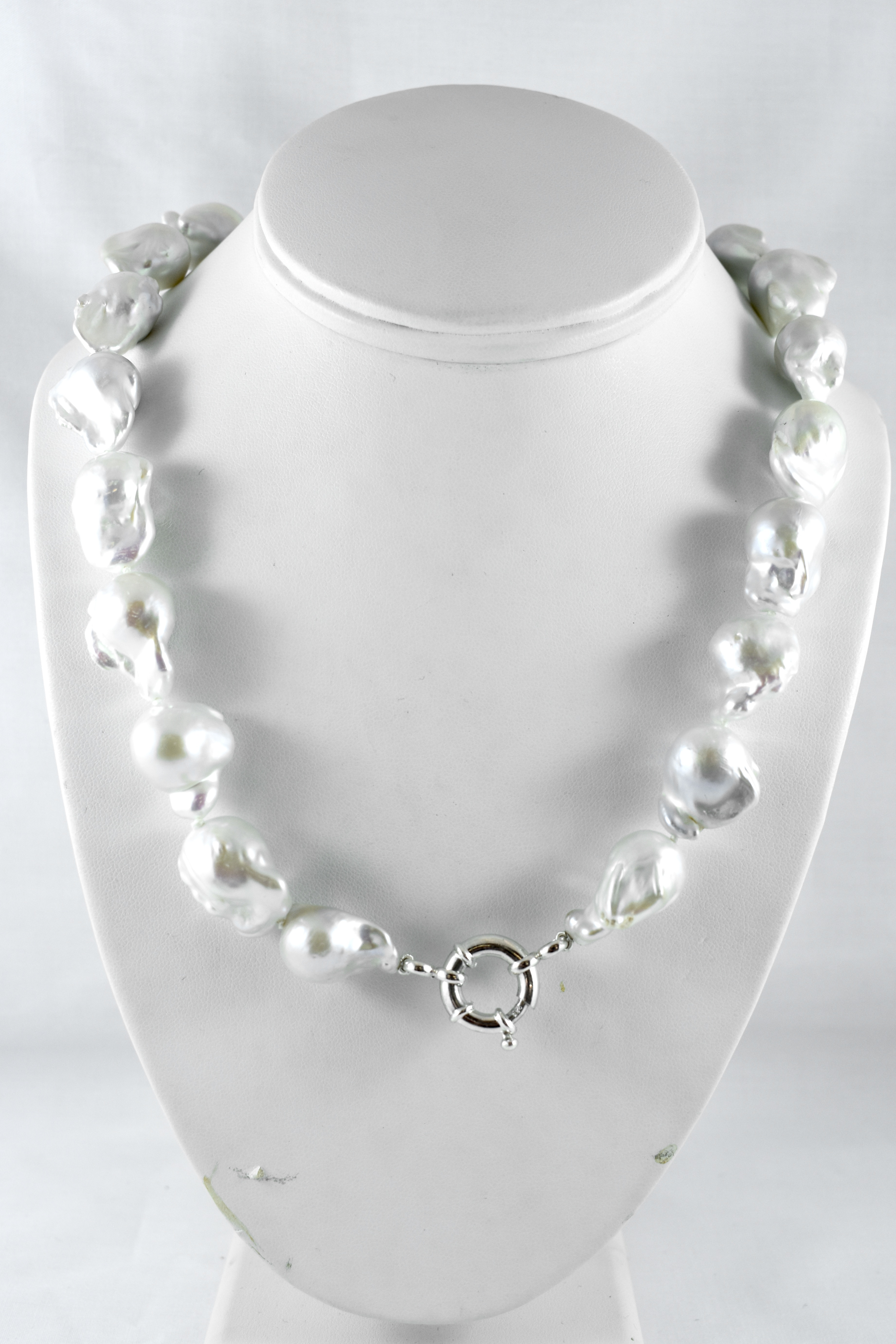 Gorgeous freshwater baroque white pearl strand, measuring 50cm long. Consisting of beautiful 13-15mm pearls with good lustre and completed with a sterling silver bolt ring clasp.