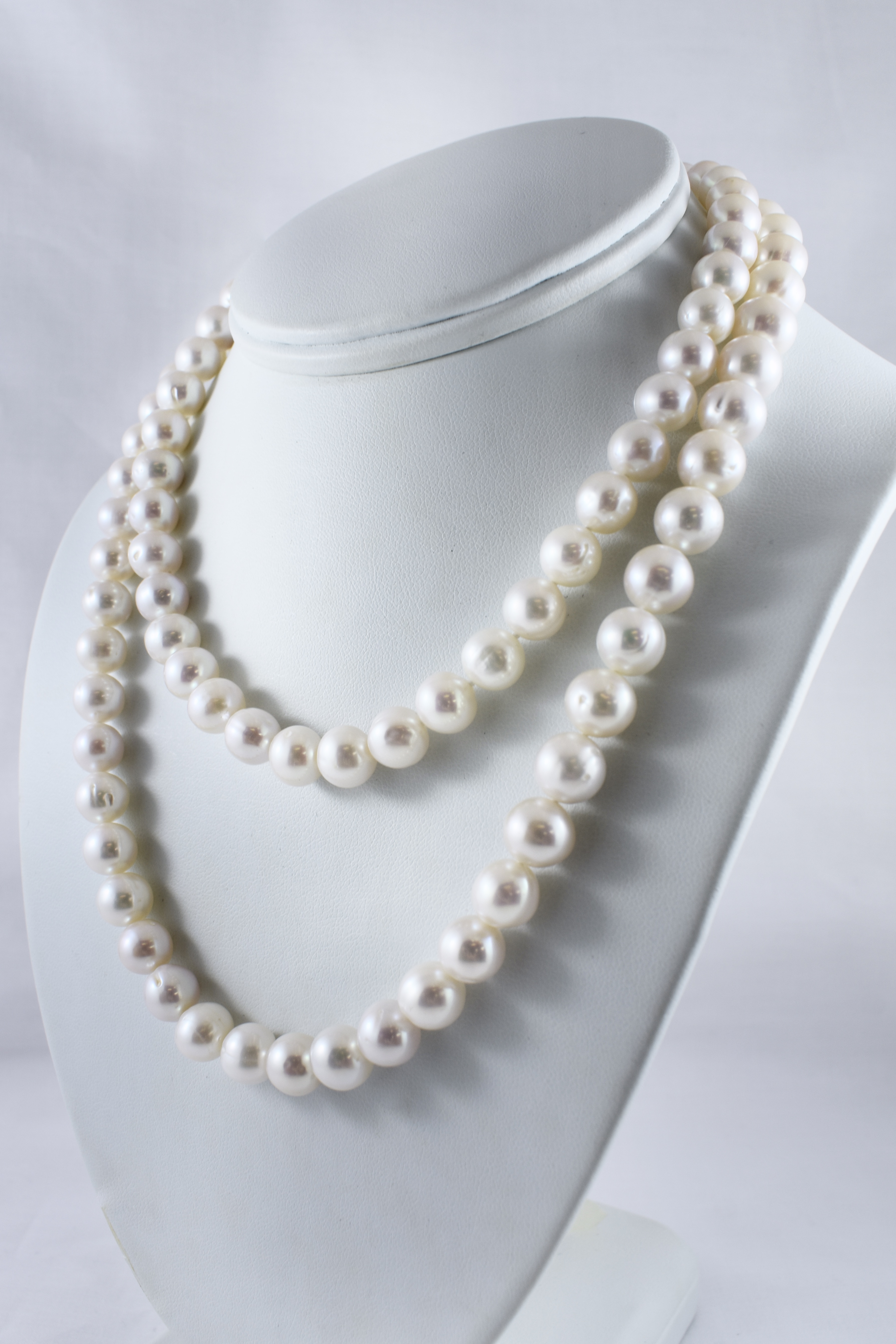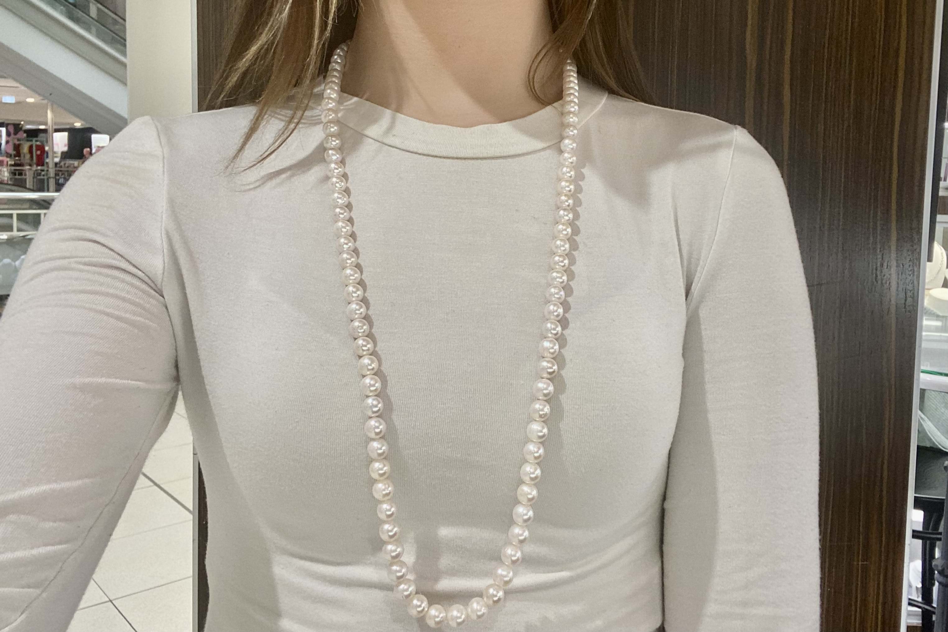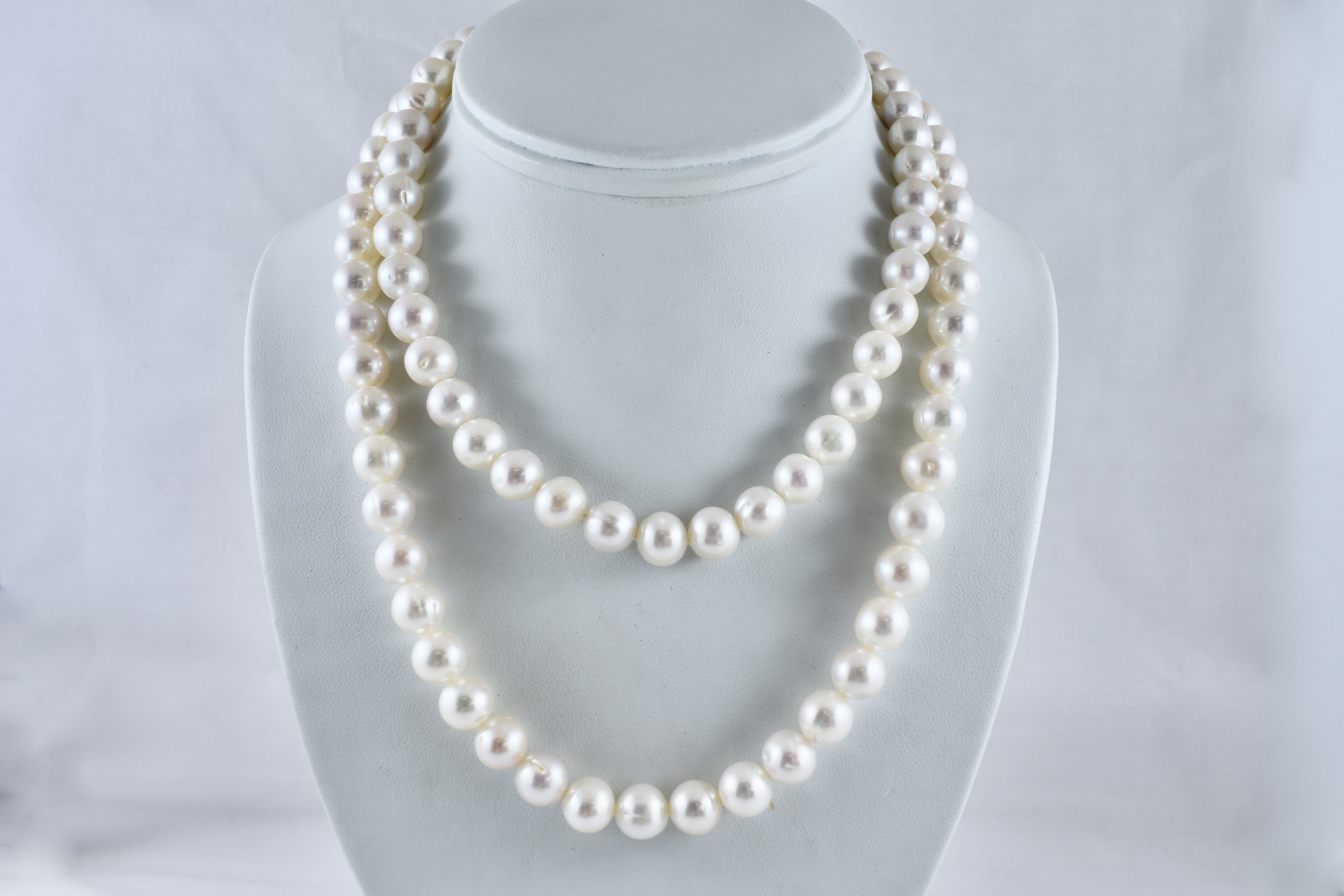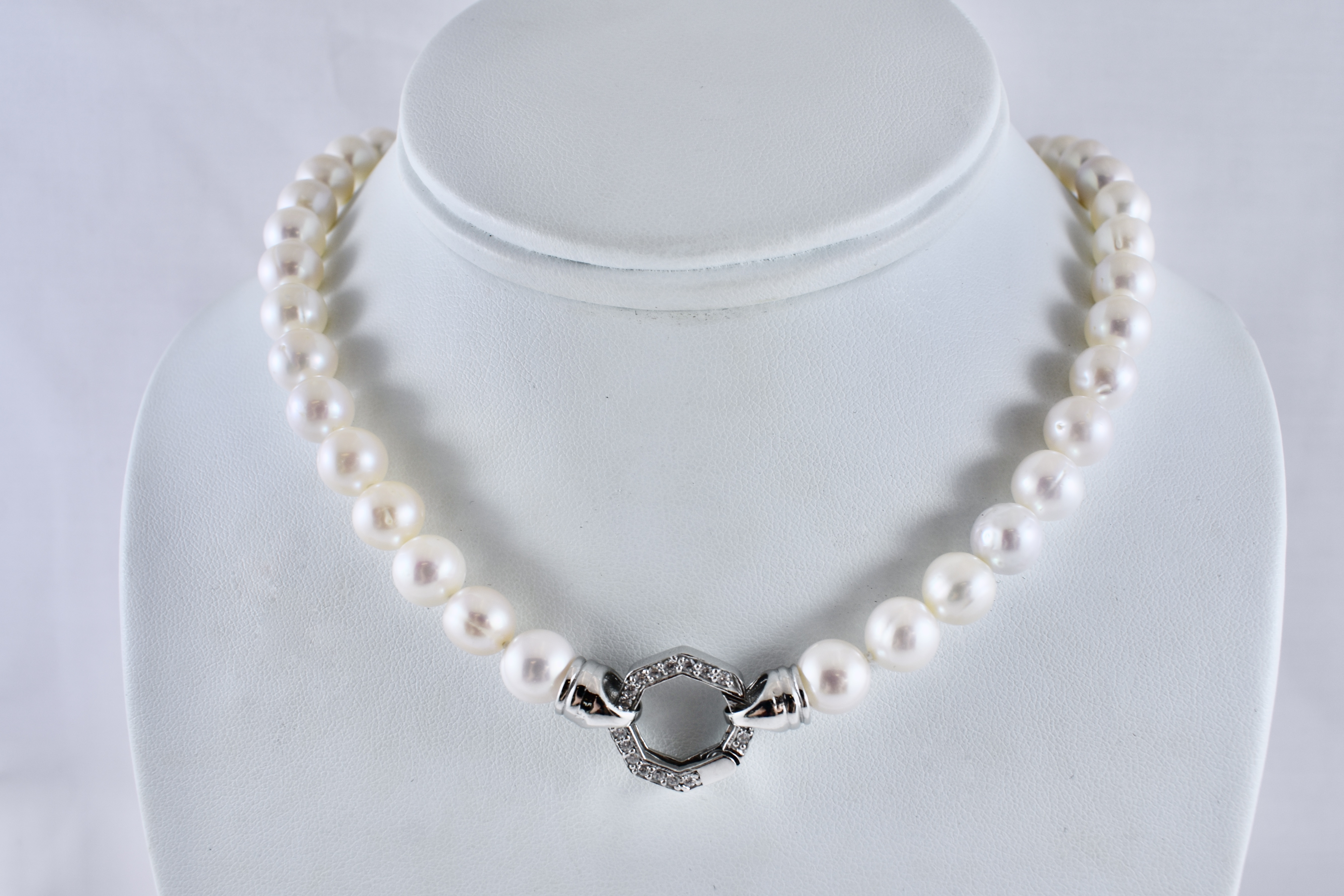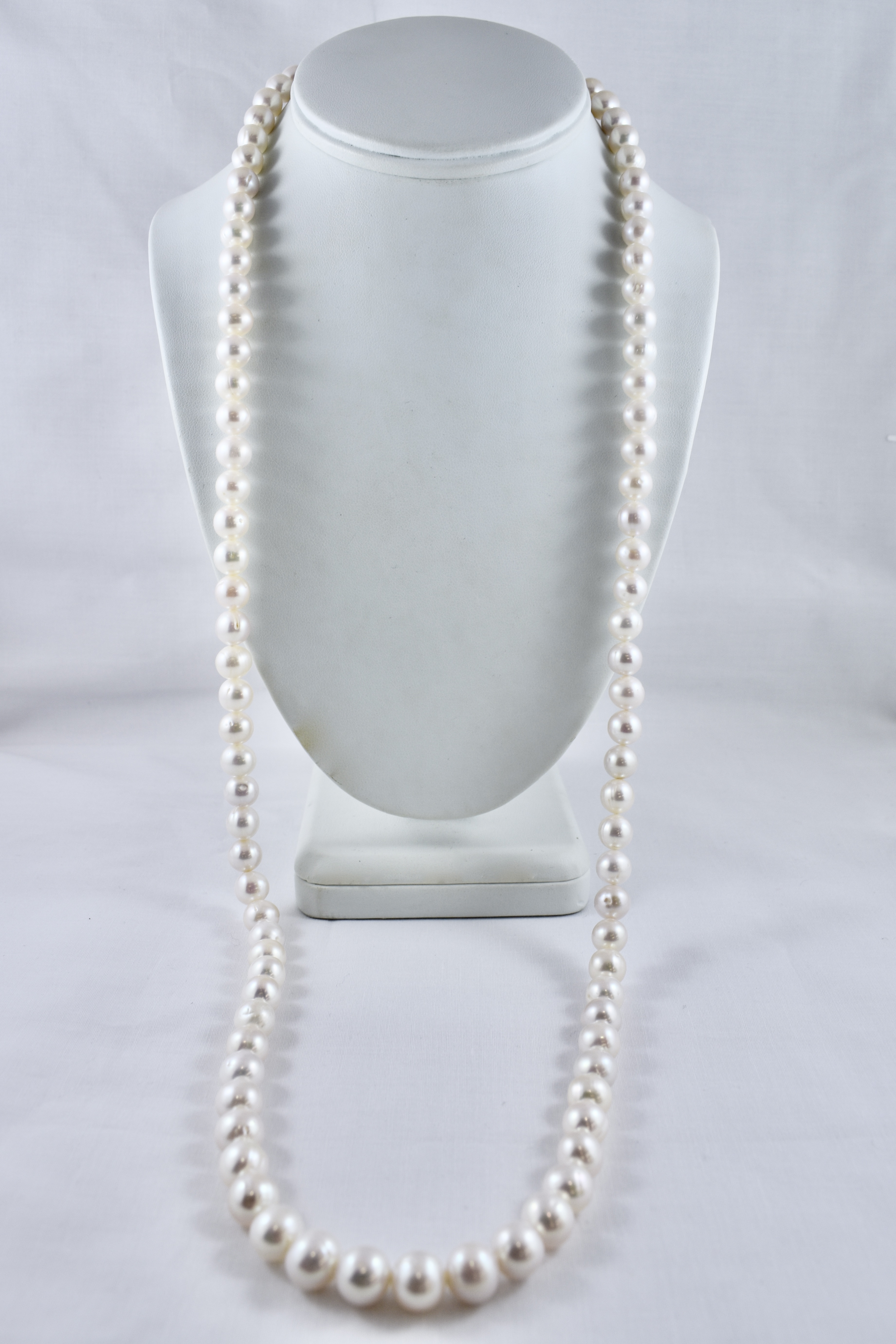 This pretty pearl strand is made up of white graduating 8.5-9.8mm freshwater round pearls of good lustre, with a sterling silver cubic zirconia hexagon clasp. Strand is 86cm long