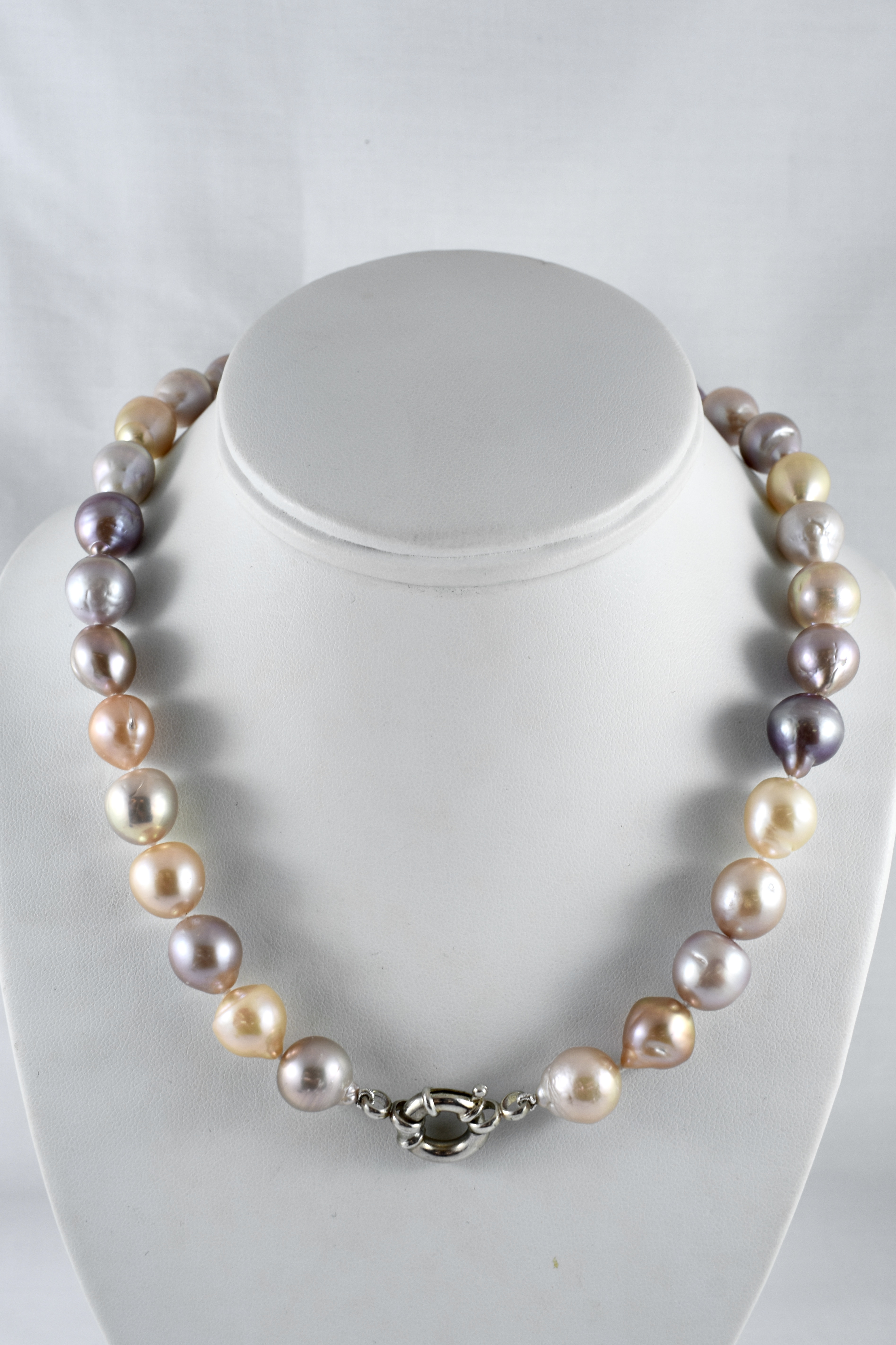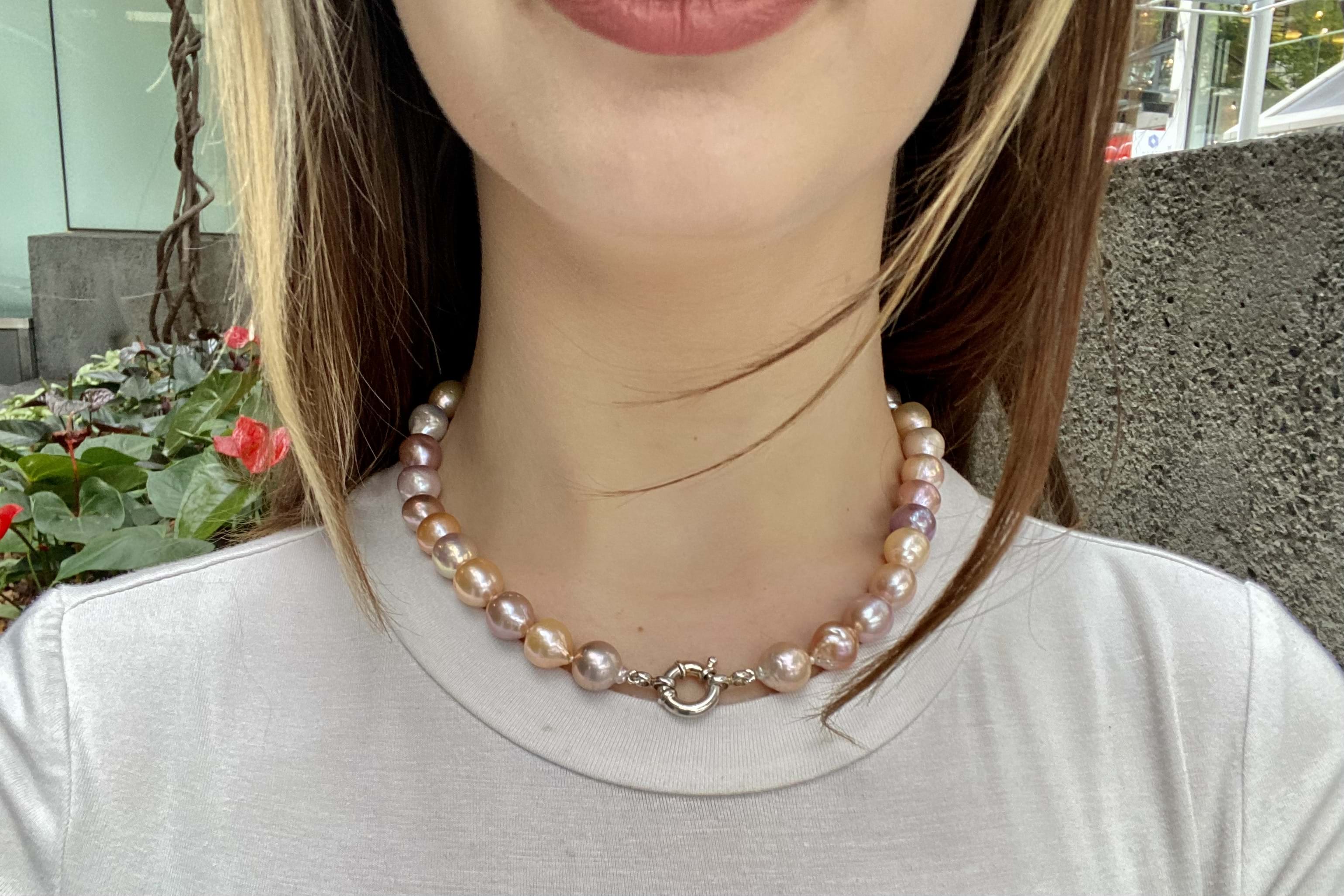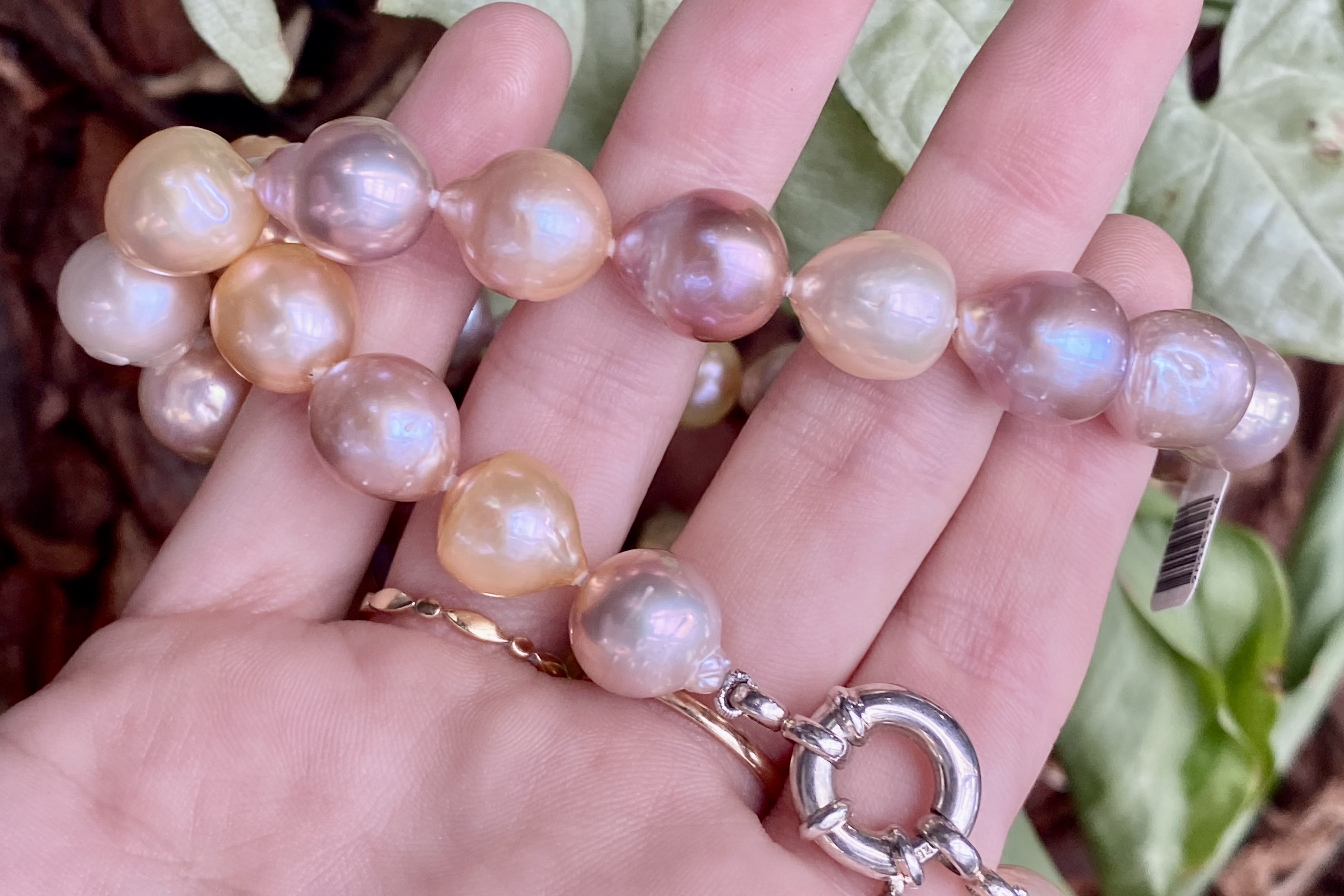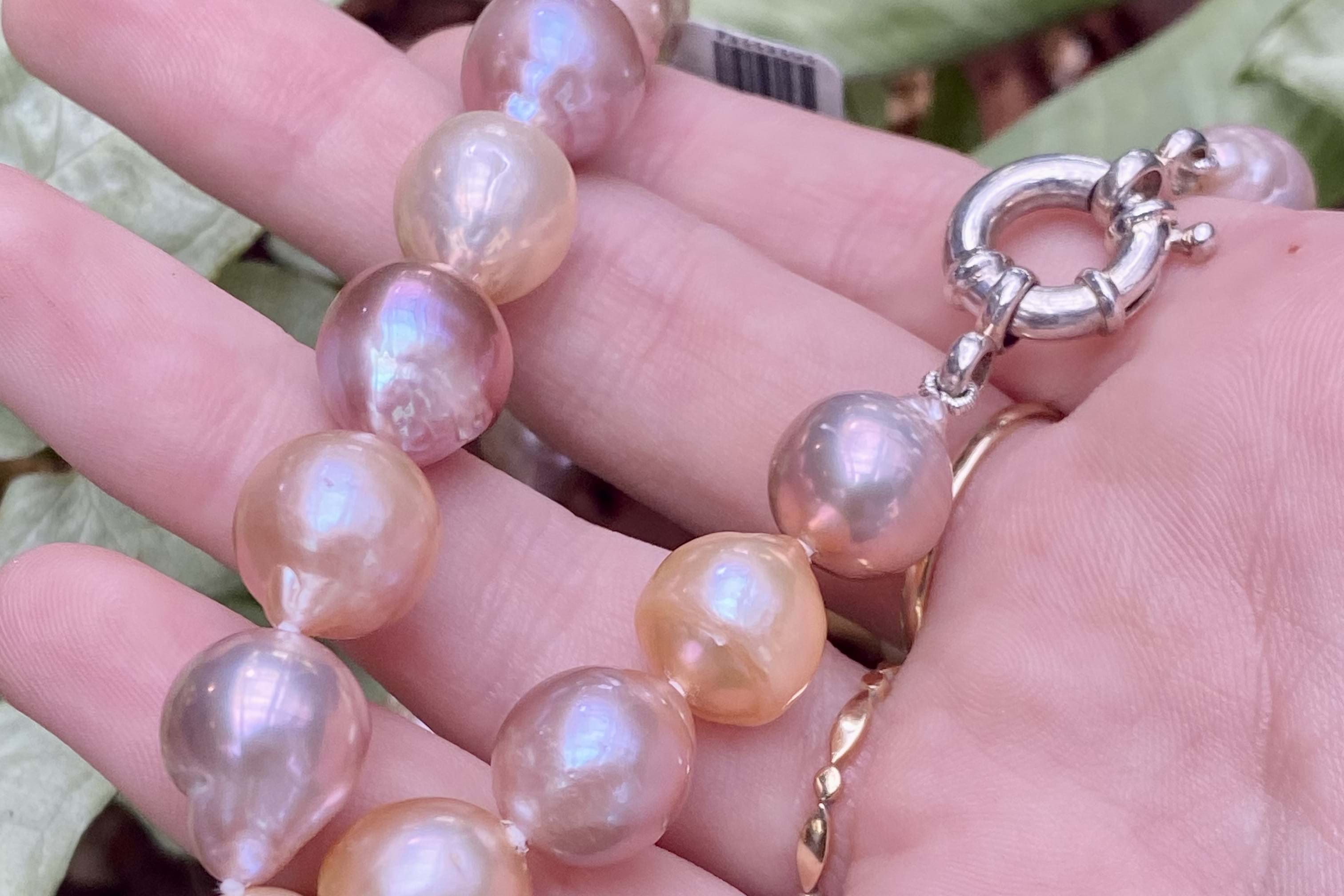 The prettiest pink and peach freshwater pearl strand. Featuring 11-12mm semi round pink pearls, varing in tones of pearly pinks to peach. This lovely strand measures 45.5cm long and is finished with a bolt ring clasp.