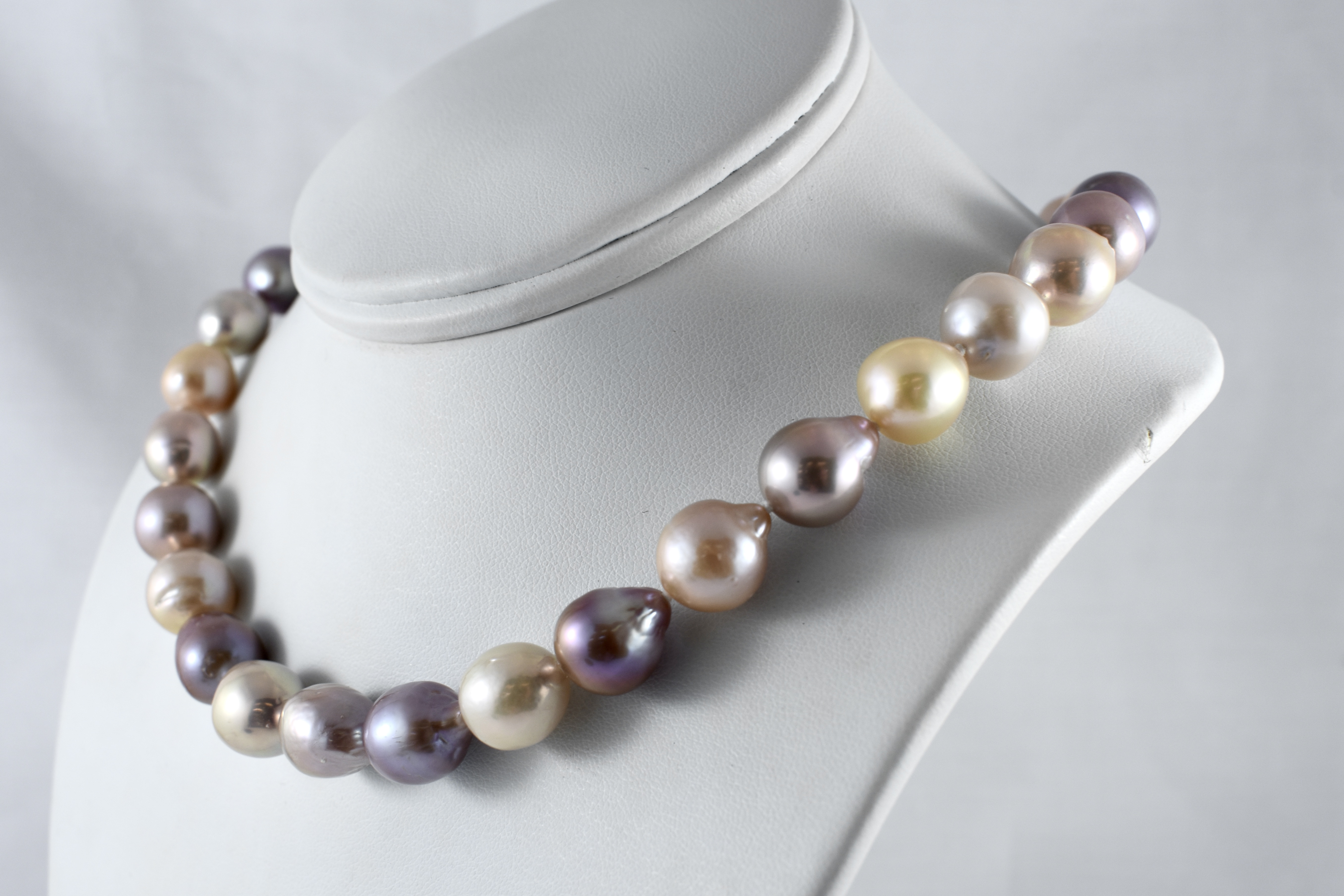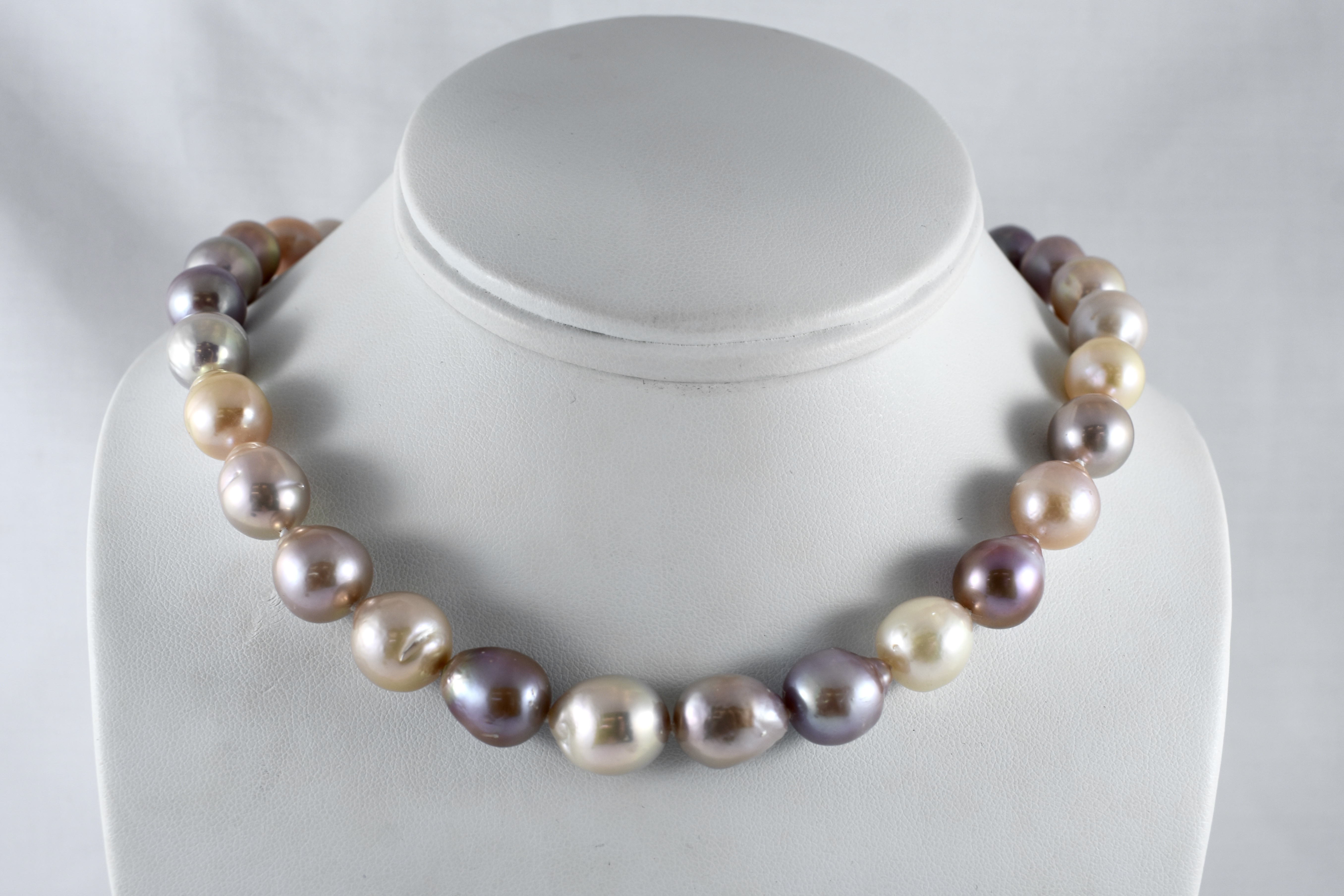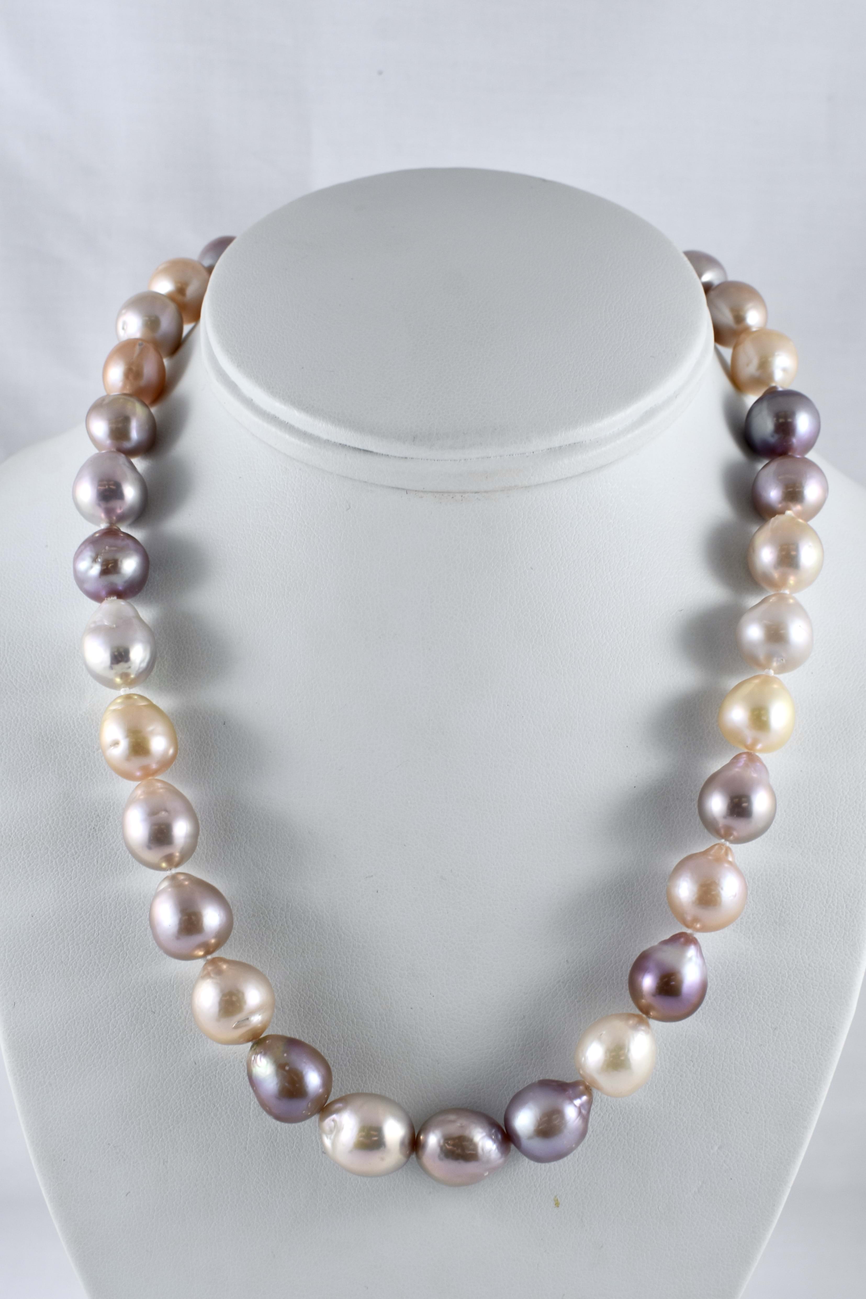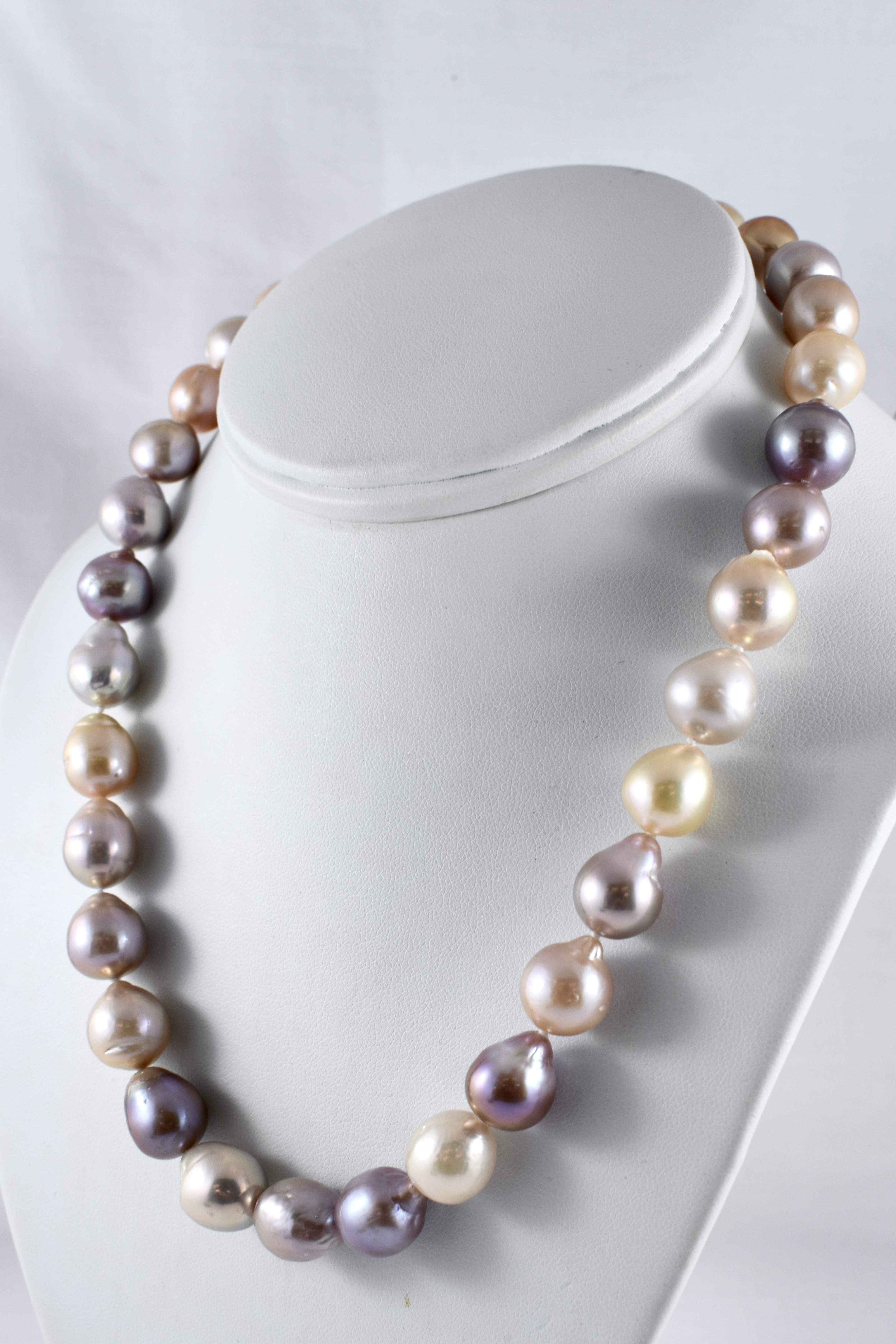 The prettiest pink and peach freshwater pearl strand. Featuring 11-12mm semi round pink pearls, varing in tones of pearly pinks to peach. This lovely strand measures 45.5cm long and is finished with a bolt ring clasp.