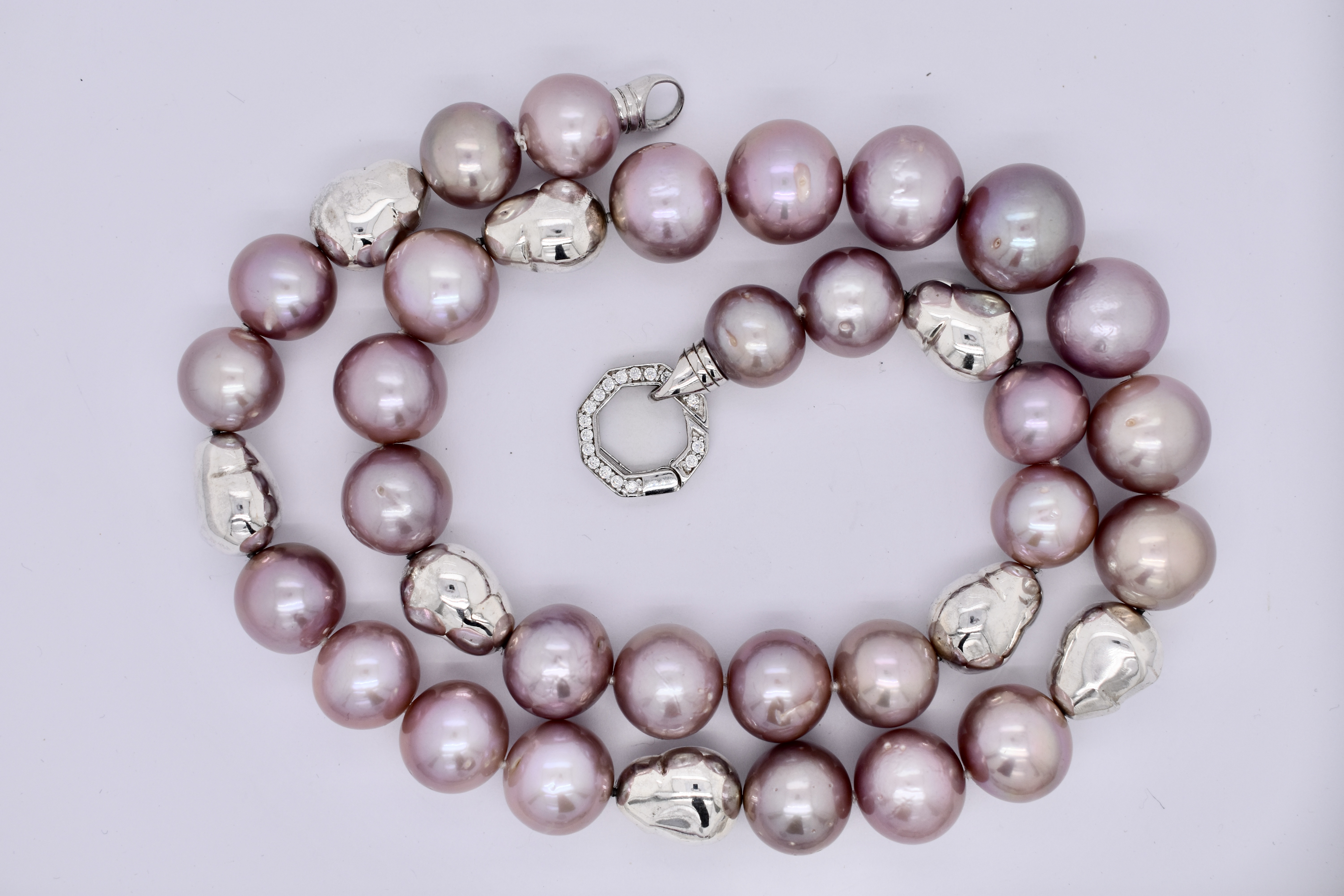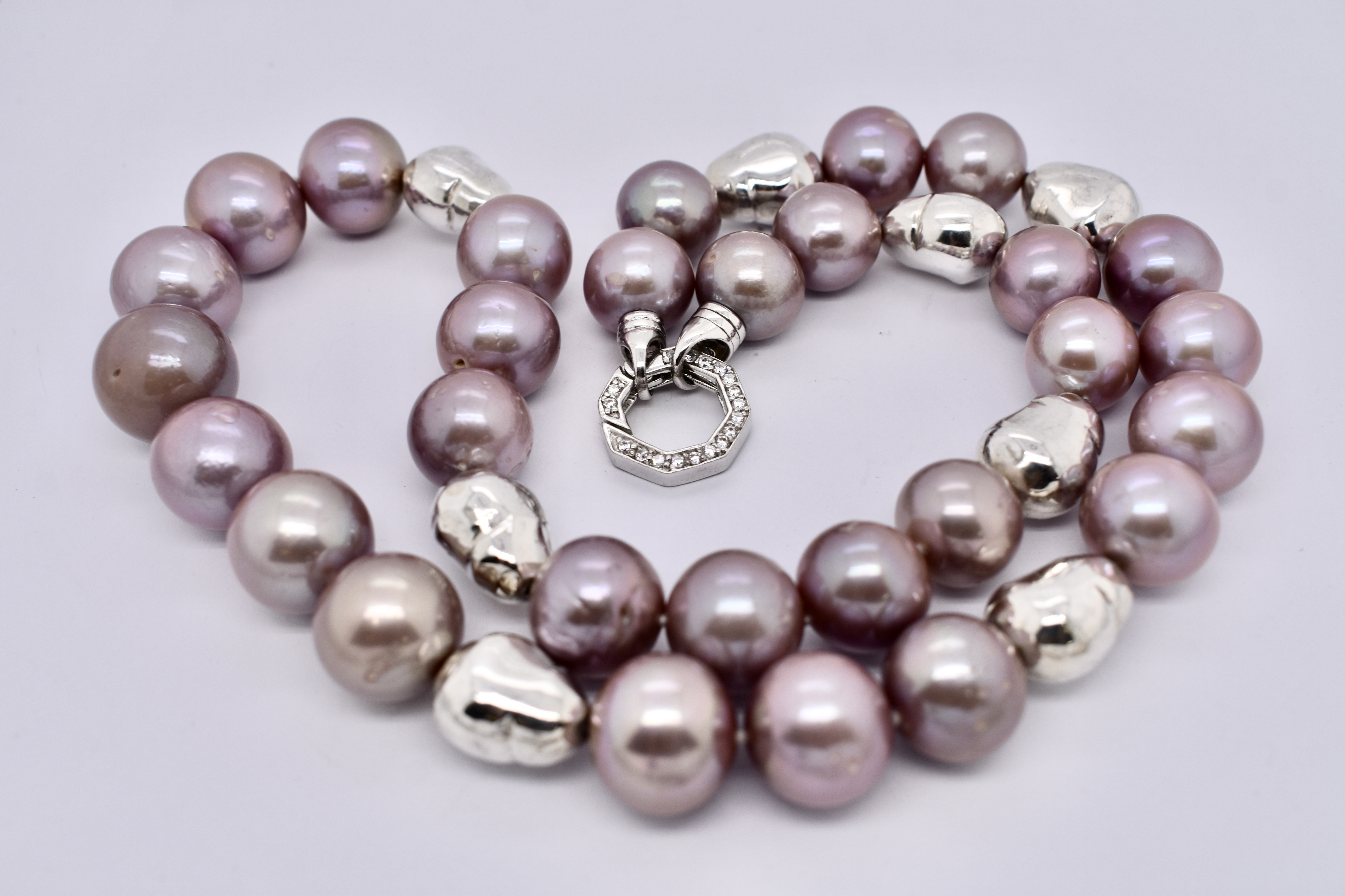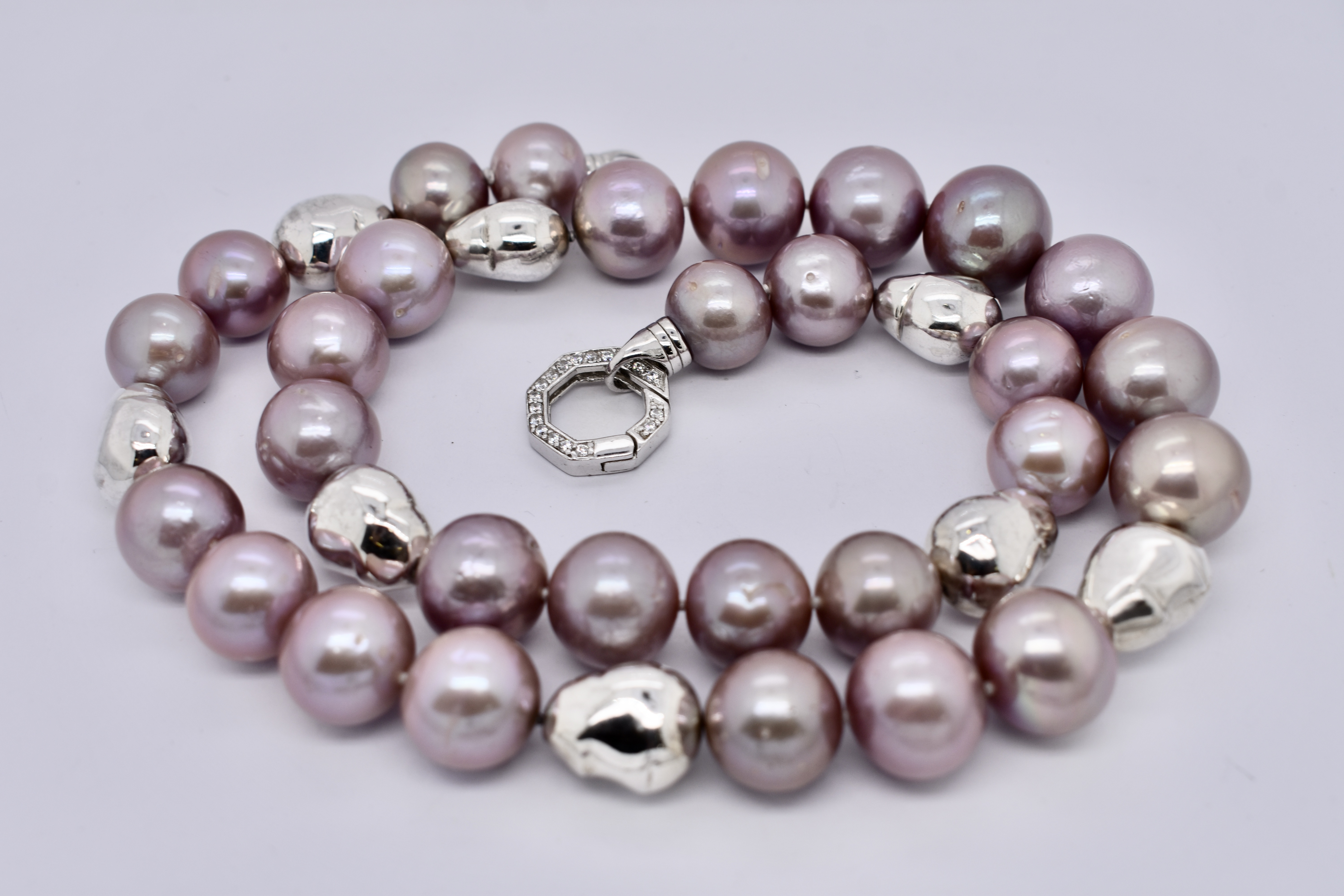 The sweetest purple freshwater pearl strand. Featuring 12-15mm semi round pearls. This lovely strand measures 54cm long and has stationed sterling silver baroque shaped beads. Finished with a cubic zirconia hexagon shaped bolt ring clasp.