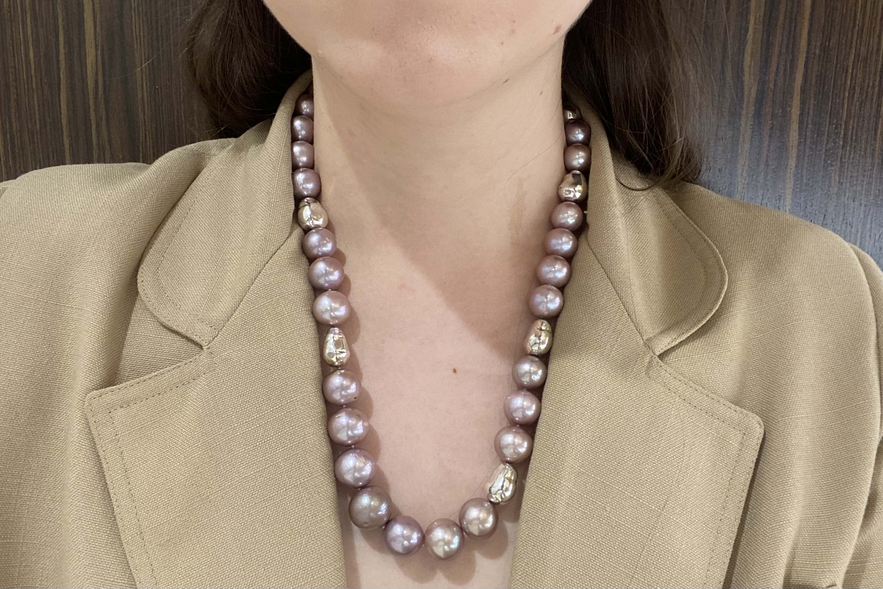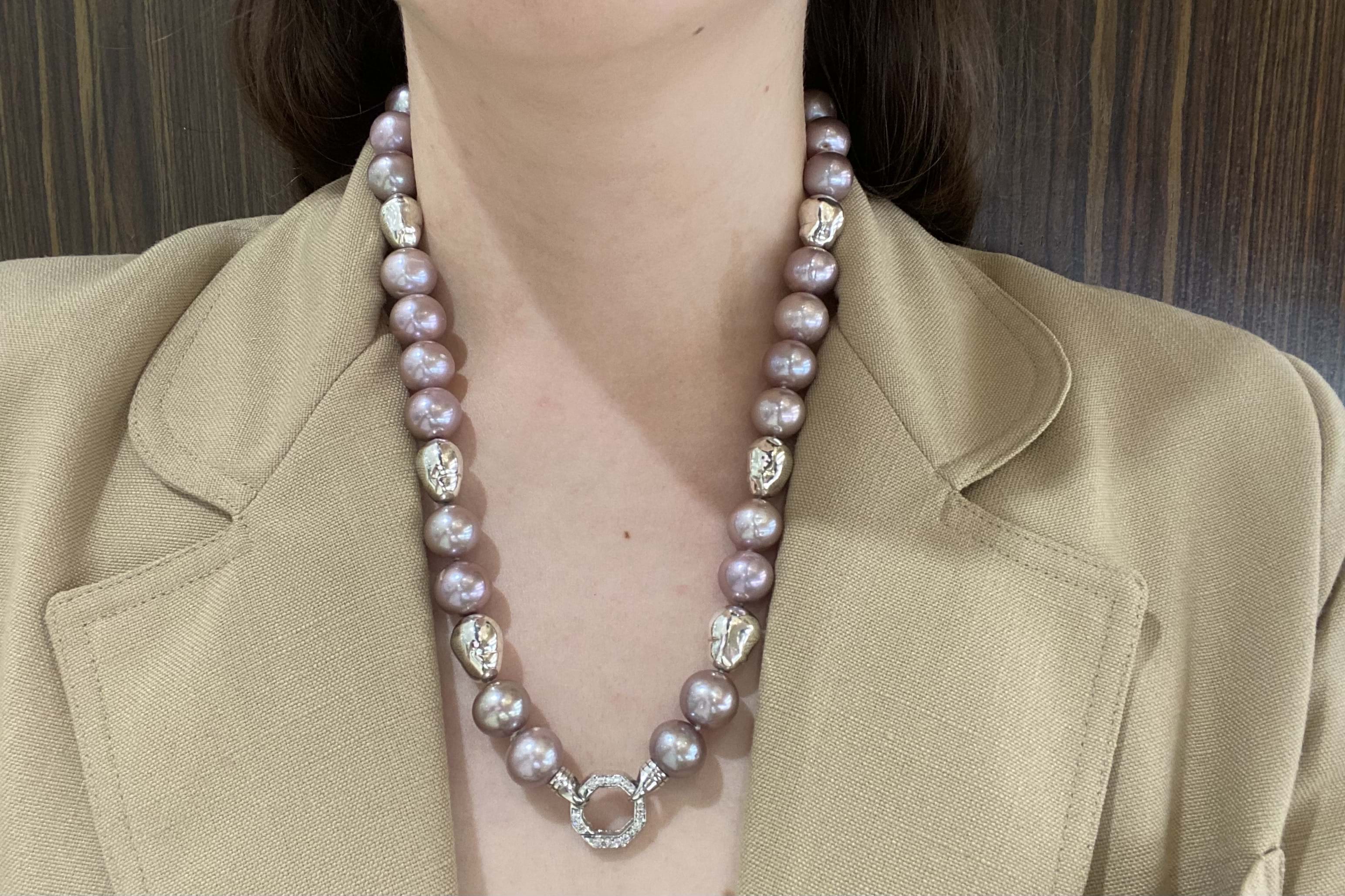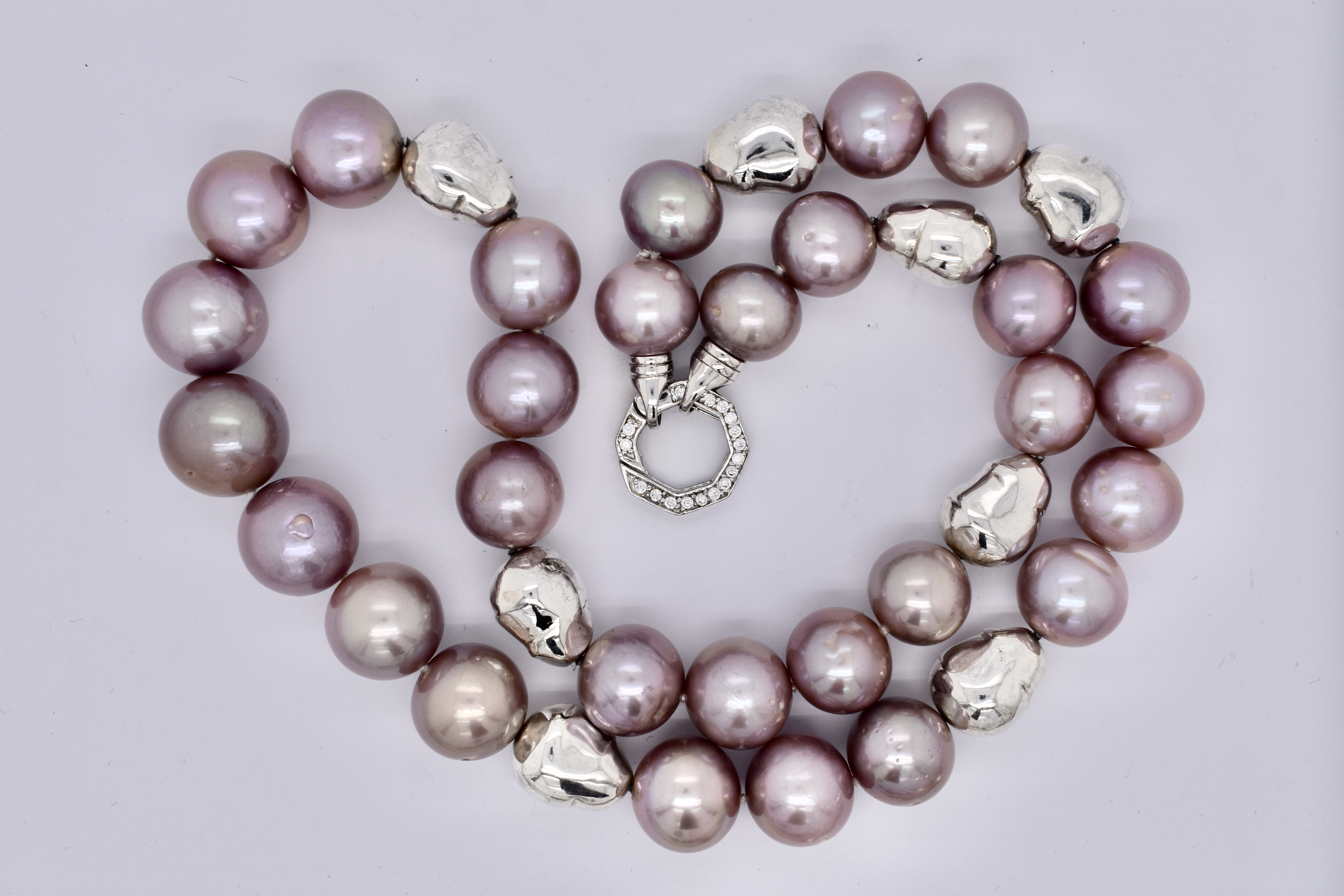 The sweetest purple freshwater pearl strand. Featuring 12-15mm semi round pearls. This lovely strand measures 54cm long and has stationed sterling silver baroque shaped beads. Finished with a cubic zirconia hexagon shaped bolt ring clasp.