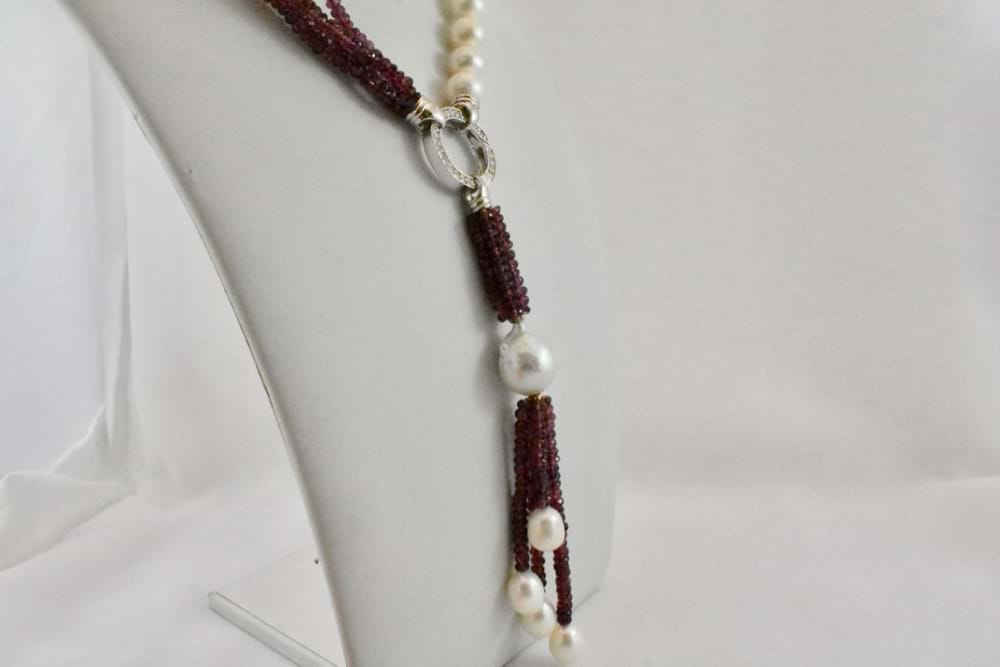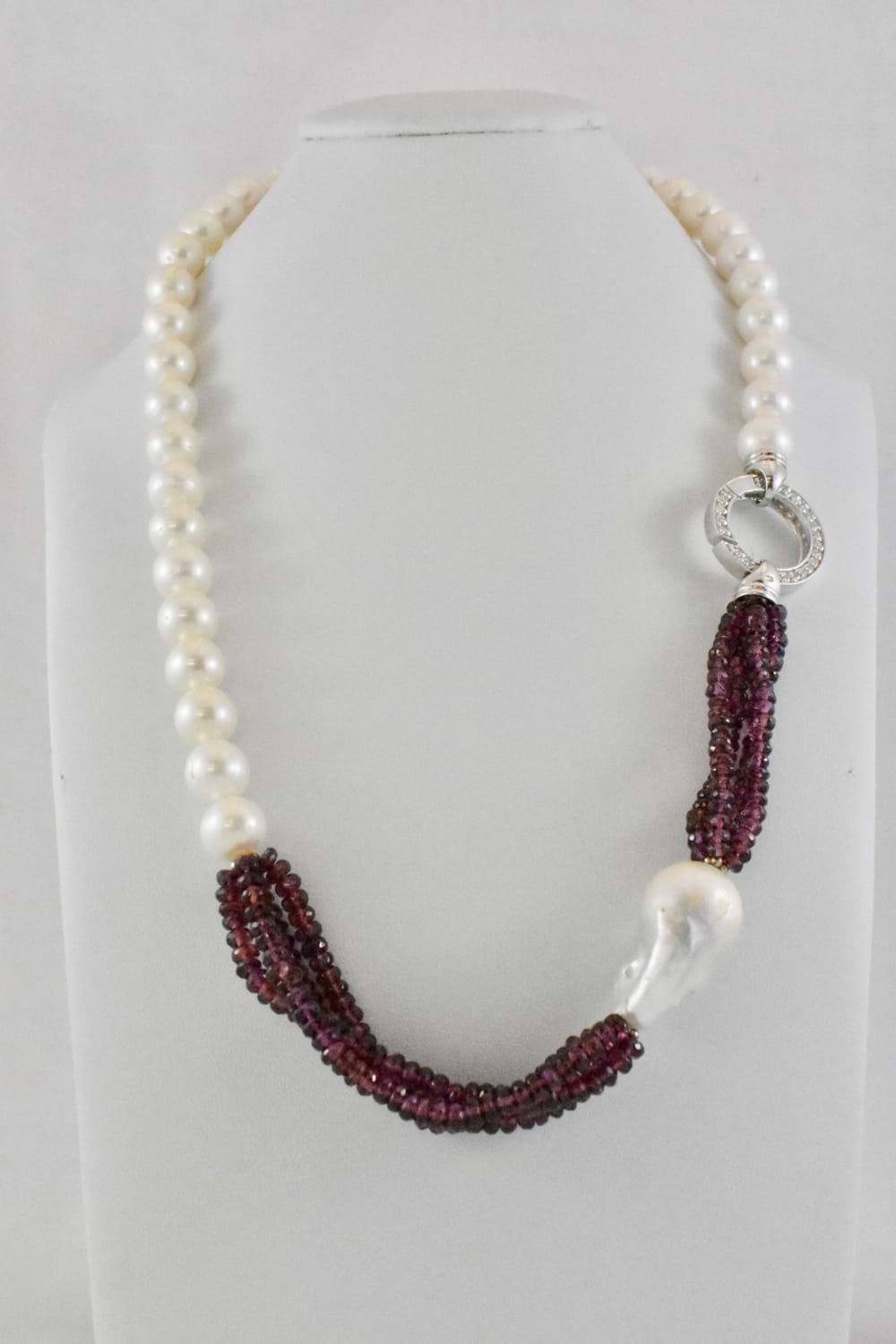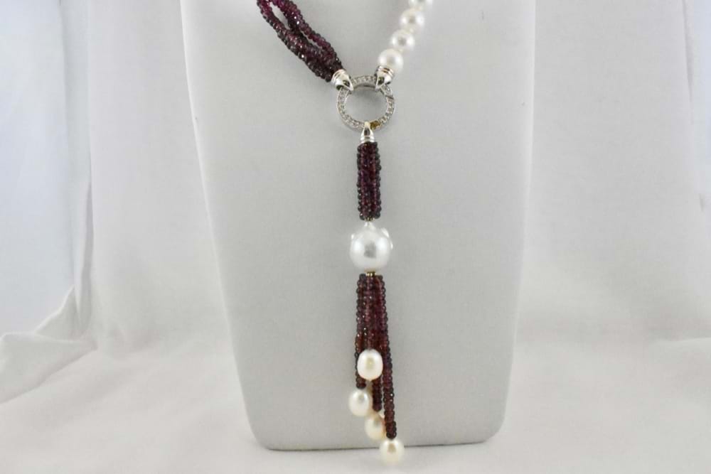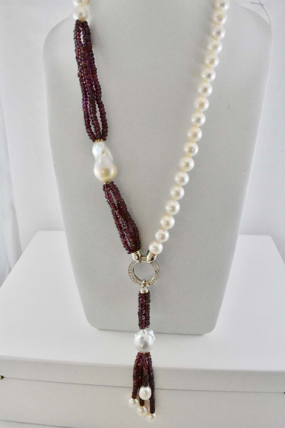 Absolute stunning! This versitile necklace is made up of a half strand of creamy white fresh water pearls and a half multi strand of faceted rhodolite garnet beads, each meeting at a circular sterling silver cubic zirconia set clasp. With a striking removable tassle suspended from the clasp of garnet beads with baroque pearl ends this necklace is sure to catch everyones attention.