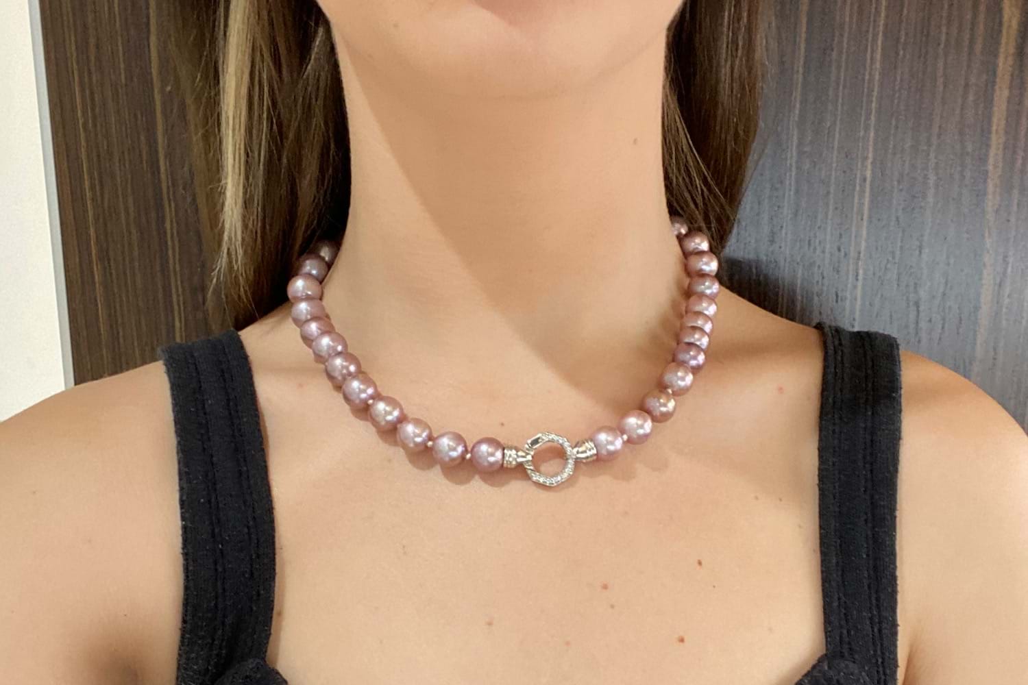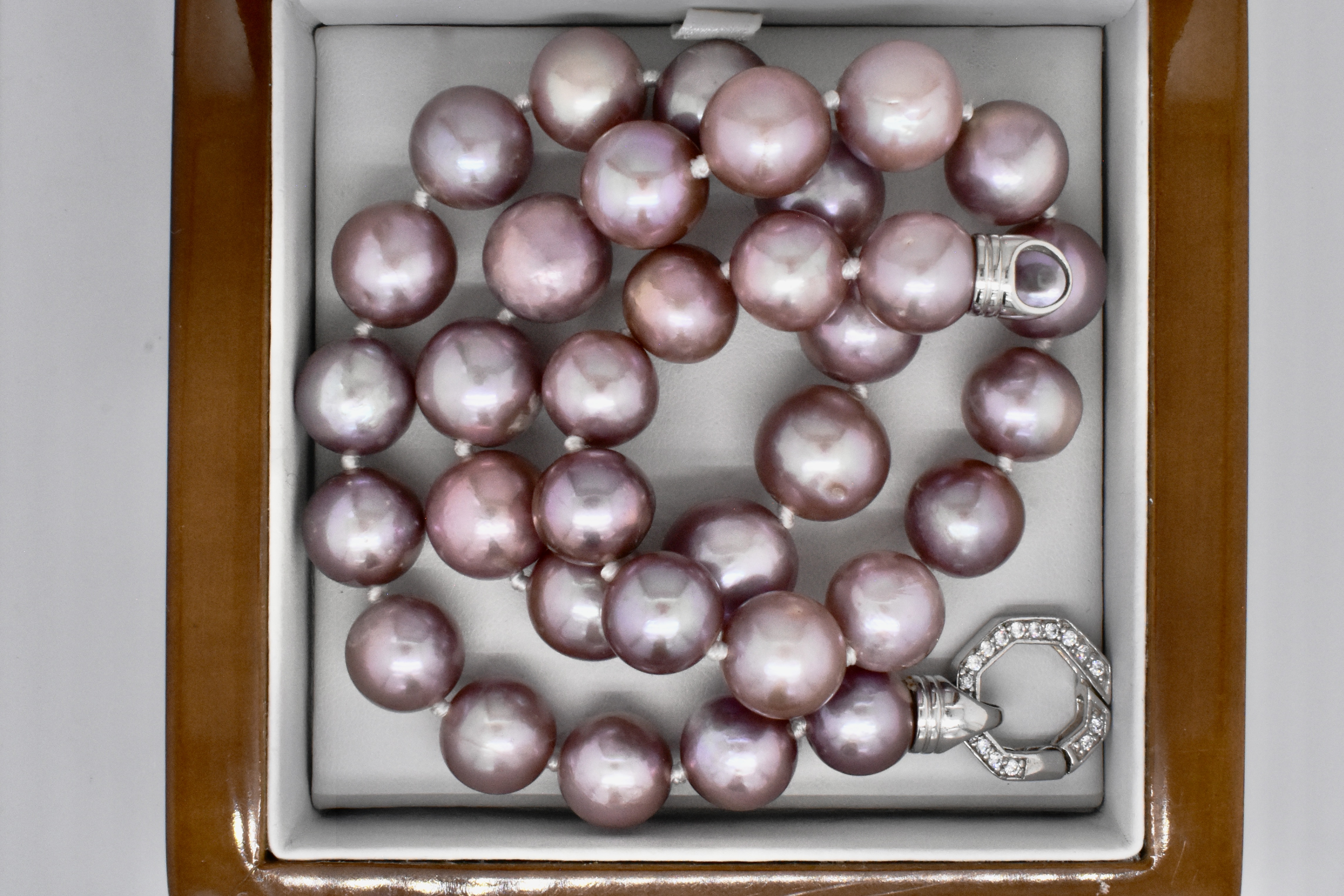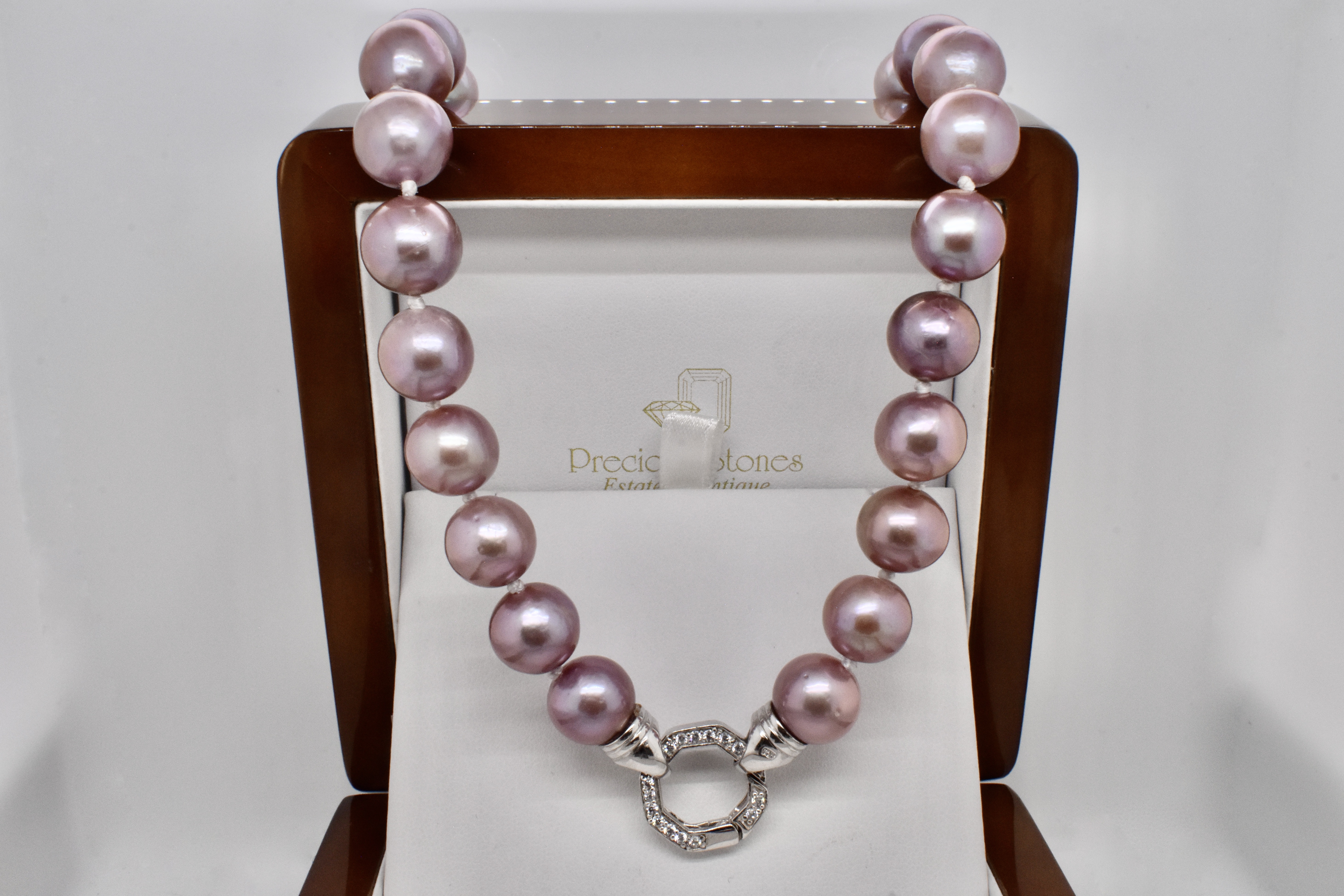 A gorgeous strand of 12-13mm round, pink freshwater pearls with sterling silver end caps and hexagonal clasp set with cubic zirconia, perfect for attaching any pendant or enhancer to. Strand measures 46cm long