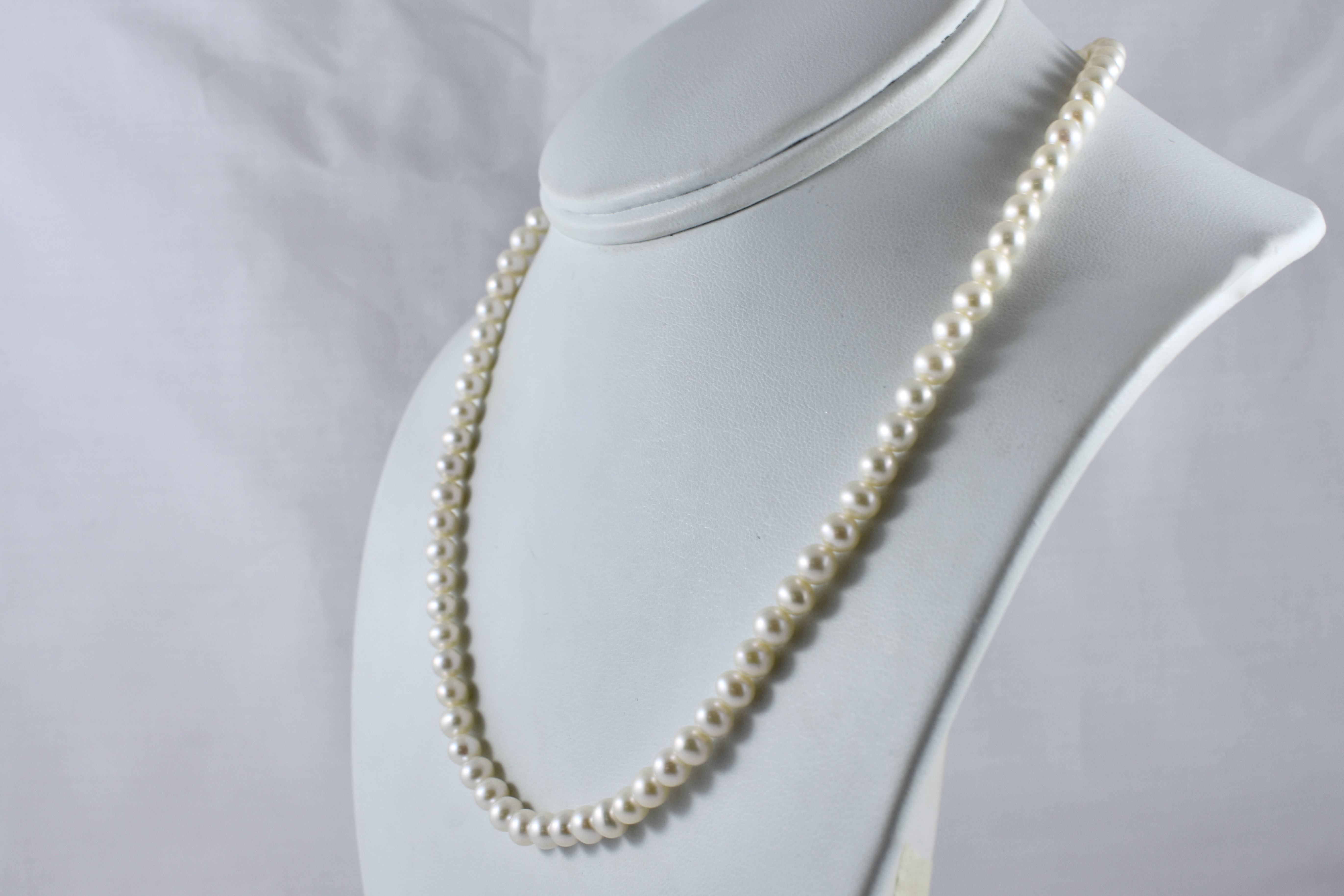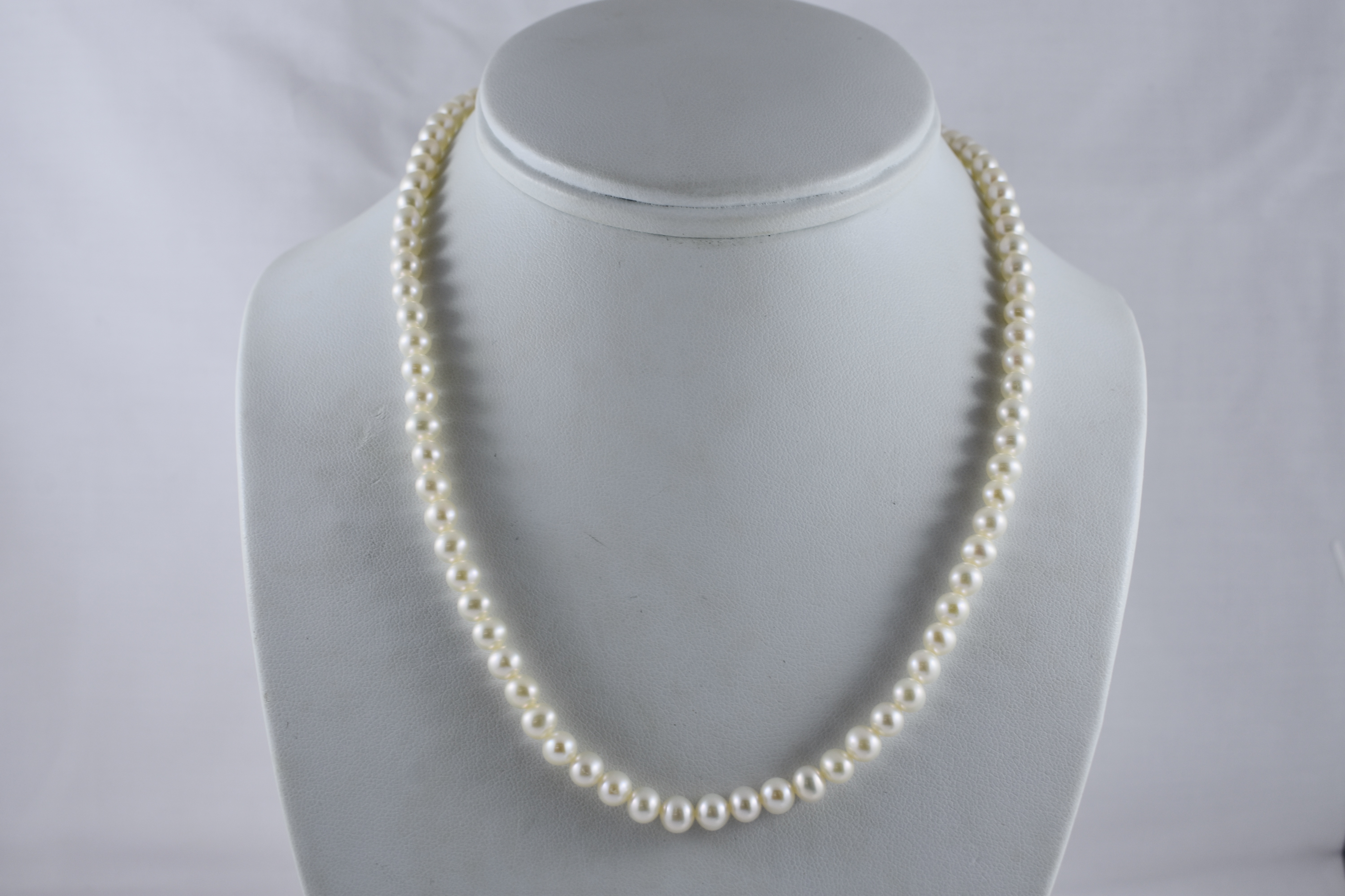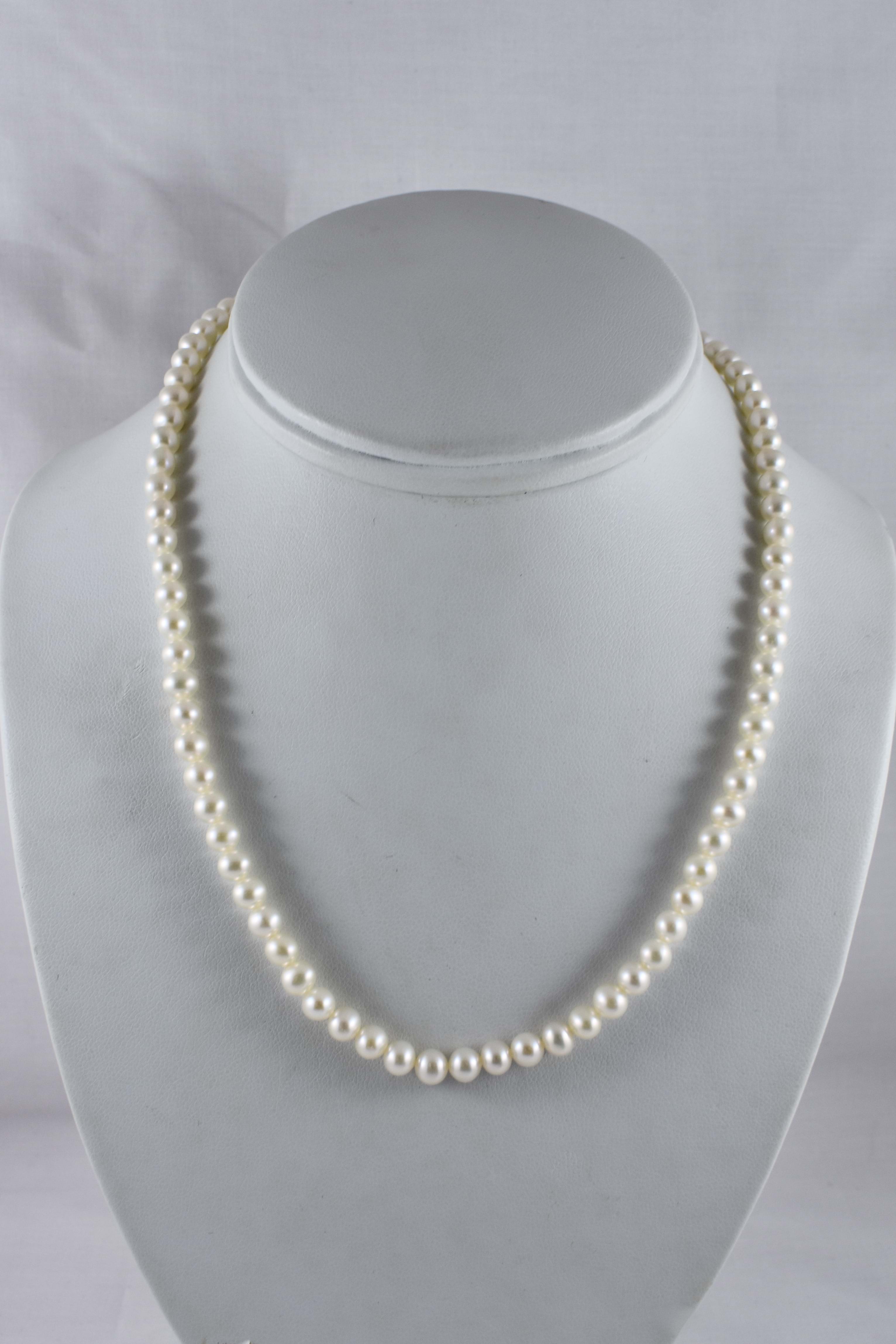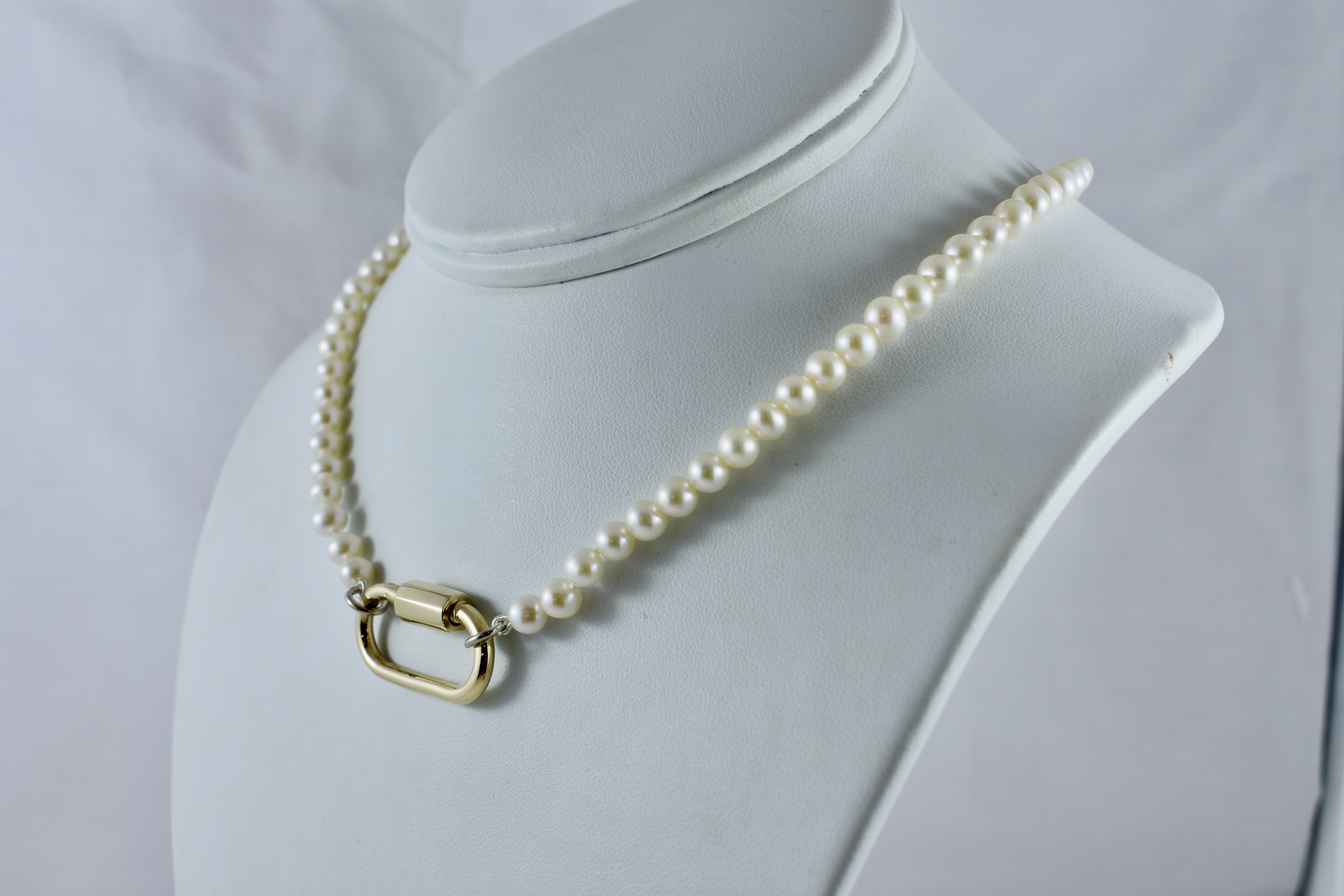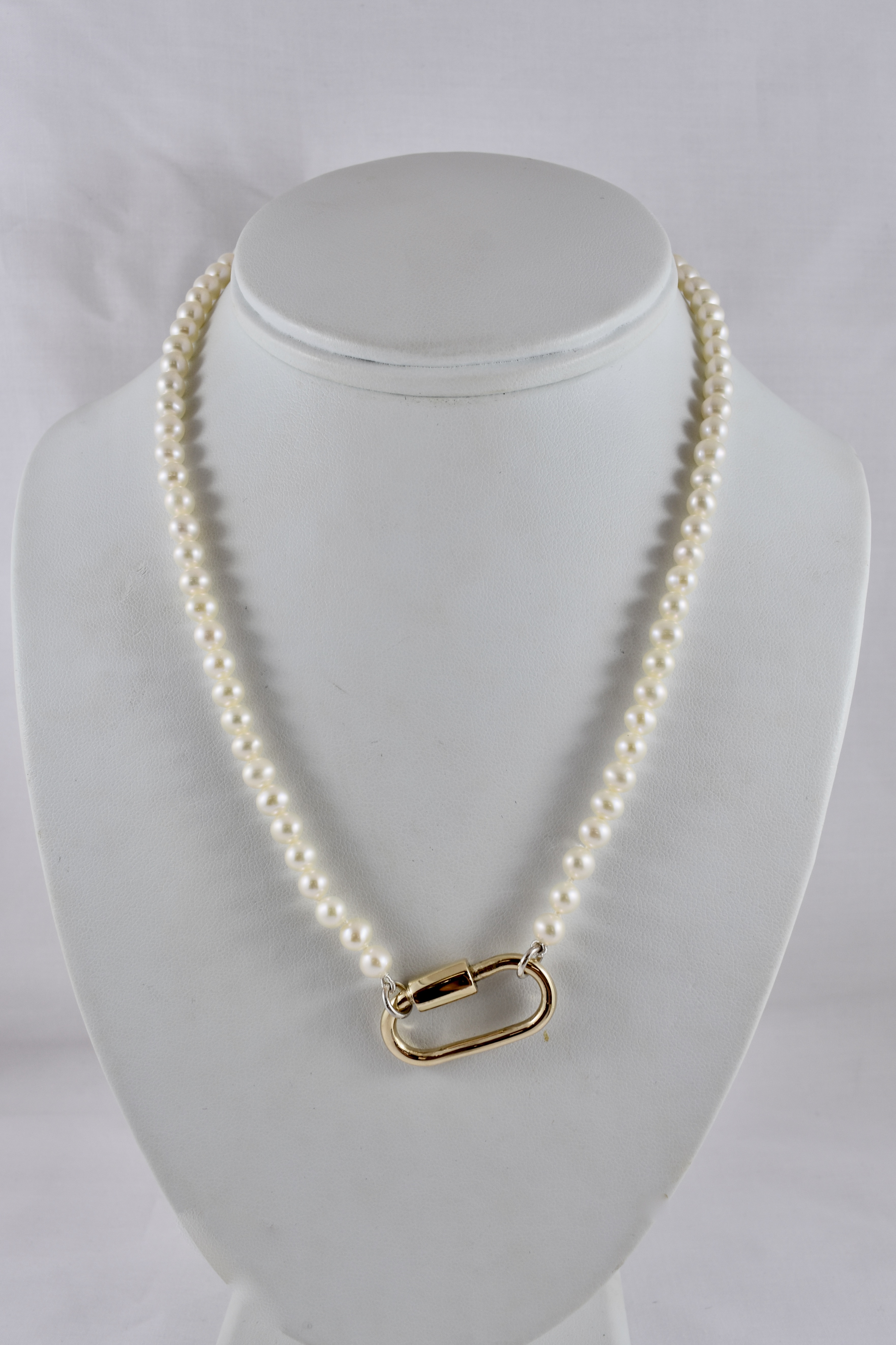 A classic and timeless strand of white Freshwater pearls with good lustre, measuring 5-5.5mm semi-round. The pearls have been hand strung on silk with two sterling silver jump ring ends. Strand length 42cm. These ends allow for a wide range of styling versatility, including various brooches, enhancers or carabiners (as pictured). Carabiner available for separate purchase (20359102).