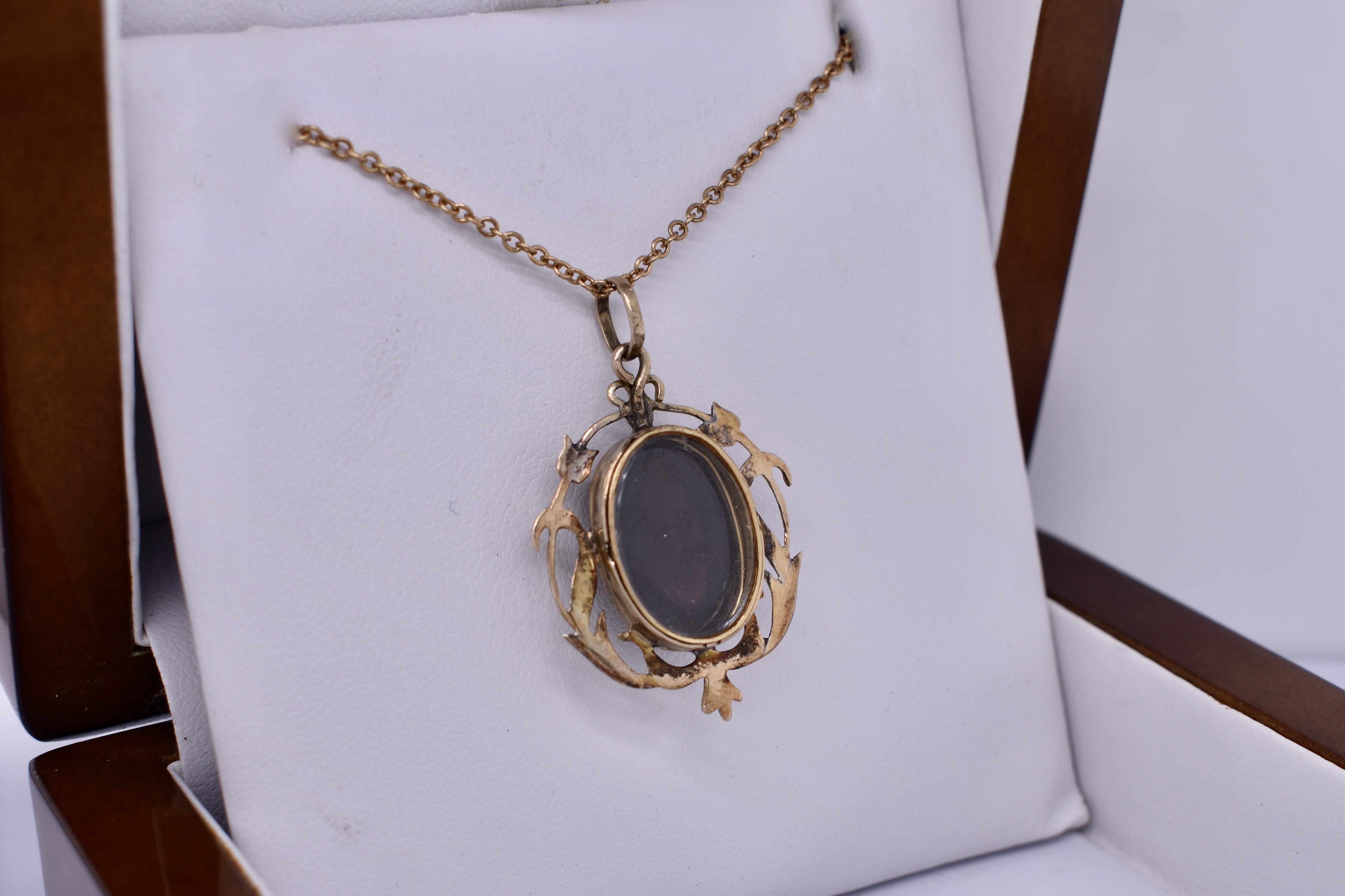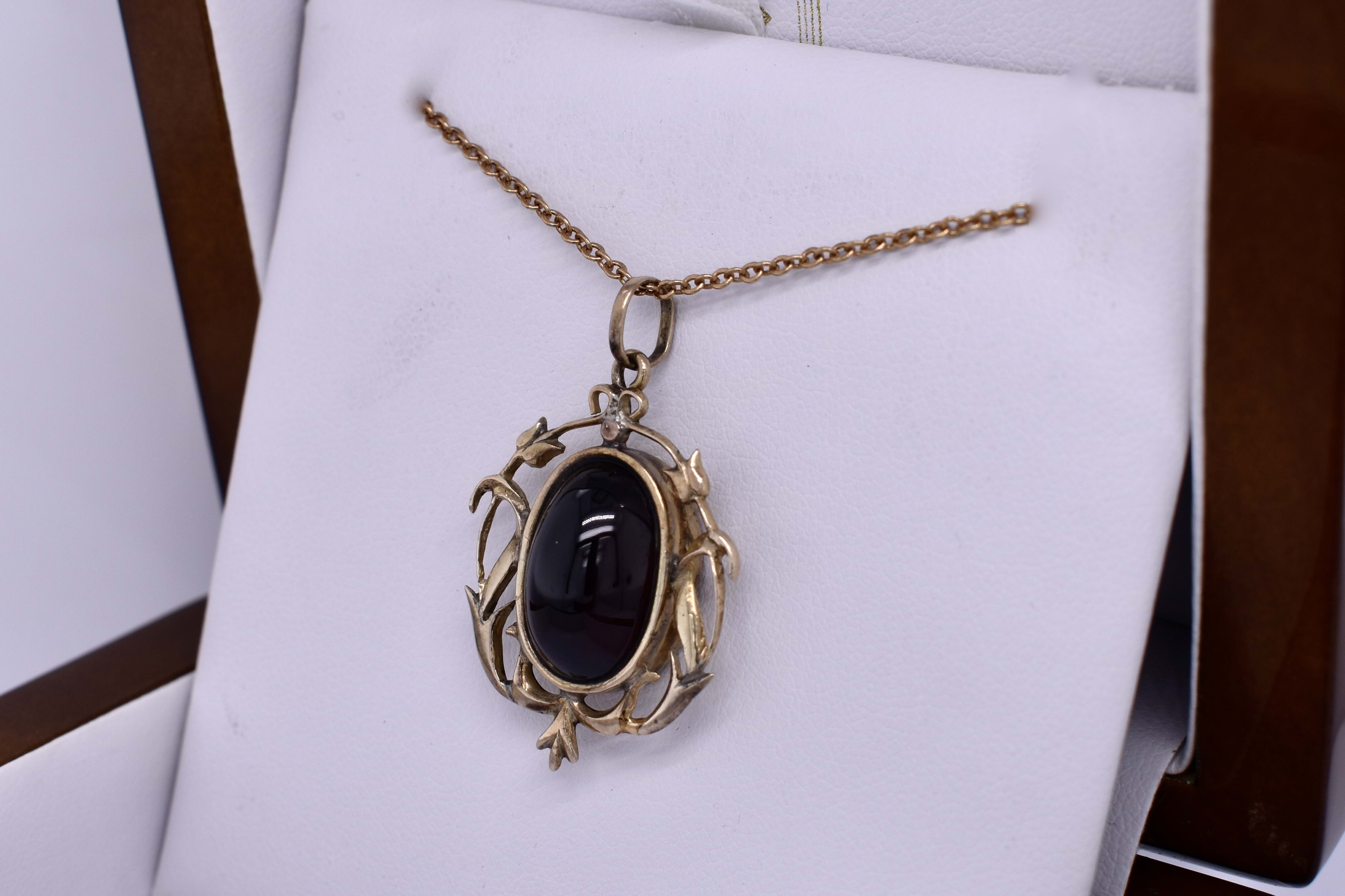 This stunning oval cabochon 16.0x10.7mm Rhodolite garnet is bezel set in 15ct yellow gold with a memory locket back. The art nouveau pendant is surrounded with floral and leaf design borders, with an oval jump ring loop to be worn as a pendant. Dated circa 1900s. Independent Valuation Supplied.