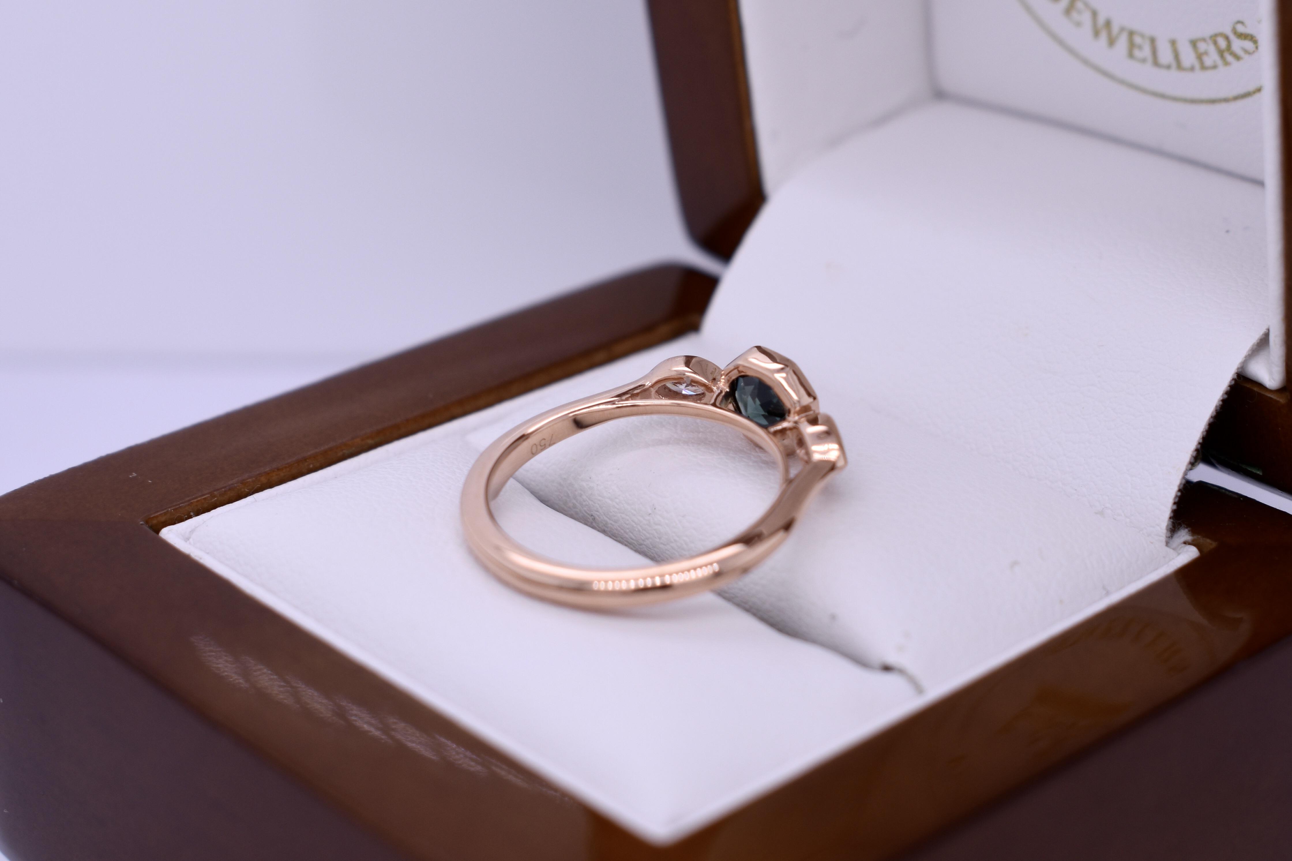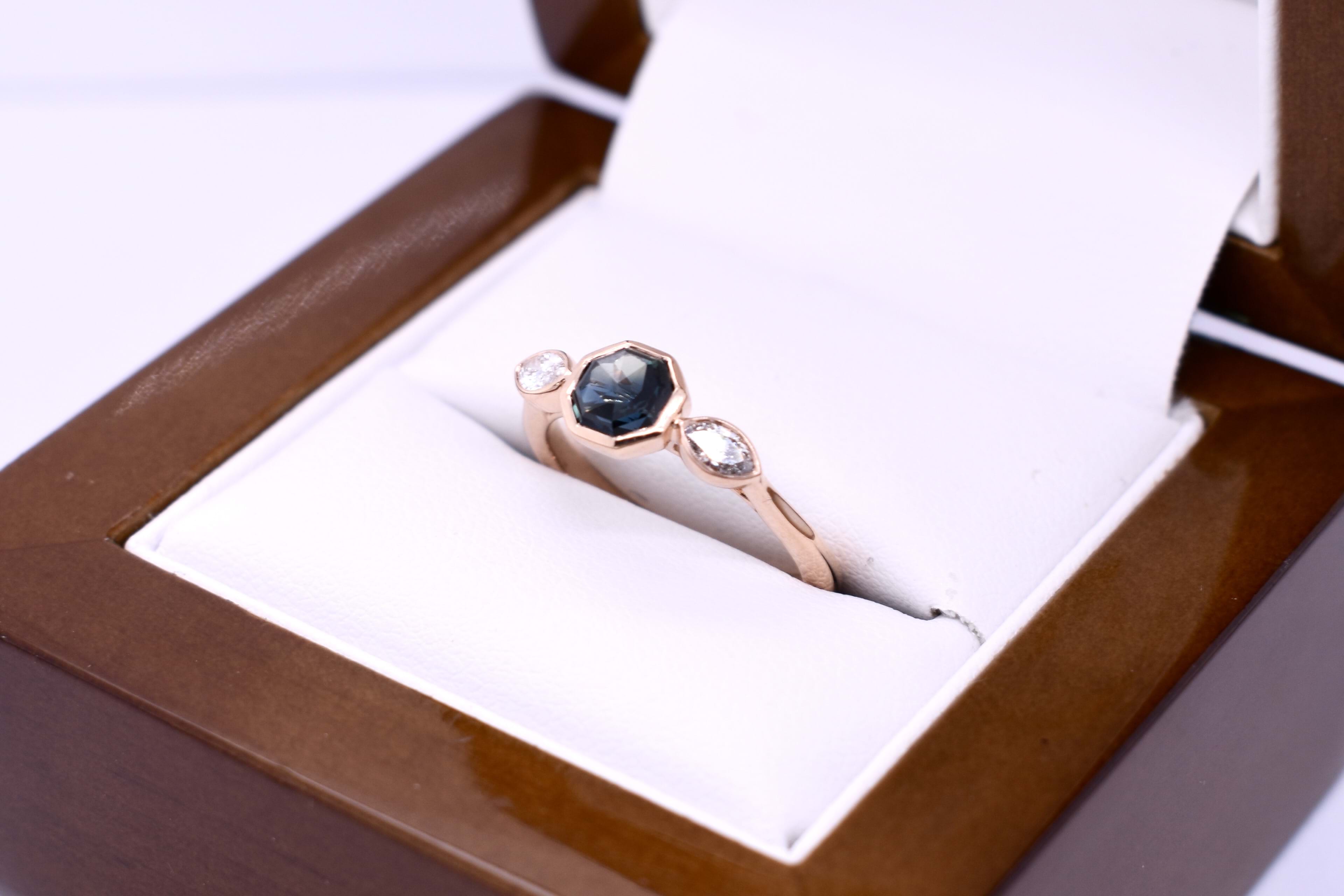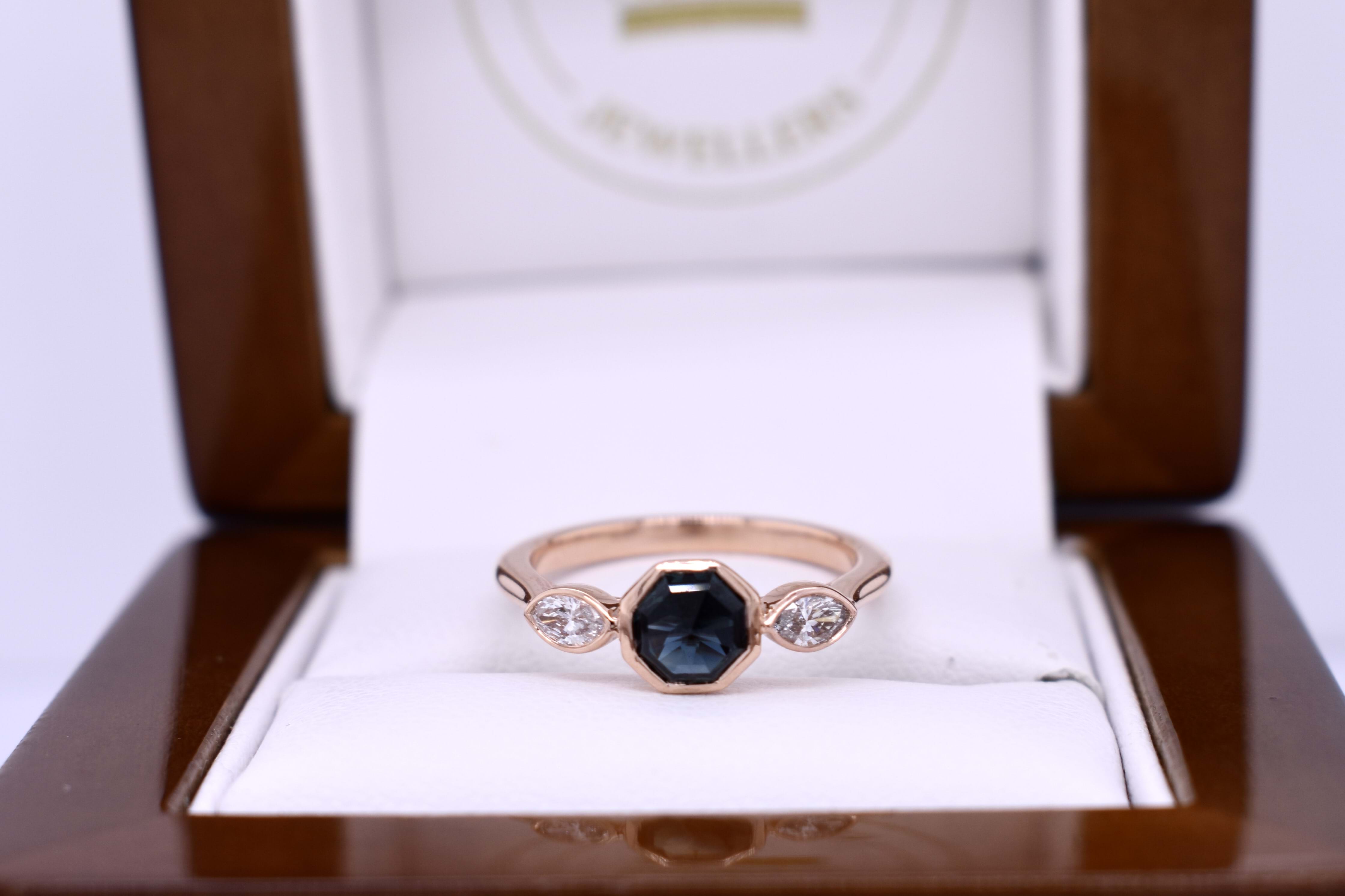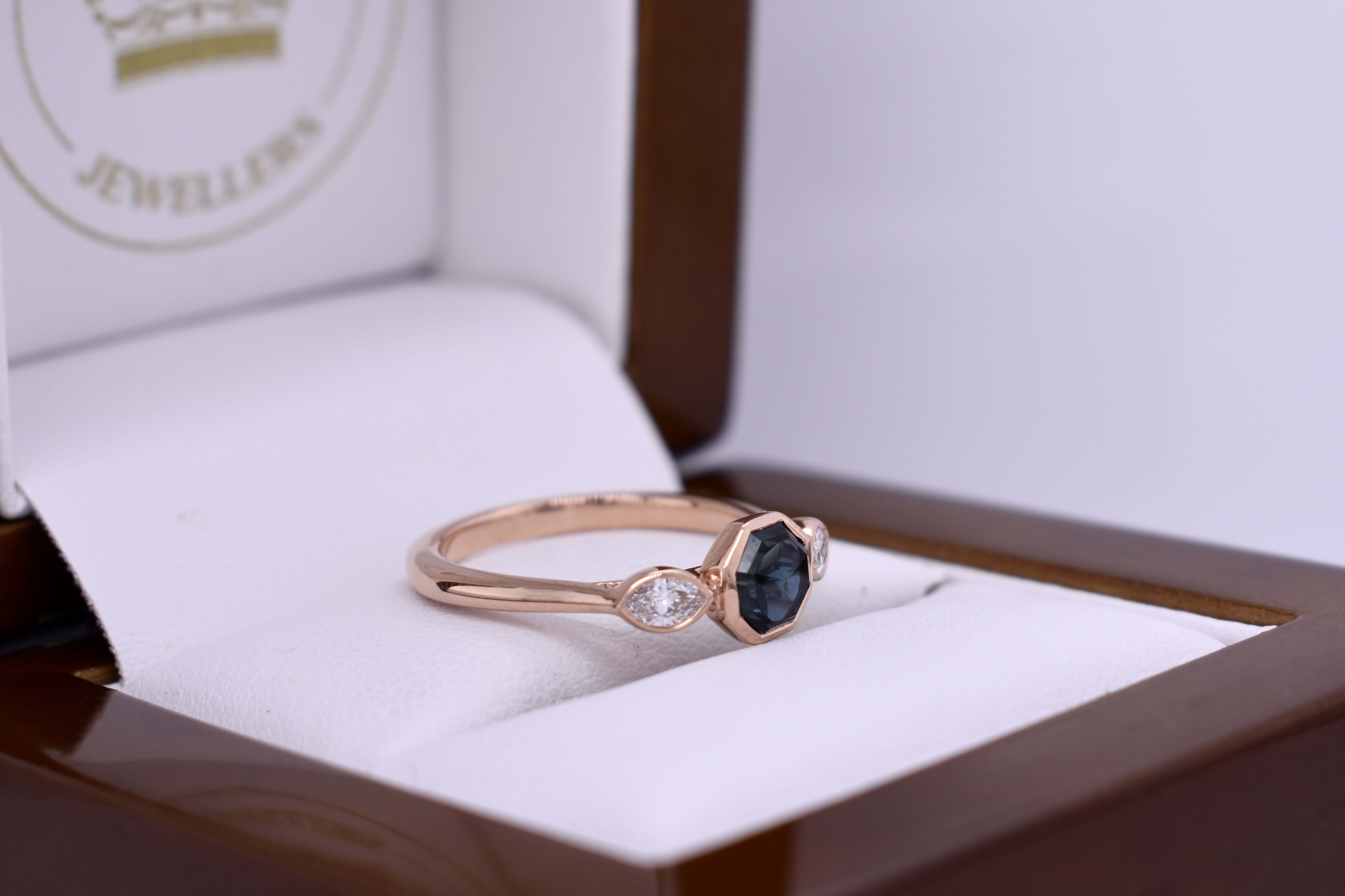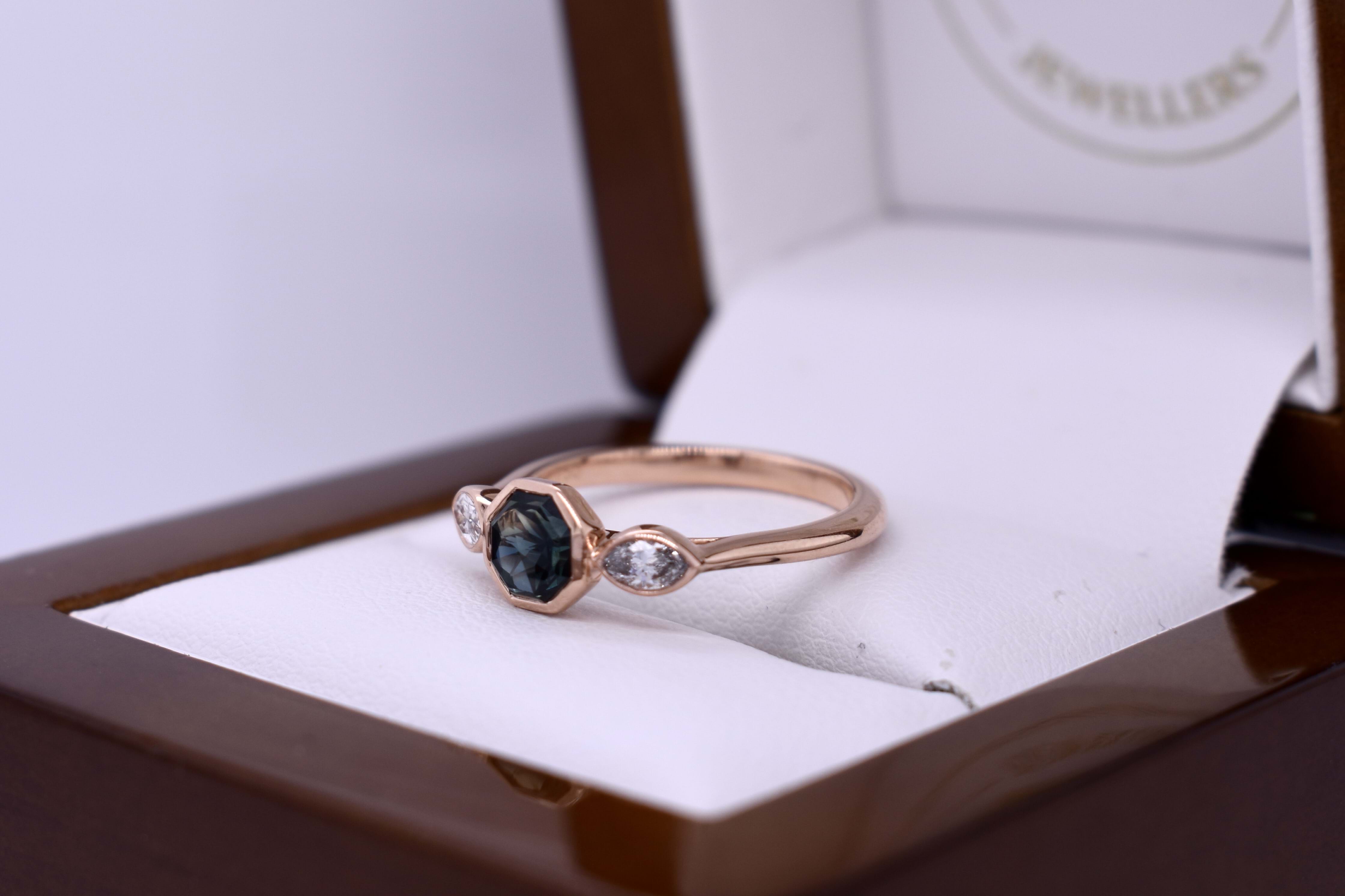 Unique and pretty, this 18ct rose gold ring features a 1.05ct hexagon shaped Australian greenish blue sapphire, measuring 5.25x5.10x3.80mm, bezel set. Further set with a shimmering marquise diamond either side, totalling 0.19ct FG VS-SI, also bezel set in rose gold. Completed on a half round 2.03mm band. Finger size J+. Independent Valuation Supplied.