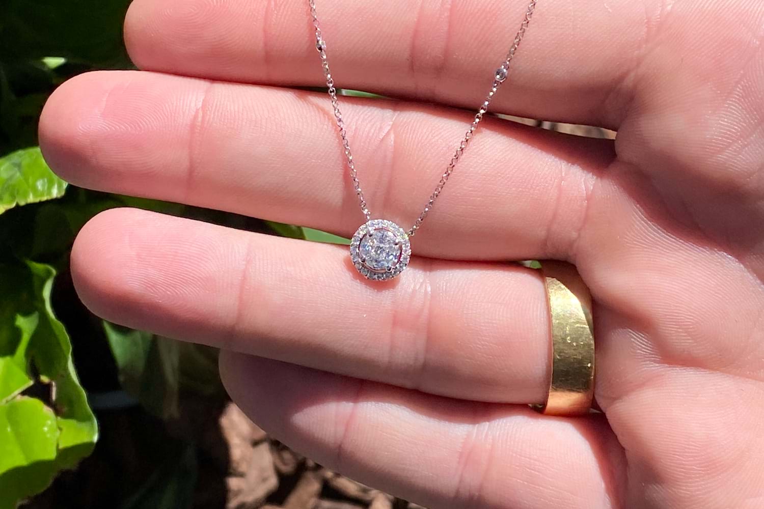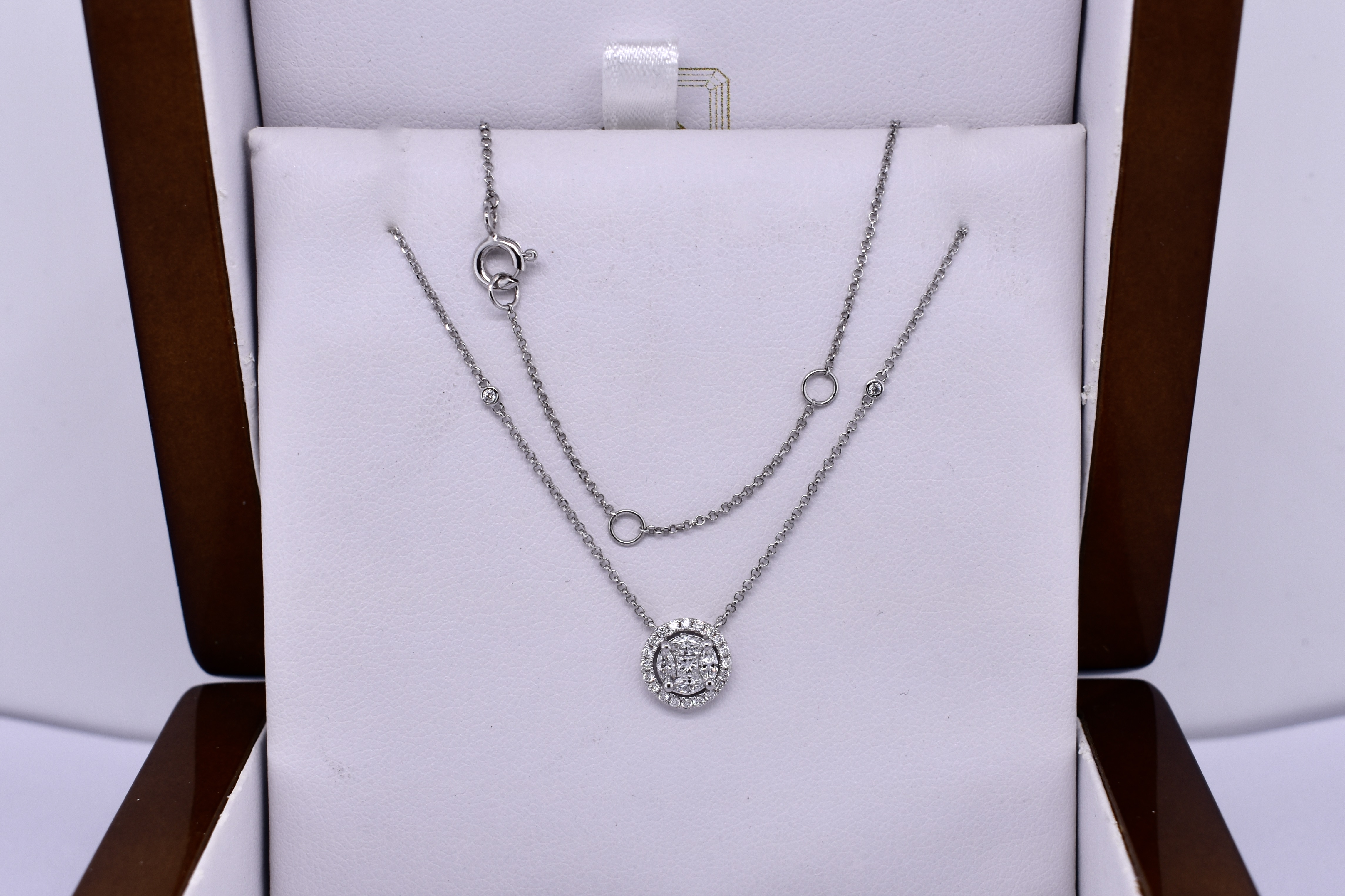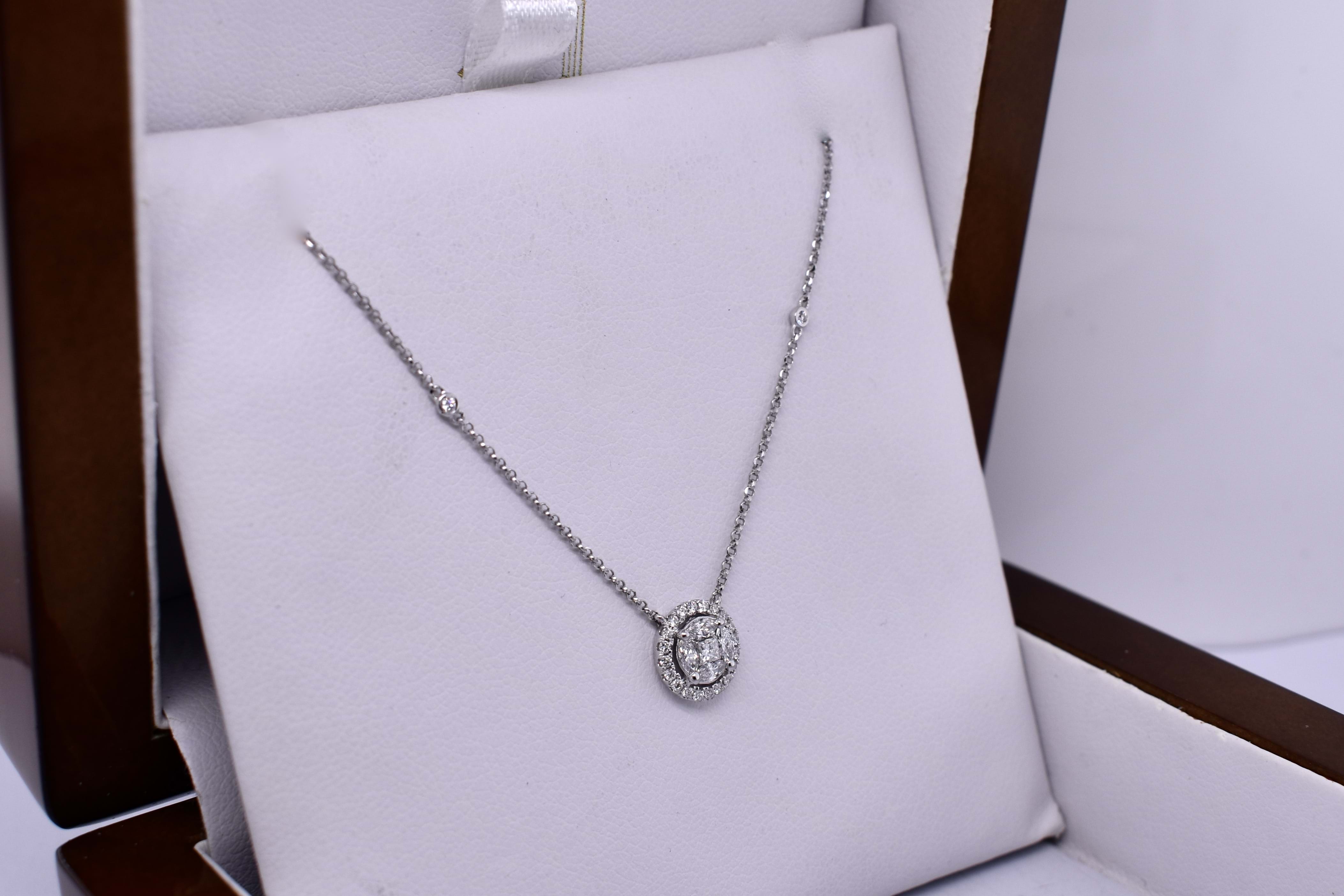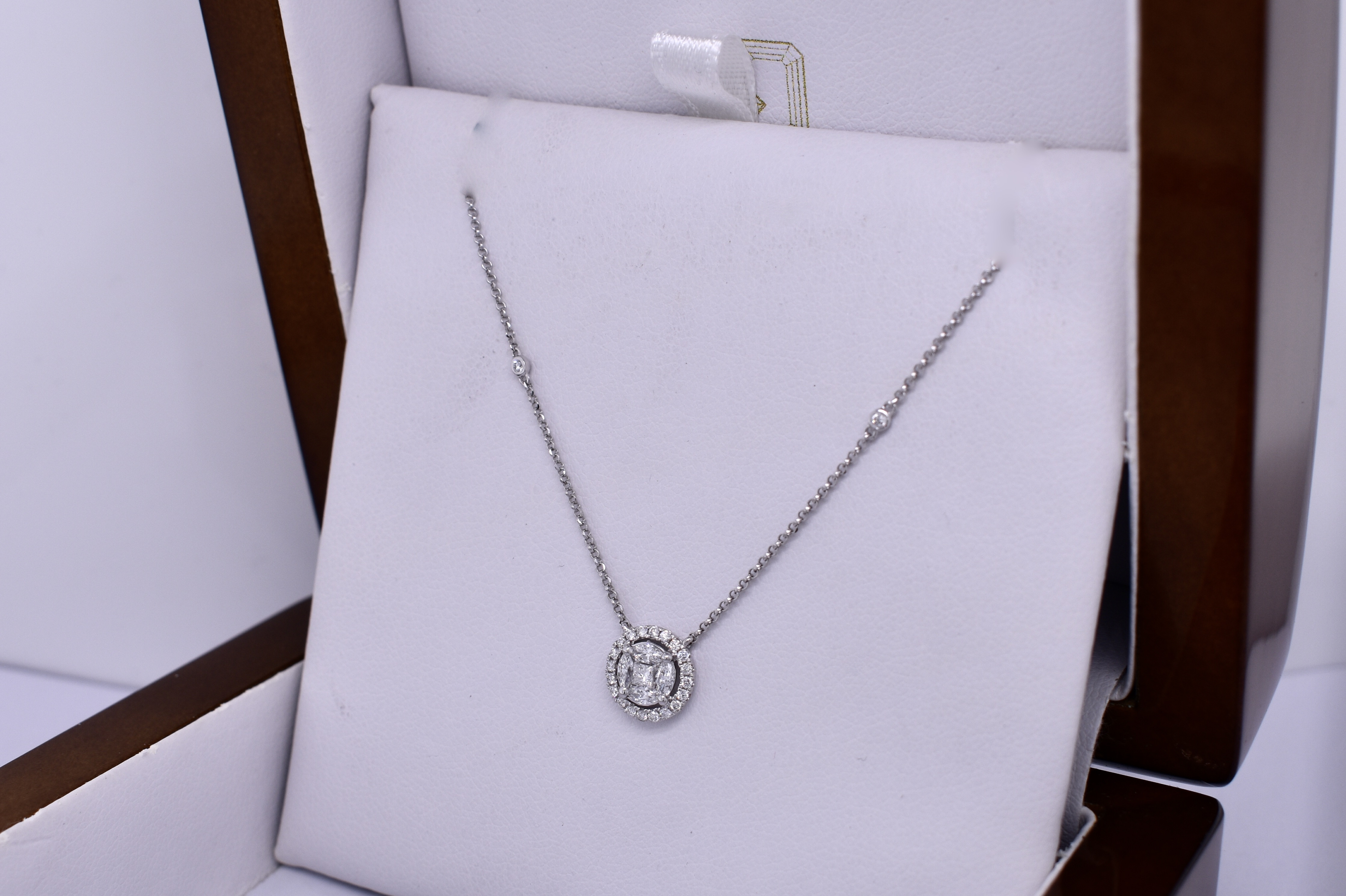 This elegant 31 stone illusion diamond necklet is crafted in 18ct white gold and measures 43cm long. The round illusion contains a princess cut diamond, surrounded by 4 marquise diamonds and 20 round brilliant cut diamonds, giving the illusion of a larger central round diamond with a diamond halo. It is then attached to a 1.00mm belcher link chain with 6 round brilliant cut diamonds stationed along it in bezel settings. Princess cut weighs 0.05ct, the four marquise diamonds total 0.16ct and 26 round brilliant cut diamonds equalling 0.14ct FG VS-SI. Chain has two jump rings to shorten if needed. Independent Valuation Supplied.