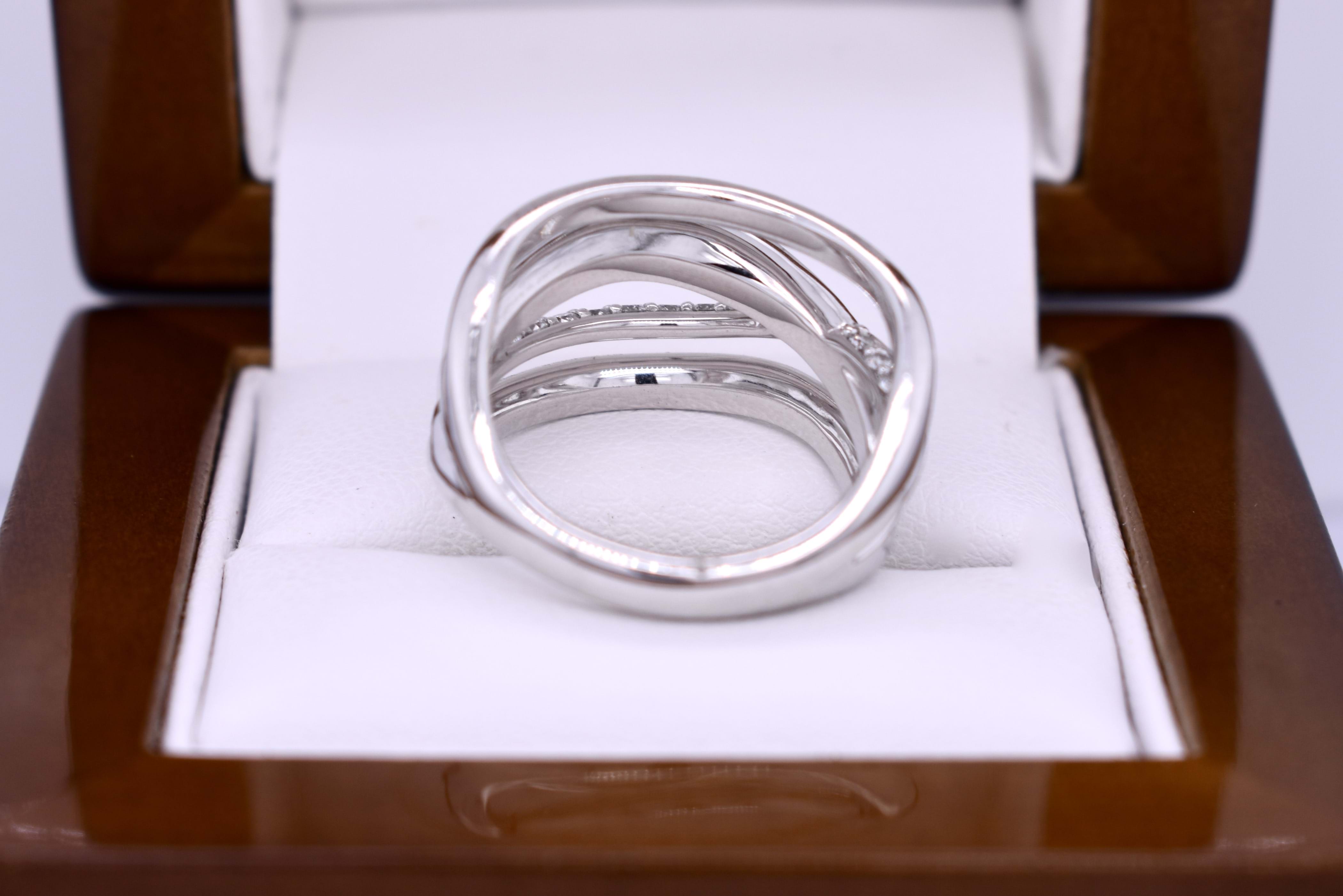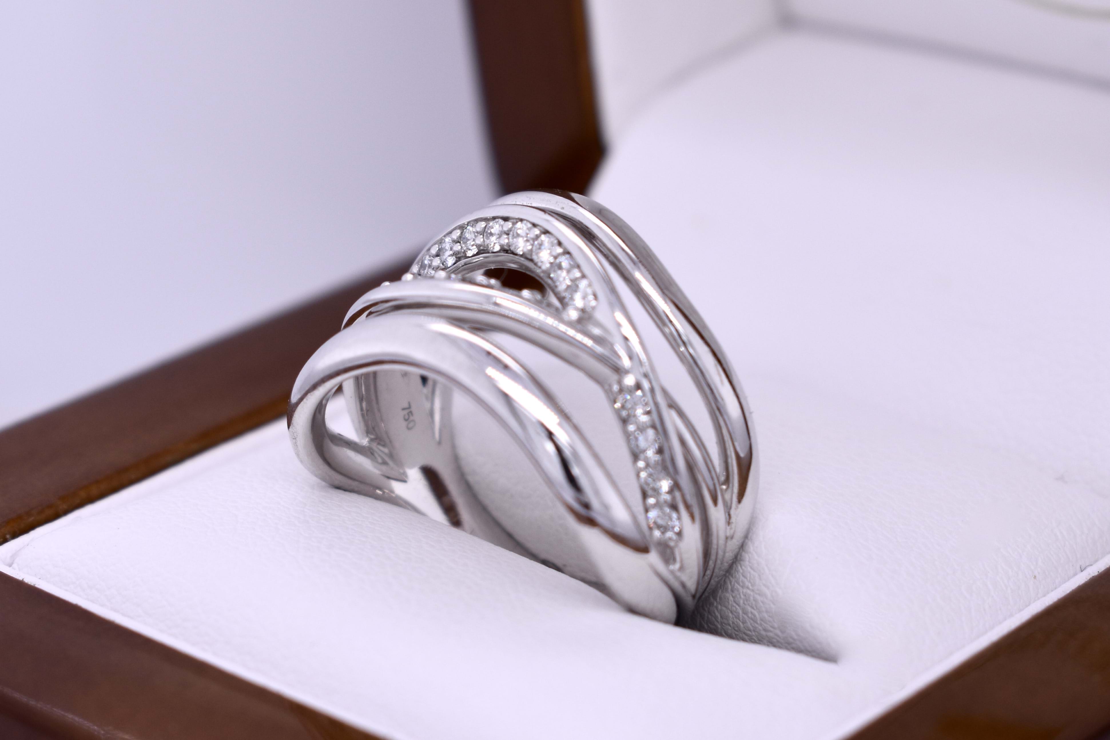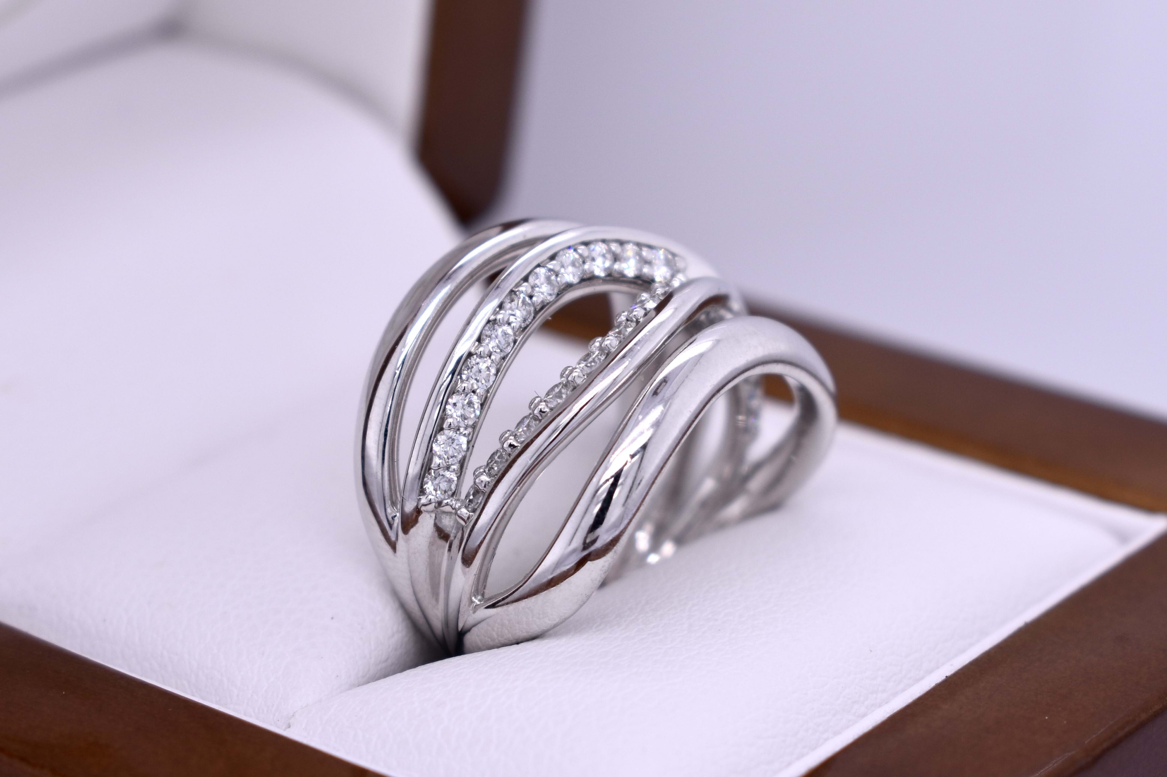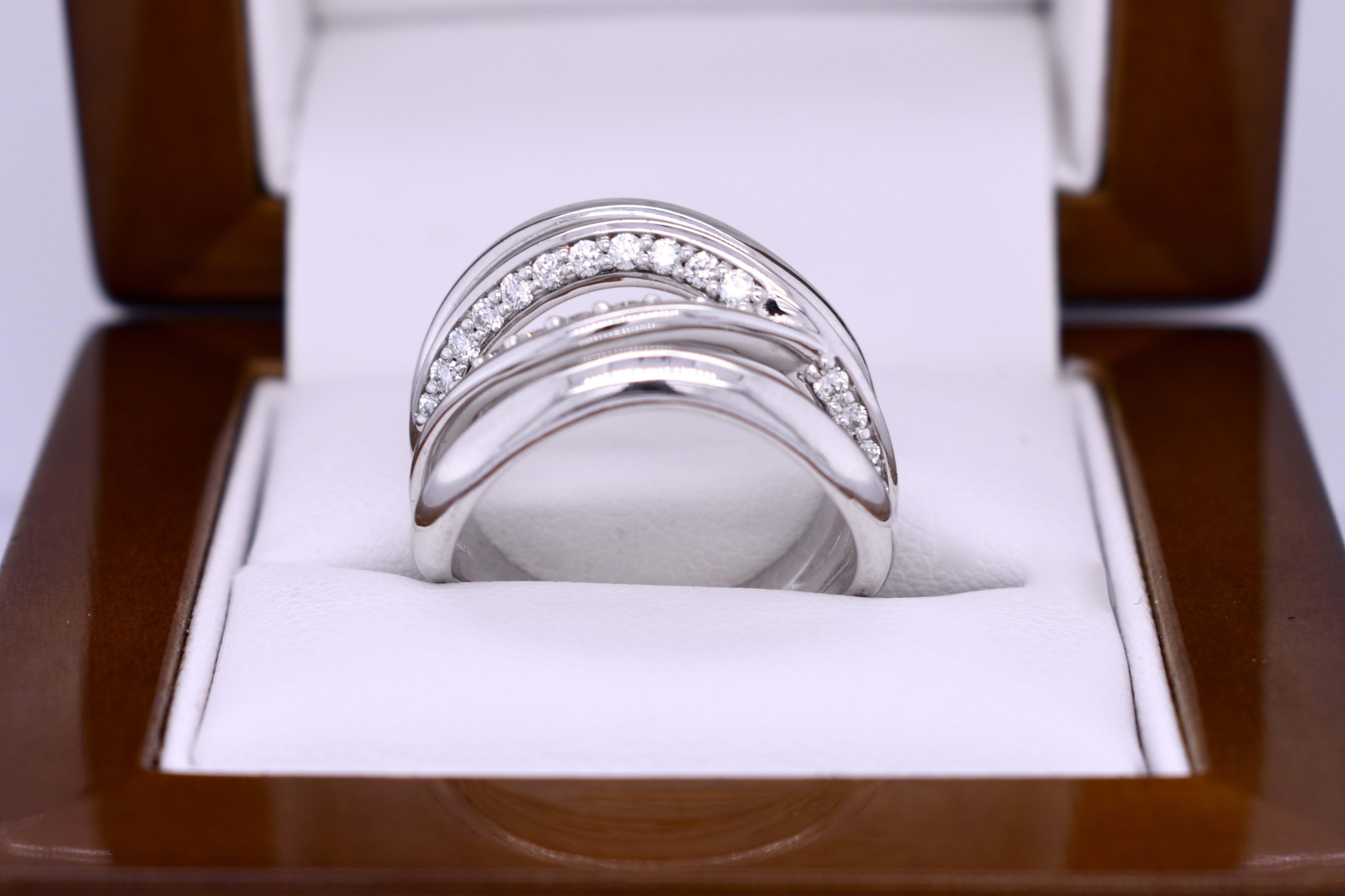 This fantastically crafted ring is designed with multiple swirls creating a gapped wave pattern, made in 18ct white gold. The two inner swirls with a marquise opening are set with 24 round brilliant cut shimmering diamonds, totalling 0.42ct GH SI. The others are plain gold which join the plain gold 15.30-3.25mm wide band. FInger size N.