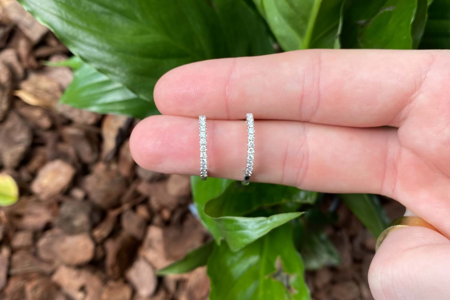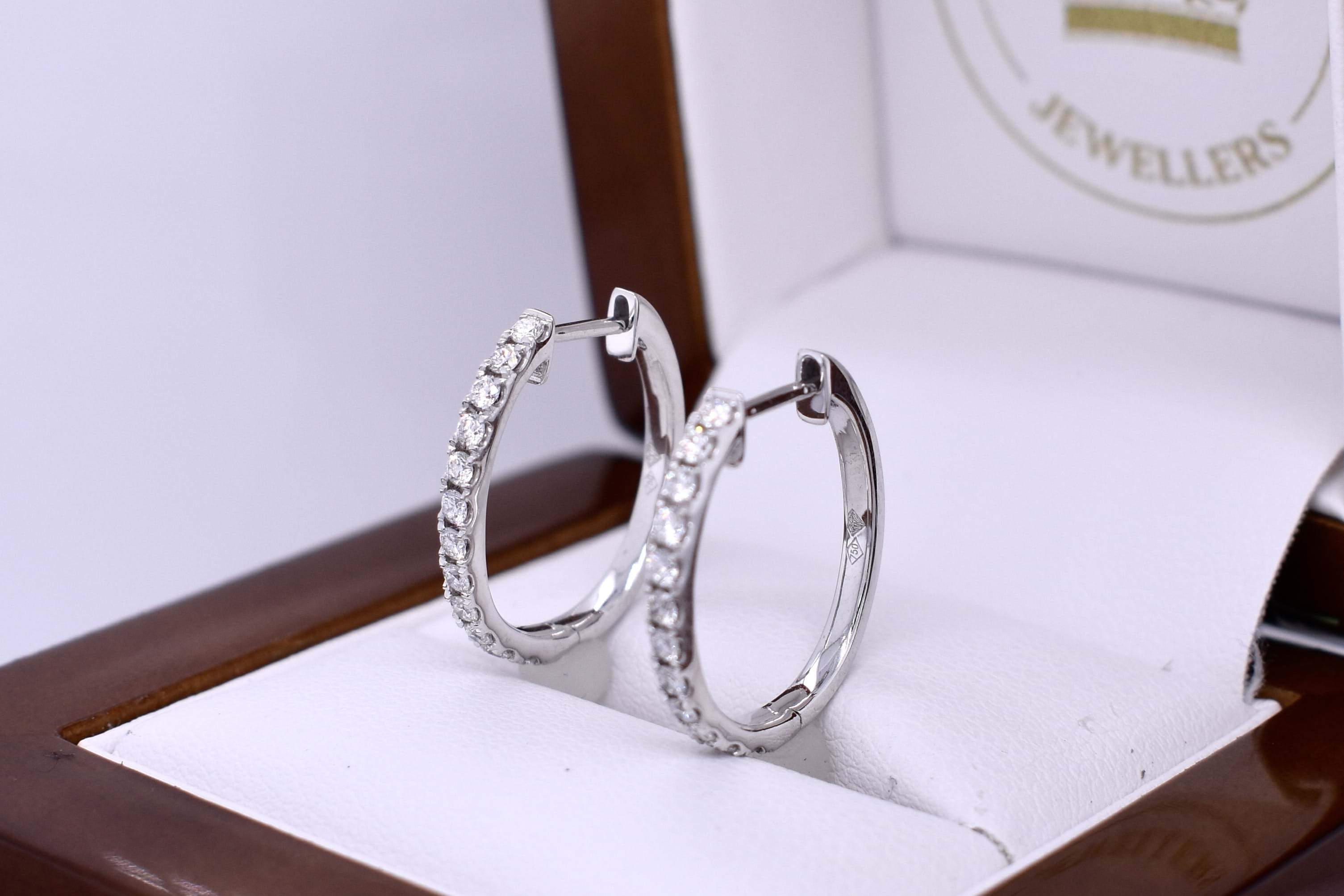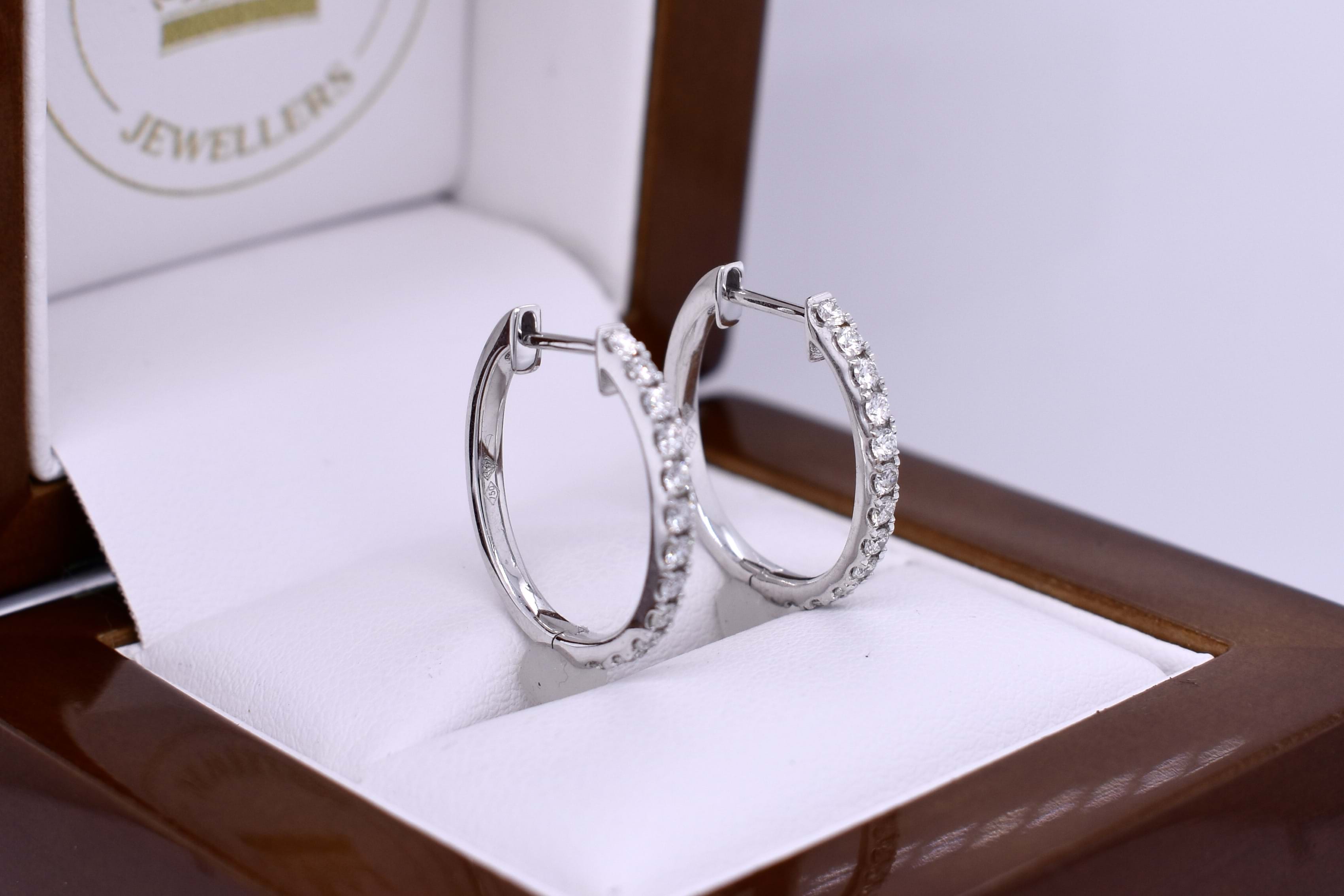 Simple and elegant, these 18ct white gold hoops contain 12 round brilliant cut 1.60mm diamonds each, micro claw set in an oval hinged hoop with clipped post fittings. Total of 24 round brilliant cut diamonds totalling 0.44ct FG VS-SI. Independent Valuation Supplied.
