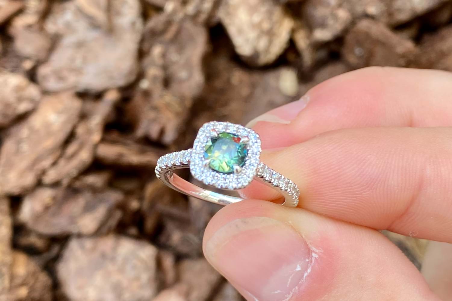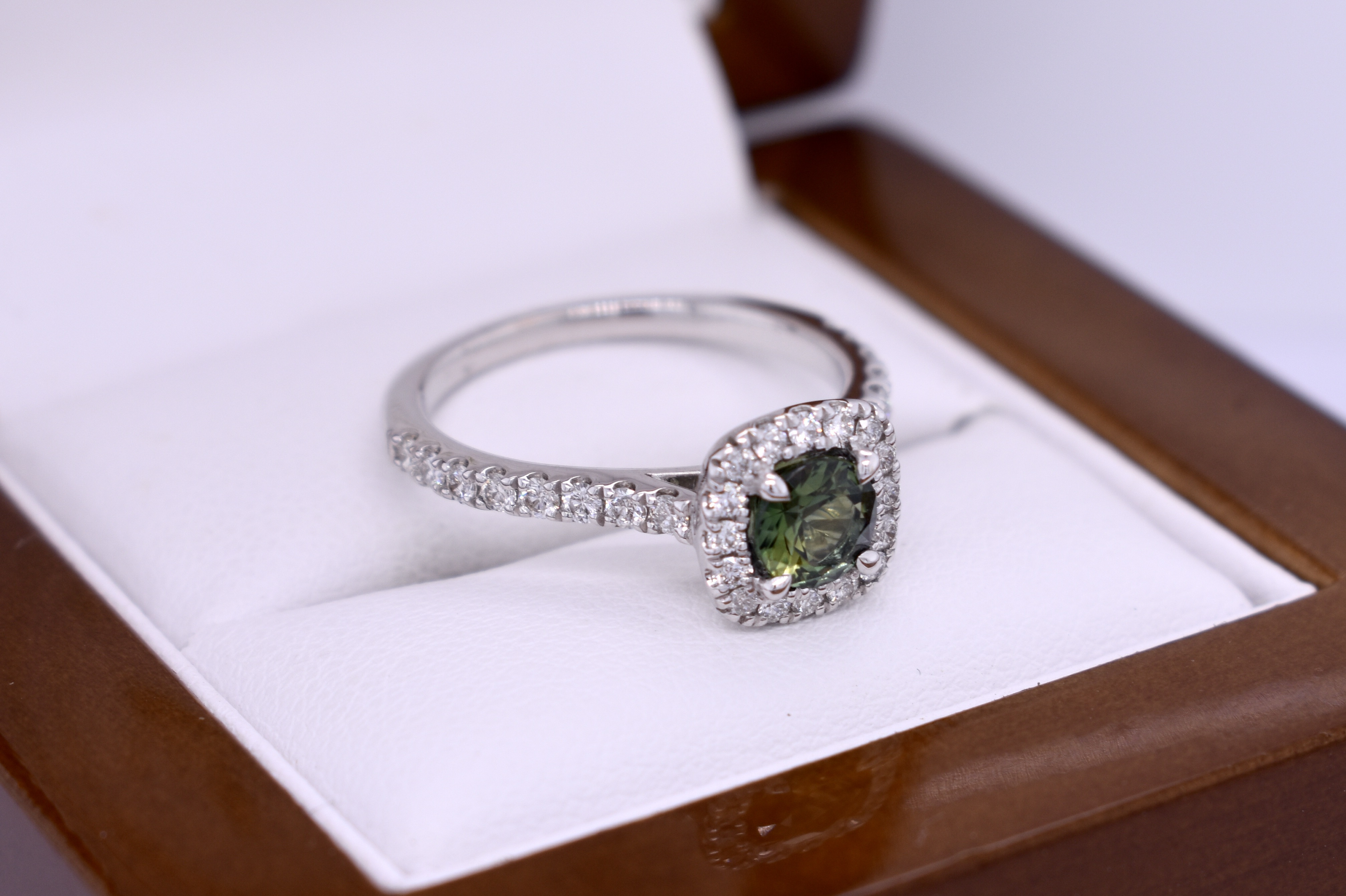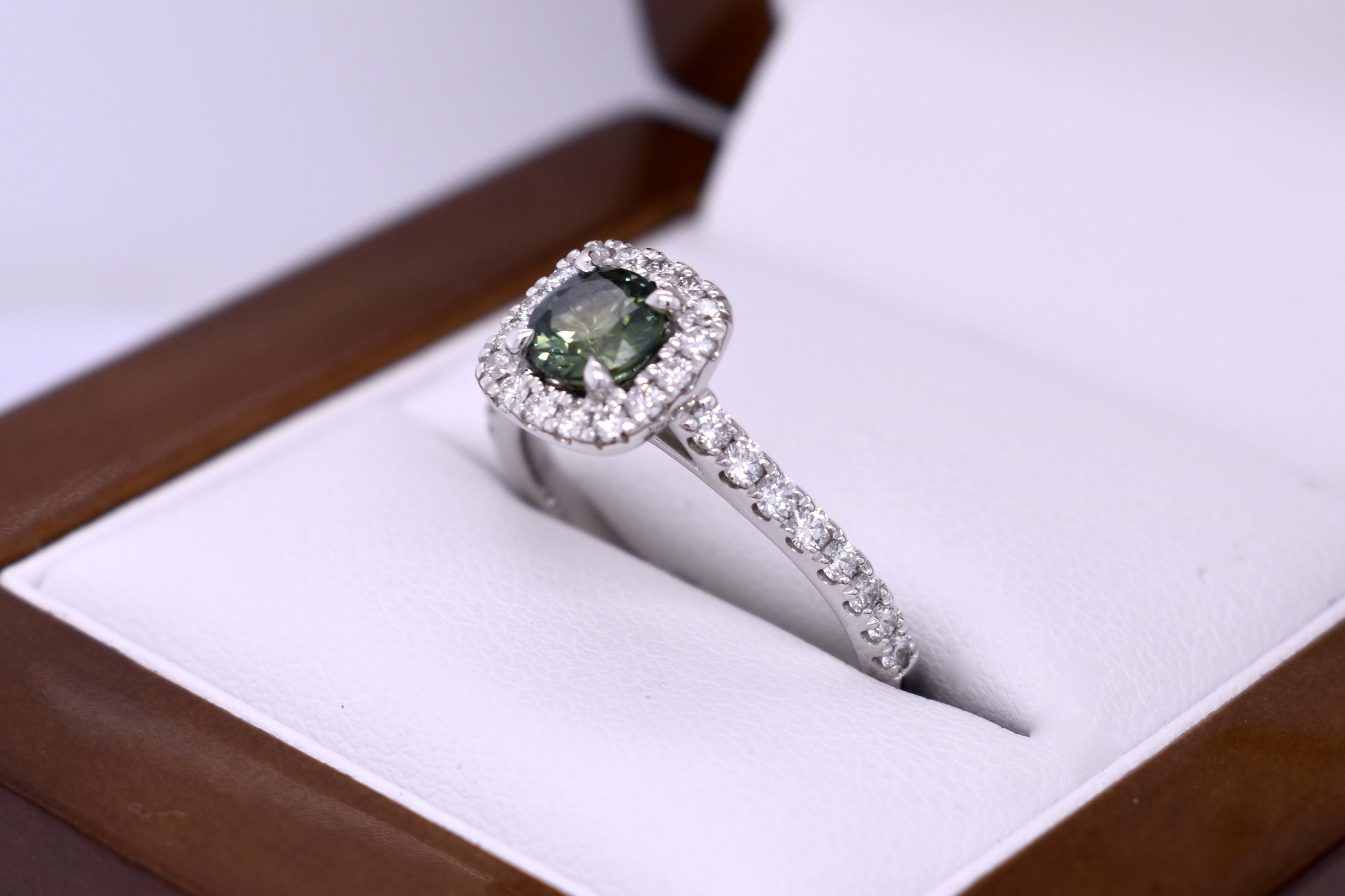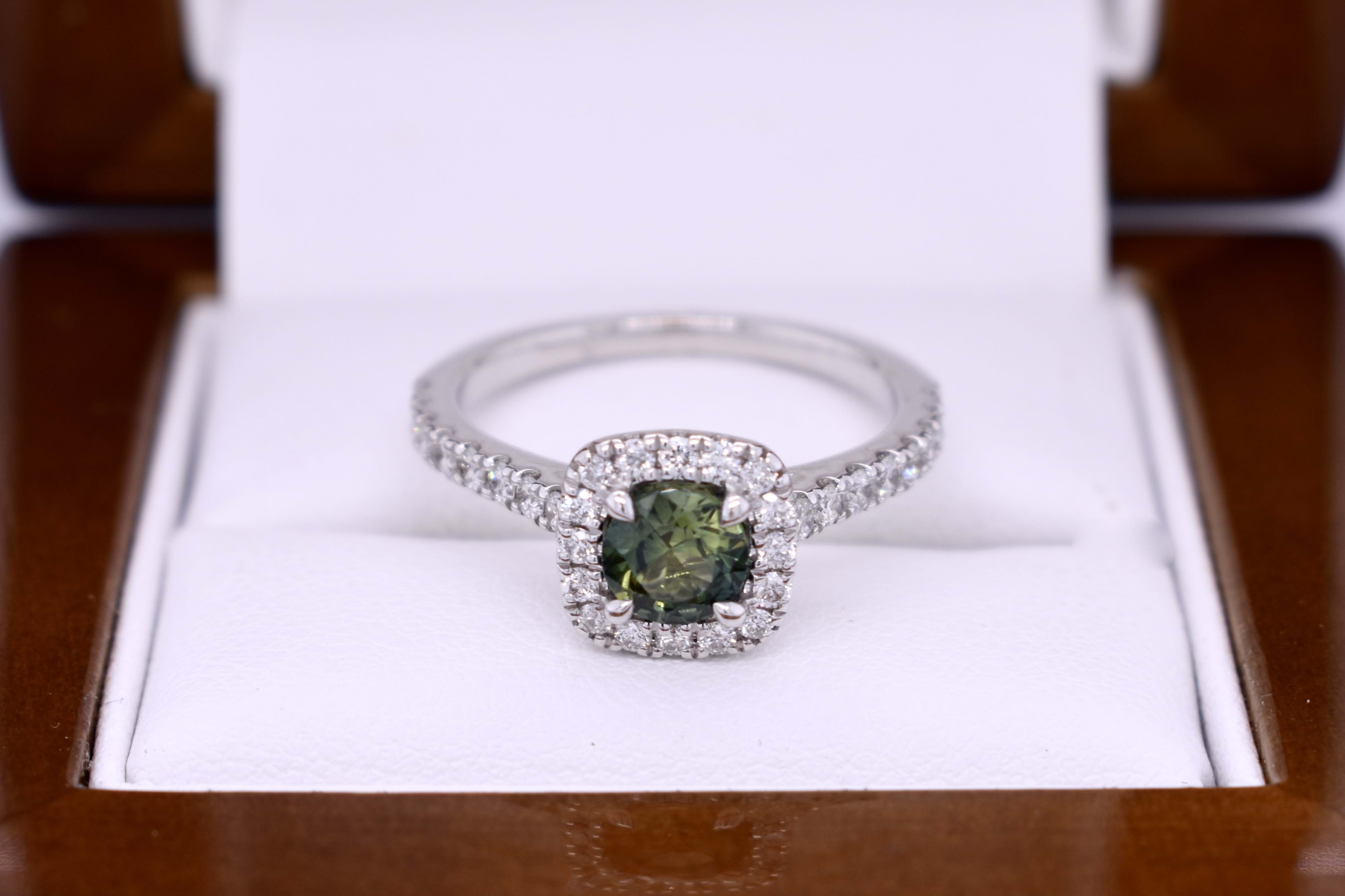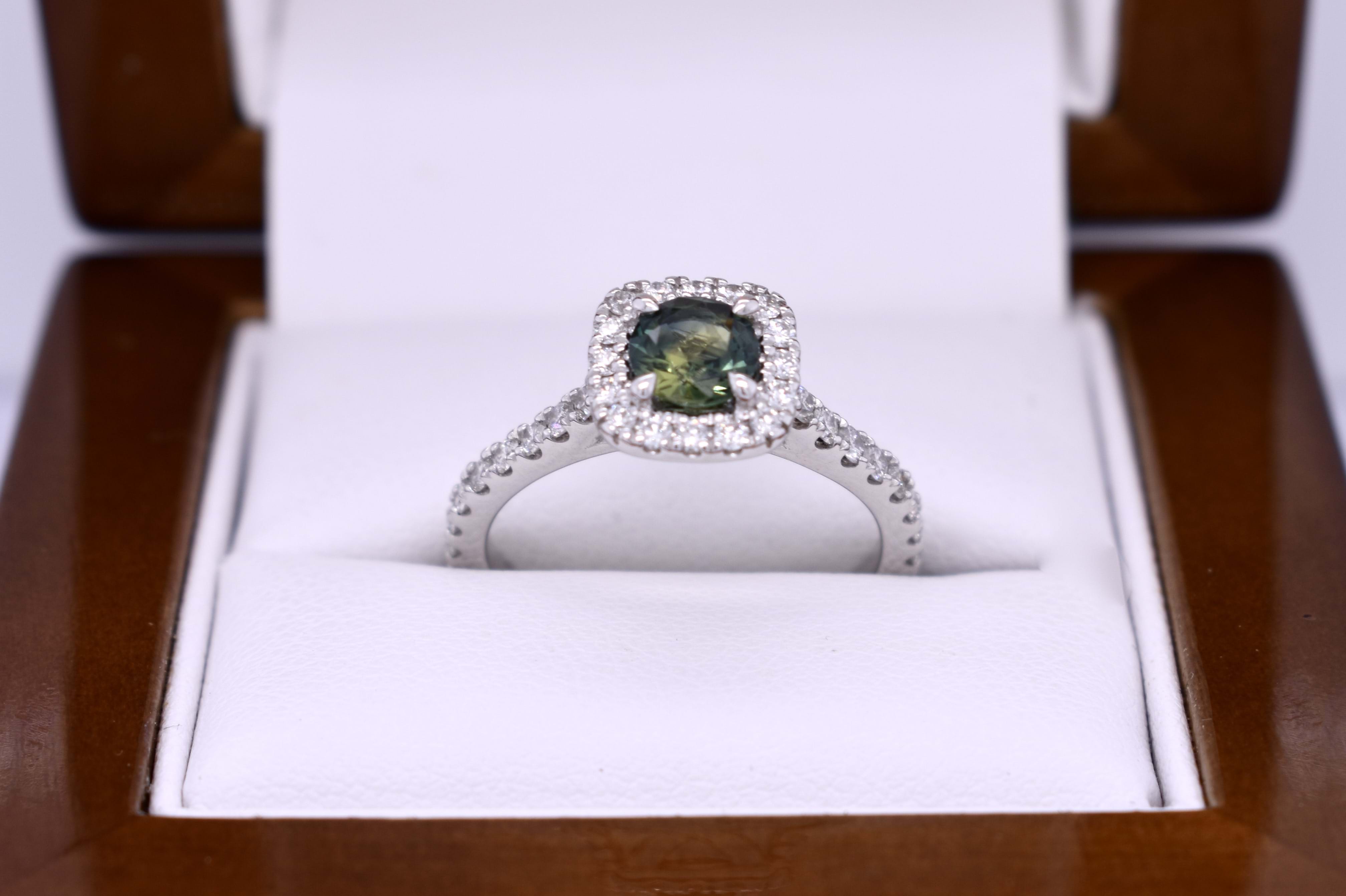 18ct White Gold 0.74ct Green Parti Aus Sapphire & 0.49ct Diamond Cushion Halo Ring (M)