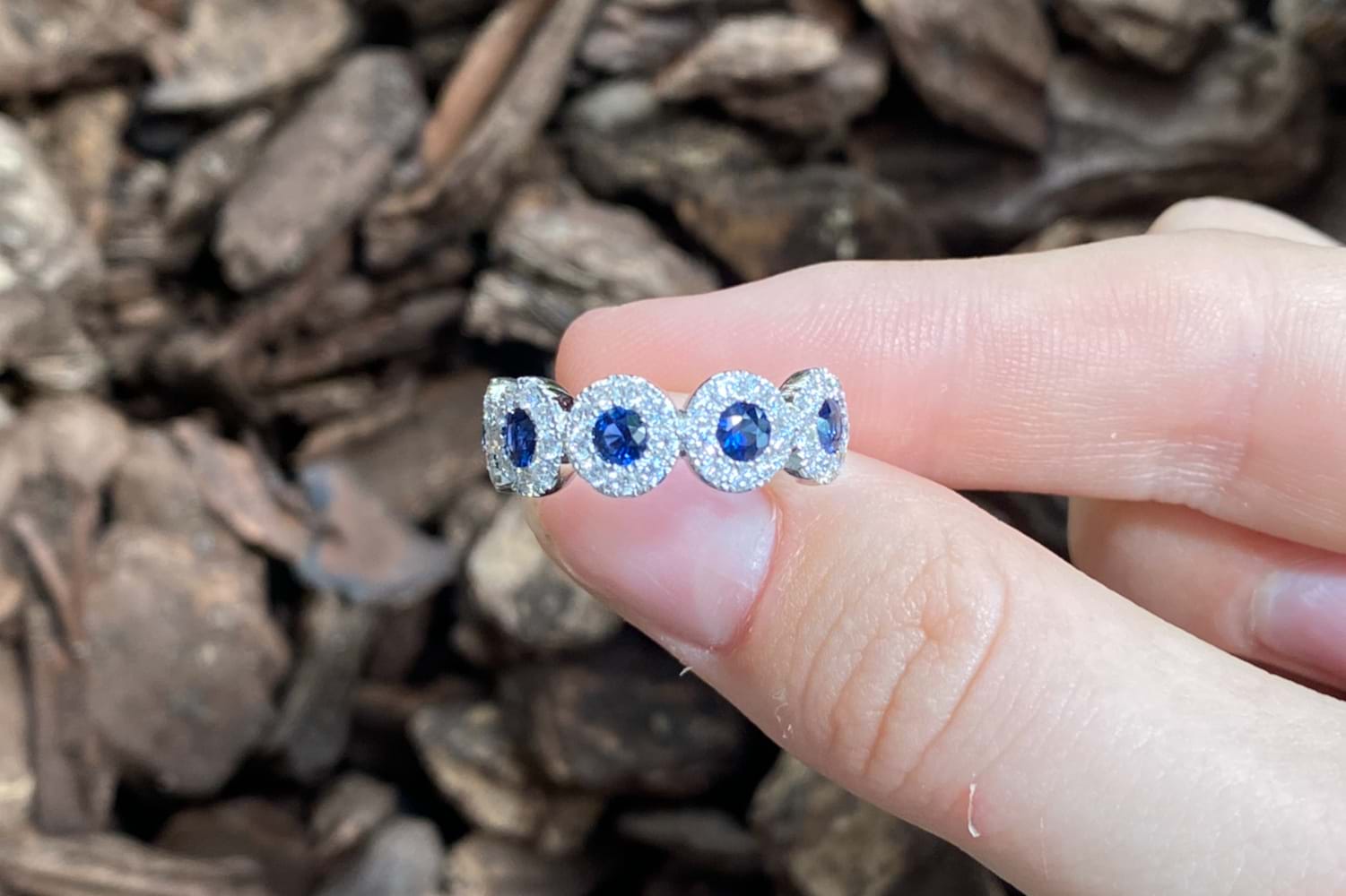 This stunning five stone cluster ring was made from five bright deep blue sapphires, crafted in 18ct White Gold. The sapphires measure 3.50-3.10mnm round and are set in a row, surrounded by twinkling halos of 1.50mm round brilliant cut diamonds. A total of 45 diamonds micro claw set around the sapphires creating five clusters, diamonds totalling 0.67ct FG VS-SI. Finished on a 2.09mm tapering band. Finger size M+. Independent Valuation Supplied.