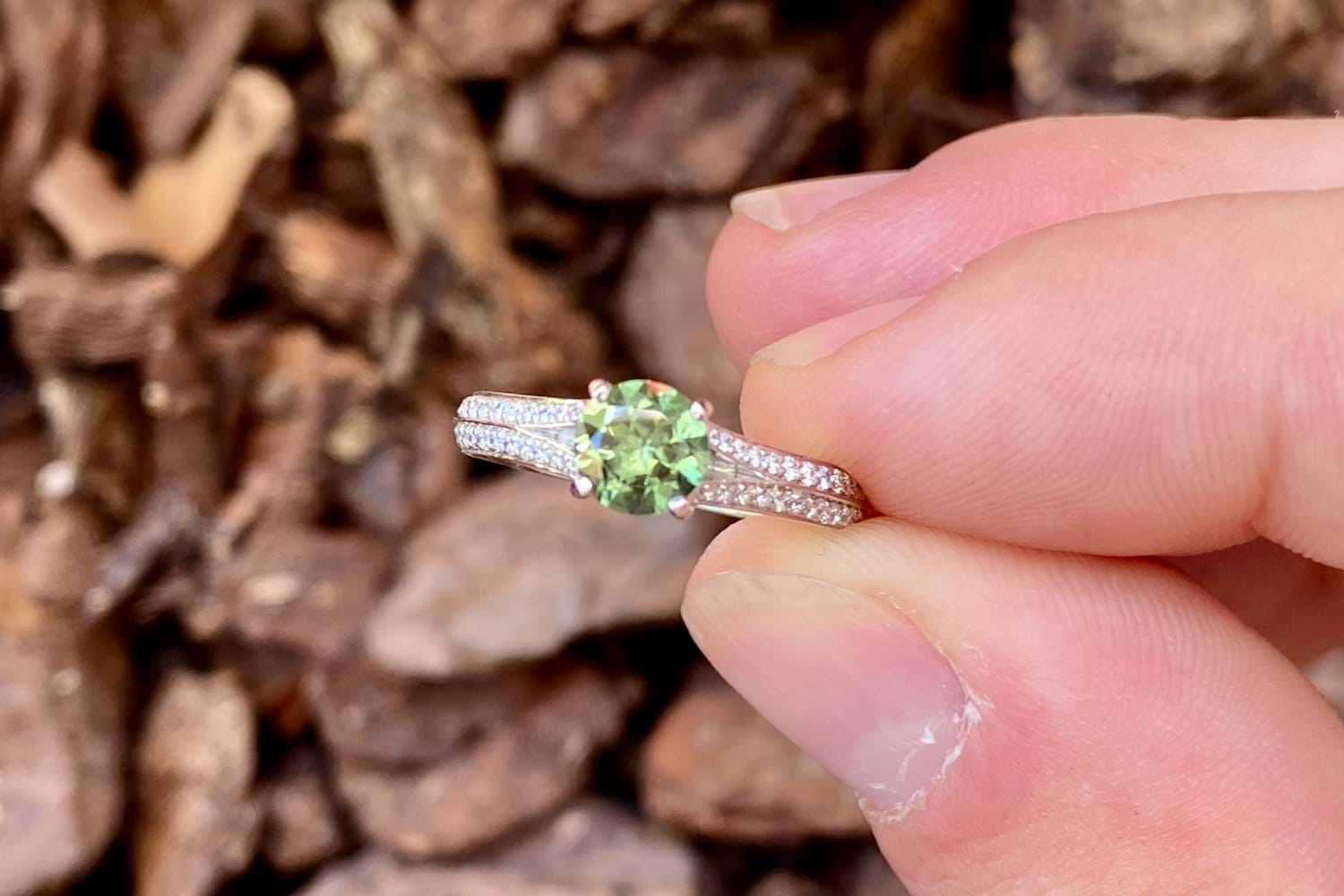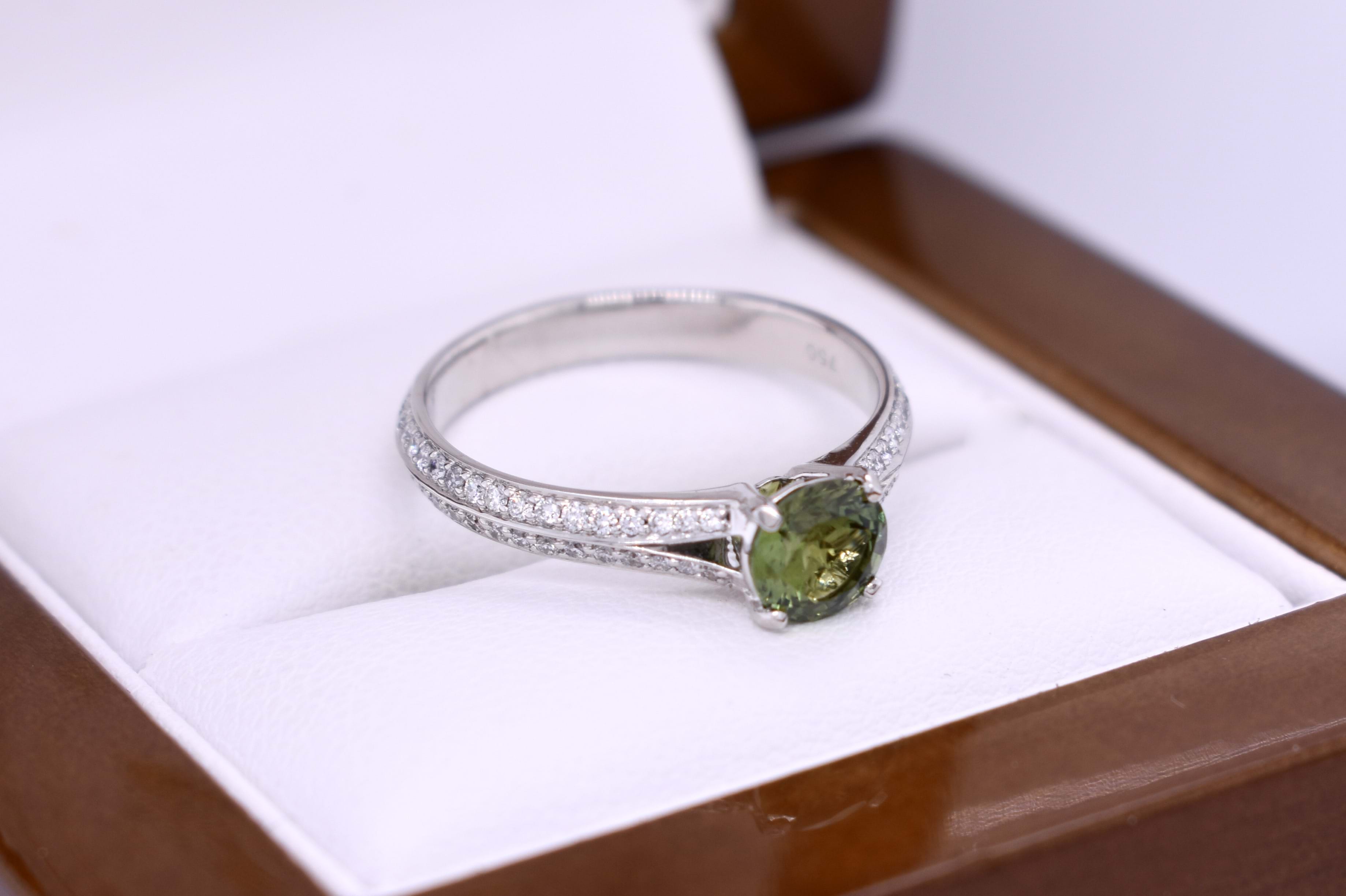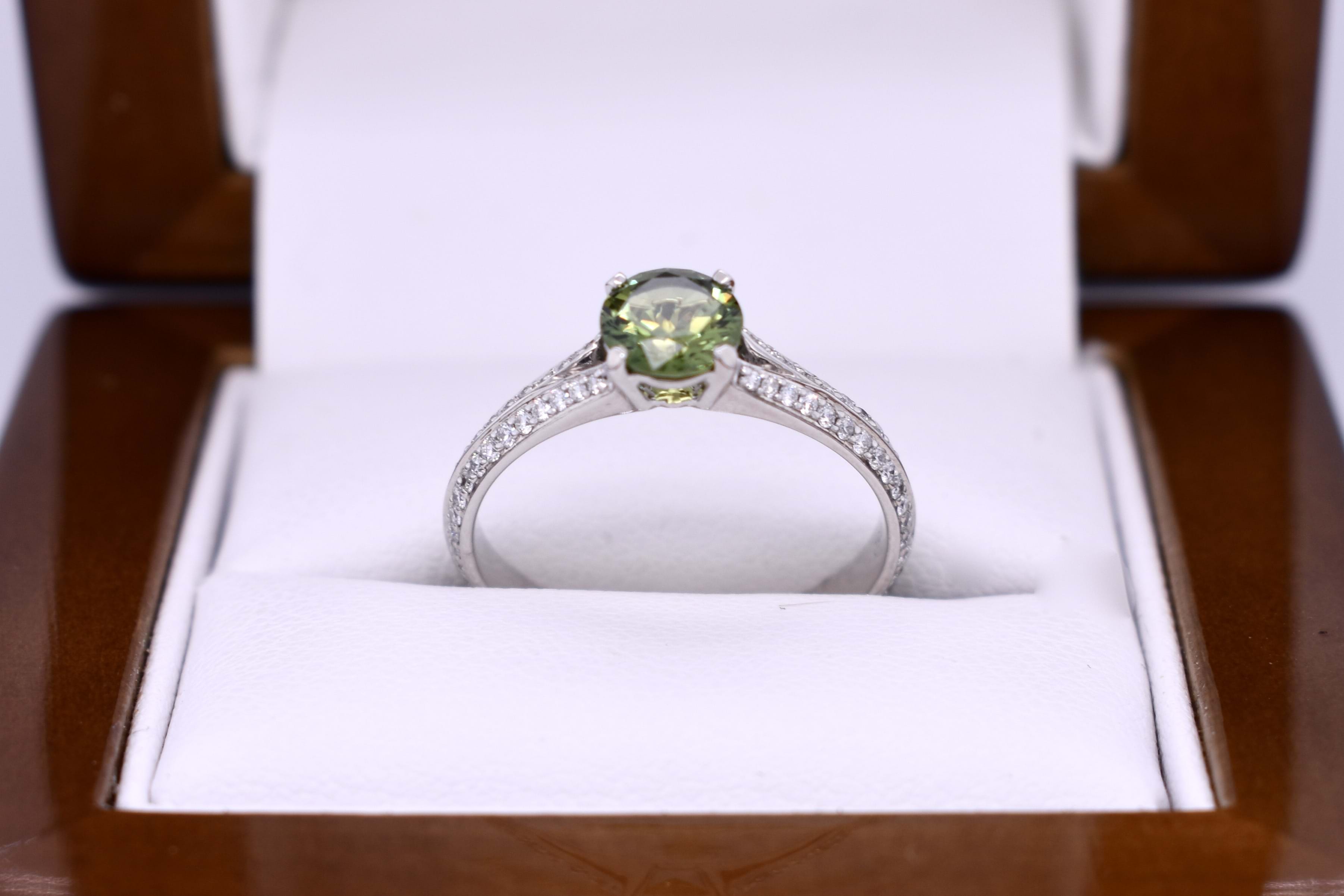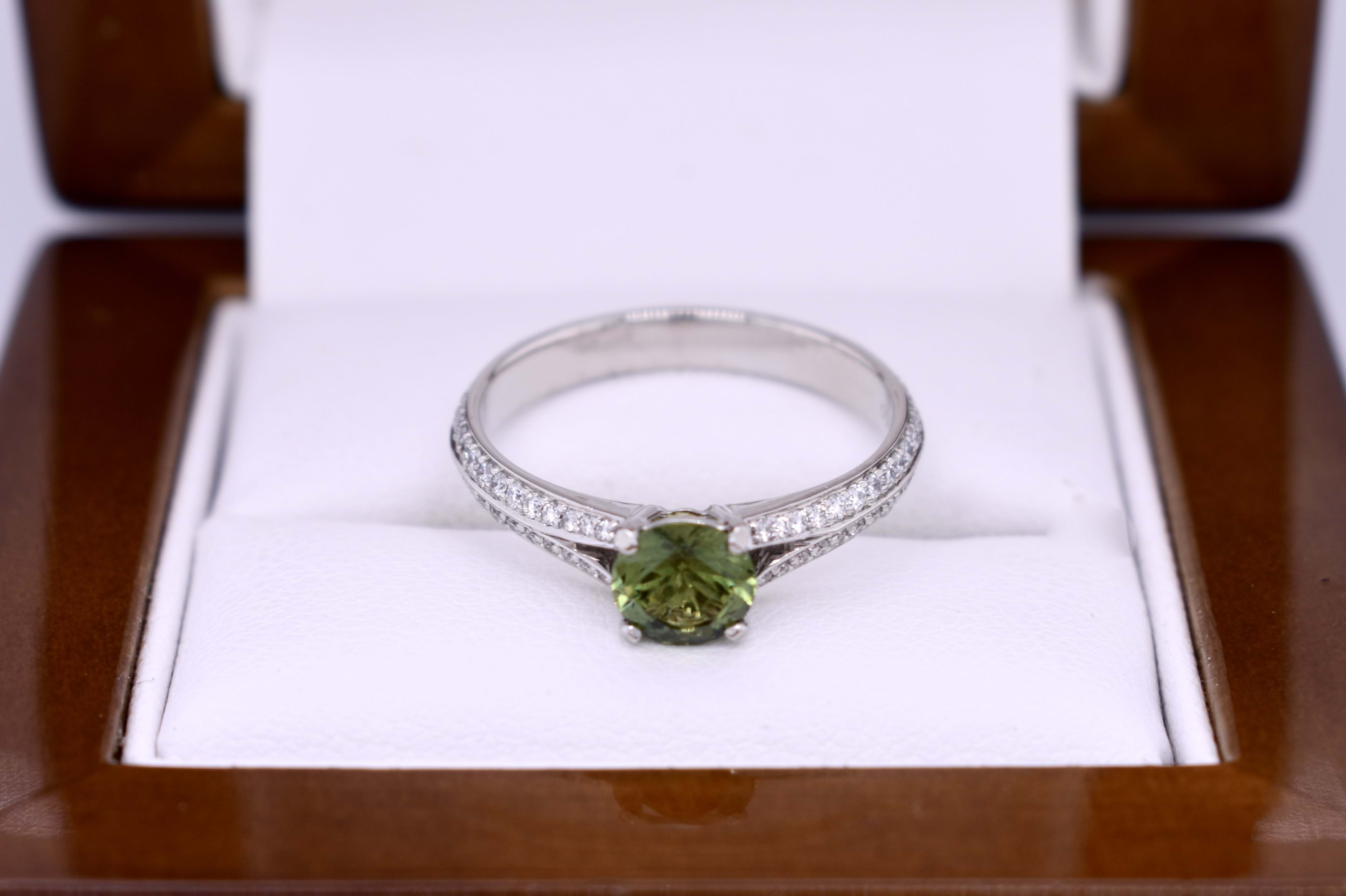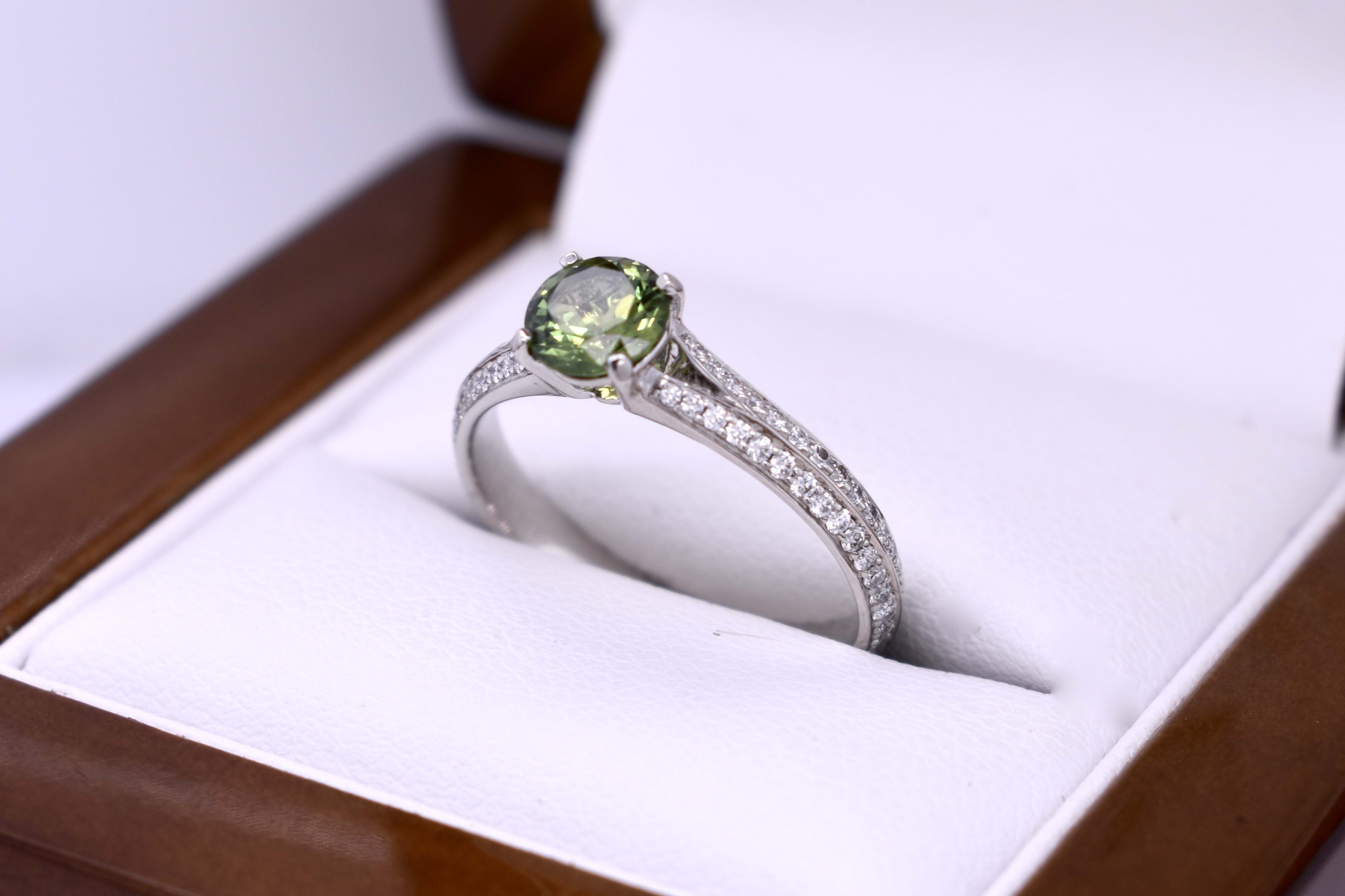 A beautiful green round shaped sapphire of 0.82ct from Australia is four claw set in 18ct white gold, featuring split shoulders set with diamonds which continue down the band. A total of 36 round brilliant cut diamonds equalling 0.31ct FG SI. Finger size M+.