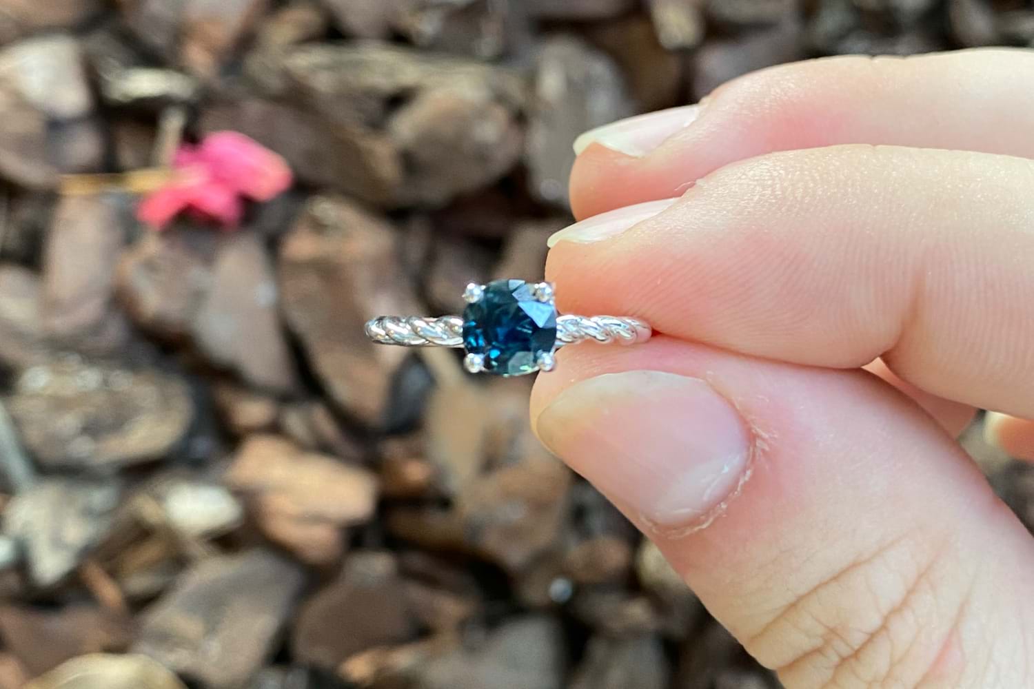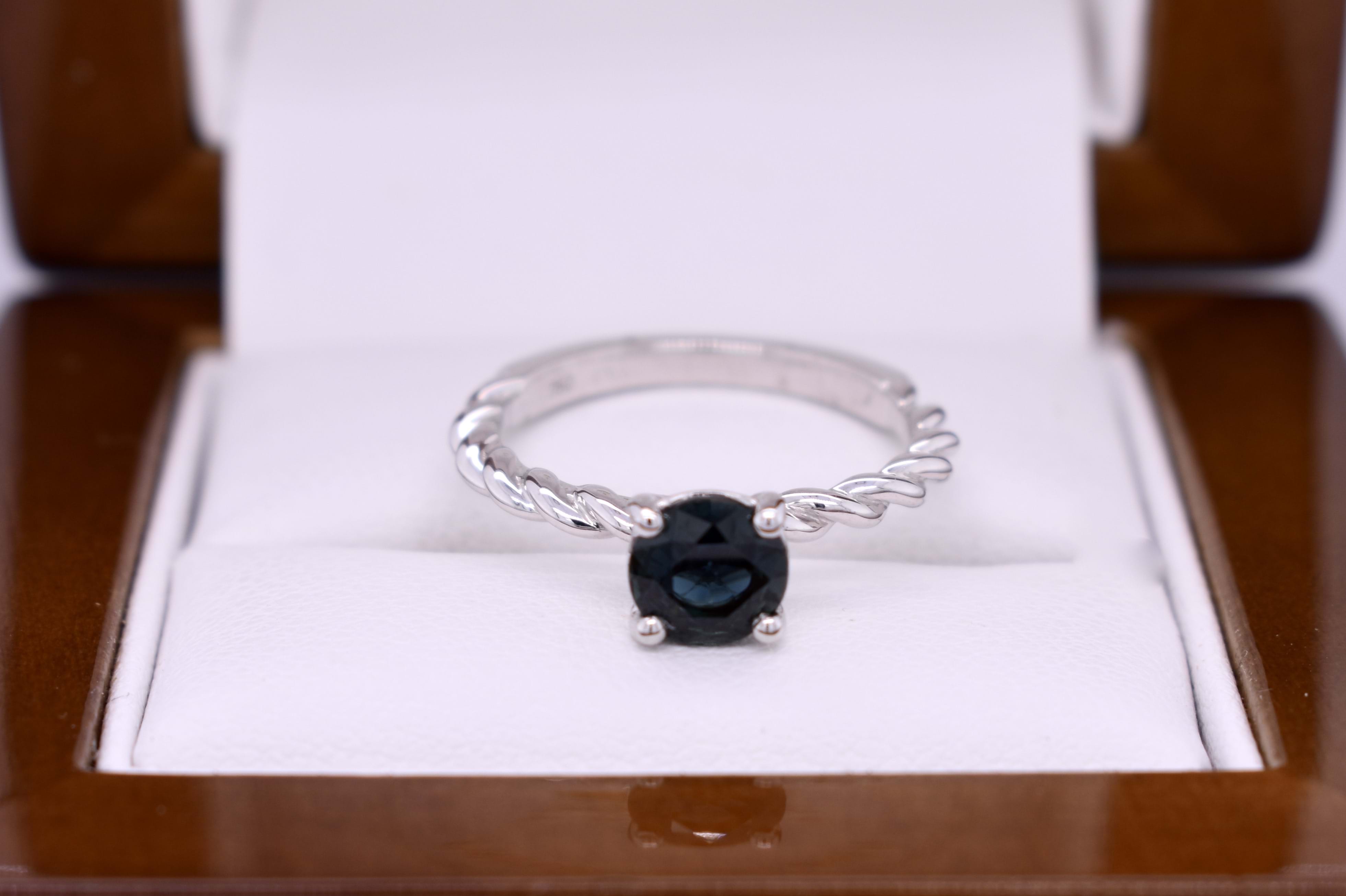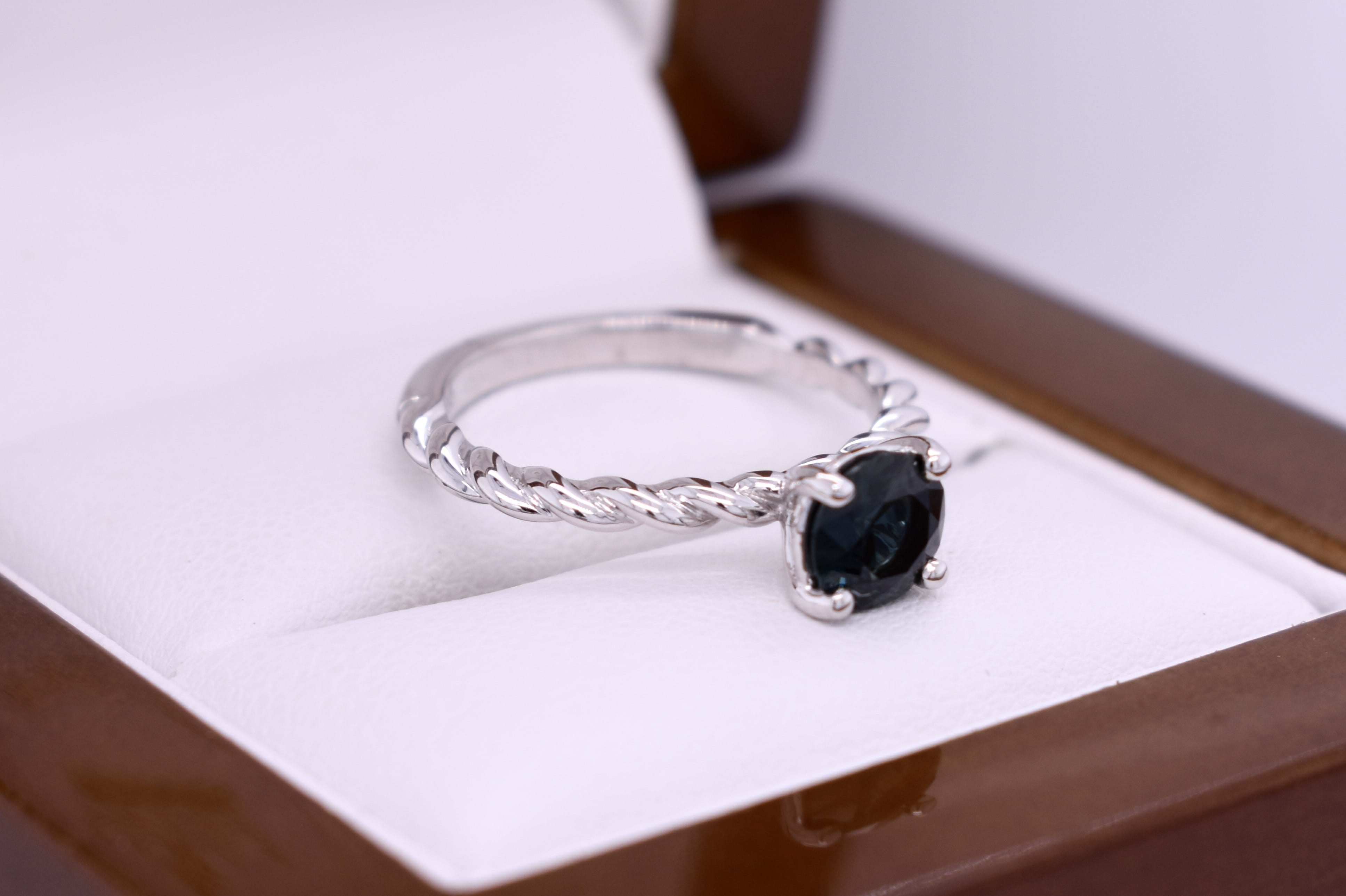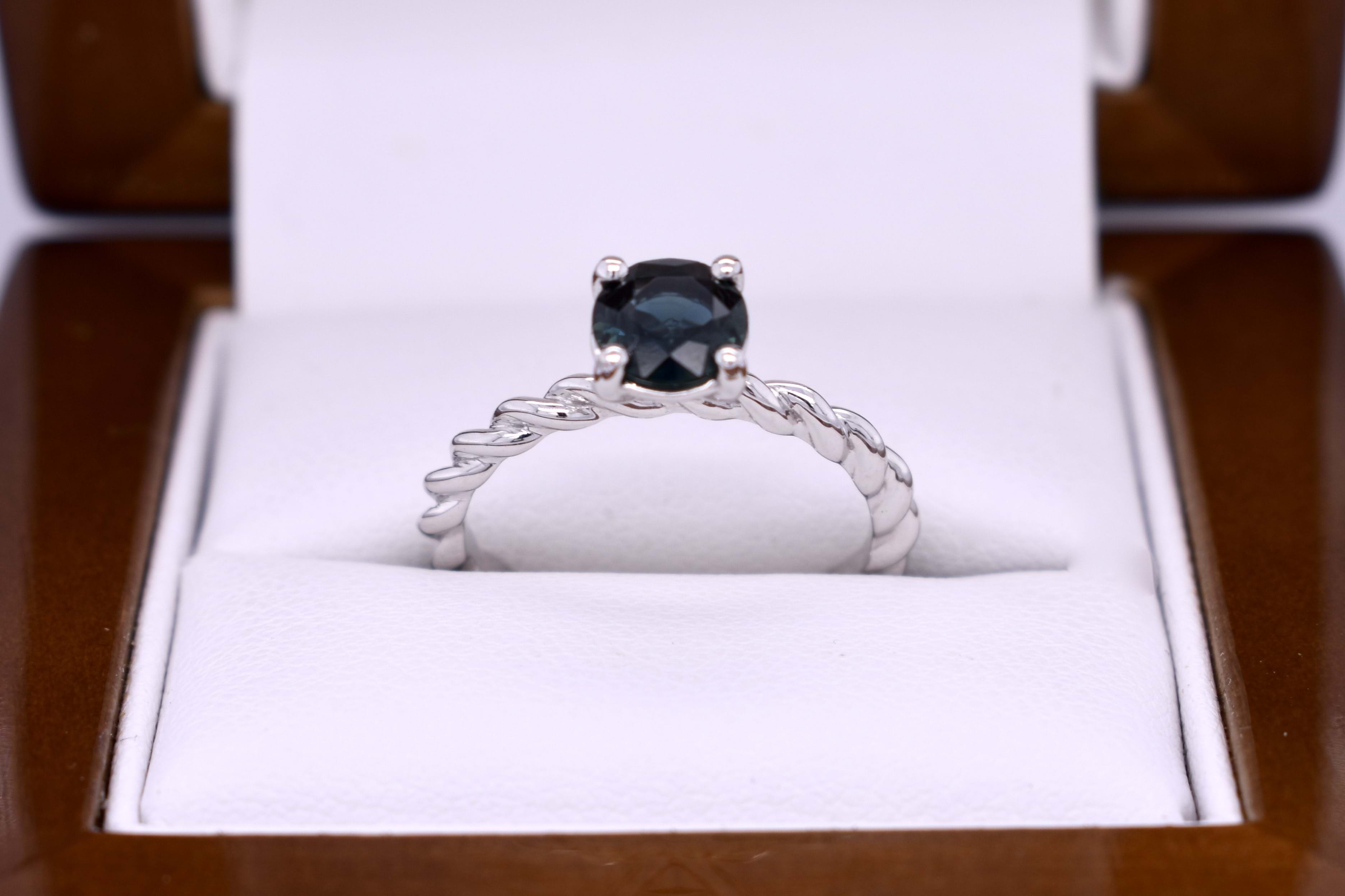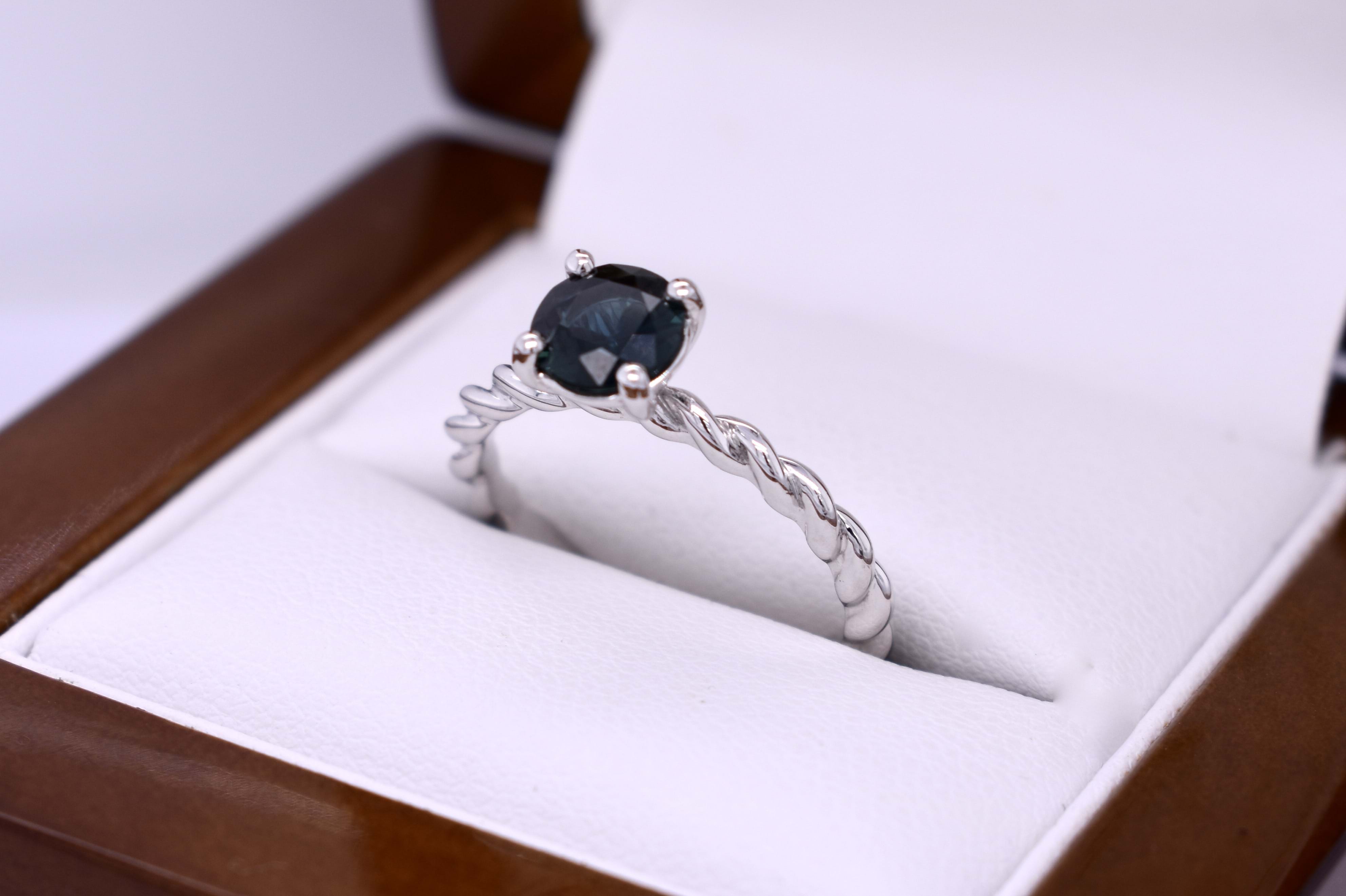 Cute ring crafted in 18ct white gold, featuring a teal Australian round sapphire of 0.83ct which is four claw set on a twisted band. Finger size K+.