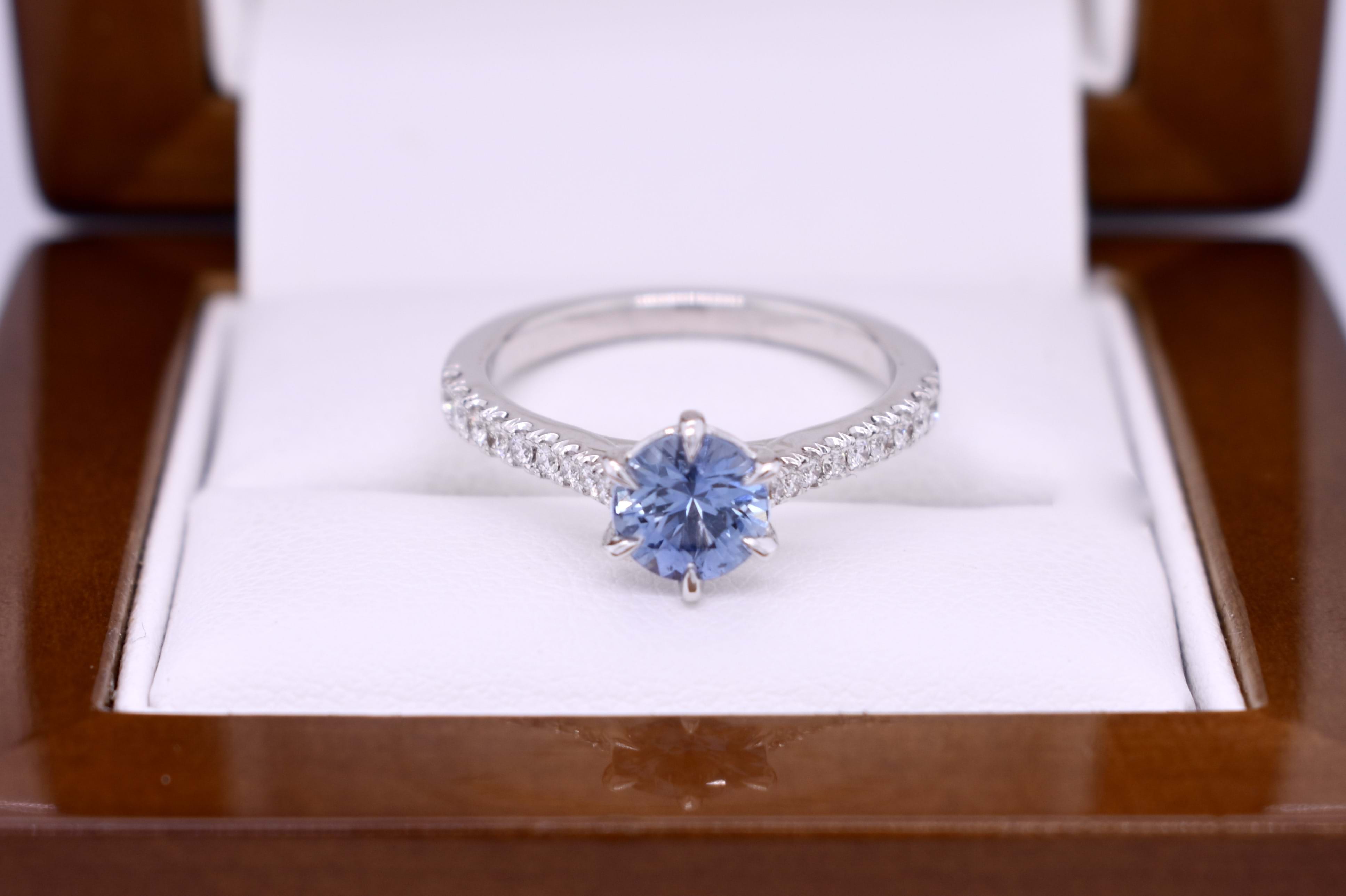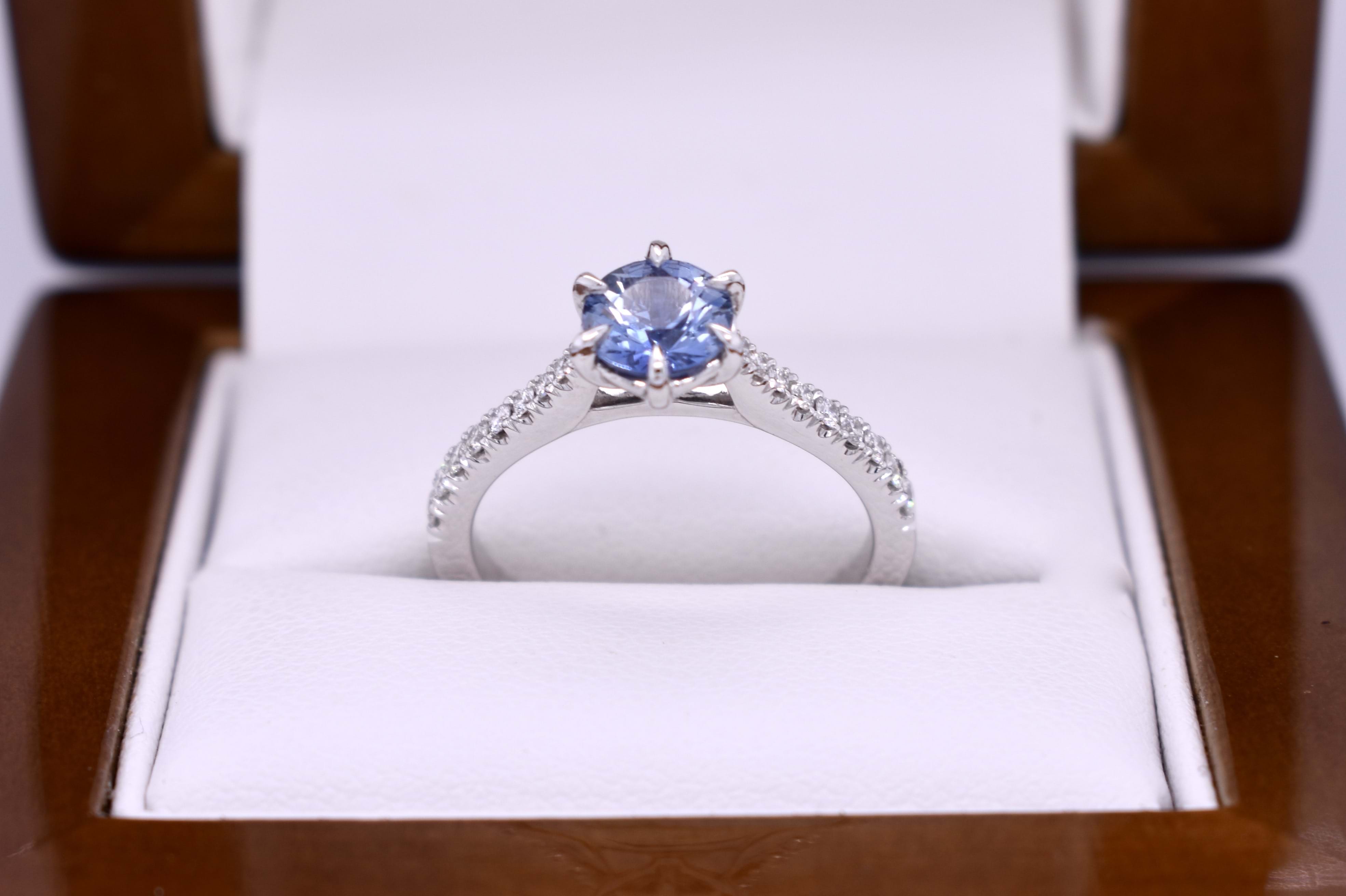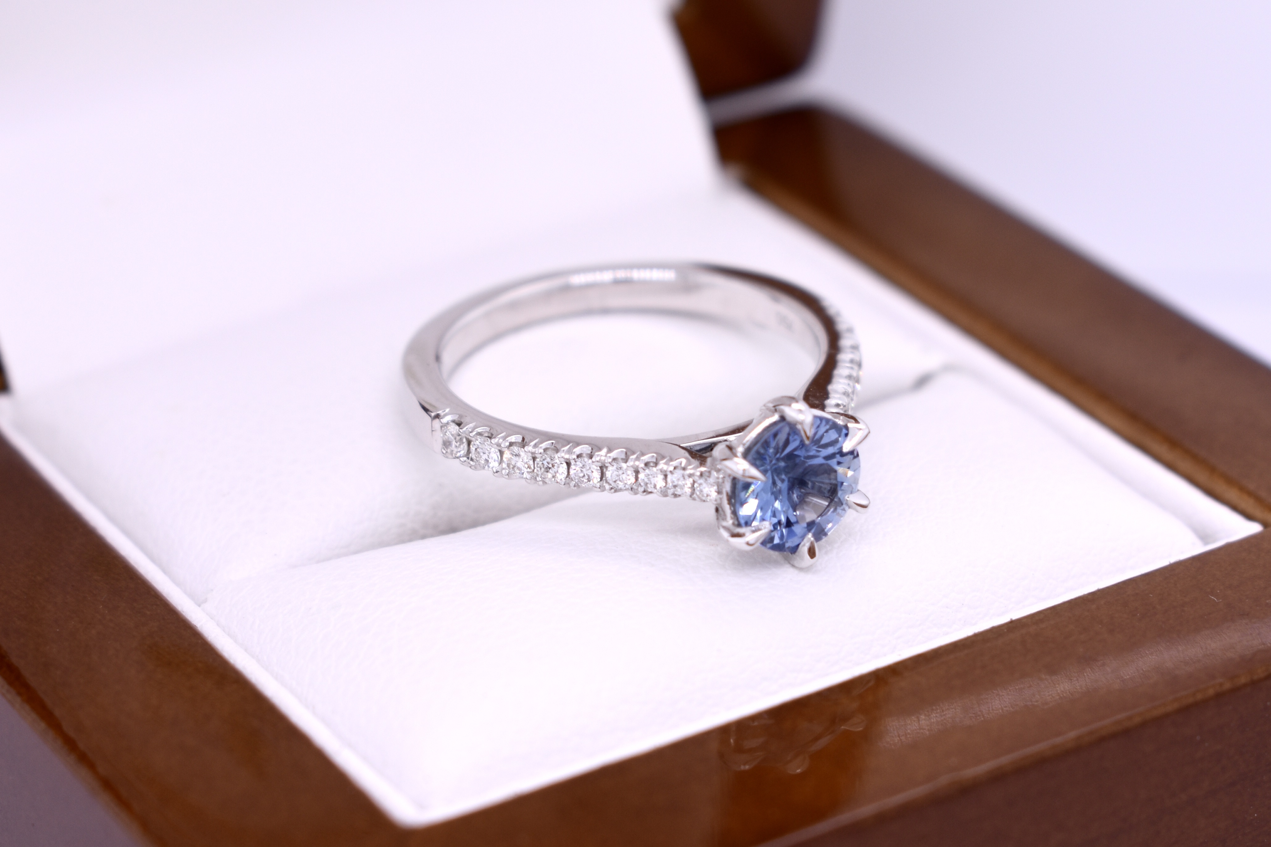 This stunning 18ct white gold ring features a central round greyish blue coloured Ceylon sapphire of 0.97ct, six claw set with 18 round brilliant cut diamonds cut down claw set down the shoulders and continuing down the band. A total diamond weight of 0.19ct FG SI. Finger size L+.