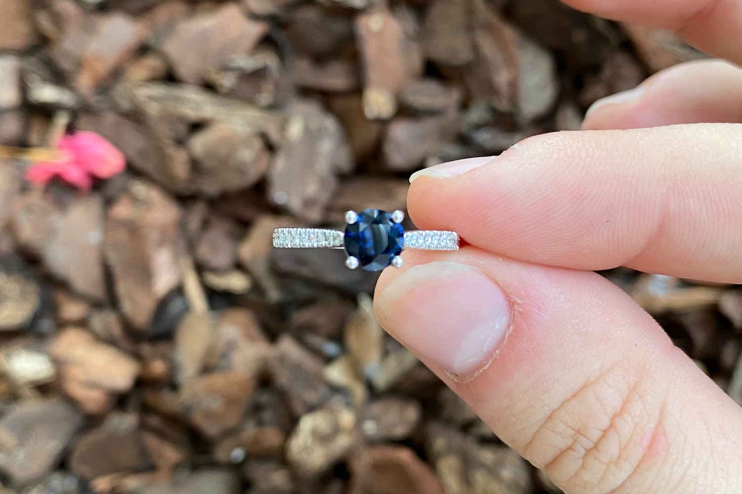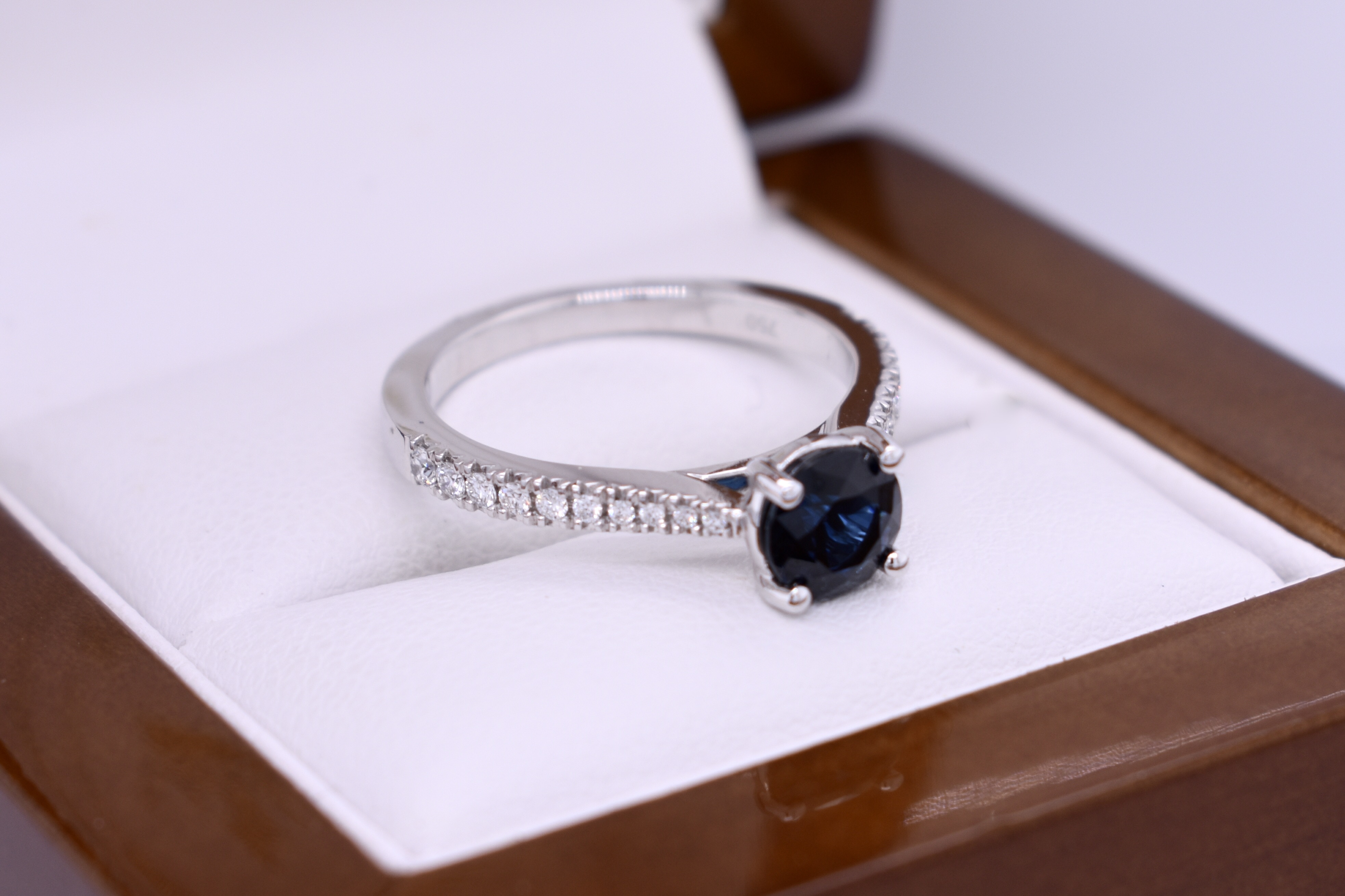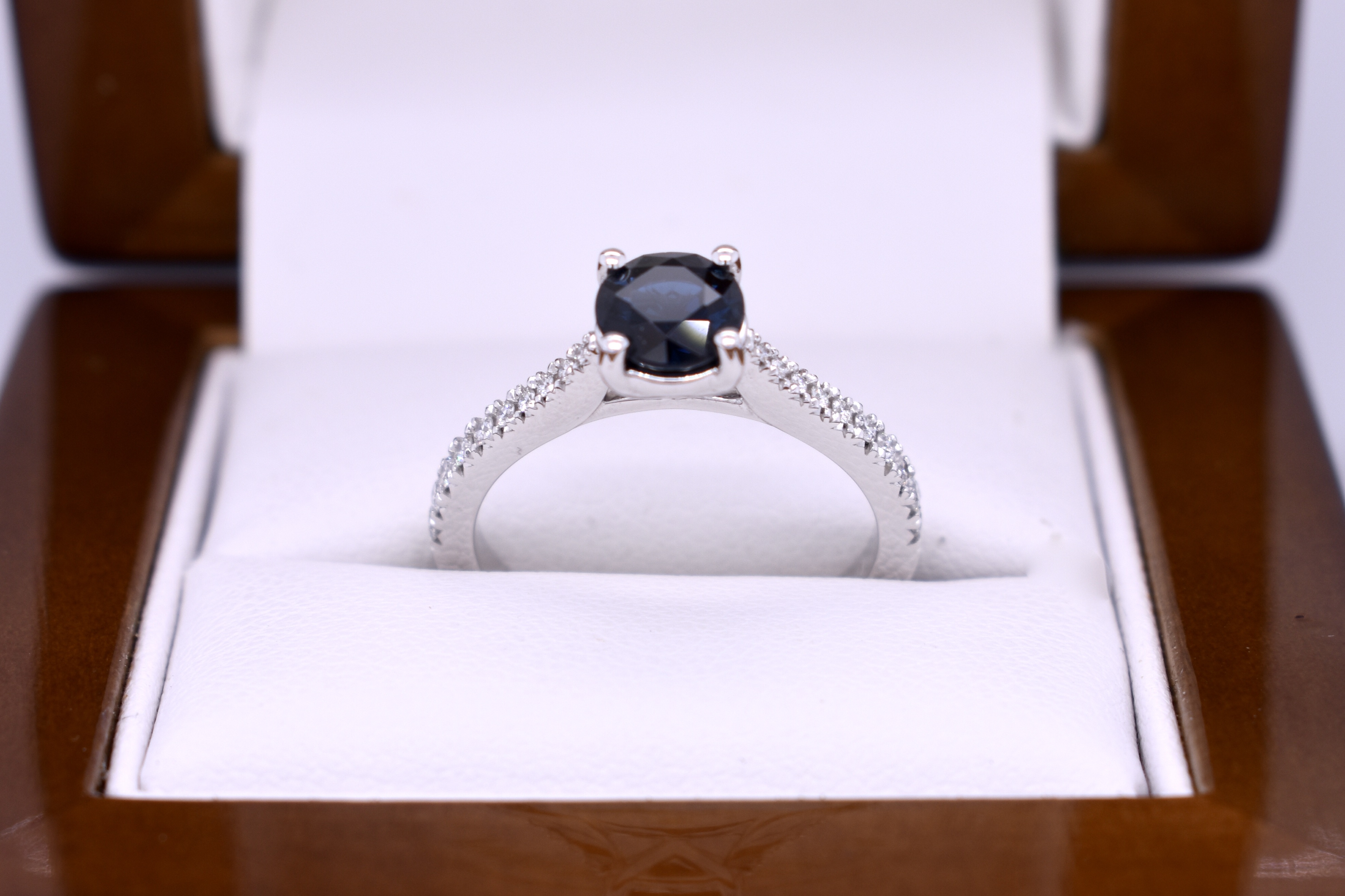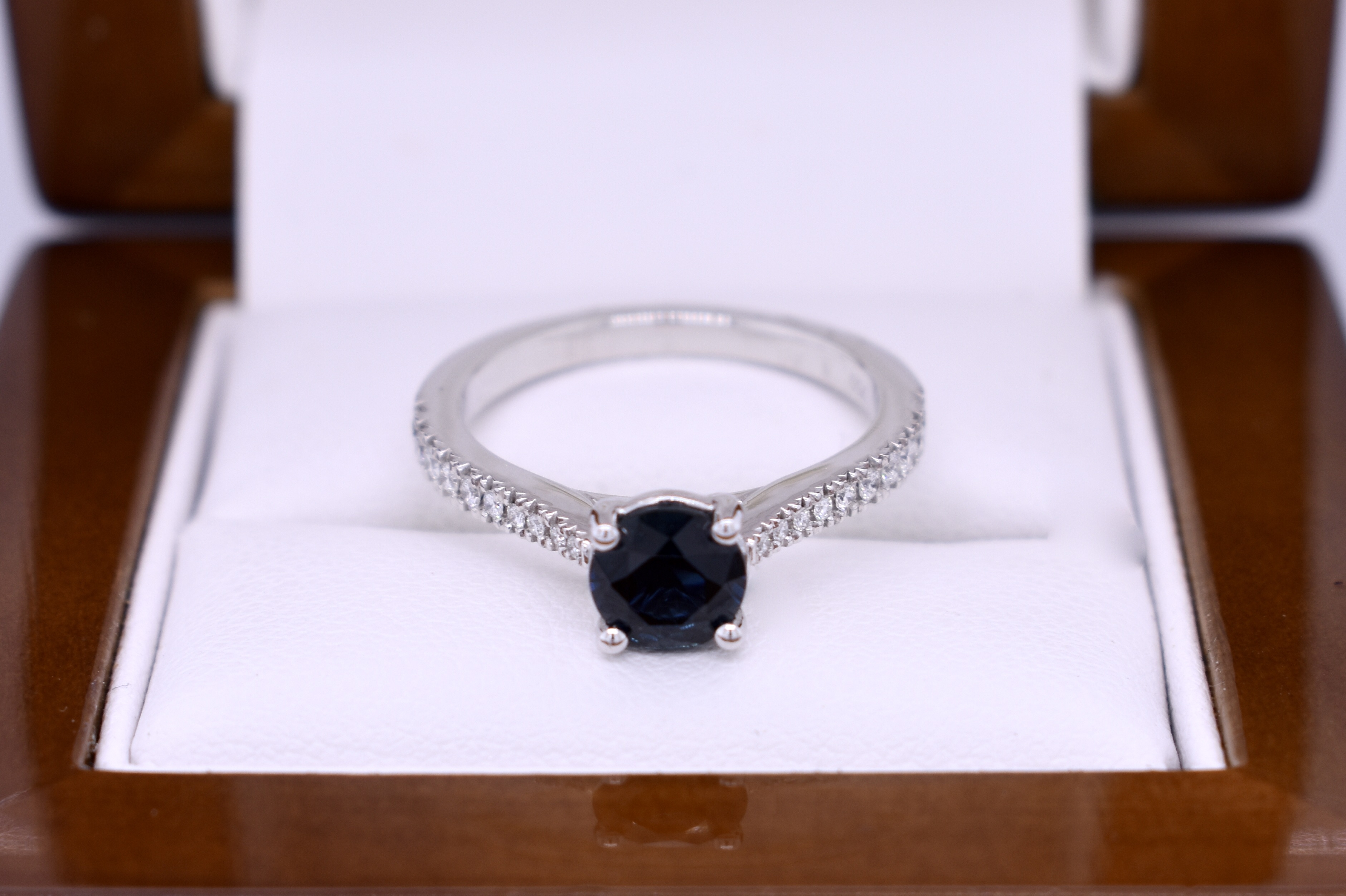 18ct White Gold 1.04ct Blue Aus Round Sapphire & 0.17ct FG SI Diamond Band Ring (M+)