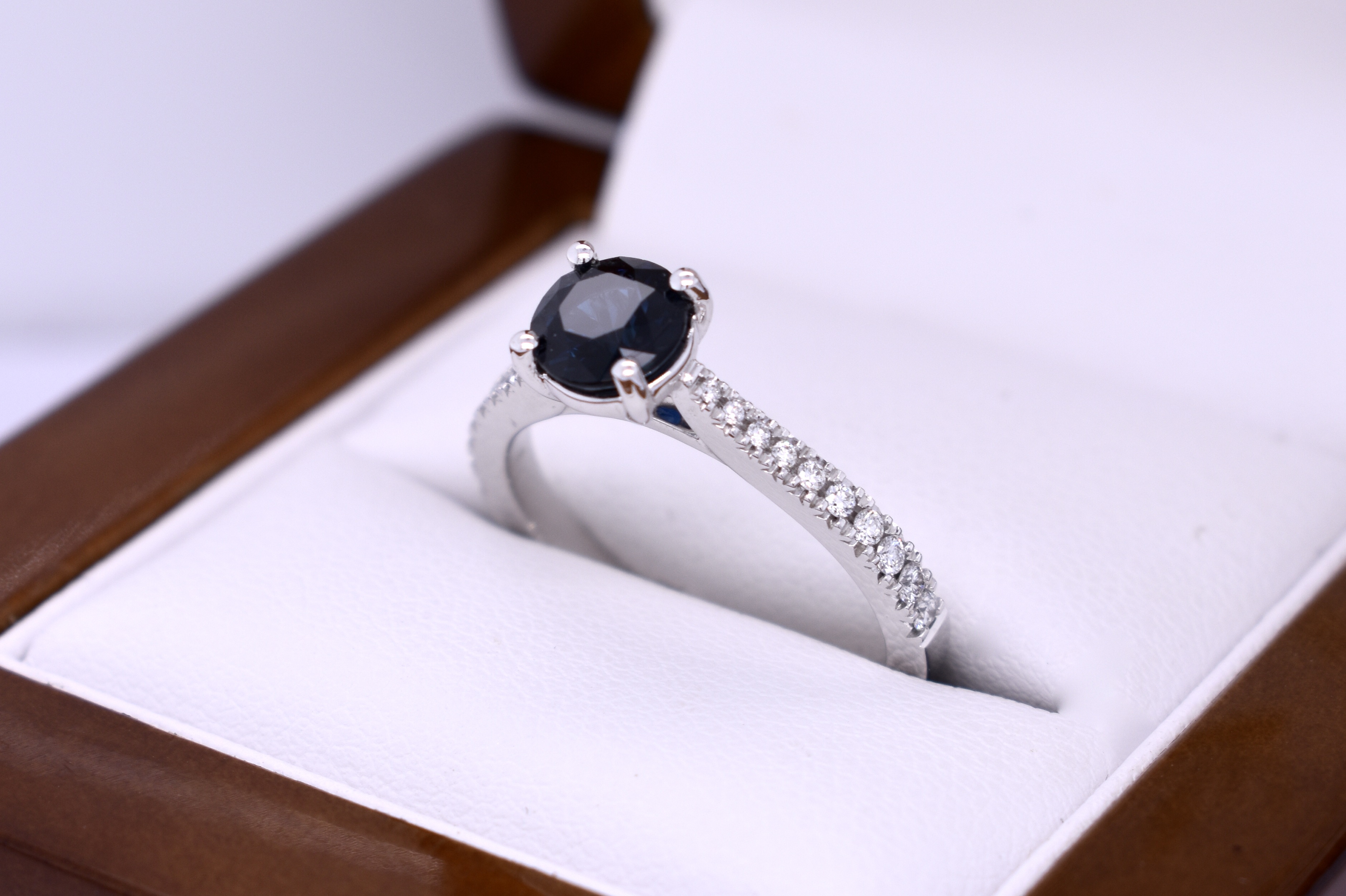 Classic and timeless, this ring features a round blue Australian sapphire weighing 1.04ct, four claw set in 18ct white gold. Complimented with diamond set shouldered tapered band, a total of 20 round brilliant cut diamonds totalling 0.17ct FG SI. Finger size M+.