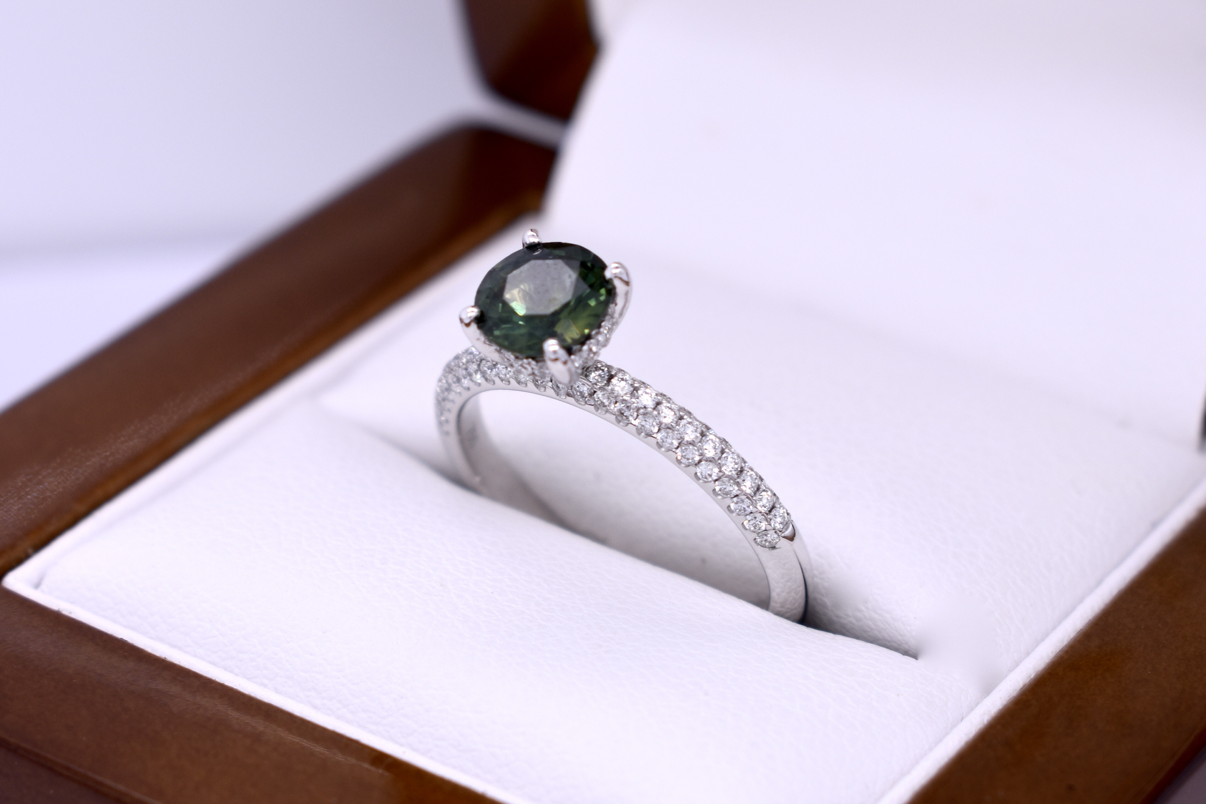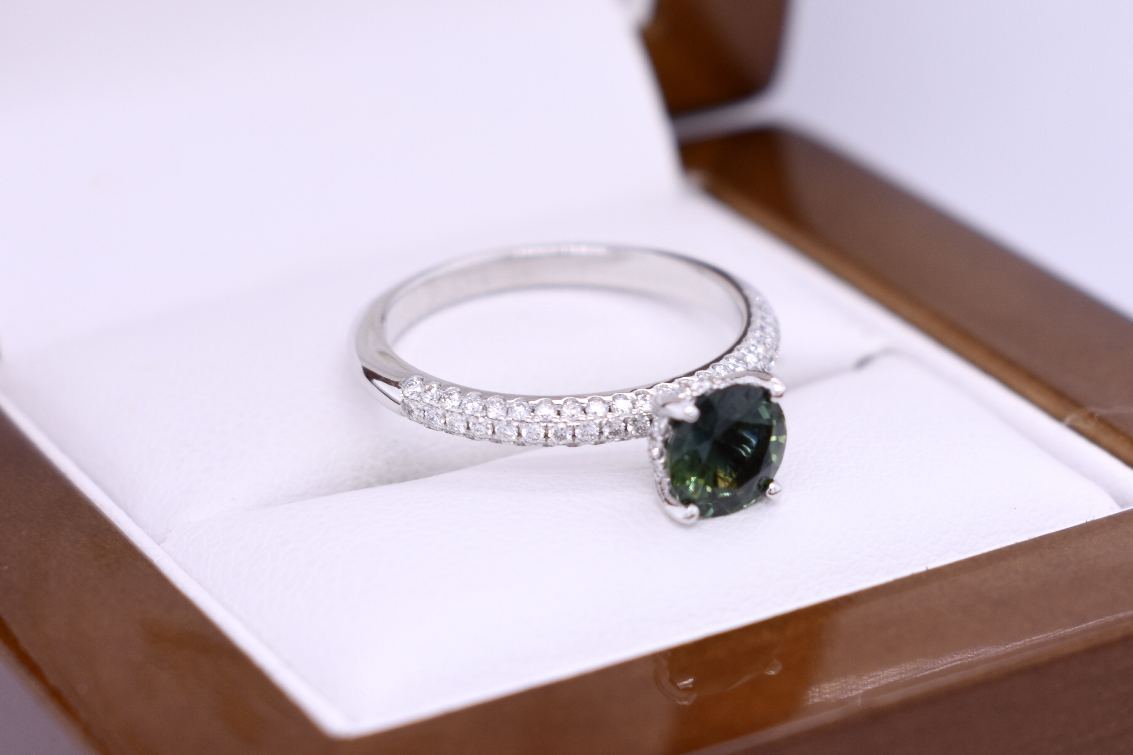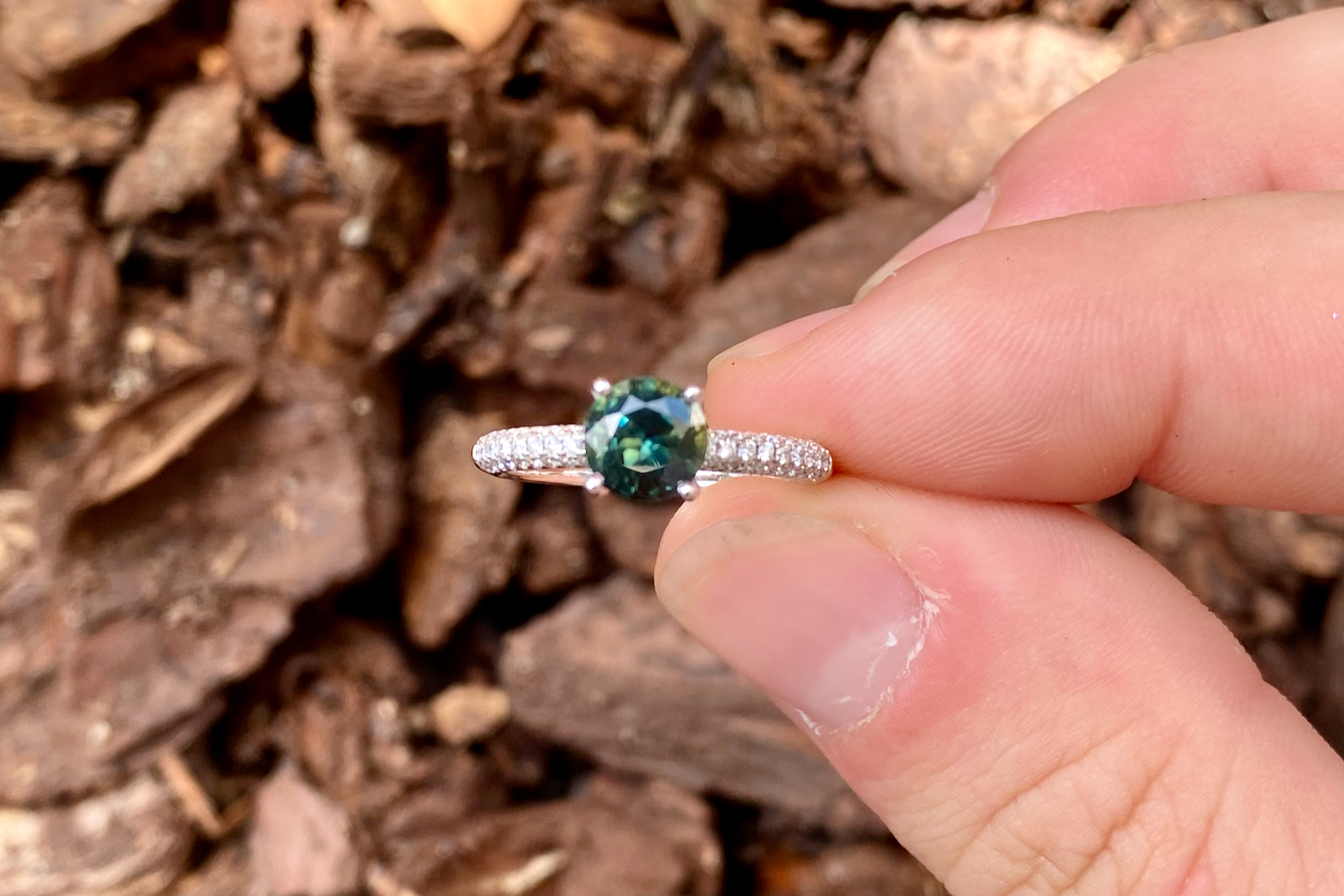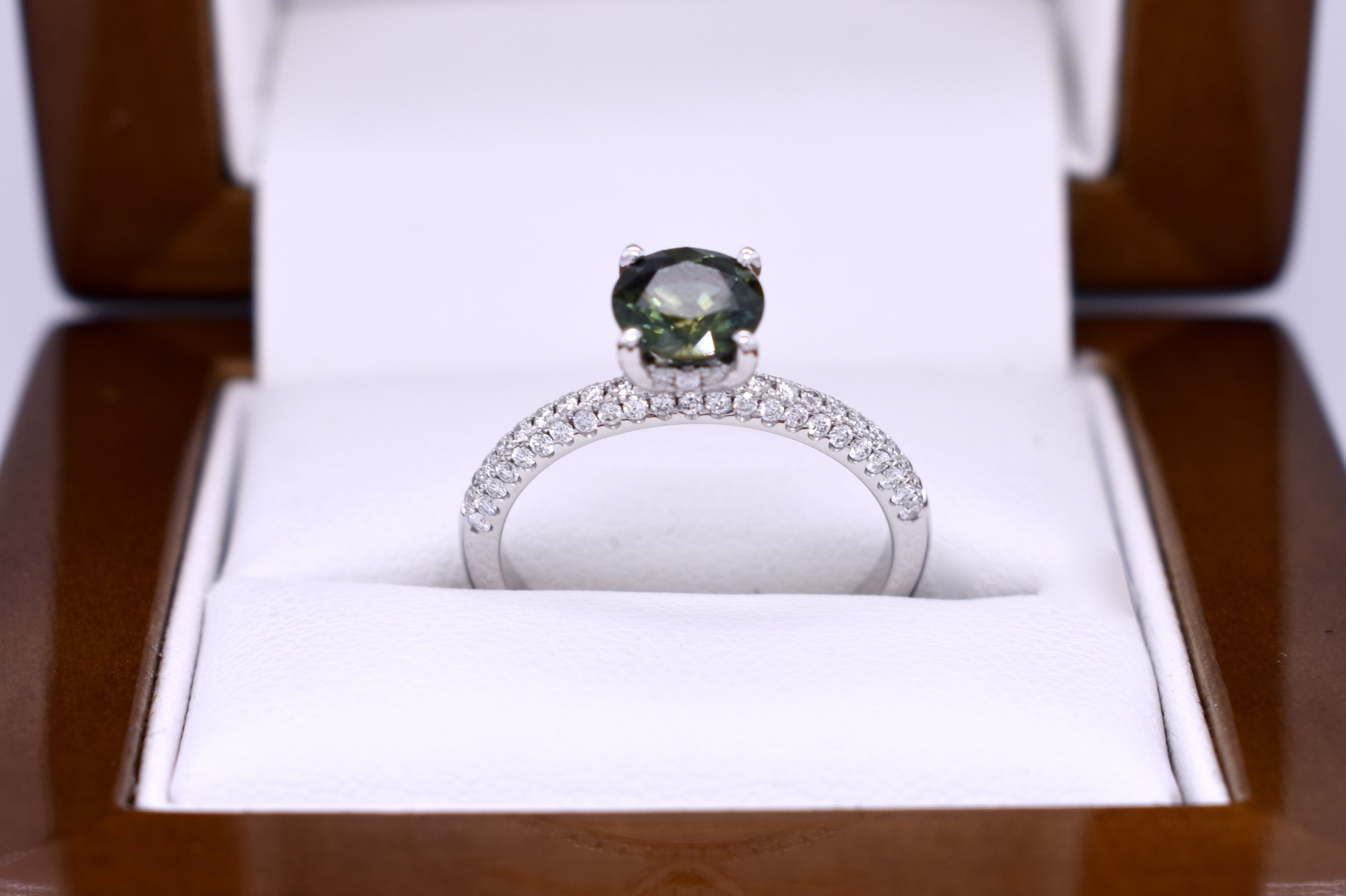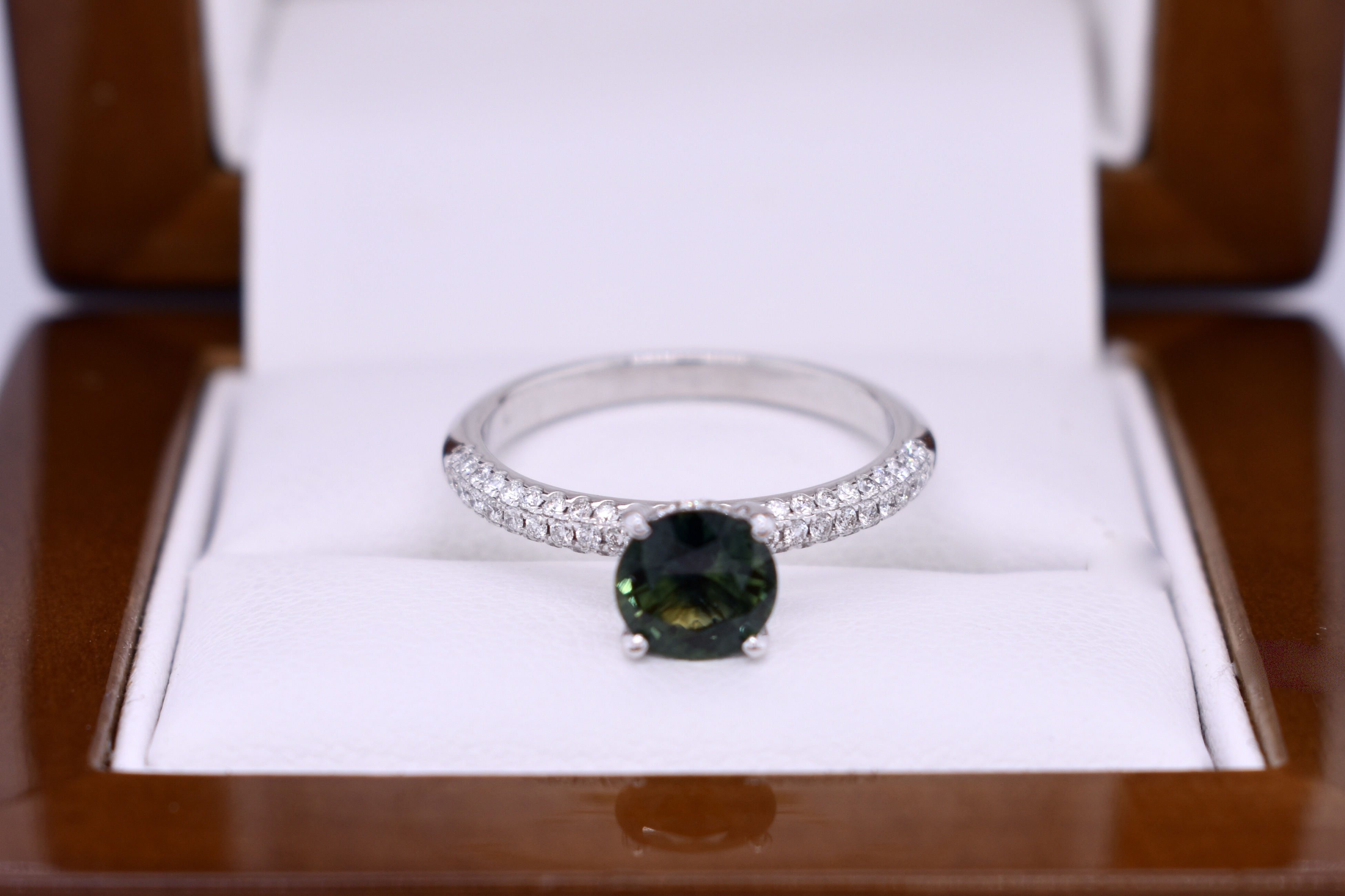 This amazing ring features a stunning round green parti Australian sapphire weighing 1.06ct four claw set in 18ct white gold, finished with a pave set diamond band and a dazzling hidden diamond halo underneath the main stone. Finger size L.