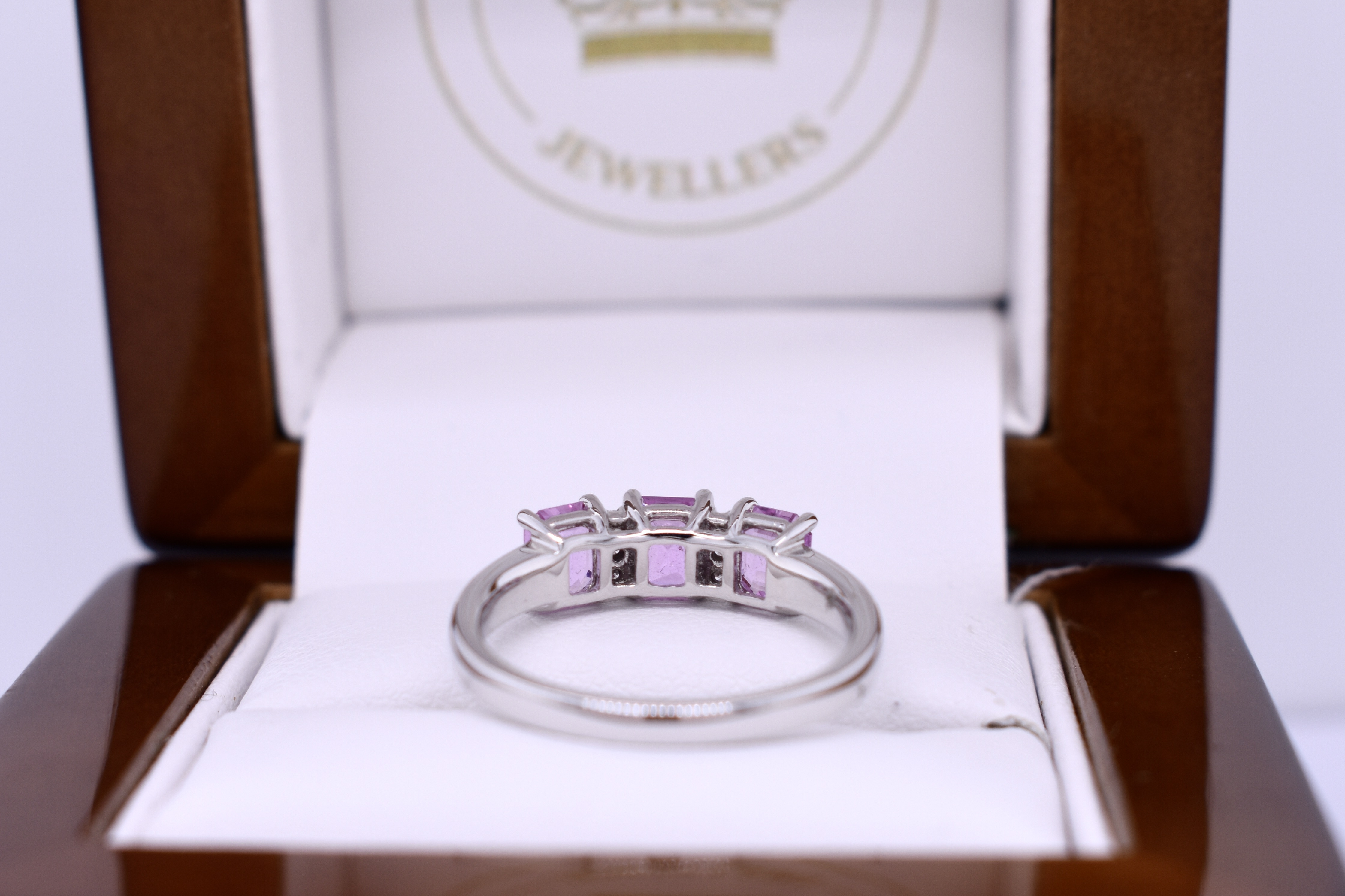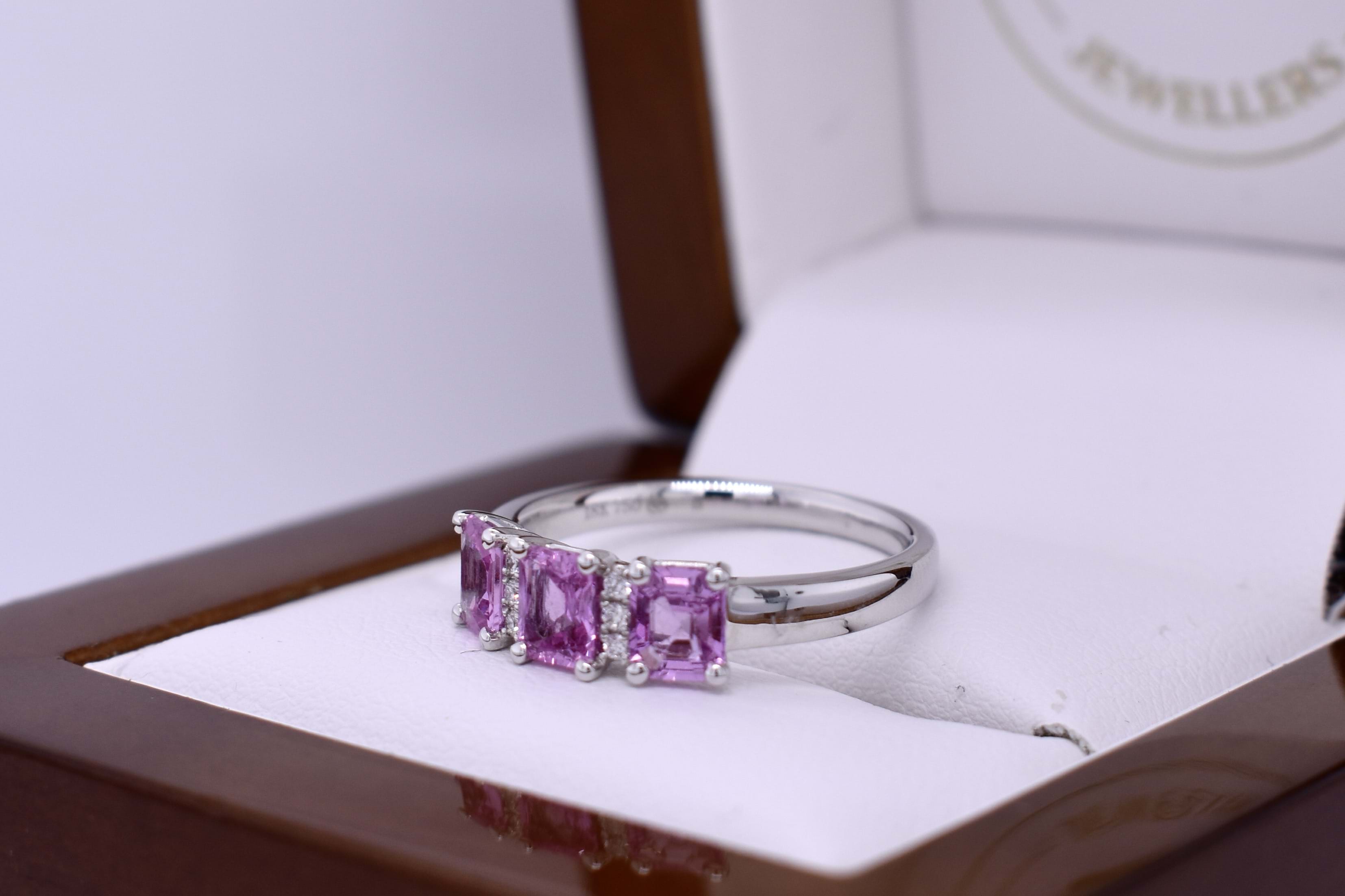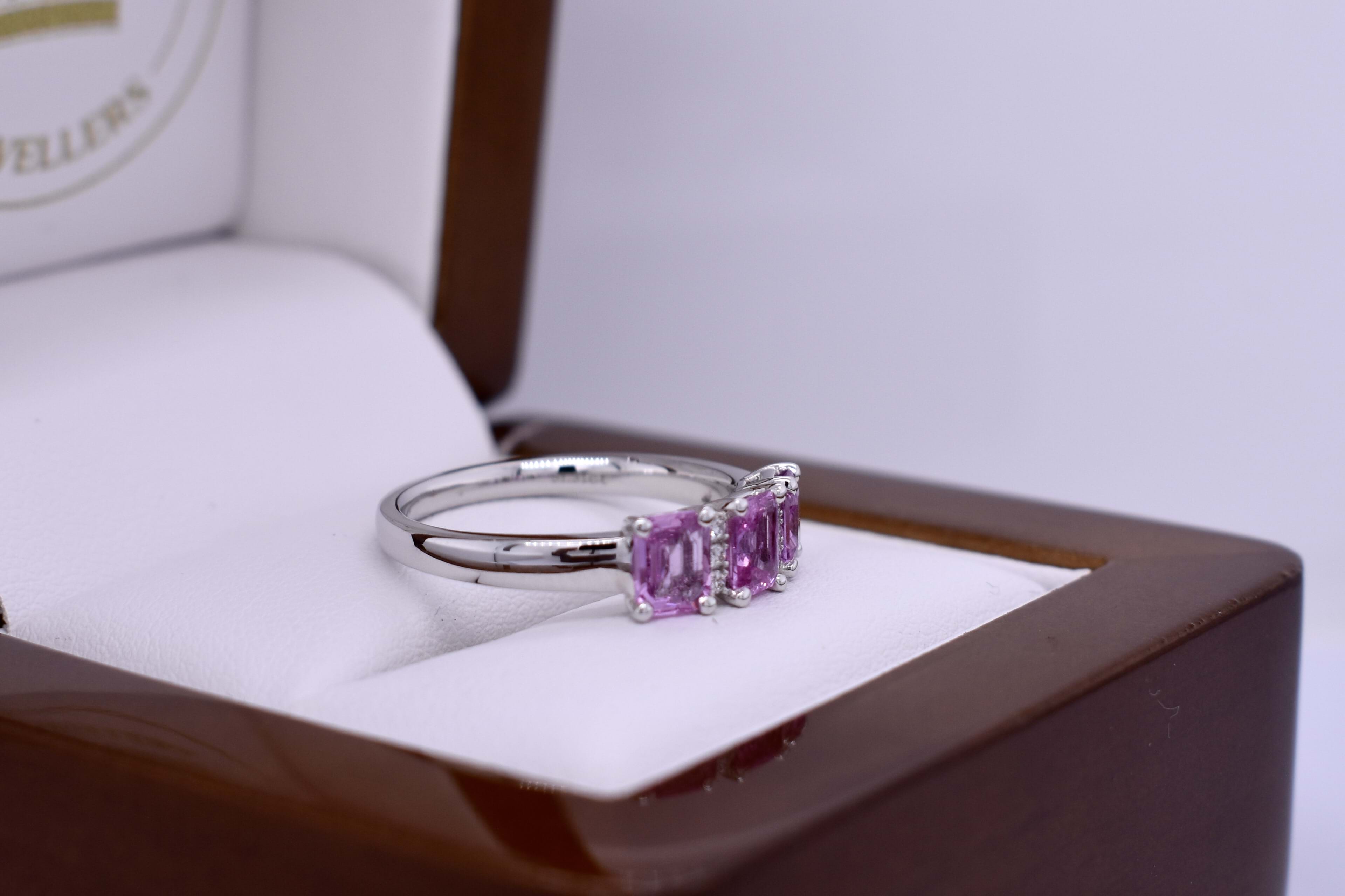 Featuring three, mid-light pink, pink sapphires the centre radiant cut and the sides emerald cut totalling 1.31ct set into an 18ct white gold dress ring, built to sit low on the hand with three small shimmering round brilliant cuts set in two rows to contrast the pink. The diamonds total 0.04ct FG/VS-SI. Finger size M+. Independent Valuation Supplied