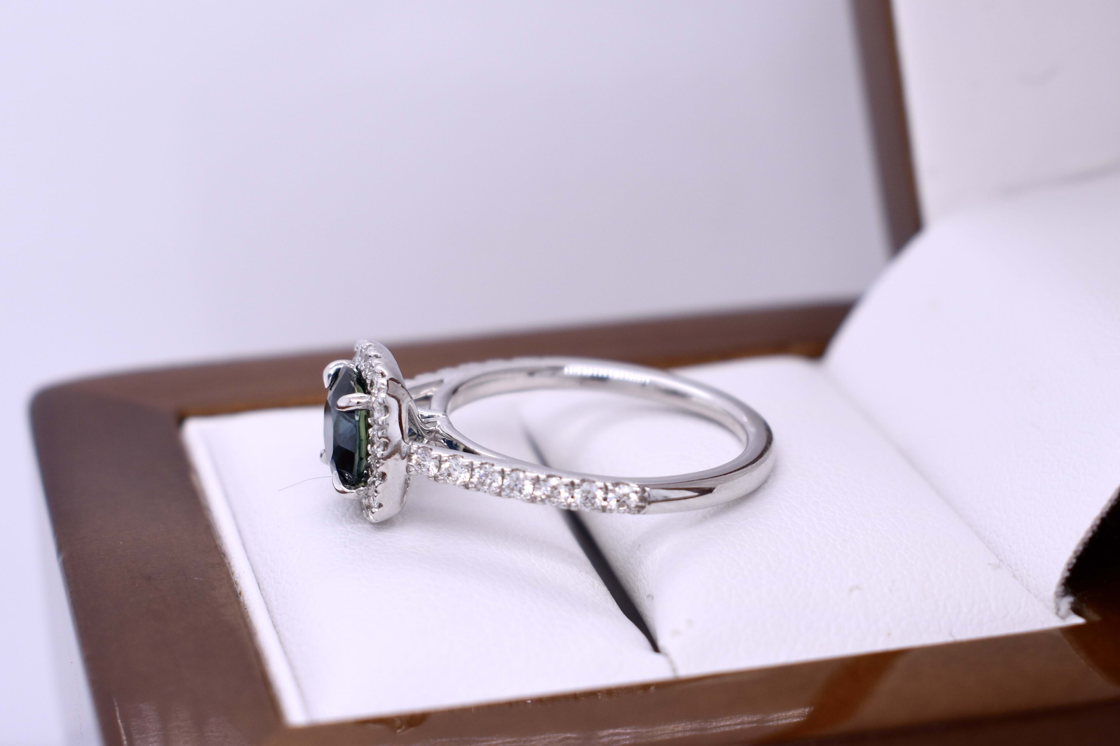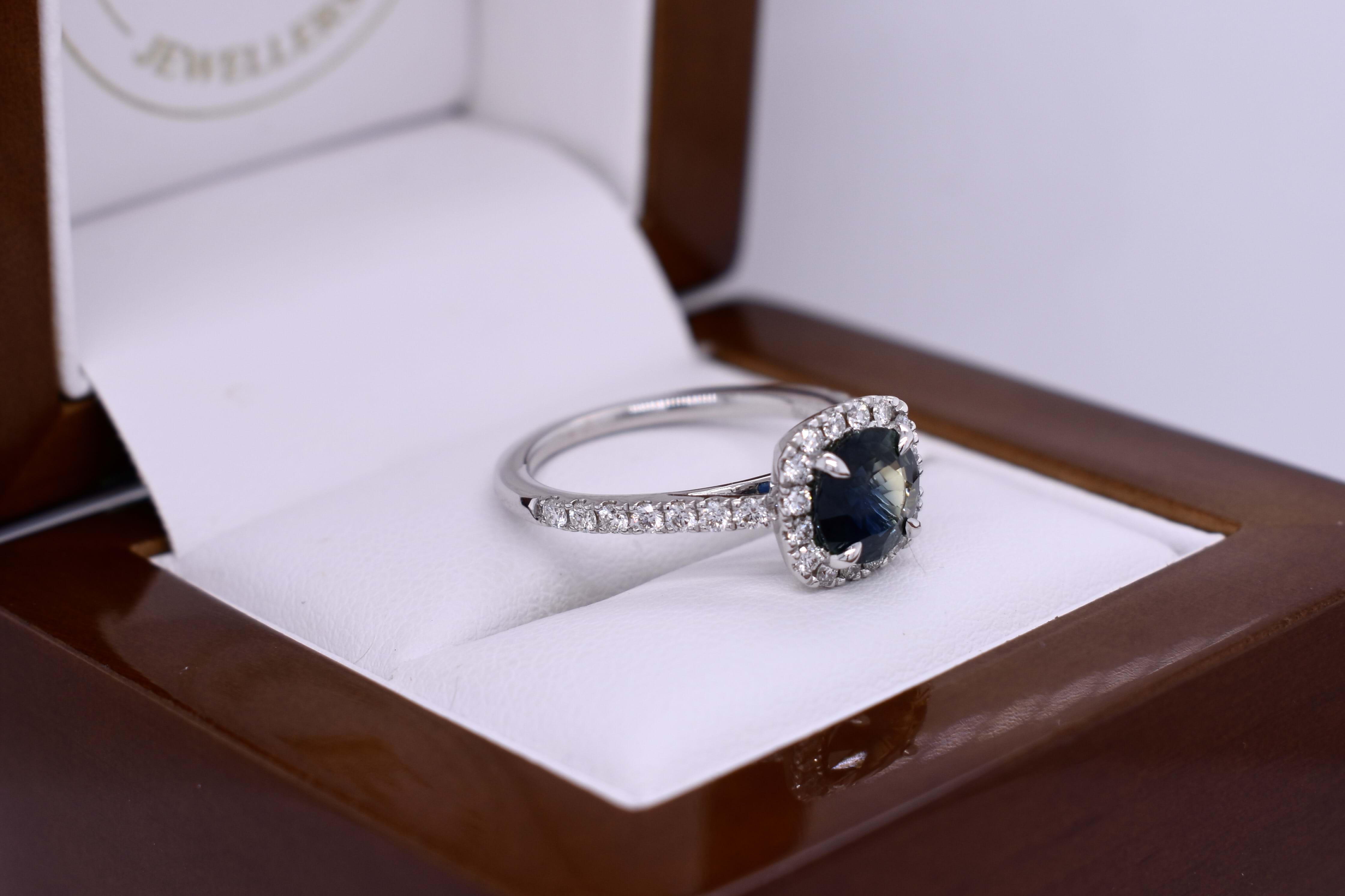Gorgeous 18ct white gold ring, featuring a centre cushion cut, bright deep blue green Australian parti sapphire of 2.16ct, measuring 7.10x6.05x4.95mm, four claw set, surrounded with a shimmering diamond halo. Total of 38 round brilliant cut diamonds, measuring 1.30mm and equalling 0.36ct G VS. Finished on a 1.66mm swept up shoulders plain band, with diamonds down the sides. Finger size M+. Independent Valuation Supplied.