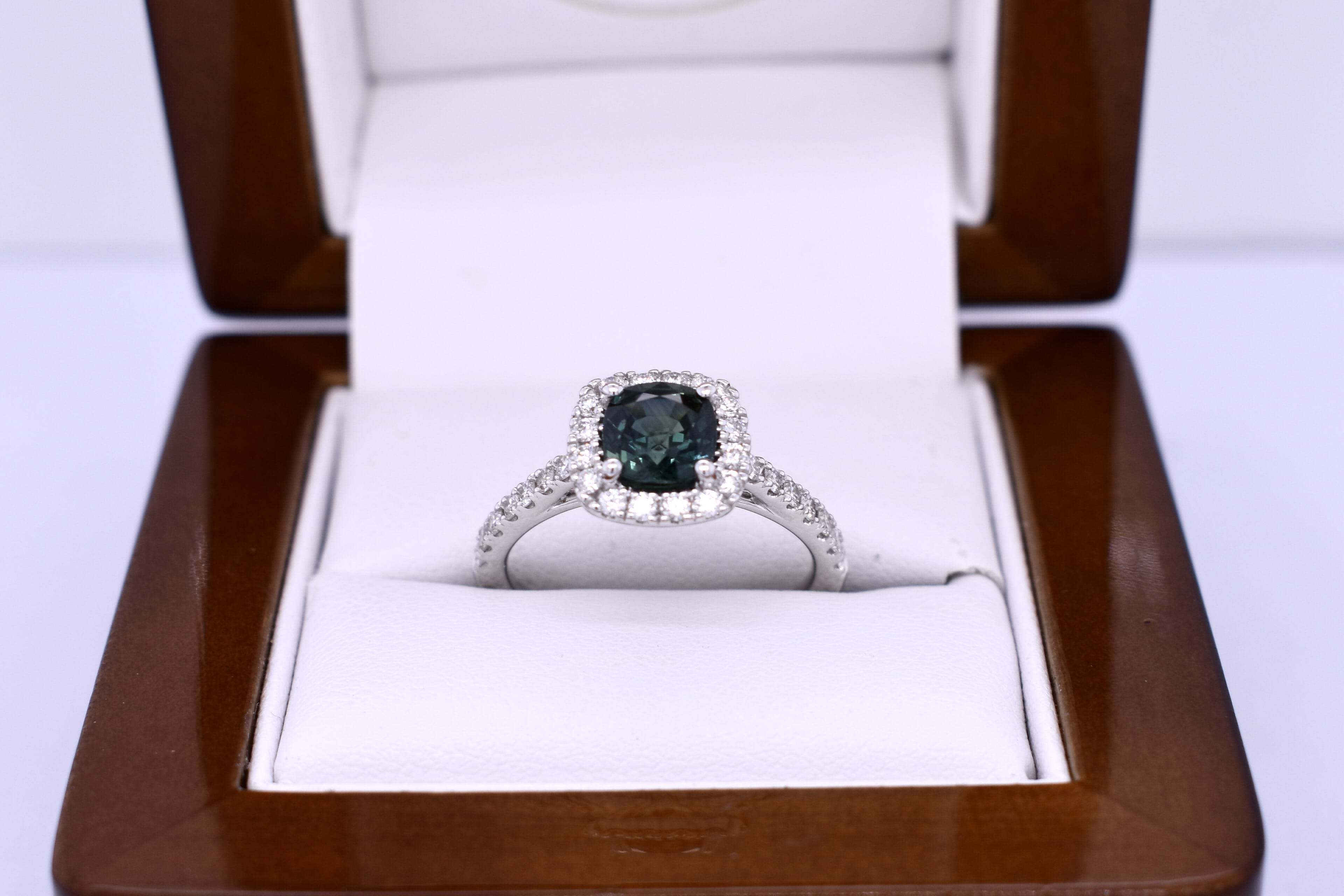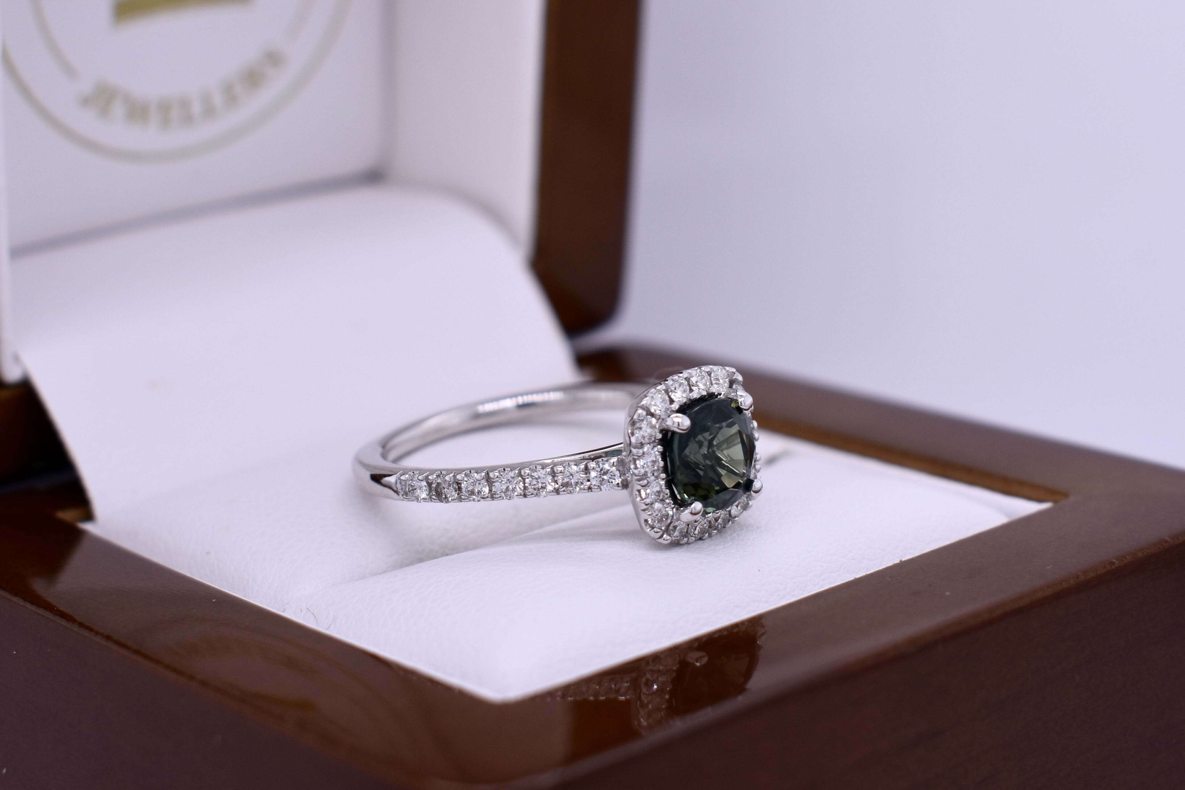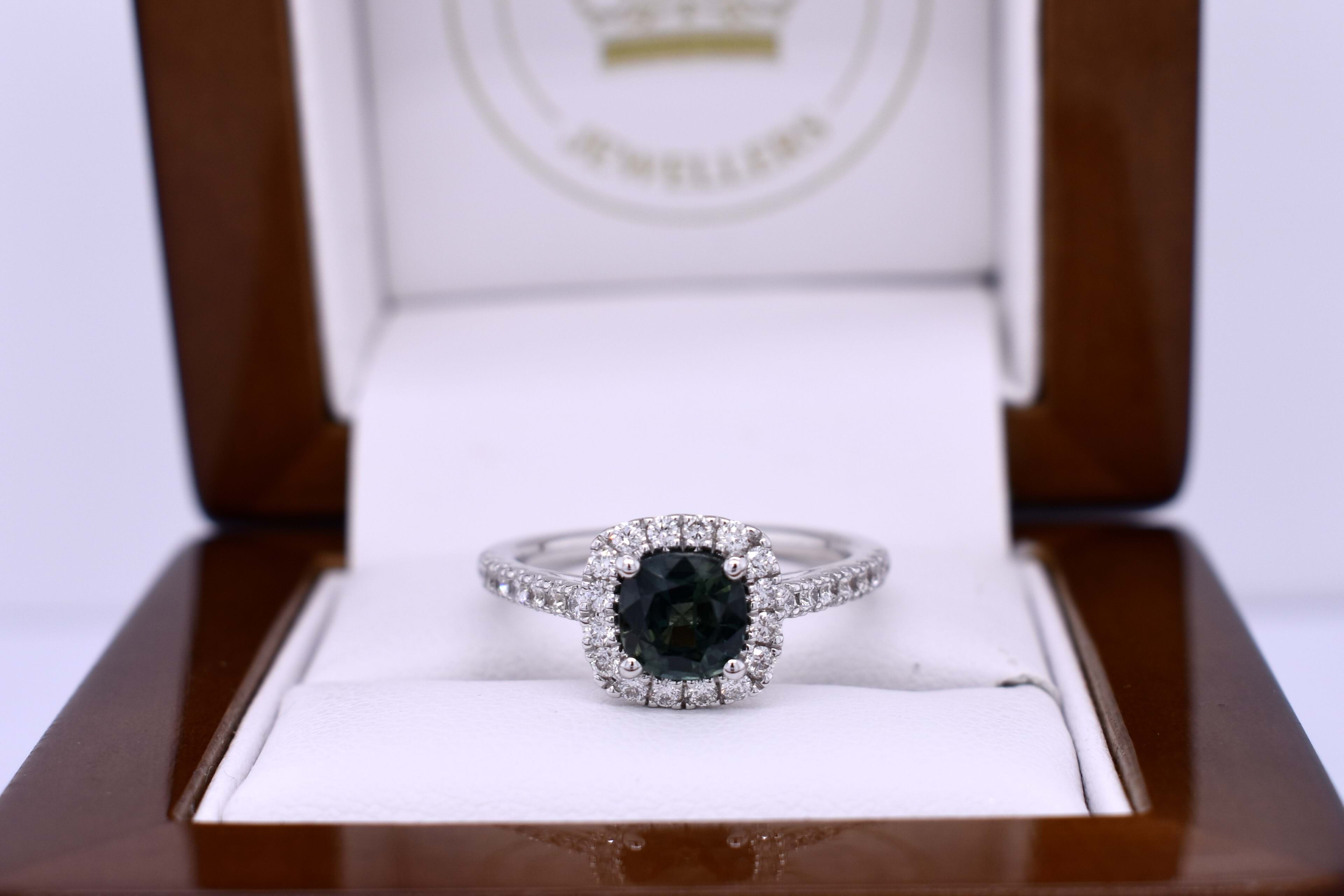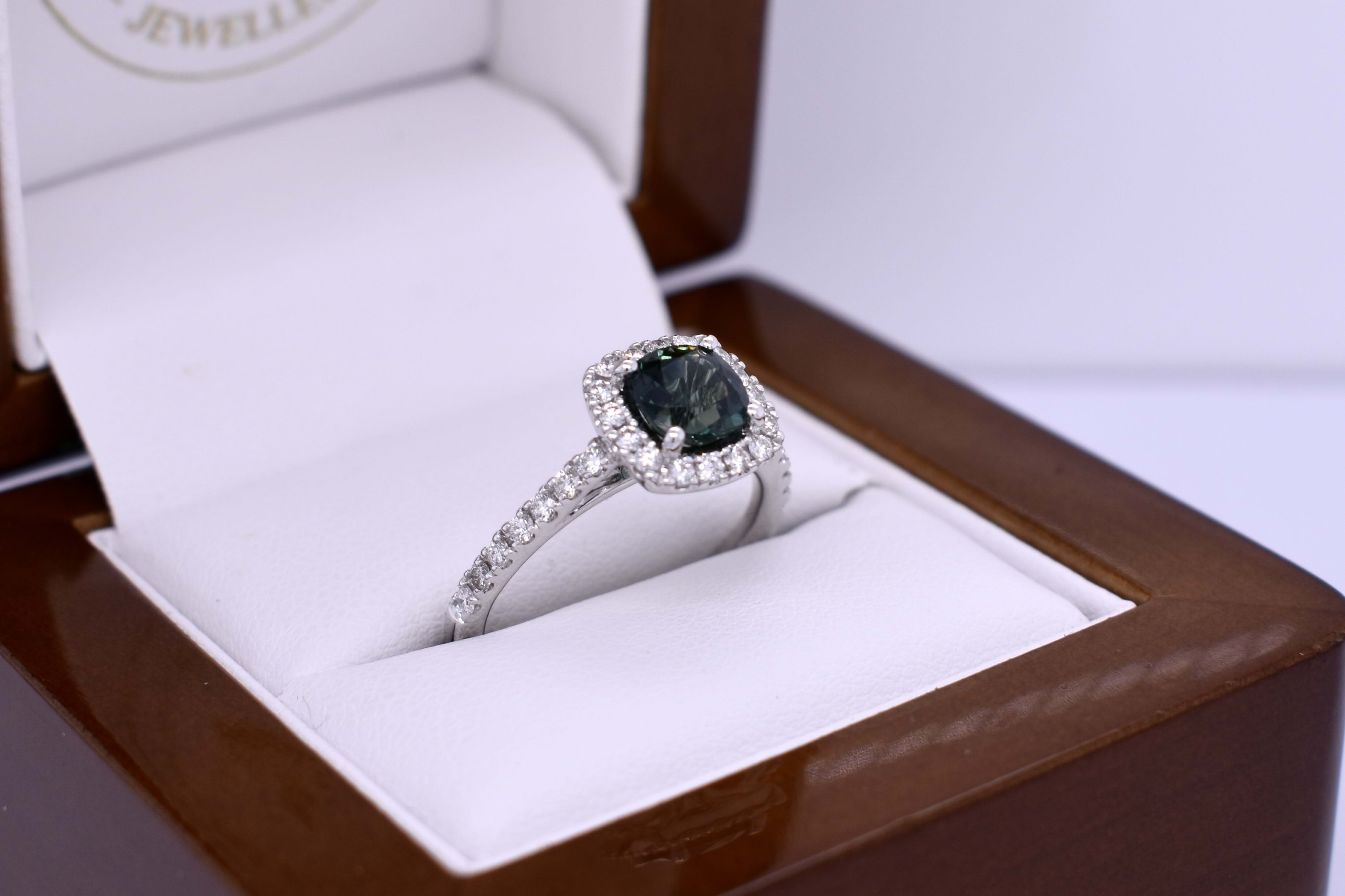 This stunning ring features a bright mid deep blue/green greenish Australian square cushion shaped sapphire weighing 1.36ct, four claw set in 18ct white gold. Complimented with a cushion shaped halo of round brilliant cut 1.70mm diamonds, continuing down the band. Total diamond weight 0.44ct FG SI. Completed on a half round 1.60mm band. Finger size N. Independent Valuation Supplied.