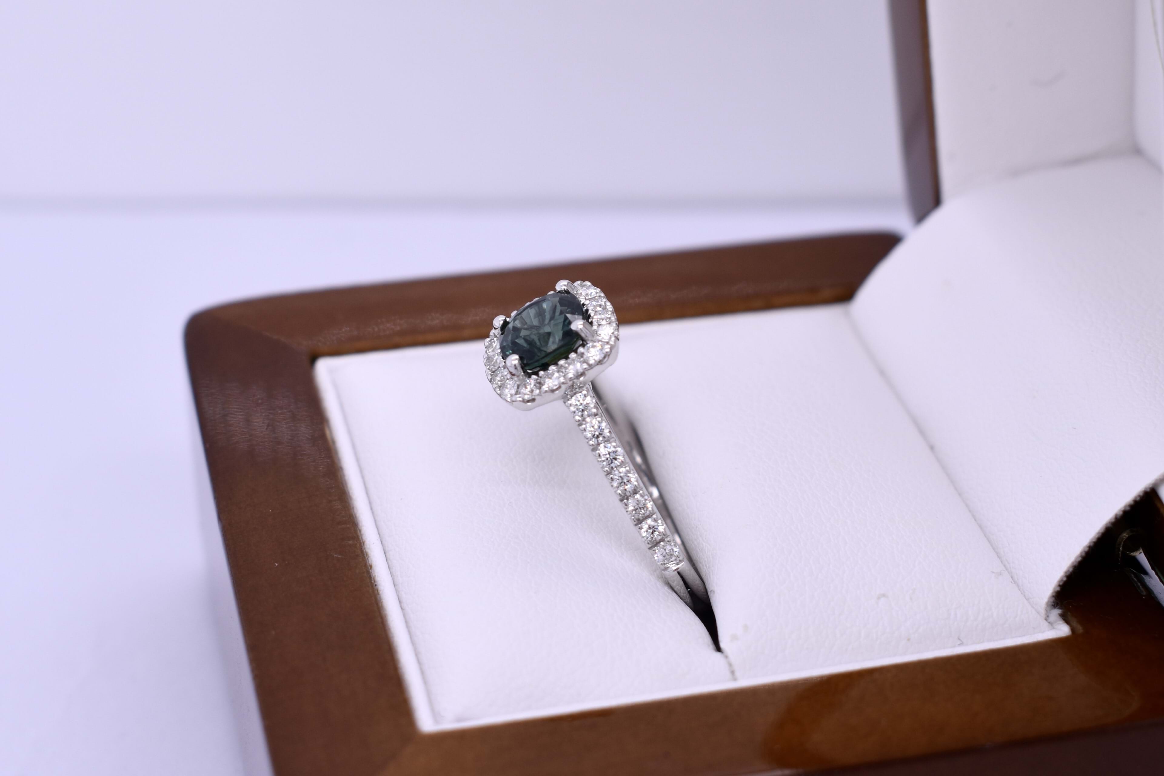 18ct White Gold 1.36ct Blue/Green Aus Sapphire & 0.44ct Diamond Halo Ring (N)