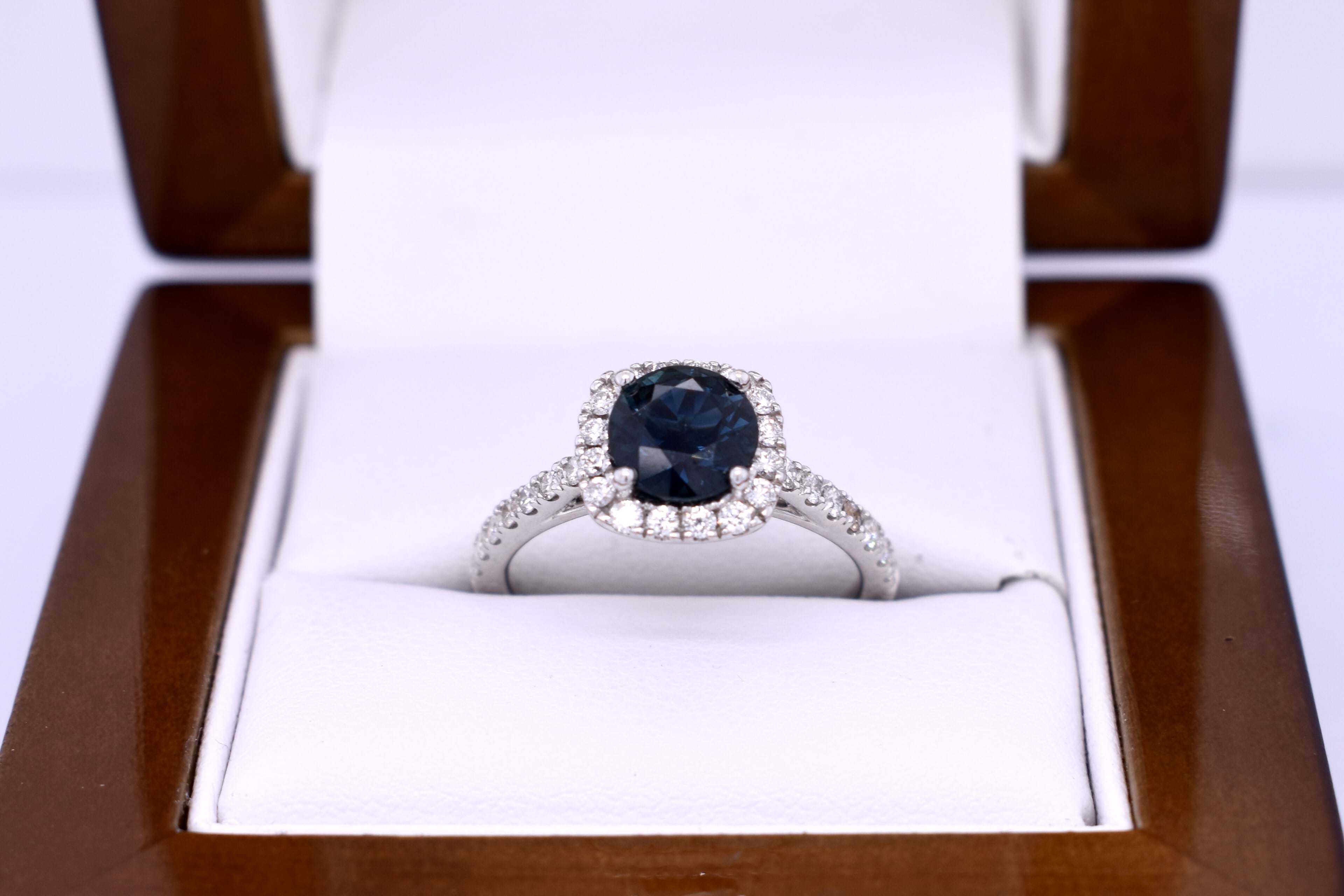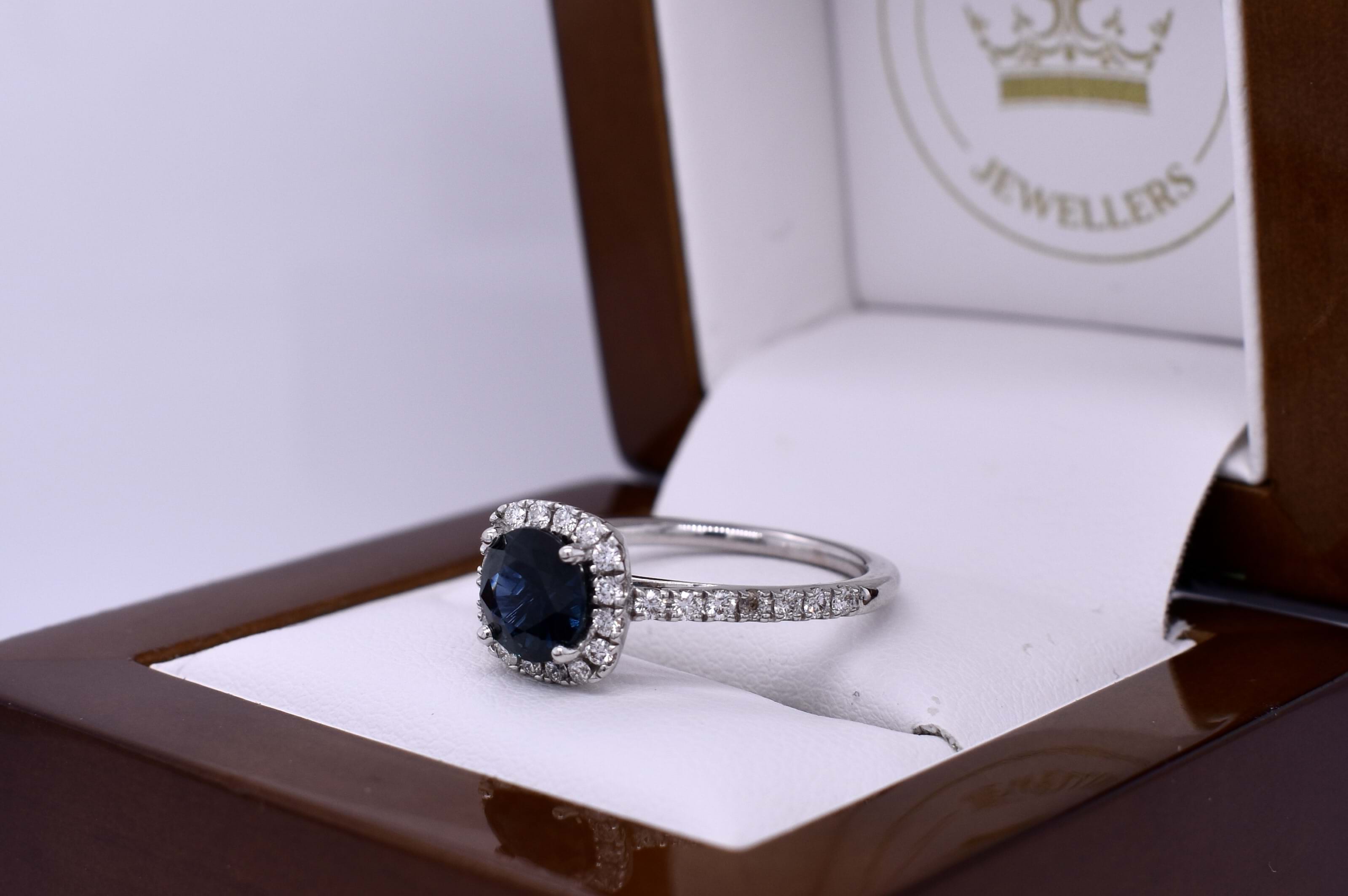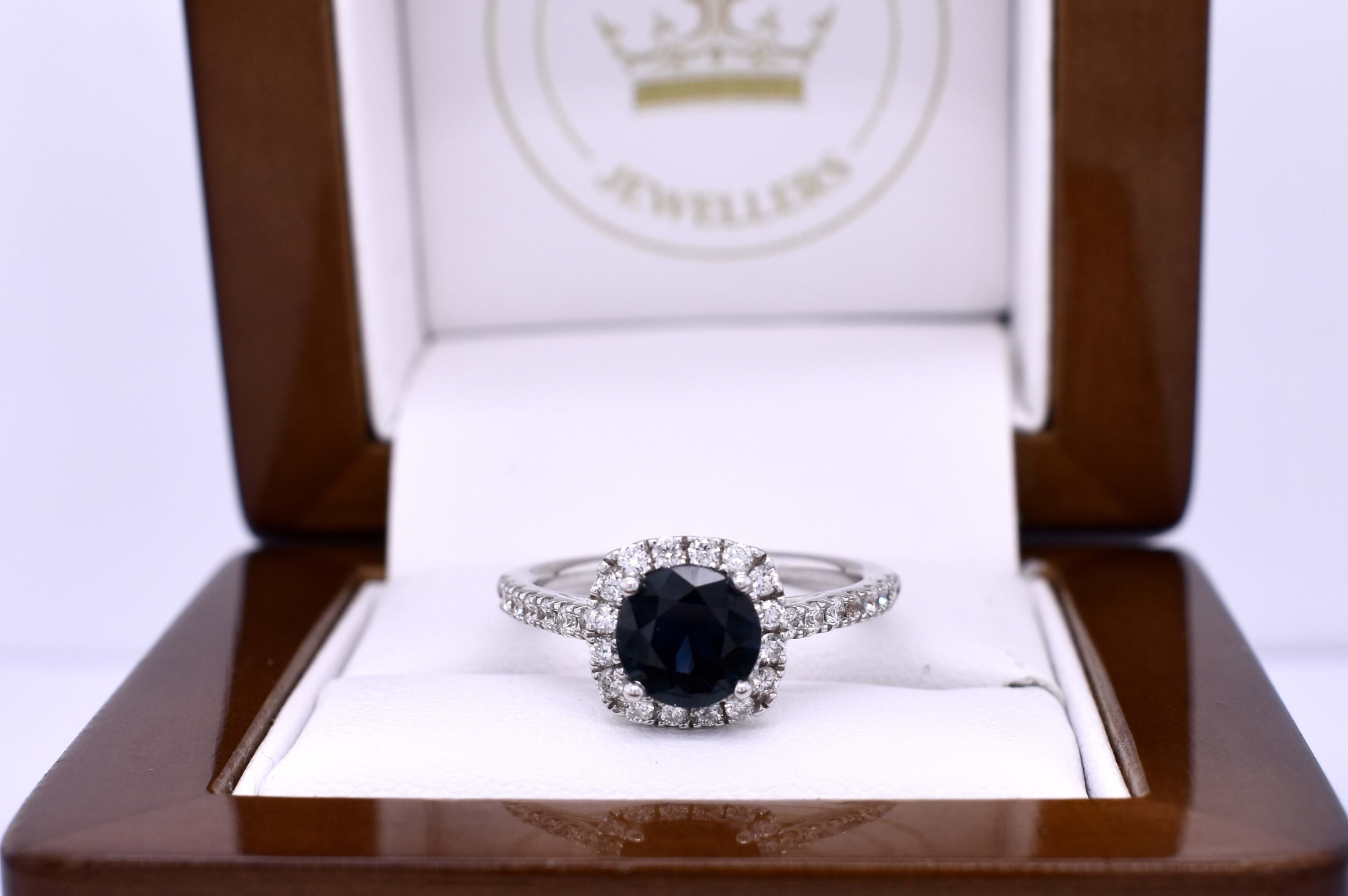 This timeless ring features a bright deep blue Australian round shaped sapphire weighing 1.46ct, four claw set in 18ct white gold. Surrounded with a dazzling halo of 16 round brilliant cut diamonds, measuring 1.40-1.60mm, with a further 14 continuing down the band. Total diamond weight 0.44ct FG SI. Completed on a half round 1.60mm band. Finger size M. Independent Valuation Supplied.