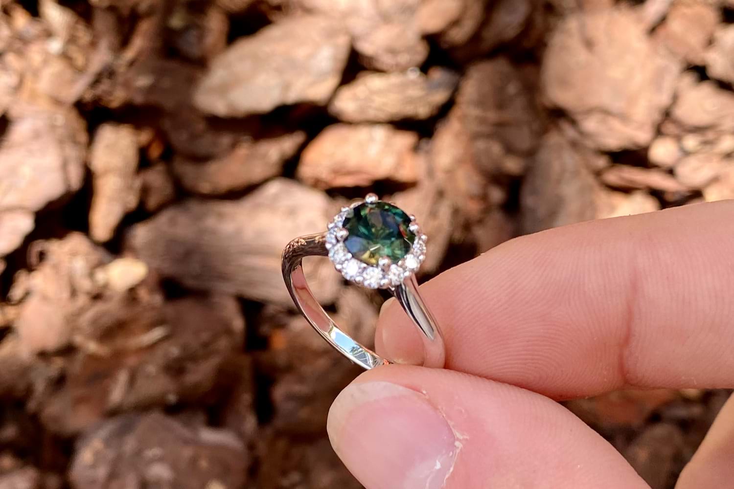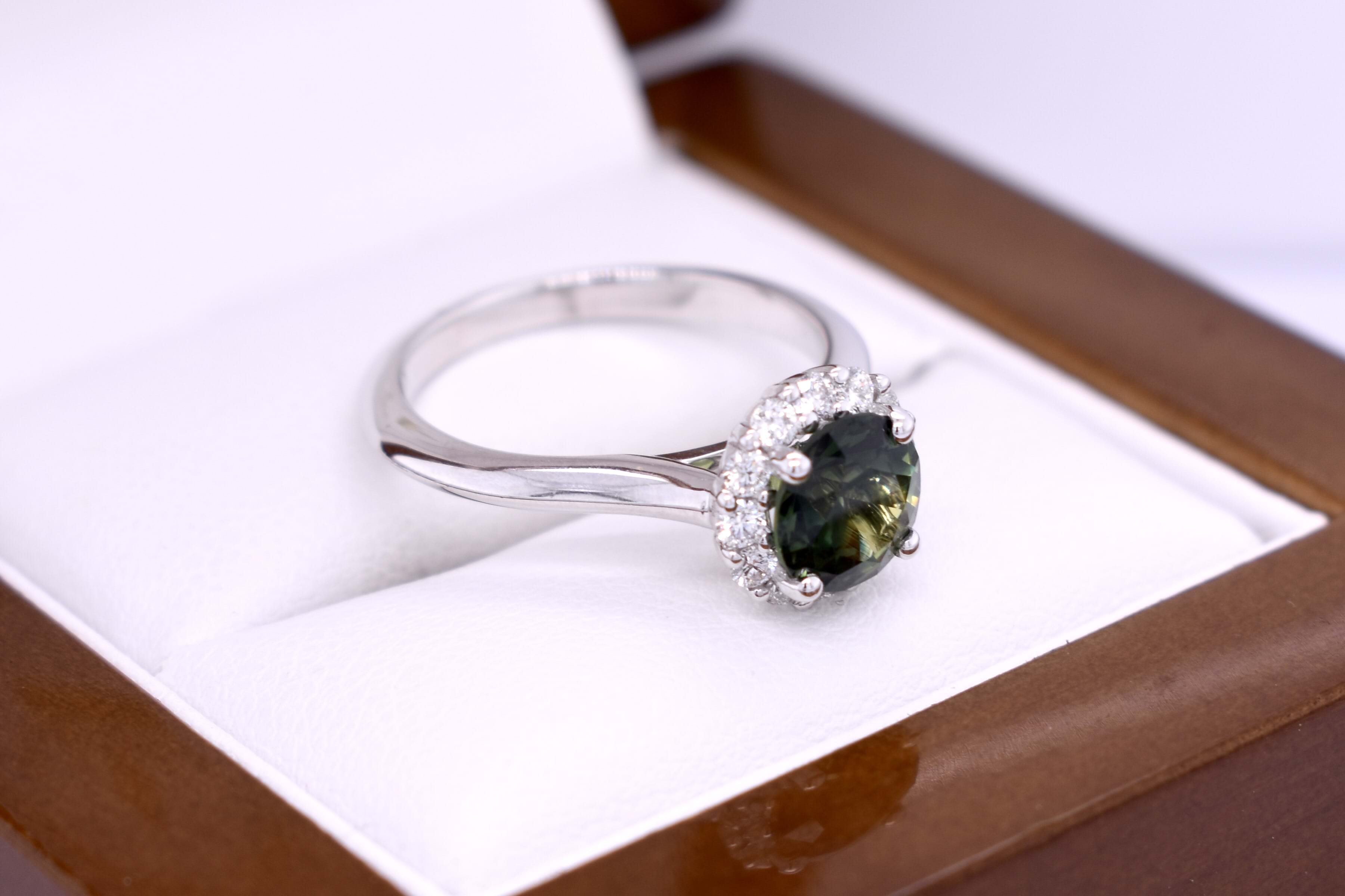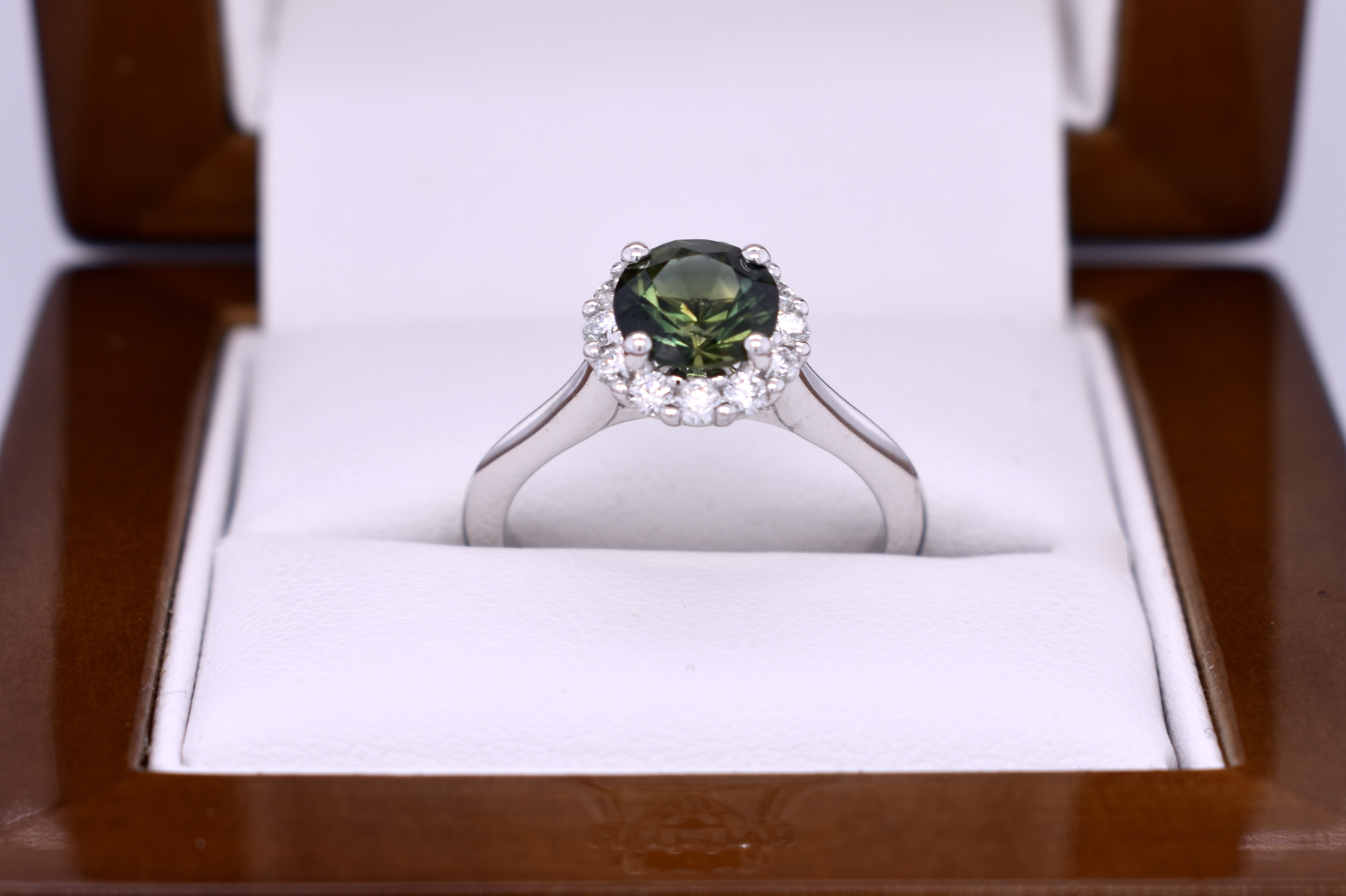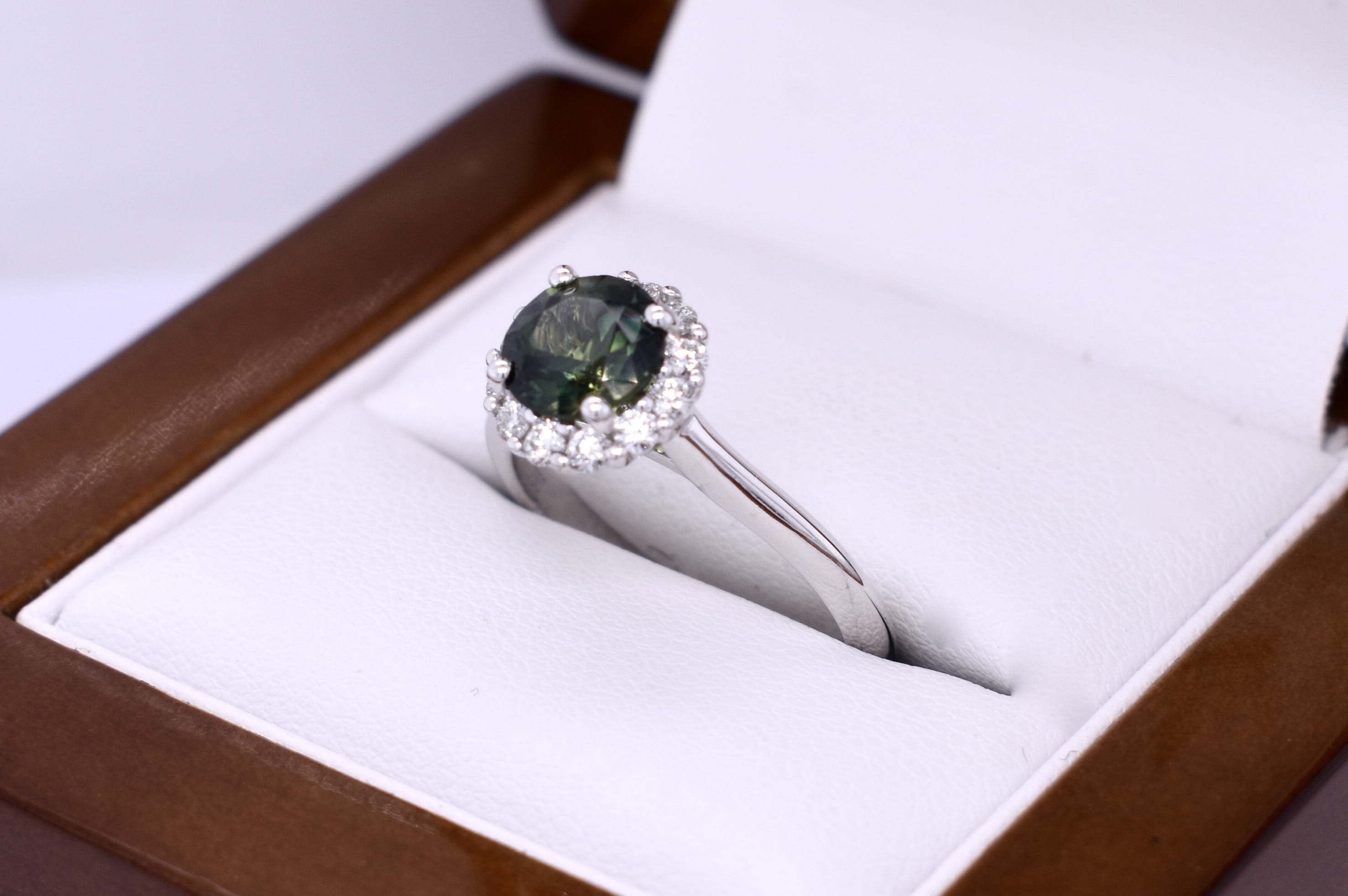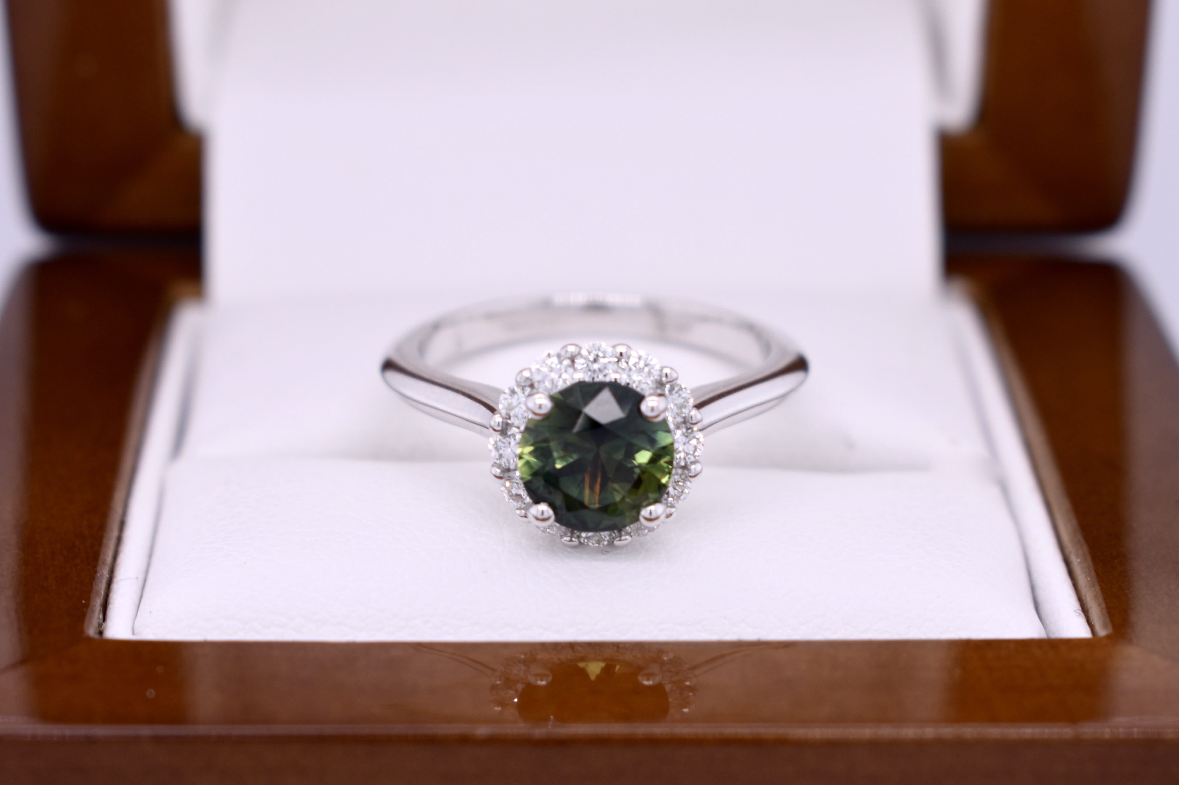Classic and elegant, this ring features a green/blue Australian parti round sapphire weighing 1.46ct, four claw set in 18ct white gold. Complemented with a round shaped halo of round brilliant cut diamonds, including one bezel set in the collet. Total diamond weight 0.31ct FG SI. Completed with a plain band. Finger size K+.